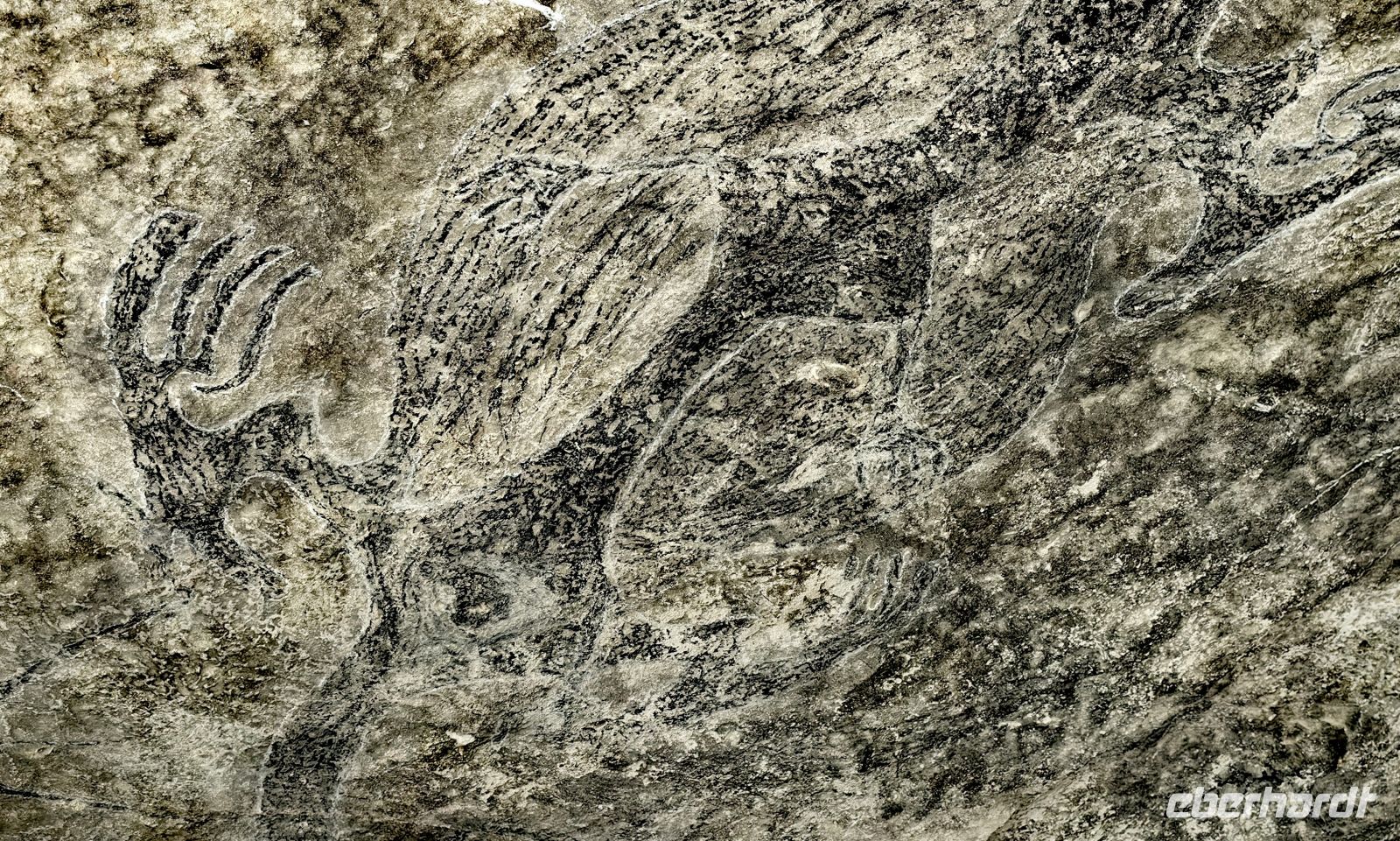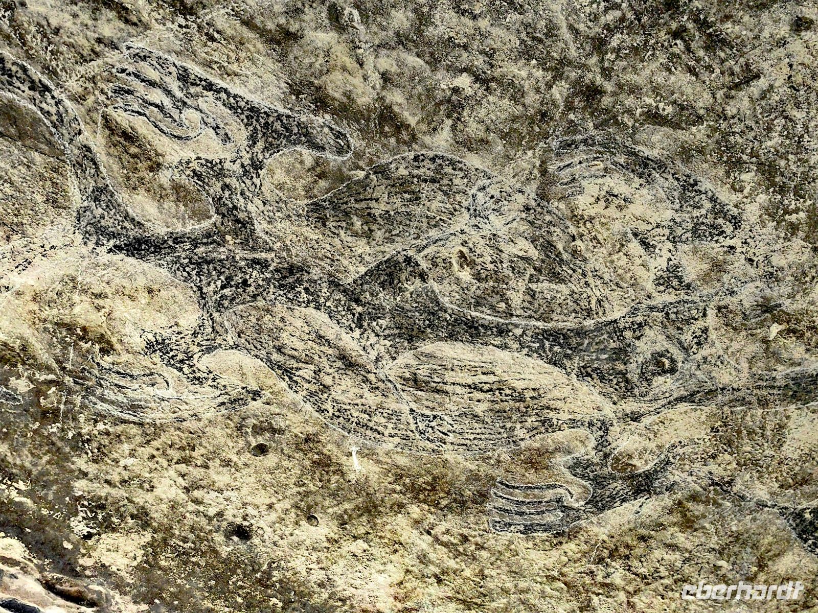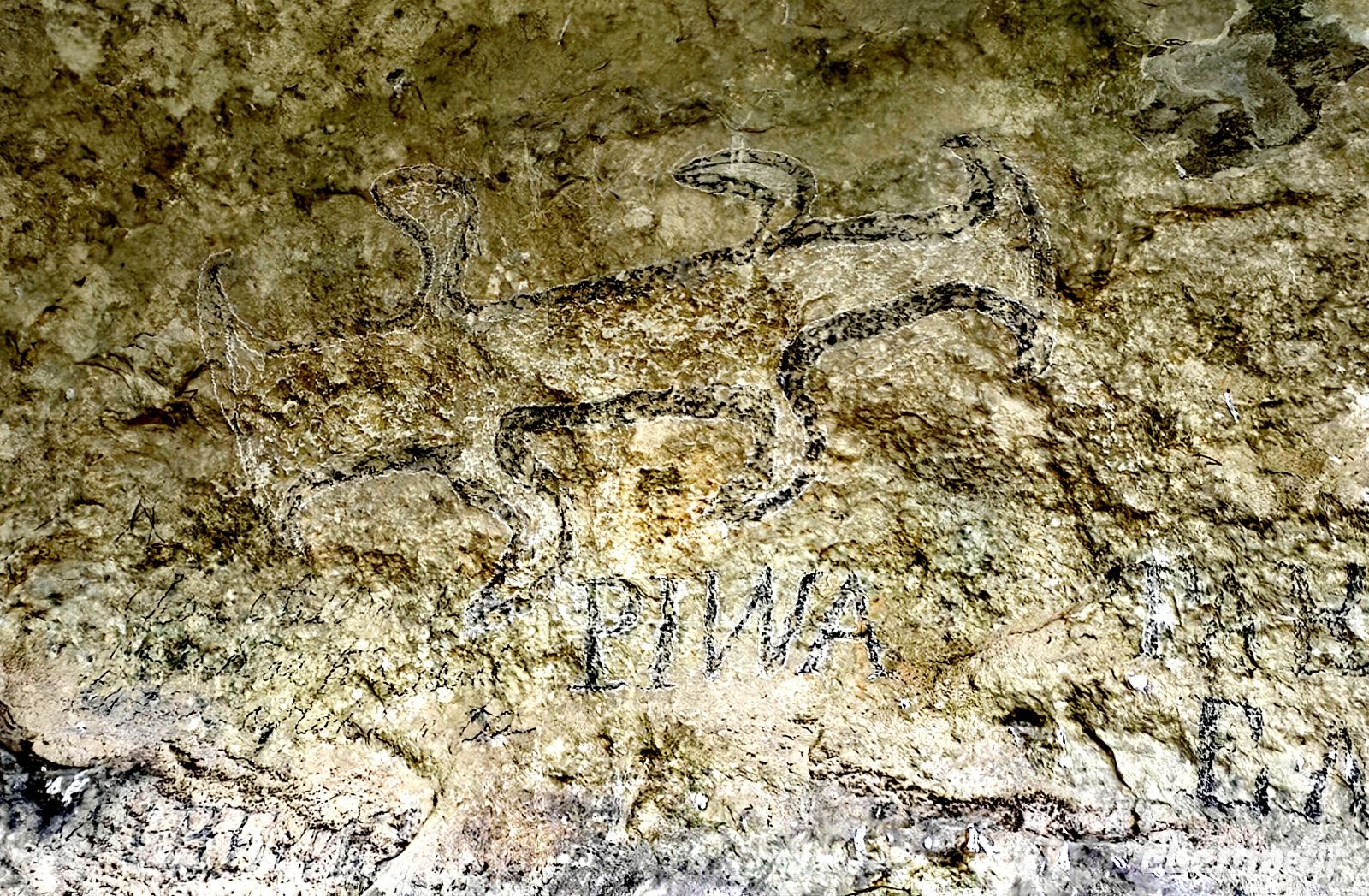 Als wir an den Kalksteinhöhlen ankommen, erkennen wir unter Granitüberhängen Formen in verblasstem Schwarz an Wänden und Decken
