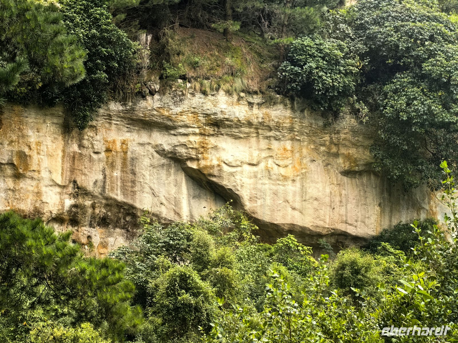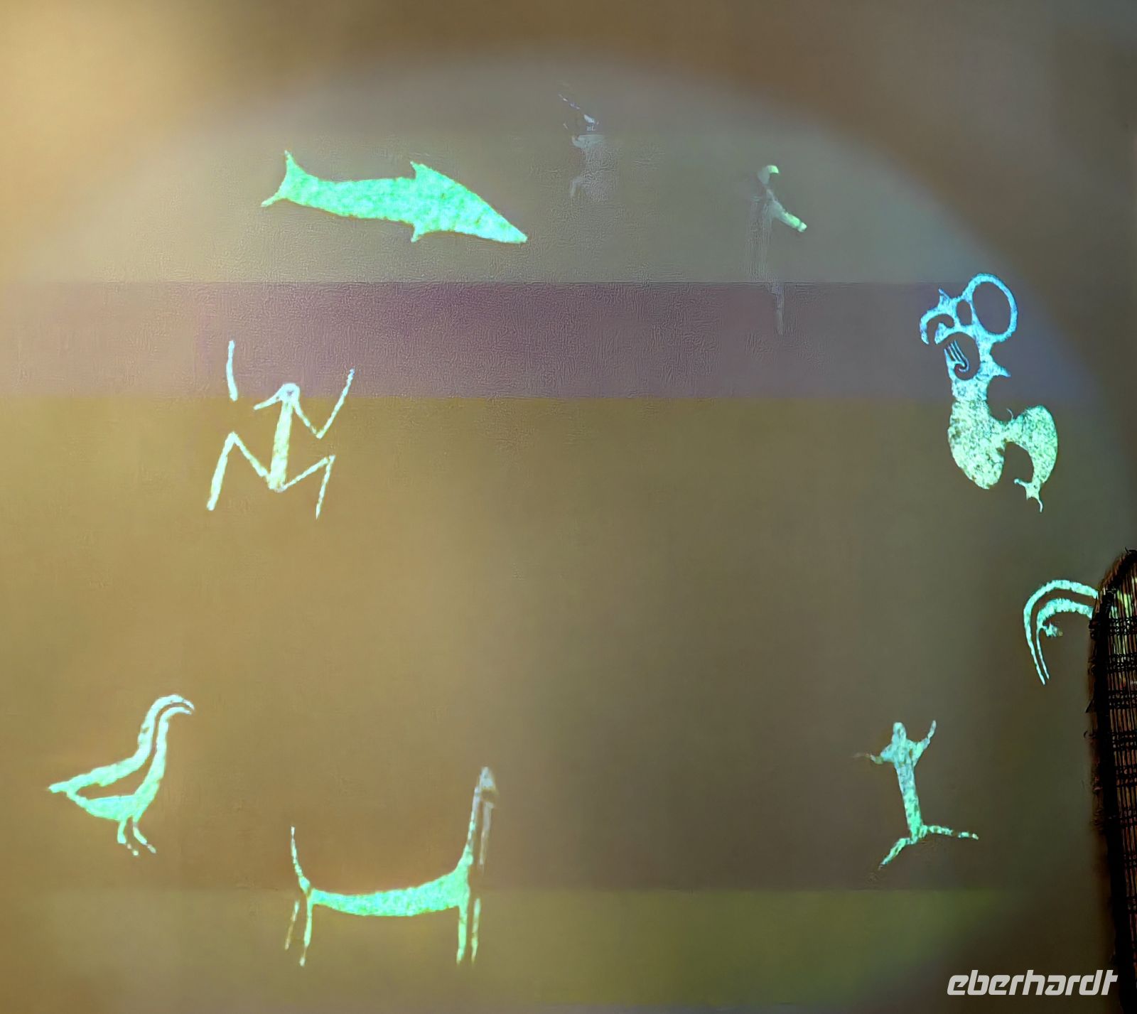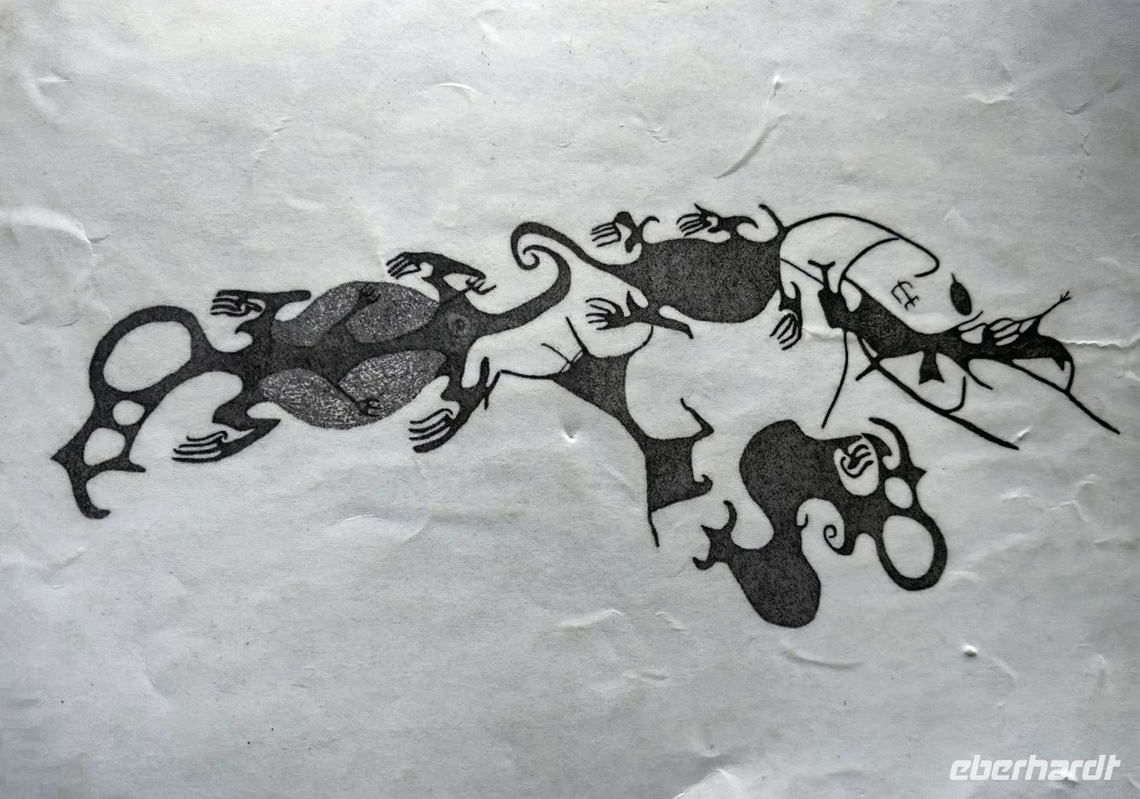 Als wir an den Kalksteinhöhlen ankommen, erkennen wir unter Granitüberhängen Formen in verblasstem Schwarz an Wänden und Decken