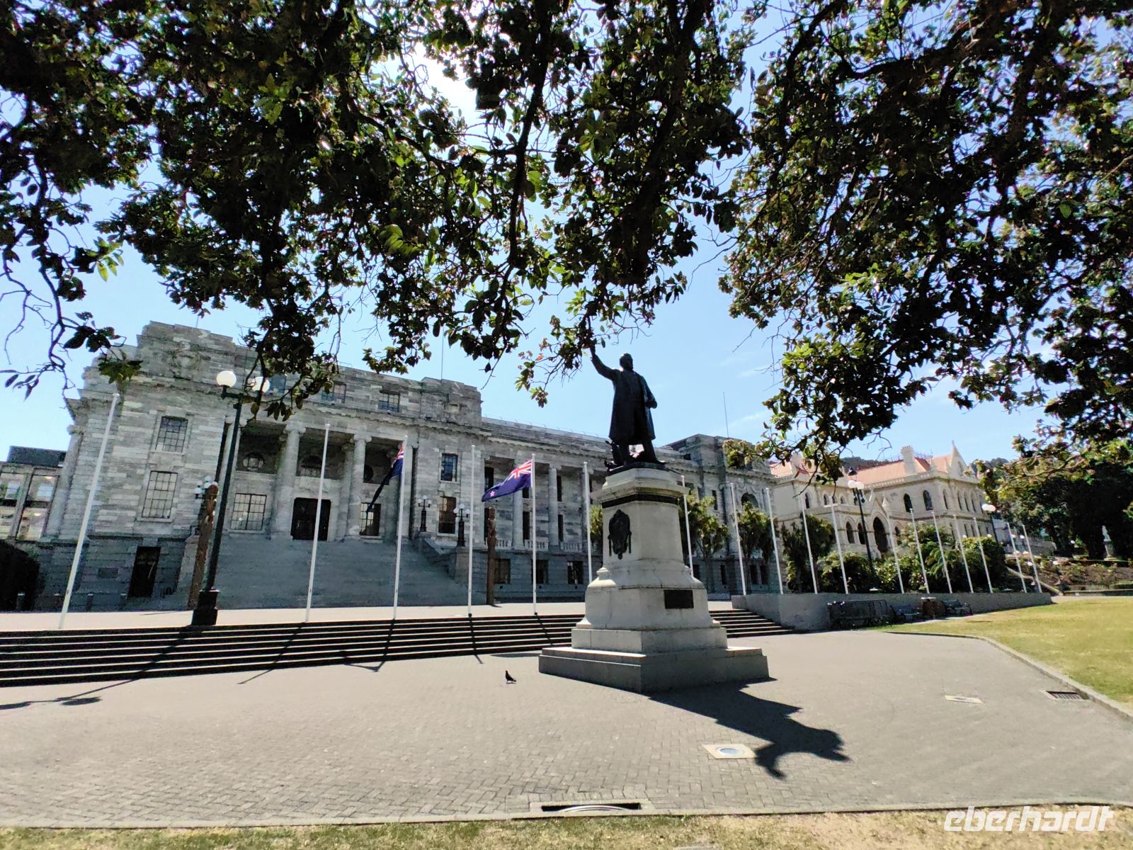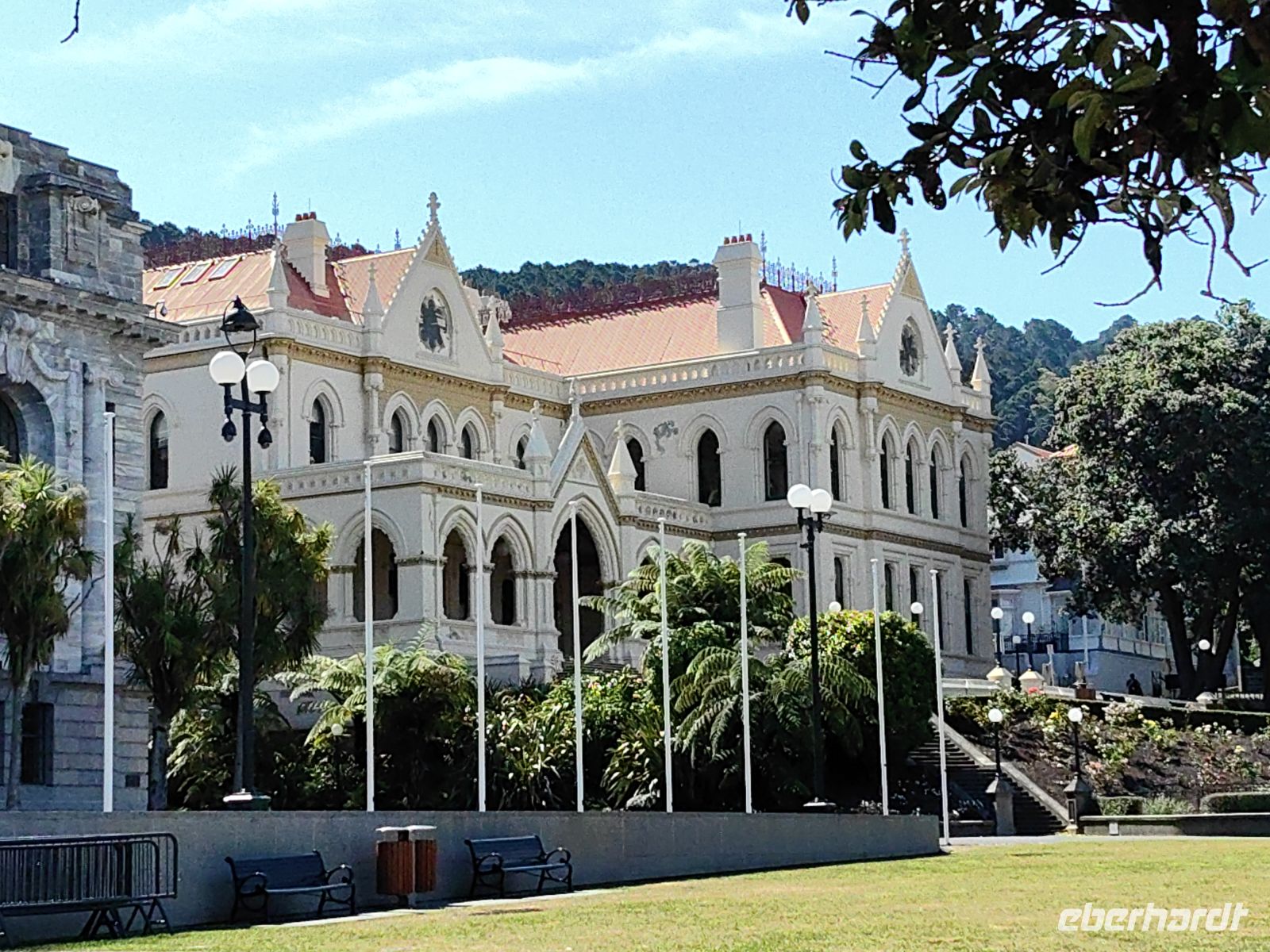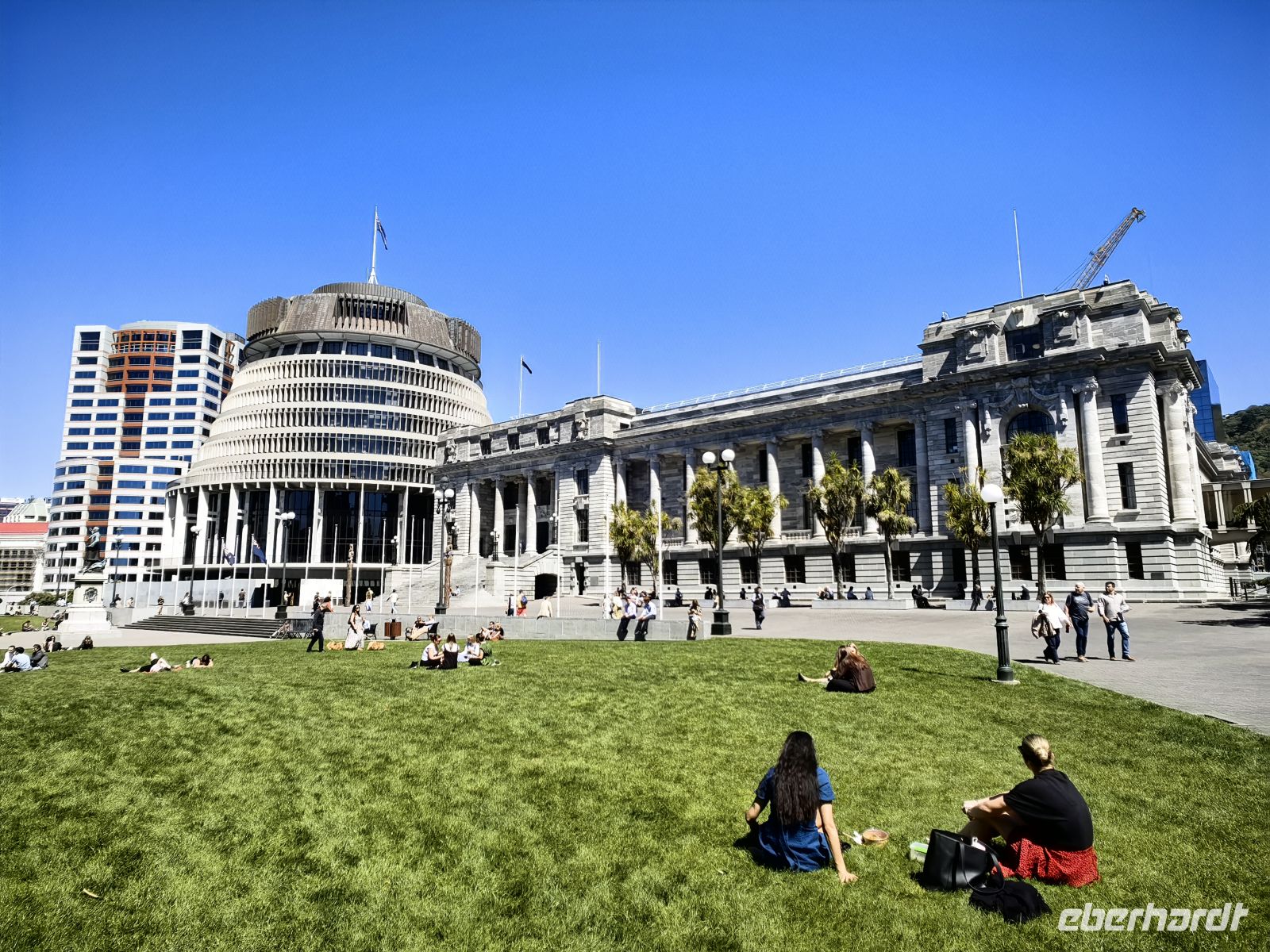 Am berühmten Beehive, dem Parlamentsgebäude in der Form eines Bienenkorbes, verweilen wir kurz. Das in mehreren Abschnitten von 1969 bis 1979 erbaute ungewöhnliche Gebäude, ist 72 Meter hoch und besitzt 14 Etagen, zehn oberirdisch und vier Kellergeschosse. Der Rundbau hat unten einen Durchmesser von rund 55 Meter und verjüngt sich nach oben bis auf 31 Meter an der Kuppel. Ein unterirdischer Gang verbindet das Gebäude mit dem Bowen House, in dem Mitglieder des Parlamentes und die Minister ihre Büros haben. Ganz oben im zehnten Geschoss des Gebäudes befinden sich die Büros des Prime Ministers. Hier tagt auch das Regierungskabinett. Auf den Ebenen neun und acht arbeiten die Regierungsbeamten und von der Etage sieben hinunter zur Etage vier haben die Minister mit ihren Angestellten ihre Büros.