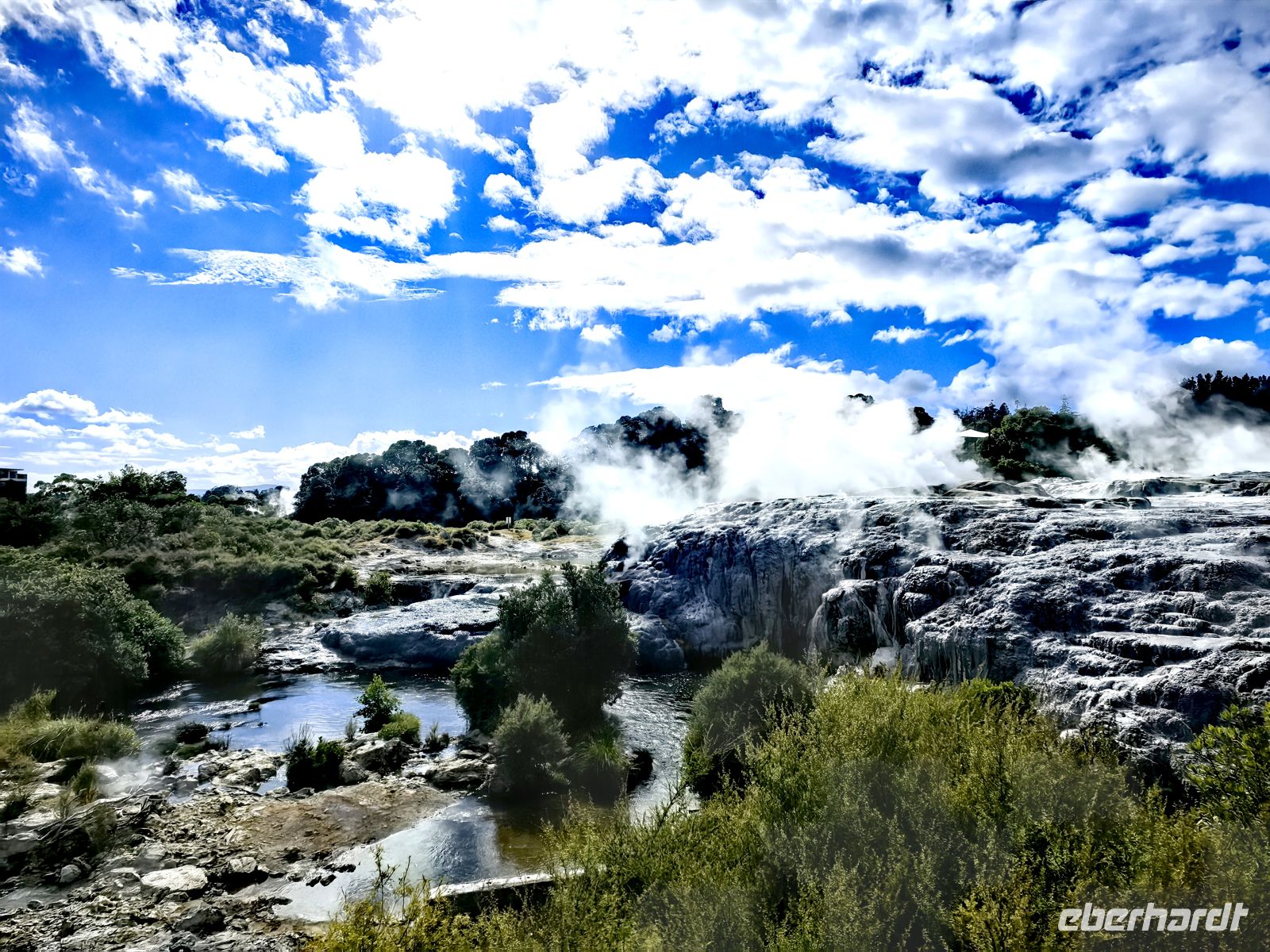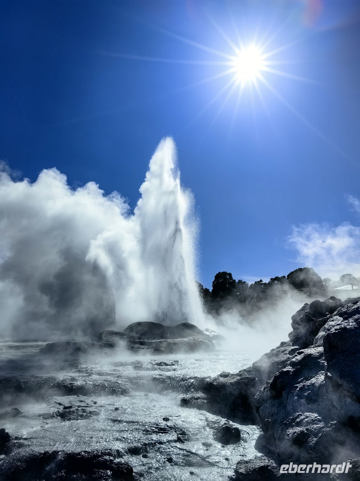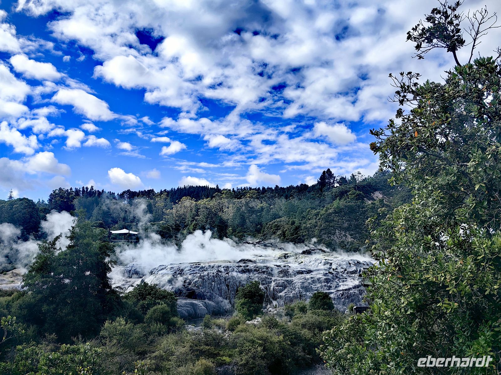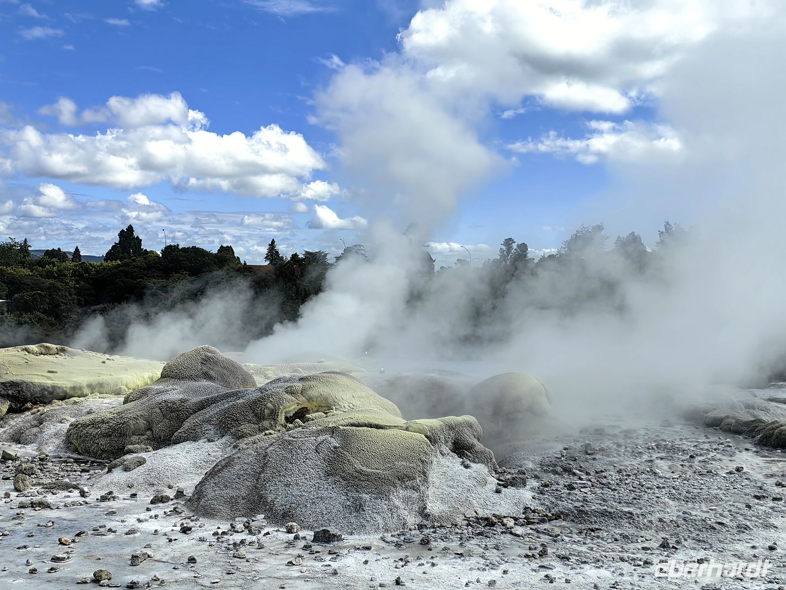 Nach eineinhalb Fahrstunden erreichen wir Rotorua. Der Ort liegt mitten in einer Vulkanzone Neuseelands, das Geothermalfeld reicht von White Islands an der Küste der Bay of Plenty bis zum Mount Ruapehu im Herzen der Nordinsel. Das Waimangu-Vulkantal ist das jüngste geothermische Ökosystem der Welt, das obendrein über die mit 3,8 Hektar größte Thermalquelle verfügt. Es dampft aus dem Boden, als wir nach Te Puia fahren. In der Maorisprache bedeutet der Name soviel wie "Heilige Wasser". Dieses geothermisch aktive Gebiet entstand vor etwa 160.000 Jahren und besteht heute aus heißen Quellen, Kratern, aus denen Schwefeldämpfe steigen, Geysiren und blubbernden Schlammtümpeln. Die Maori nennen es Whakarewarewa. Hier riecht es stark nach Schwefel und grelle Farben prägen den Boden. Sie werden durch Mineralien und Metalle verursacht und kommen aus dem Erdinneren an die Oberfläche. Einmal in der Stunde bricht hier der Pohuto Geysier aus und das Wasser sprudelt dann bis zu 30 Meter hoch. Als wir vor ihm stehen, sprudelt leider nur kurz ein kleiner Nebengeysier hervor. Schade! Daneben sehen wir heiße Quellen und Schlammbäder und sind völlig vom Schwefelgeruch umhüllt. Die Manukasträucher säumen die Wegesränder und an einigen können wir noch die kleinen weißen Blüten sehen, von denen die Bienen den Nektar für den wertvollen und teuren Honig sammeln.