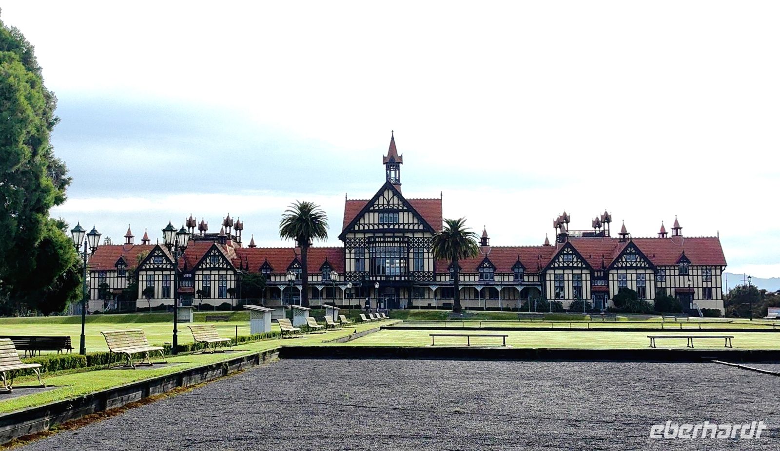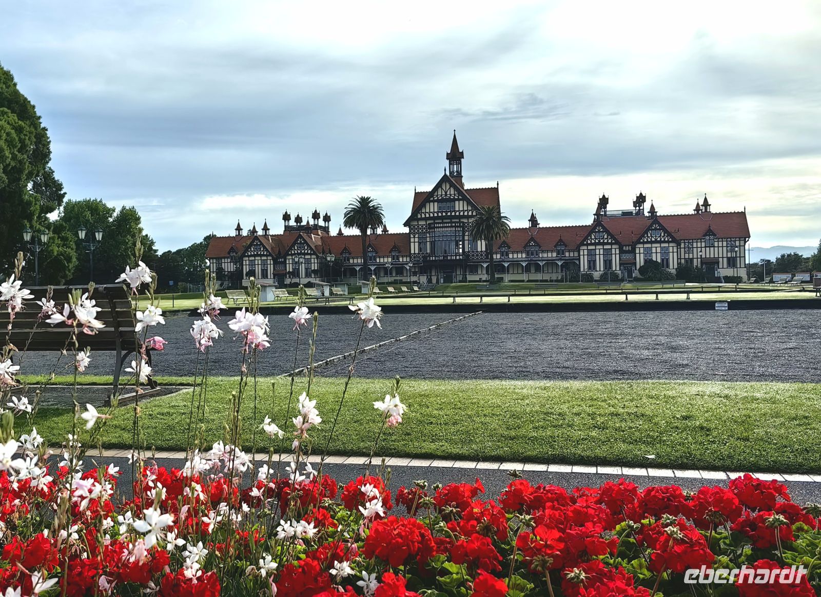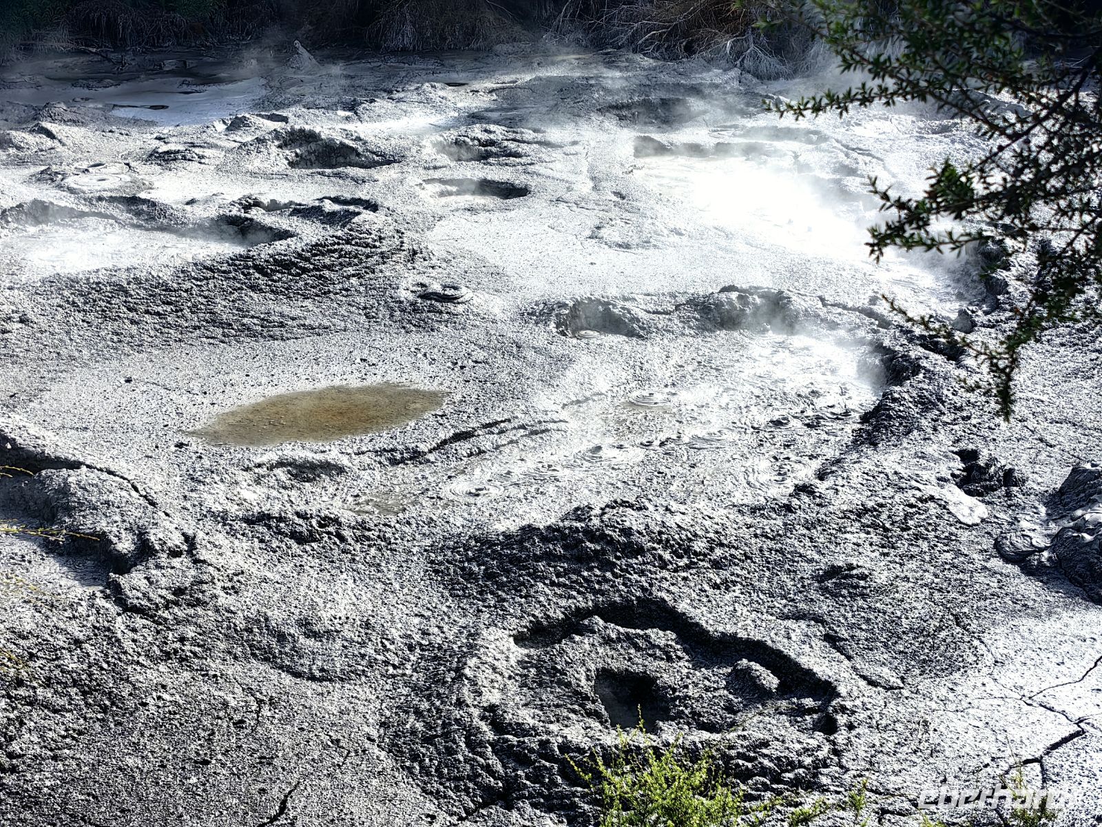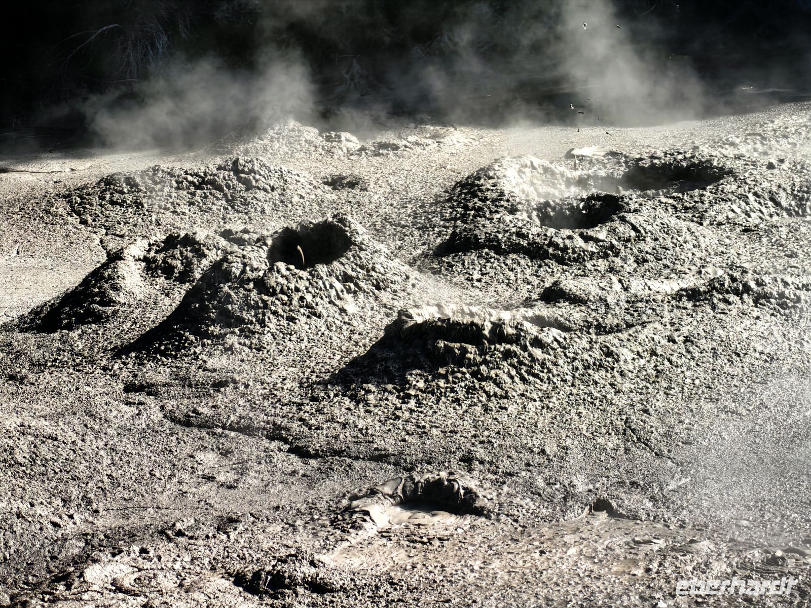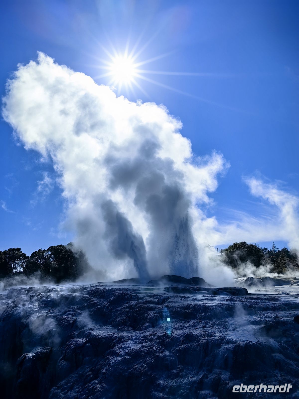 Nach eineinhalb Fahrstunden erreichen wir Rotorua. Der Ort liegt mitten in einer Vulkanzone Neuseelands, das Geothermalfeld reicht von White Islands an der Küste der Bay of Plenty bis zum Mount Ruapehu im Herzen der Nordinsel. Das Waimangu-Vulkantal ist das jüngste geothermische Ökosystem der Welt, das obendrein über die mit 3,8 Hektar größte Thermalquelle verfügt. Es dampft aus dem Boden, als wir nach Te Puia fahren. In der Maorisprache bedeutet der Name soviel wie "Heilige Wasser". Dieses geothermisch aktive Gebiet entstand vor etwa 160.000 Jahren und besteht heute aus heißen Quellen, Kratern, aus denen Schwefeldämpfe steigen, Geysiren und blubbernden Schlammtümpeln. Die Maori nennen es Whakarewarewa. Hier riecht es stark nach Schwefel und grelle Farben prägen den Boden. Sie werden durch Mineralien und Metalle verursacht und kommen aus dem Erdinneren an die Oberfläche. Einmal in der Stunde bricht hier der Pohuto Geysier aus und das Wasser sprudelt dann bis zu 30 Meter hoch. Als wir vor ihm stehen, sprudelt leider nur kurz ein kleiner Nebengeysier hervor. Schade! Daneben sehen wir heiße Quellen und Schlammbäder und sind völlig vom Schwefelgeruch umhüllt. Die Manukasträucher säumen die Wegesränder und an einigen können wir noch die kleinen weißen Blüten sehen, von denen die Bienen den Nektar für den wertvollen und teuren Honig sammeln.