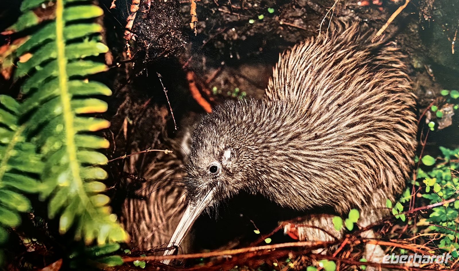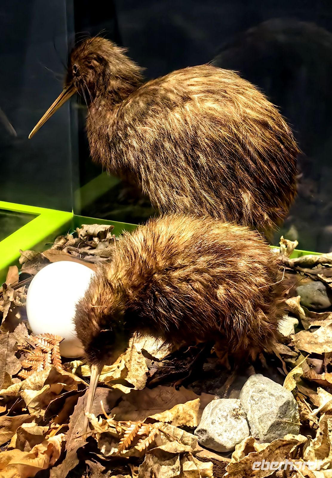 Auf dem Gelände gibt es eine Kiwiaufzuchtstation und endlich haben wir die Möglichkeit, diesen ungewöhnlichen Vogel mit dem langen Schnabel in Aktion zu sehen, wie er vor seinem Bau auf- und abrennt.