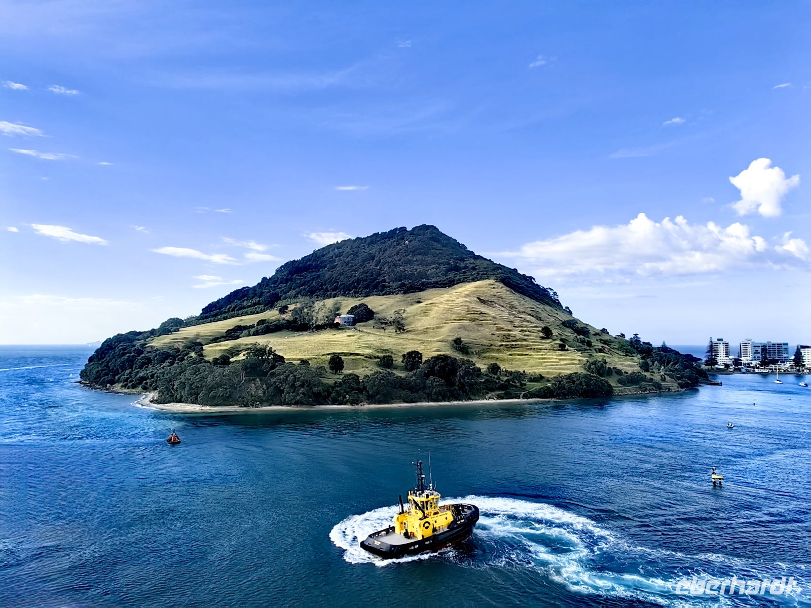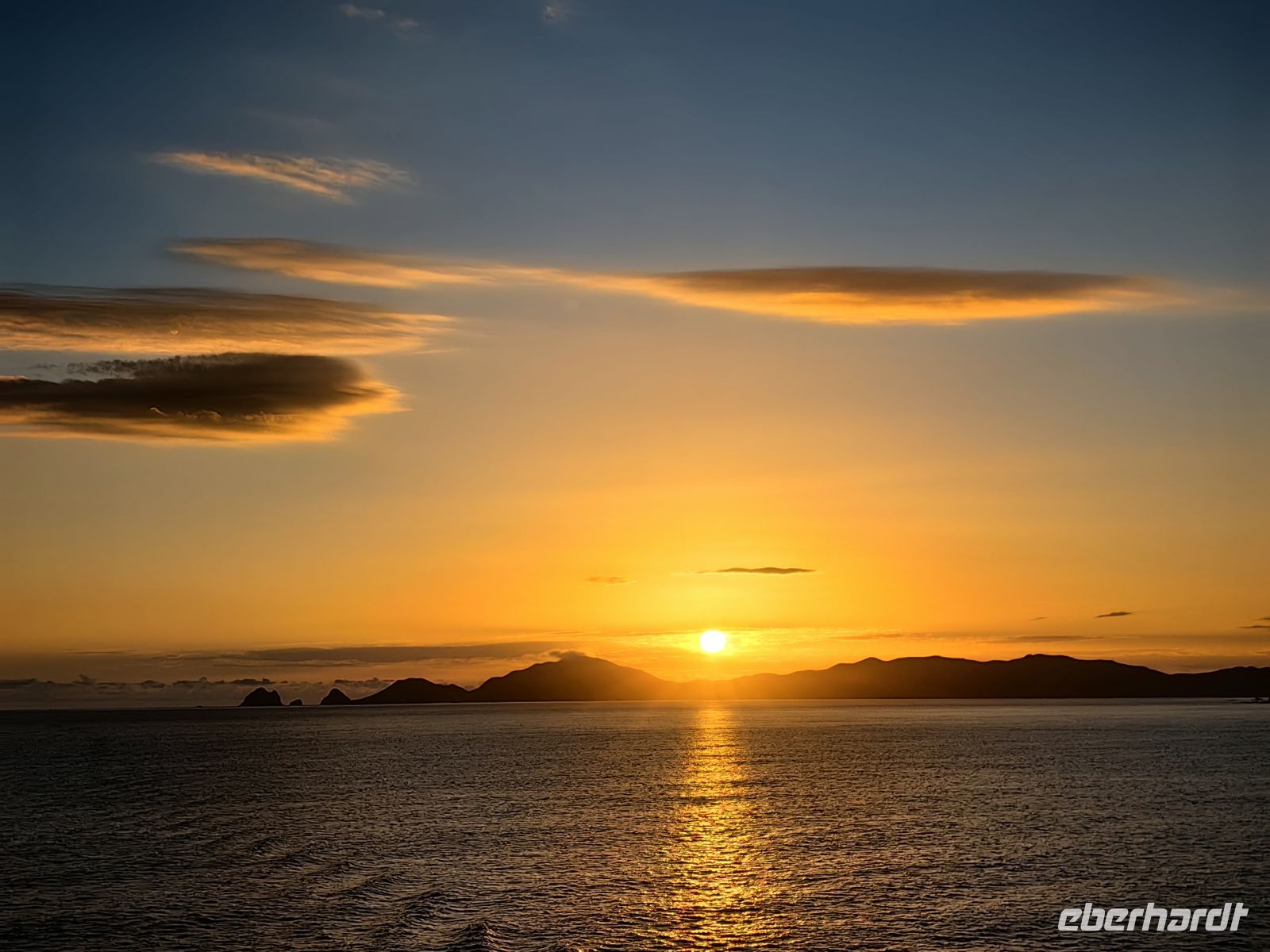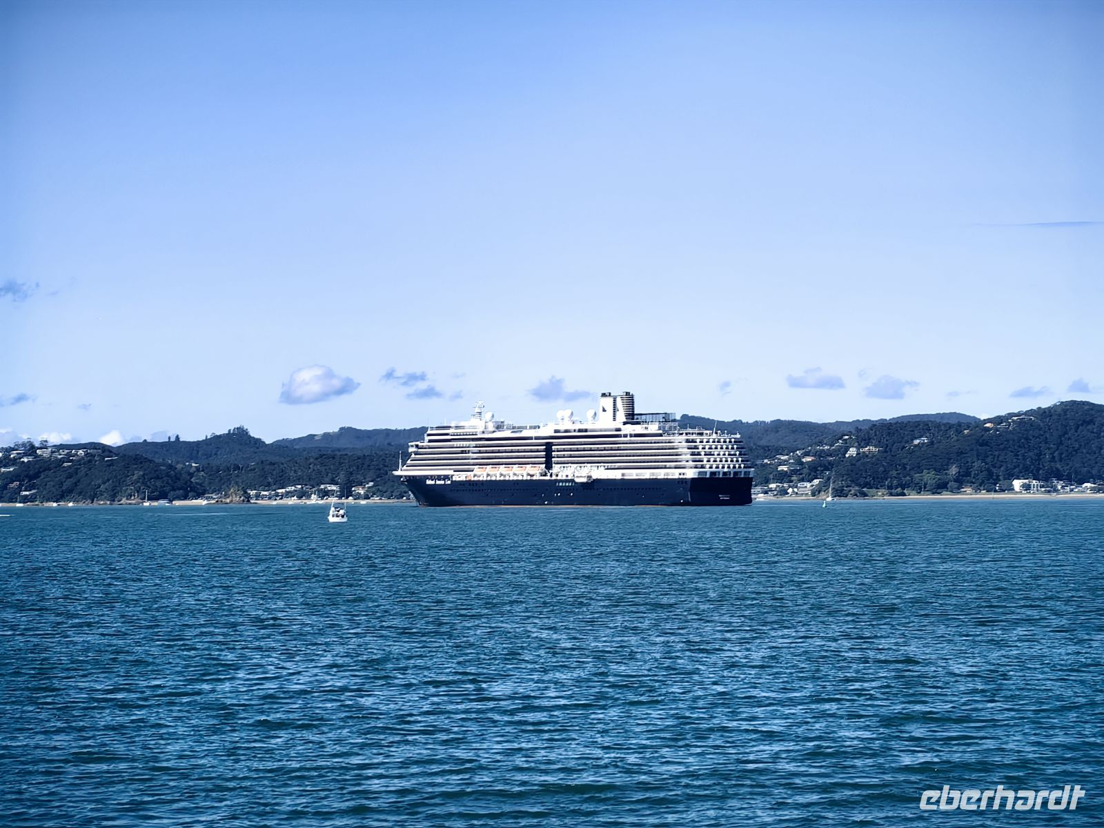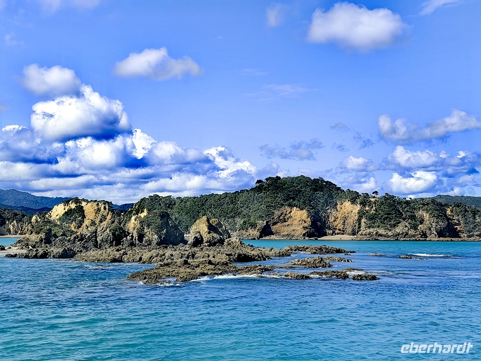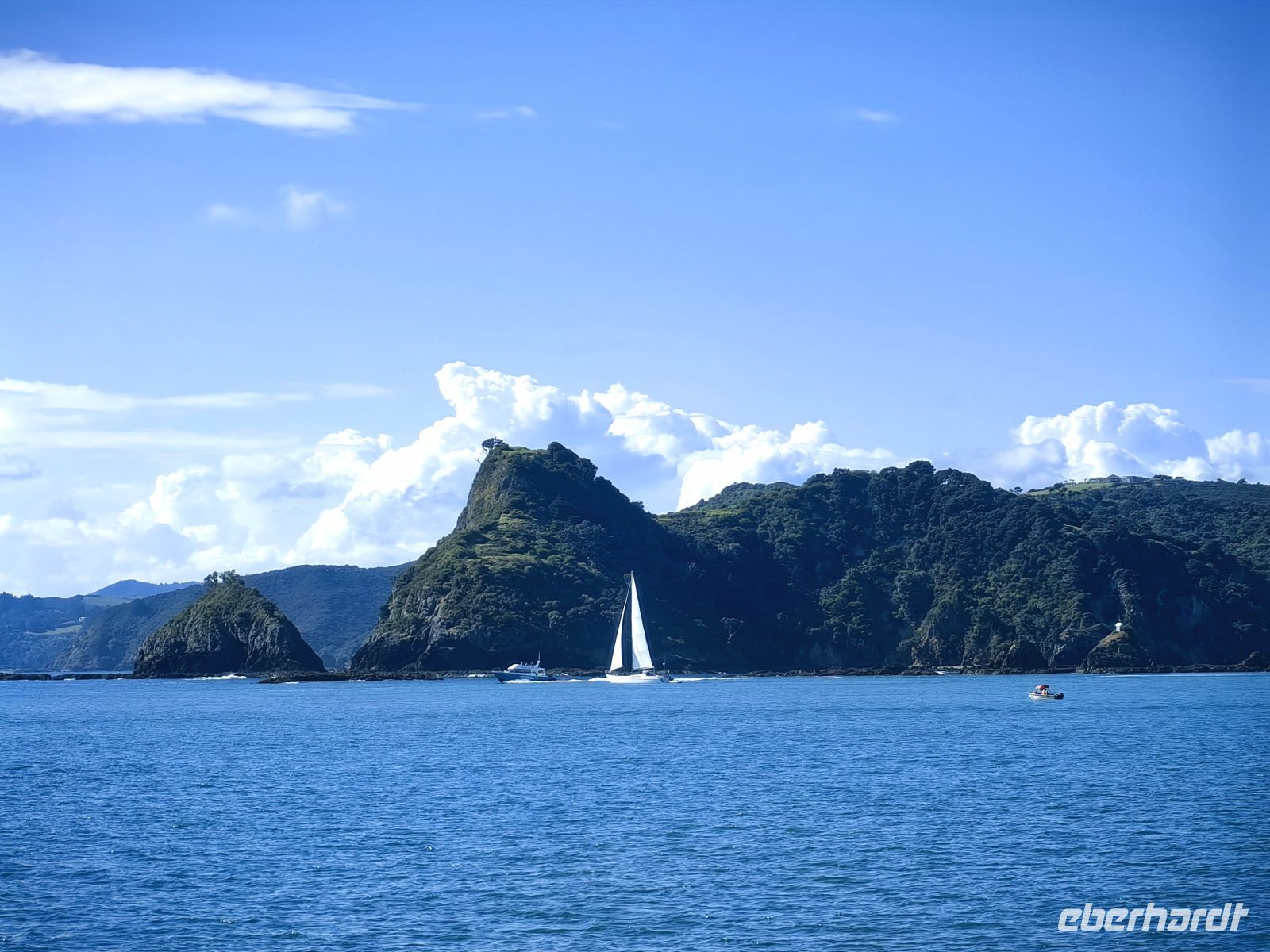 Bereits der heutige Sonnenaufgang übertrifft an Schönheit alle vorangegangenen und als wir in die Bay of Islands einlaufen, wird uns schnell klar, warum diese Regiont zu Neuseelands schönsten und artenreichsten Naturlandschaften gehört. Unendlich viele grüne Inseln mit Traumstränden ragen aus dem Wasser heraus, vor ihnen schaukeln Segelboote und die friedliche Idylle ist kaum in Worte zu fassen. Die Bucht liegt etwa 60 Kilometer nördlich von Whangarei in der Region Northland und hat einen Durchmesser von rund 20 Kilometern. Zahlreiche kleinere Buchten und Lagunen machen sie zu einer abwechslungsreichen Meereslandschaft mit vielfältiger Tierwelt.