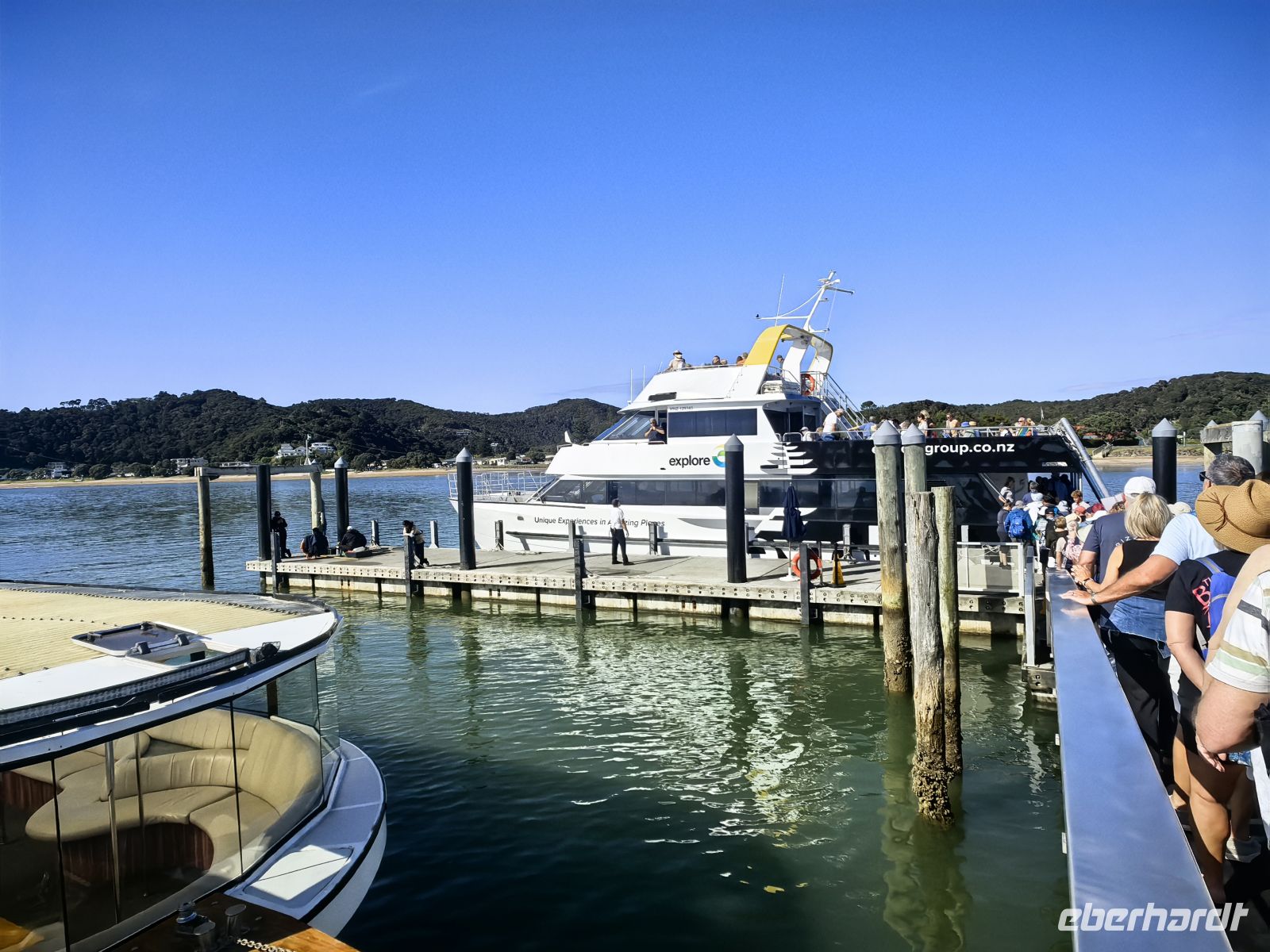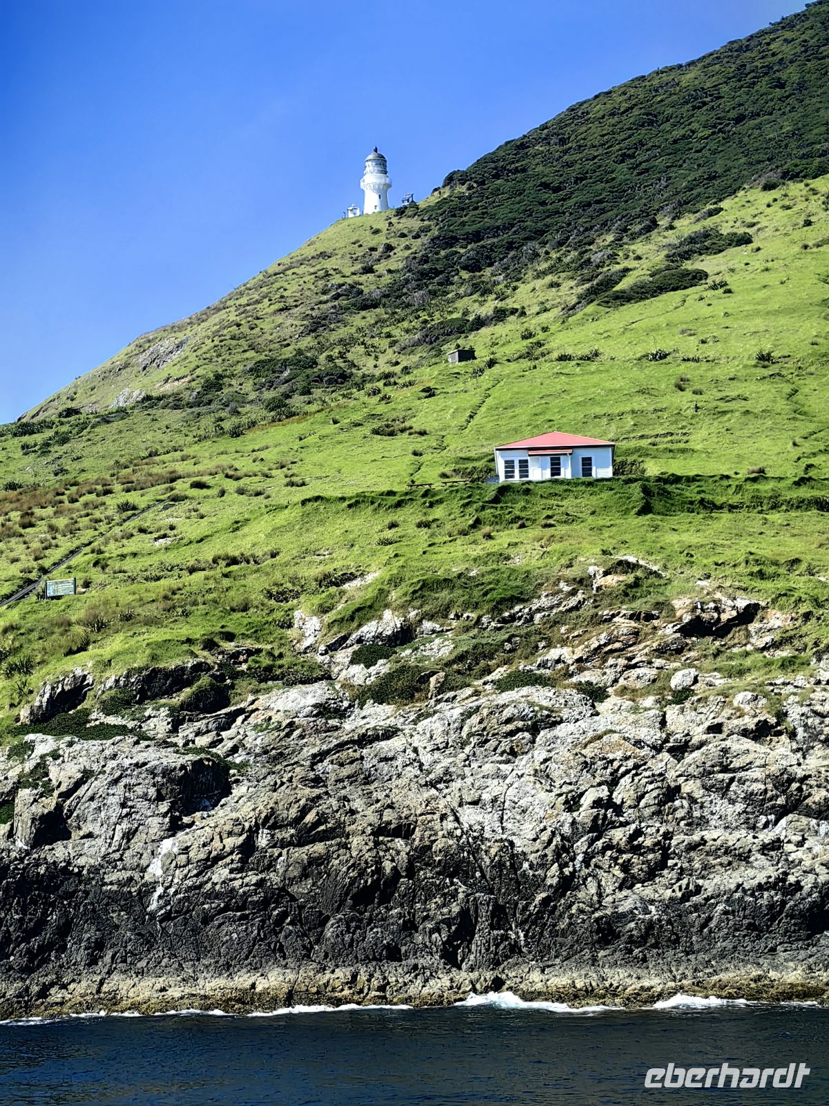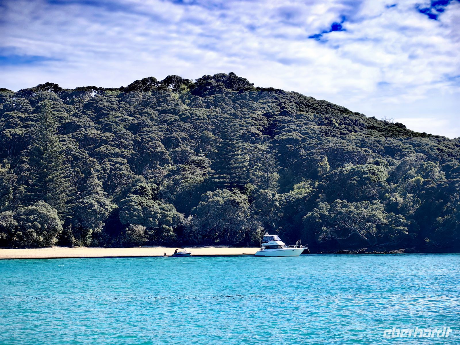 Kurz nach unserer Ankunft an Land wartet bereits ein riesiger Katamaran auf uns, der von einer beherzten Neuseeländerin gesteuert wird. Wir ergattern auf dem Boot die besten Plätze ganz vorn an der Reling und fahren zuerst in Richtung Moturoa. Vor Matuarohia stoppen wir, sehen einen puderzuckerfeinen Sandstrand und plötzlich gleitet in seichtem Wasser ein Rochen genau vor uns am Boot vorbei. Nun passieren wir Urupukapuka und steuern auf die Cape Brett Halbinsel zu. Hoch oben erblicken wir den Leuchtturm und vor ihm ein Häuschen, welches man mieten kann, wenn man es mal gaaaaaaaaanz ruhig haben möchte. Selbstverständlich bekommt man die notwendigen Lebensmittel und Wasser per Schiff geliefert.