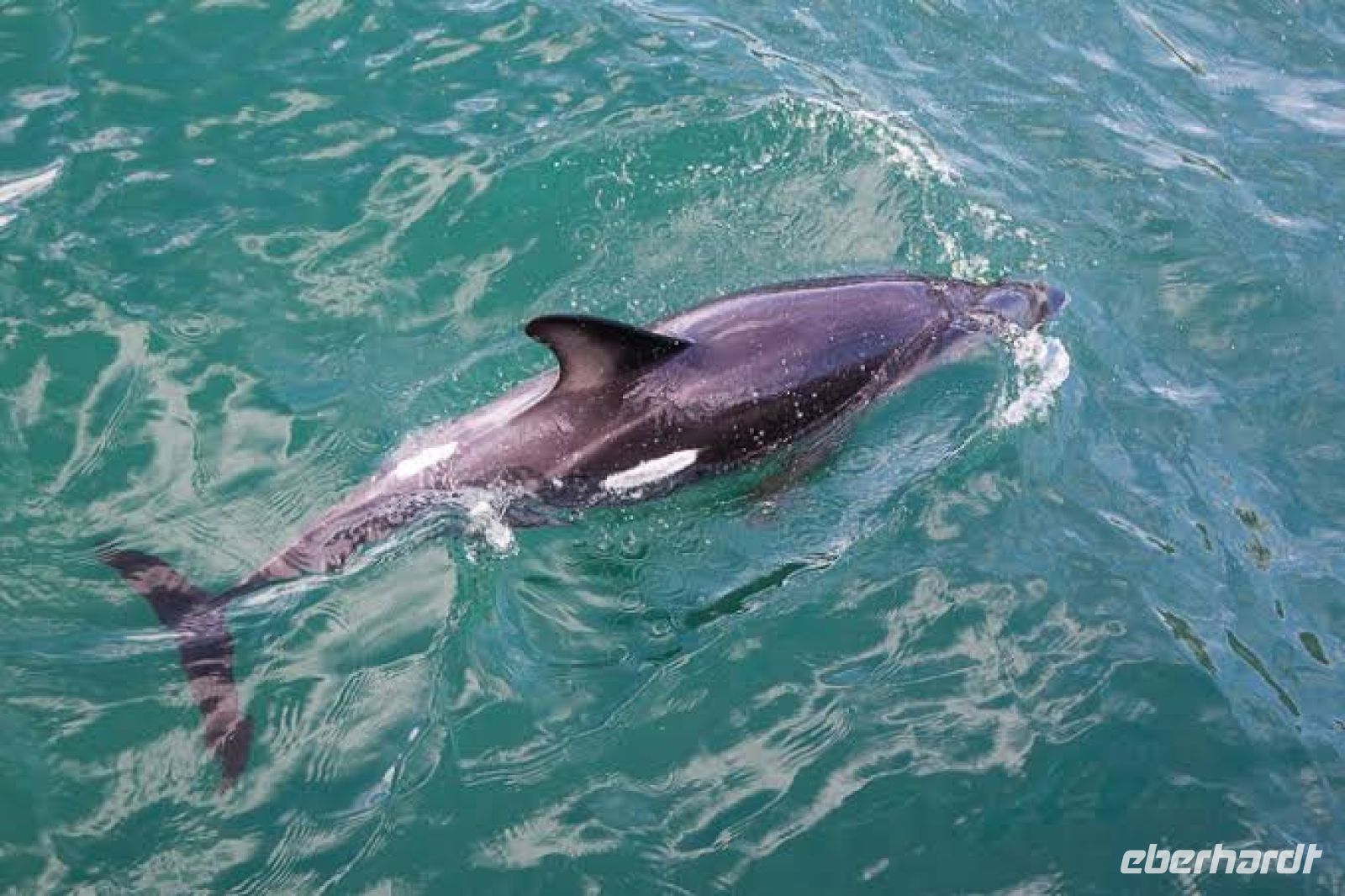Nun ist der Höhepunkt unserer Fahrt gekommen. Wir fahren zu Matukakaka, dem sogenannten Hole in the Rock. Dieser mystische Felsen ragt vor der Bay of Islands in den Pazifikfluten empor und ein riesiges Loch durchdringt ihn. Unsere mutige Kapitänin fährt ganz langsam vor das riesige Loch, drückt plötzlich den Fuß aufs Gaspedal und schon rauschen wir mit dem nicht gerade kleinen Boot durch das Loch hindurch. Alle jubeln, der Beifall ist laut. Danach zeigt sie uns auf der Rückseite des Felsens ein Gesicht, von dem die Maori glauben, es sei das Antlitz einer Frau, die auf ihren Mann wartet, der einst mit einem Waka-Kanu in den Krieg zog und nicht zurückkehrte. Nun glauben wir gar nicht mehr an eine Steigerung und befinden uns bereits auf dem Rückweg nach Pahia. Plötzlich ruft es von oben: Delfine - links.