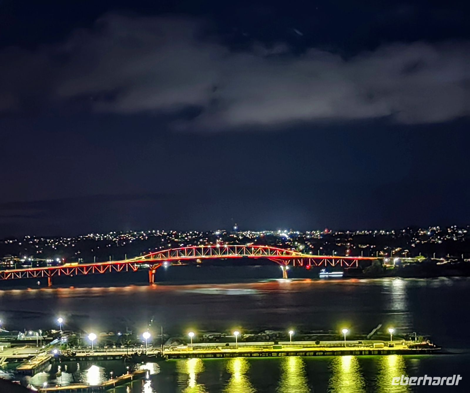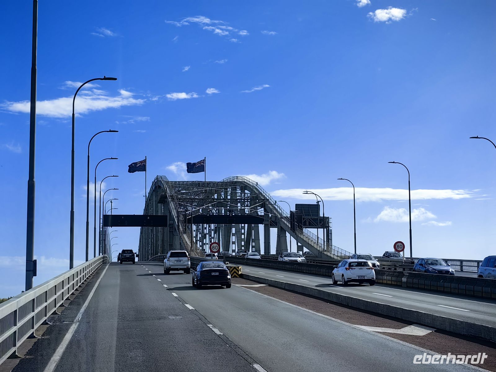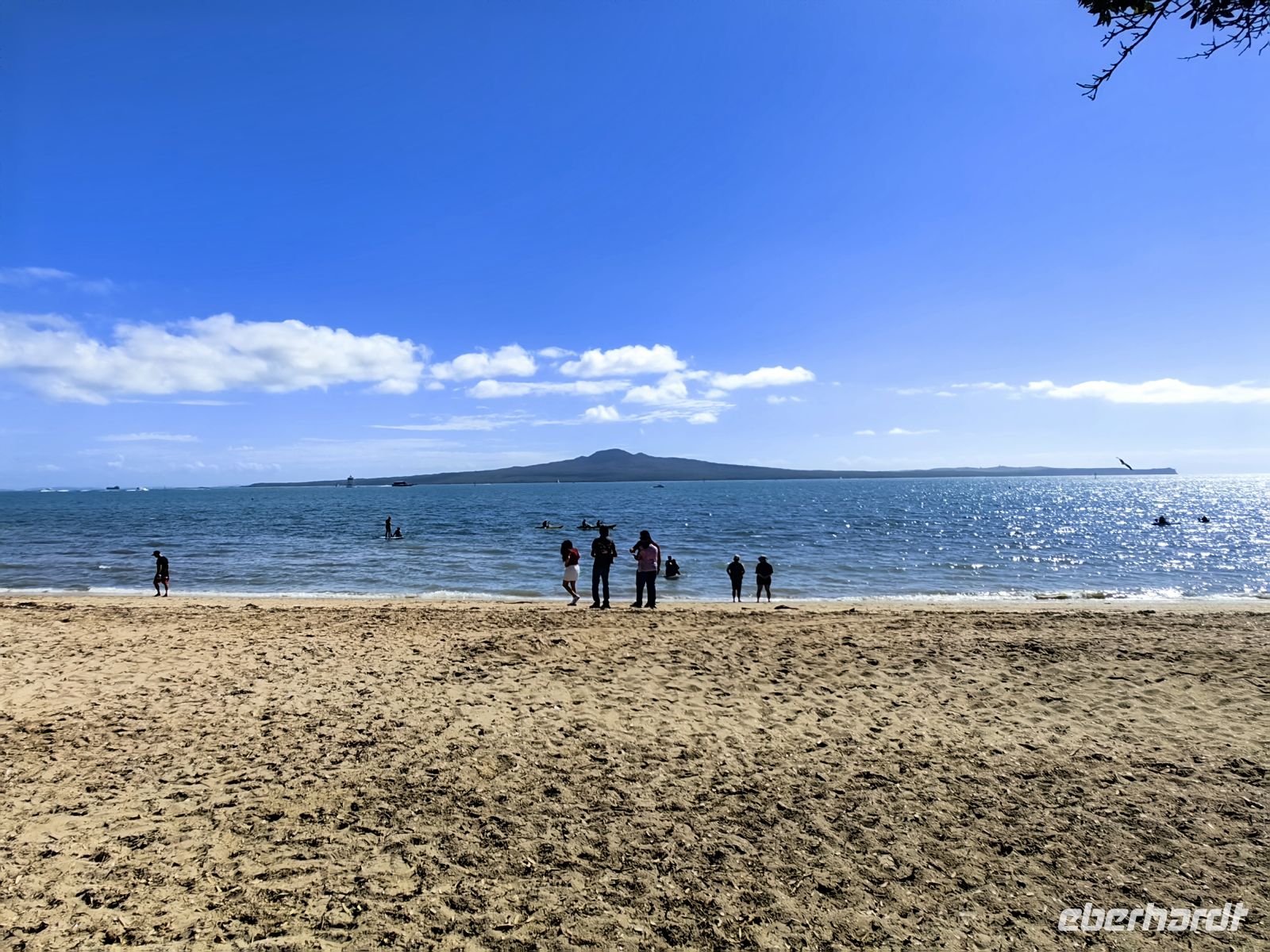 Am heutigen Sonntag ist der Verkehr nicht so stark und wir können es uns erlauben, die Harbour Bridge zu überqueren, von hier oben aus hat man einen fantastischen Blick auf die Skyline von Auckland. Danach fahren wir am Hafen entlang, machen einen Halt am Wintergarten, in dem in zwei Gewächshäusern die schönsten Blumen blühen, die Tomaten reif sind und die Auberginen von den Stängeln hängen. Im historischen Parnell machen wir eine Mittagspause. Hier ist ein wunderschöner Stadtstrand, an dem die Anwohner gern ihre Wochenenden verbringen und von hier aus auf den Rangitoto Vulkan, den jüngsten Aucklands blicken.