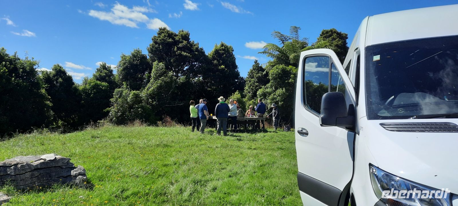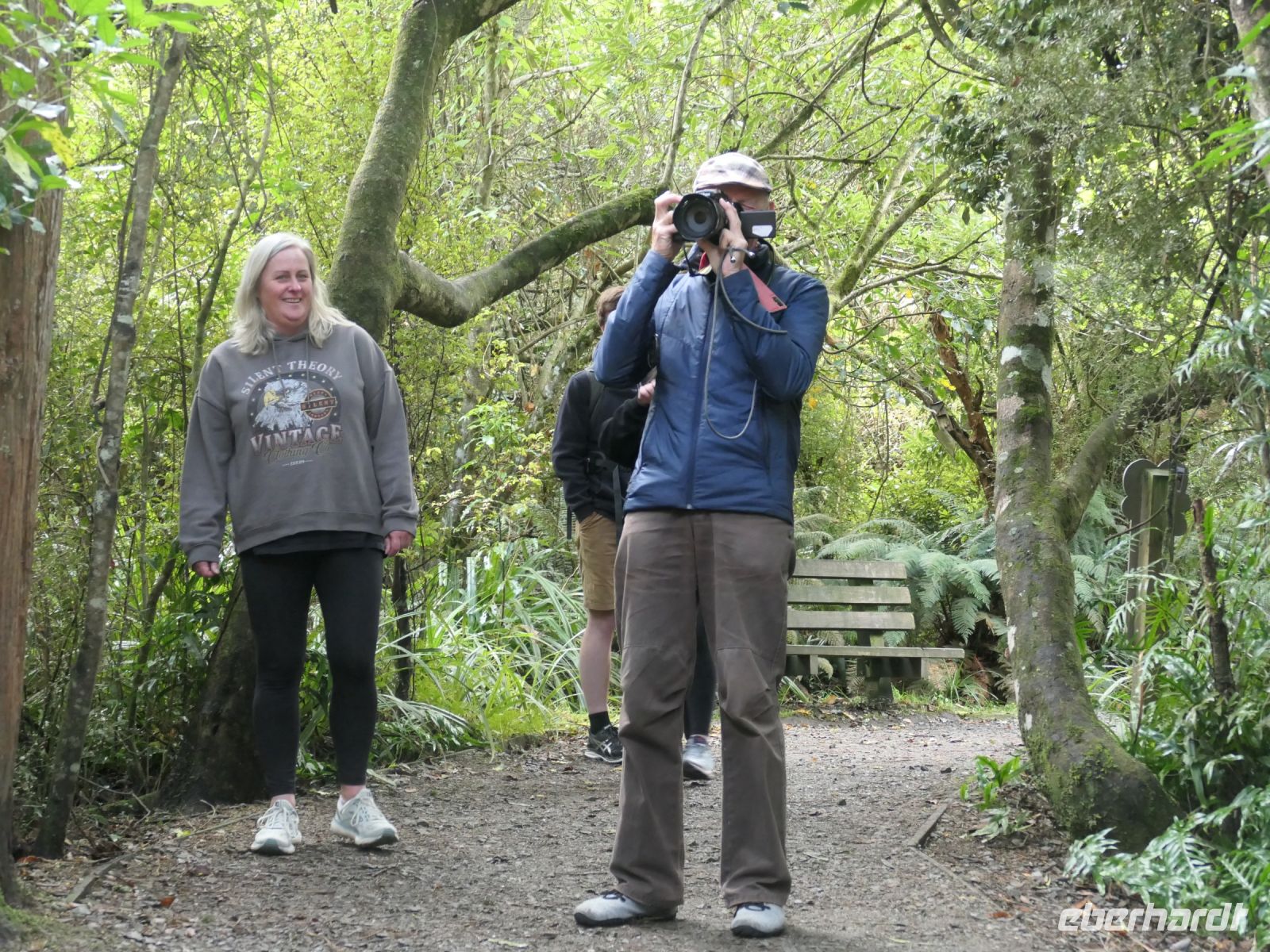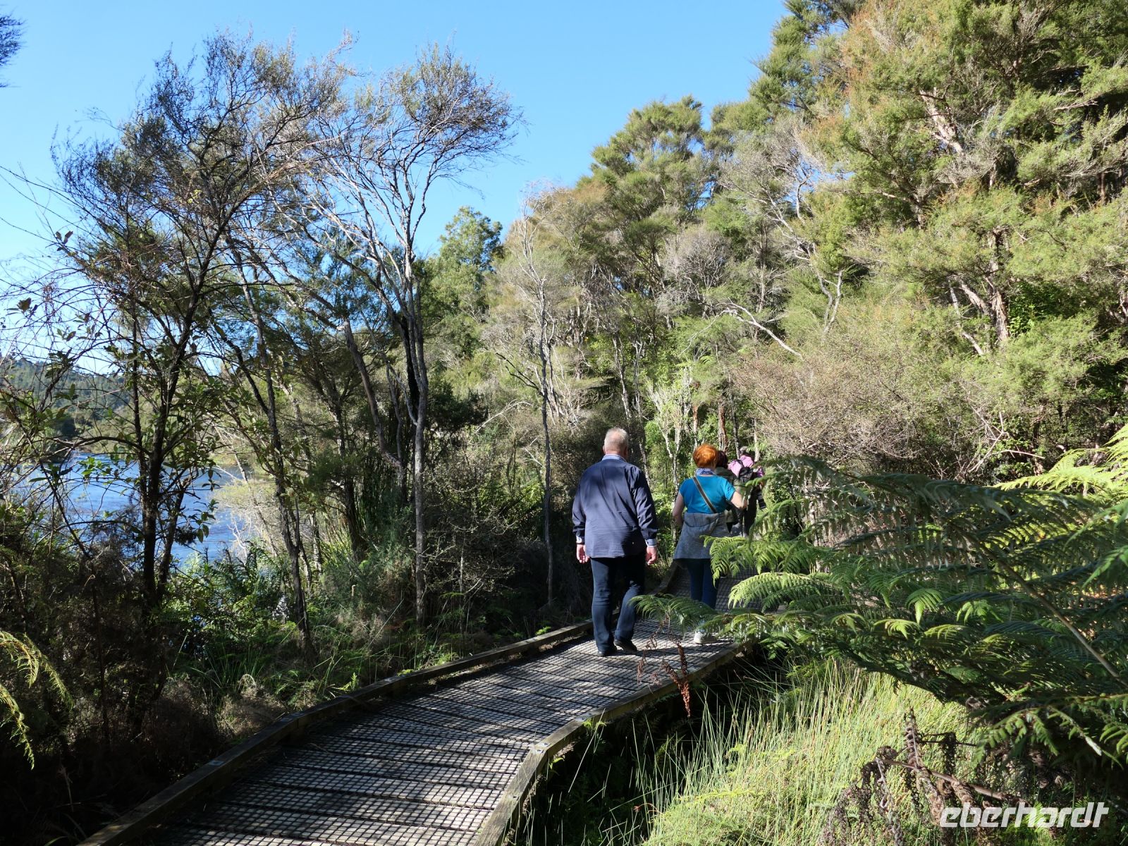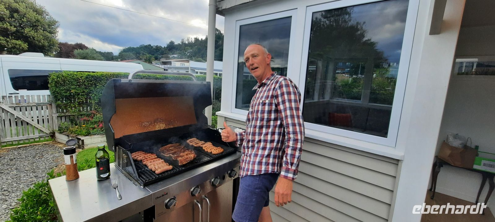 Gefrühstückt wurde, wie in den Motels üblich, individuell in den Zimmern. Die reichlichen Zutaten dafür erhielten wir am Vortag und füllten die Kühlschränke. Auch Eier gehörten dazu, die sorgten bei einigen Gästen für eine Überraschung (denn sie waren nicht vorgekocht). Bei Sonnenschein fuhren wir in nördliche Richtung. An einer Kiwi-Plantage stoppten wir. Die Plantage versteckte sich hinter einer mind. 10 m hohen, akkurat geschnittenen Hecke. Die Kiwi wurde erst Anfang des 20. Jhd. aus China eingeführt. Dort nennt man sie chinesische Stachelbeere. Leider beginnt die Erntesaison erst Ende April, so gab es in den neuseeländischen Supermärkten nur die teure Variante aus Italien. Dafür entdeckten wir eine für uns neue Frucht: die Feijoas waren schon reif. Sie sehen aus wie kleine Avocados, schmeckten aber süß mit einem leicht säuerlichen Touch. Am sonnigen Hahei Beach steckten wir unsere Füße ins Wasser und in den Sand, ließen die Seele baumeln. Die Mittagspause verbrachten wir in Whitianga (mit F) an der Mercury Bay. Am Nachmittag wanderten wir durch den dichten Regenwald auf dem Whenuakite Kauri Walk, den wir nur mit sauberen Schuhen betreten durften. Neuseeland achtet sehr auf den Schutz seiner endemischen Flora. Zurück in Tairua entführte Bernd einige Reisegäste auf den Hausberg Paku Hill, während Annett in der Küche des Ferienhauses werkelte und das anstehende Eberhardt BBQ vorbereitete. Am Abend trafen sich alle zum gemütlichen Beisammensein im Garten. Reiseleiter Bernd brillierte als Grillmeister, Annett war für den Gästeservice und die Bar verantwortlich. Der Abwasch war Dank Spülmaschine schnell erledigt und zu später Stunde sagten wir Gute Nacht!