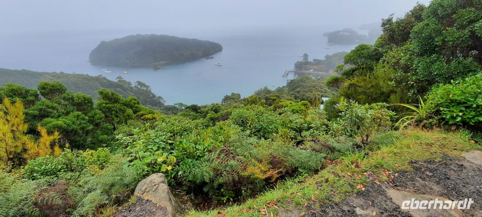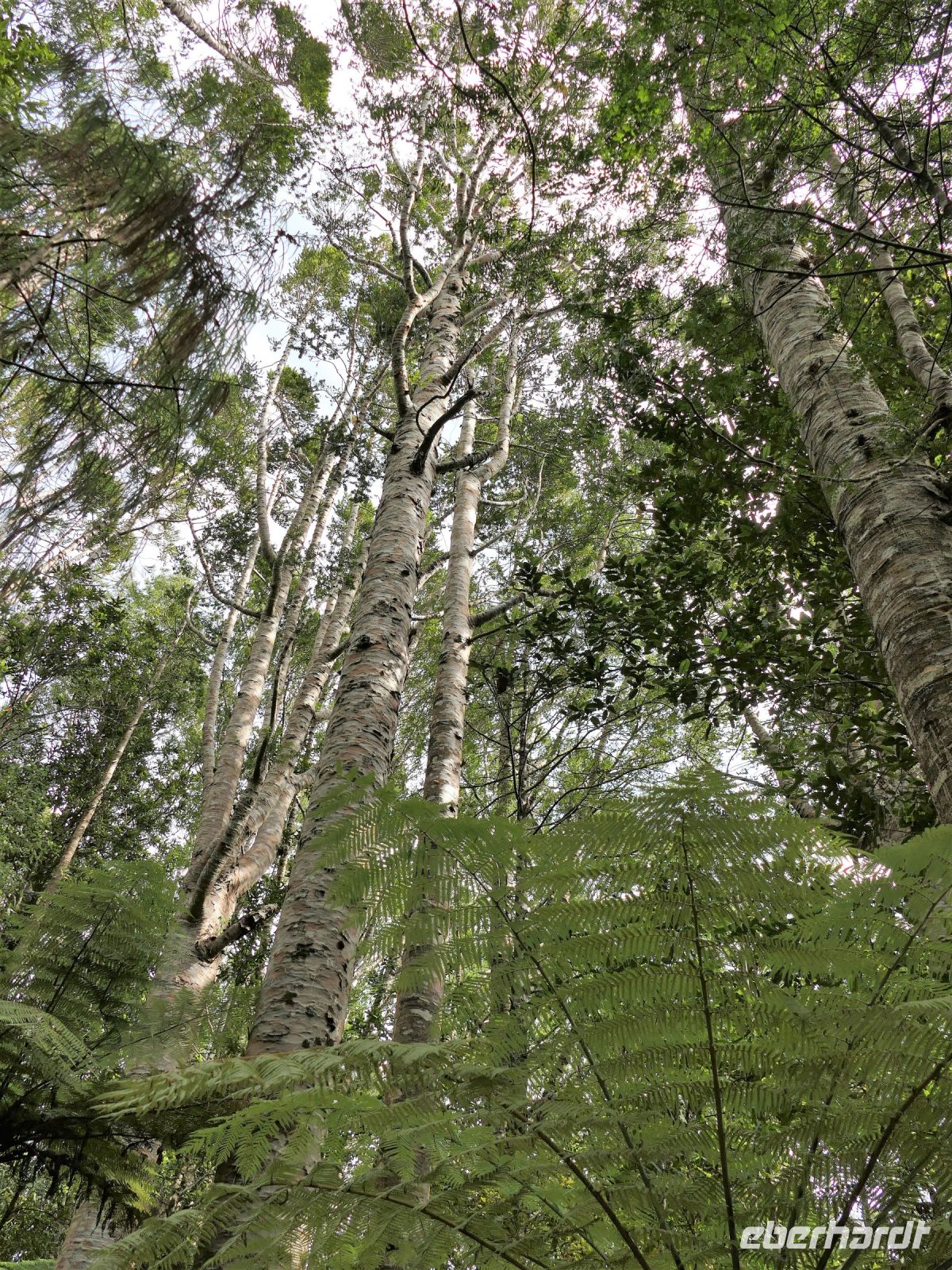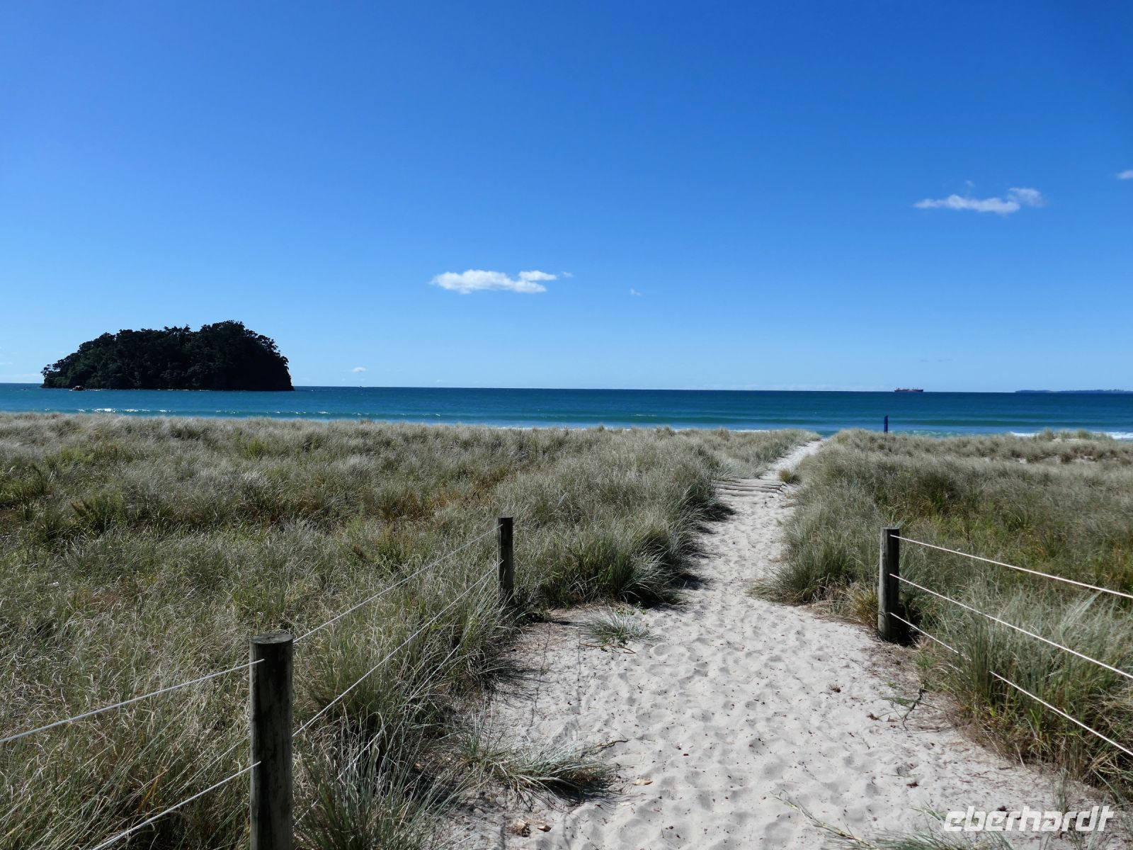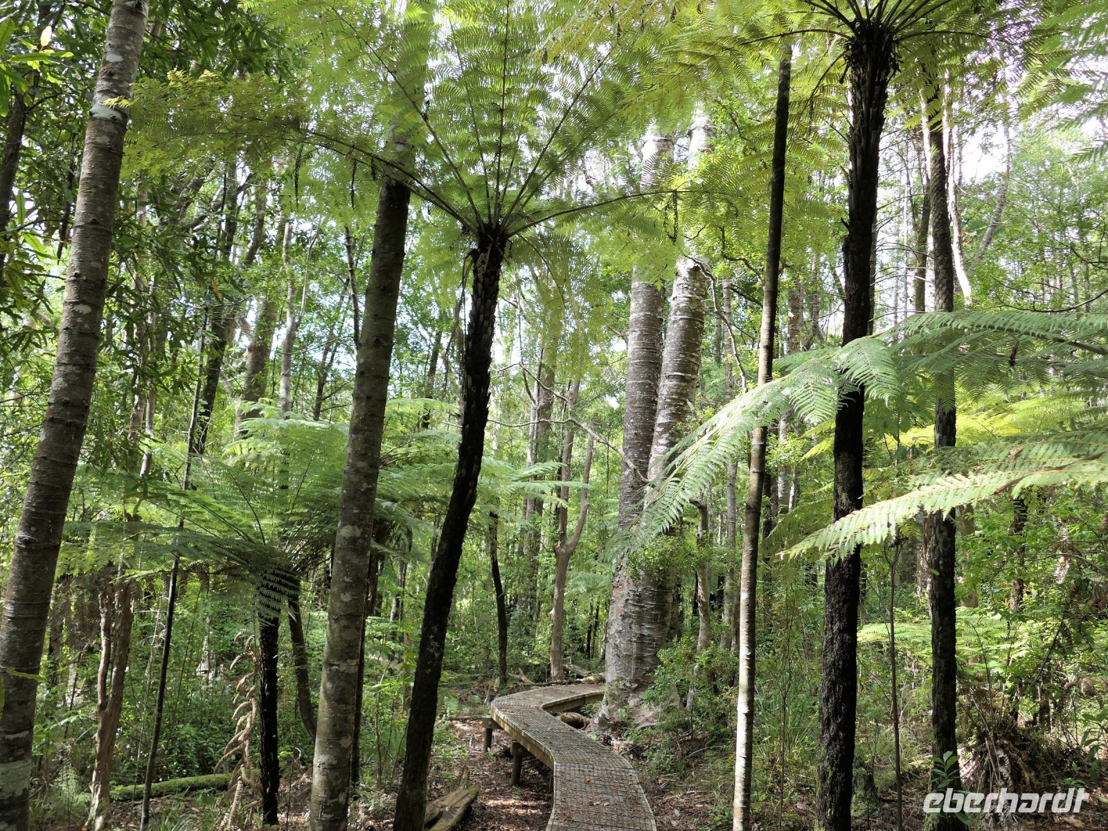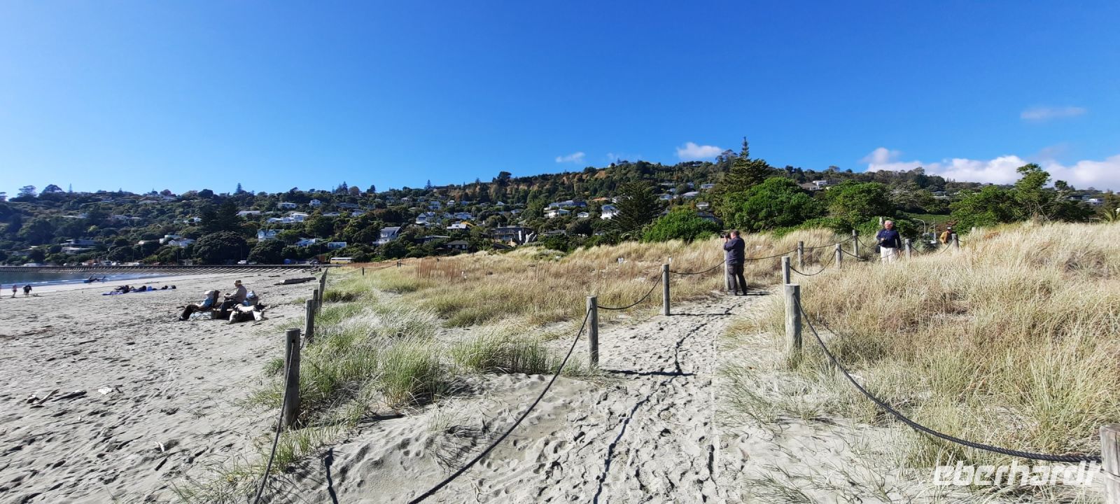 Gefrühstückt wurde, wie in den Motels üblich, individuell in den Zimmern. Die reichlichen Zutaten dafür erhielten wir am Vortag und füllten die Kühlschränke. Auch Eier gehörten dazu, die sorgten bei einigen Gästen für eine Überraschung (denn sie waren nicht vorgekocht). Bei Sonnenschein fuhren wir in nördliche Richtung. An einer Kiwi-Plantage stoppten wir. Die Plantage versteckte sich hinter einer mind. 10 m hohen, akkurat geschnittenen Hecke. Die Kiwi wurde erst Anfang des 20. Jhd. aus China eingeführt. Dort nennt man sie chinesische Stachelbeere. Leider beginnt die Erntesaison erst Ende April, so gab es in den neuseeländischen Supermärkten nur die teure Variante aus Italien. Dafür entdeckten wir eine für uns neue Frucht: die Feijoas waren schon reif. Sie sehen aus wie kleine Avocados, schmeckten aber süß mit einem leicht säuerlichen Touch. Am sonnigen Hahei Beach steckten wir unsere Füße ins Wasser und in den Sand, ließen die Seele baumeln. Die Mittagspause verbrachten wir in Whitianga (mit F) an der Mercury Bay. Am Nachmittag wanderten wir durch den dichten Regenwald auf dem Whenuakite Kauri Walk, den wir nur mit sauberen Schuhen betreten durften. Neuseeland achtet sehr auf den Schutz seiner endemischen Flora. Zurück in Tairua entführte Bernd einige Reisegäste auf den Hausberg Paku Hill, während Annett in der Küche des Ferienhauses werkelte und das anstehende Eberhardt BBQ vorbereitete. Am Abend trafen sich alle zum gemütlichen Beisammensein im Garten. Reiseleiter Bernd brillierte als Grillmeister, Annett war für den Gästeservice und die Bar verantwortlich. Der Abwasch war Dank Spülmaschine schnell erledigt und zu später Stunde sagten wir Gute Nacht!
