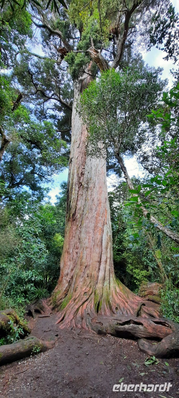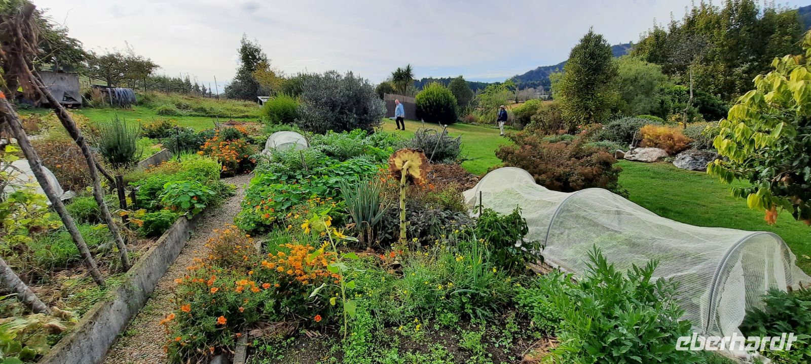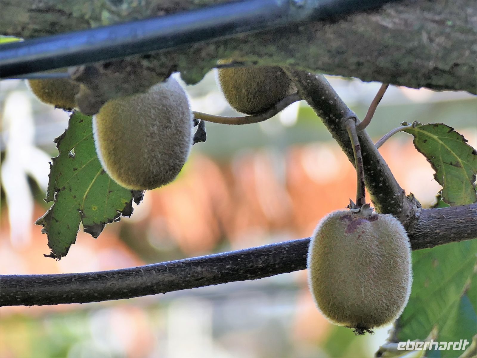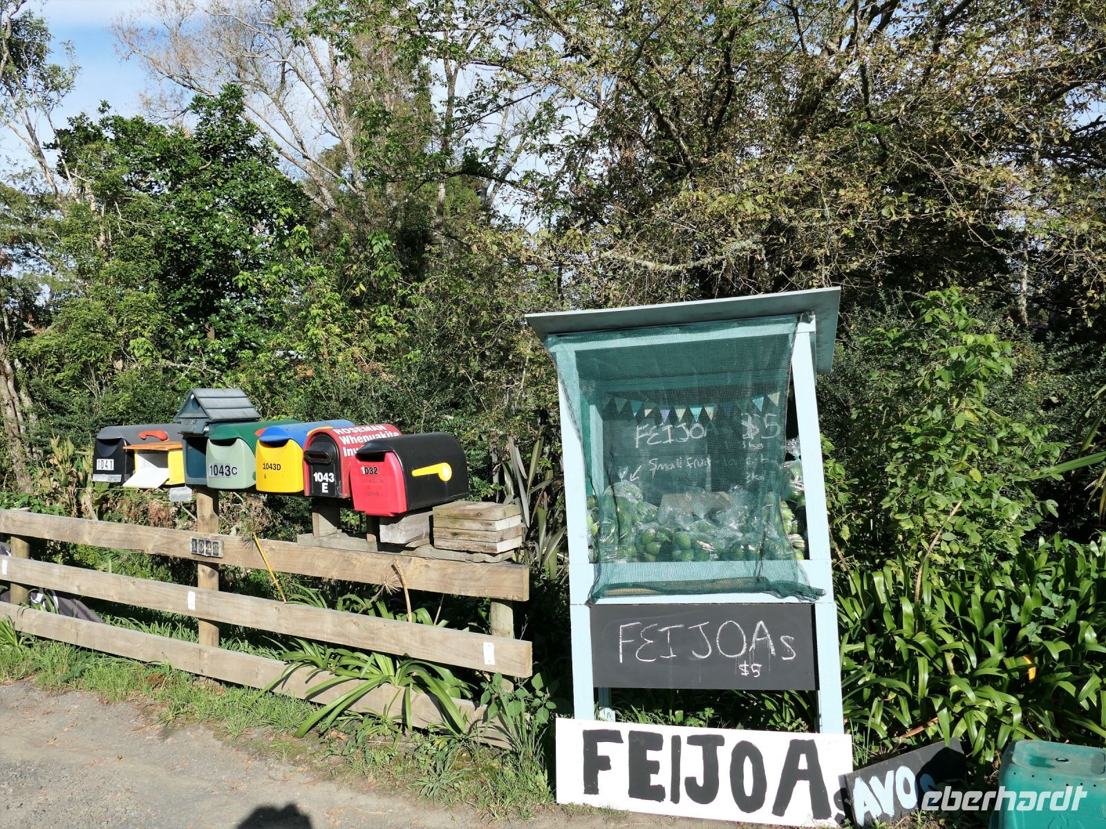 Gefrühstückt wurde, wie in den Motels üblich, individuell in den Zimmern. Die reichlichen Zutaten dafür erhielten wir am Vortag und füllten die Kühlschränke. Auch Eier gehörten dazu, die sorgten bei einigen Gästen für eine Überraschung (denn sie waren nicht vorgekocht). Bei Sonnenschein fuhren wir in nördliche Richtung. An einer Kiwi-Plantage stoppten wir. Die Plantage versteckte sich hinter einer mind. 10 m hohen, akkurat geschnittenen Hecke. Die Kiwi wurde erst Anfang des 20. Jhd. aus China eingeführt. Dort nennt man sie chinesische Stachelbeere. Leider beginnt die Erntesaison erst Ende April, so gab es in den neuseeländischen Supermärkten nur die teure Variante aus Italien. Dafür entdeckten wir eine für uns neue Frucht: die Feijoas waren schon reif. Sie sehen aus wie kleine Avocados, schmeckten aber süß mit einem leicht säuerlichen Touch. Am sonnigen Hahei Beach steckten wir unsere Füße ins Wasser und in den Sand, ließen die Seele baumeln. Die Mittagspause verbrachten wir in Whitianga (mit F) an der Mercury Bay. Am Nachmittag wanderten wir durch den dichten Regenwald auf dem Whenuakite Kauri Walk, den wir nur mit sauberen Schuhen betreten durften. Neuseeland achtet sehr auf den Schutz seiner endemischen Flora. Zurück in Tairua entführte Bernd einige Reisegäste auf den Hausberg Paku Hill, während Annett in der Küche des Ferienhauses werkelte und das anstehende Eberhardt BBQ vorbereitete. Am Abend trafen sich alle zum gemütlichen Beisammensein im Garten. Reiseleiter Bernd brillierte als Grillmeister, Annett war für den Gästeservice und die Bar verantwortlich. Der Abwasch war Dank Spülmaschine schnell erledigt und zu später Stunde sagten wir Gute Nacht!