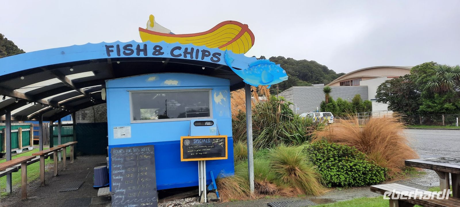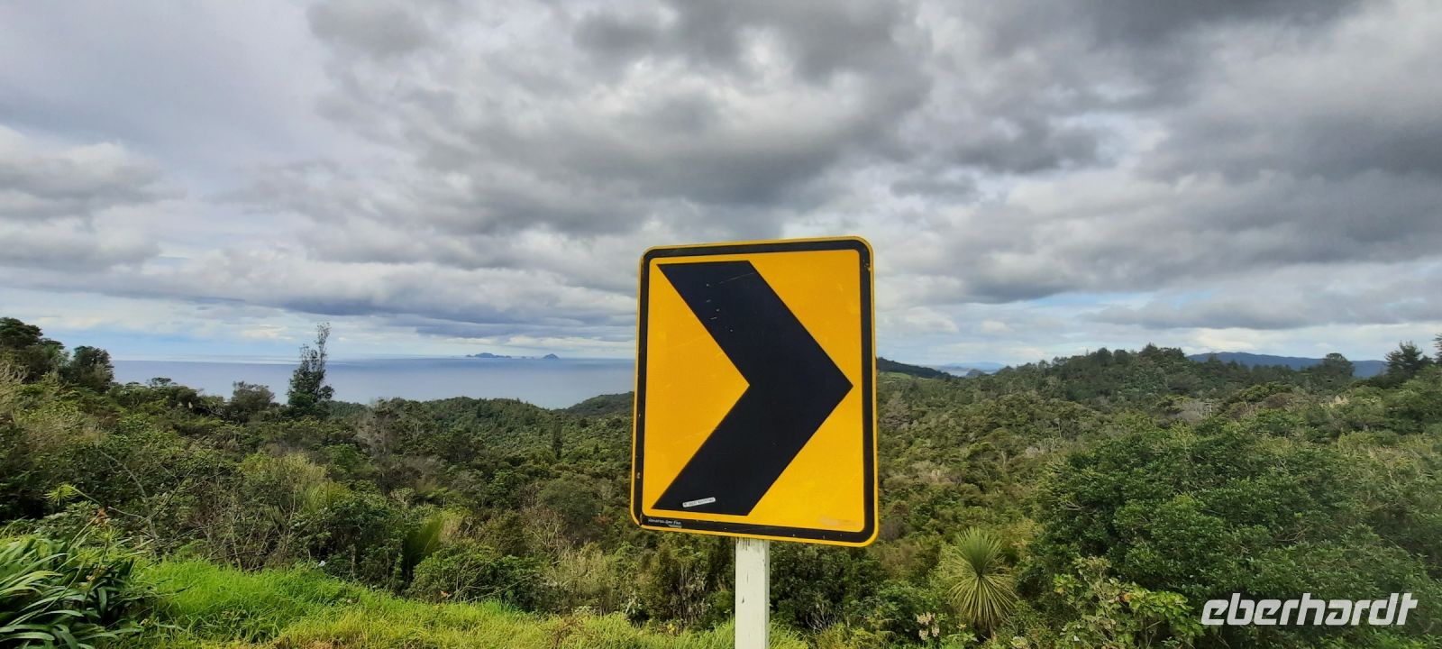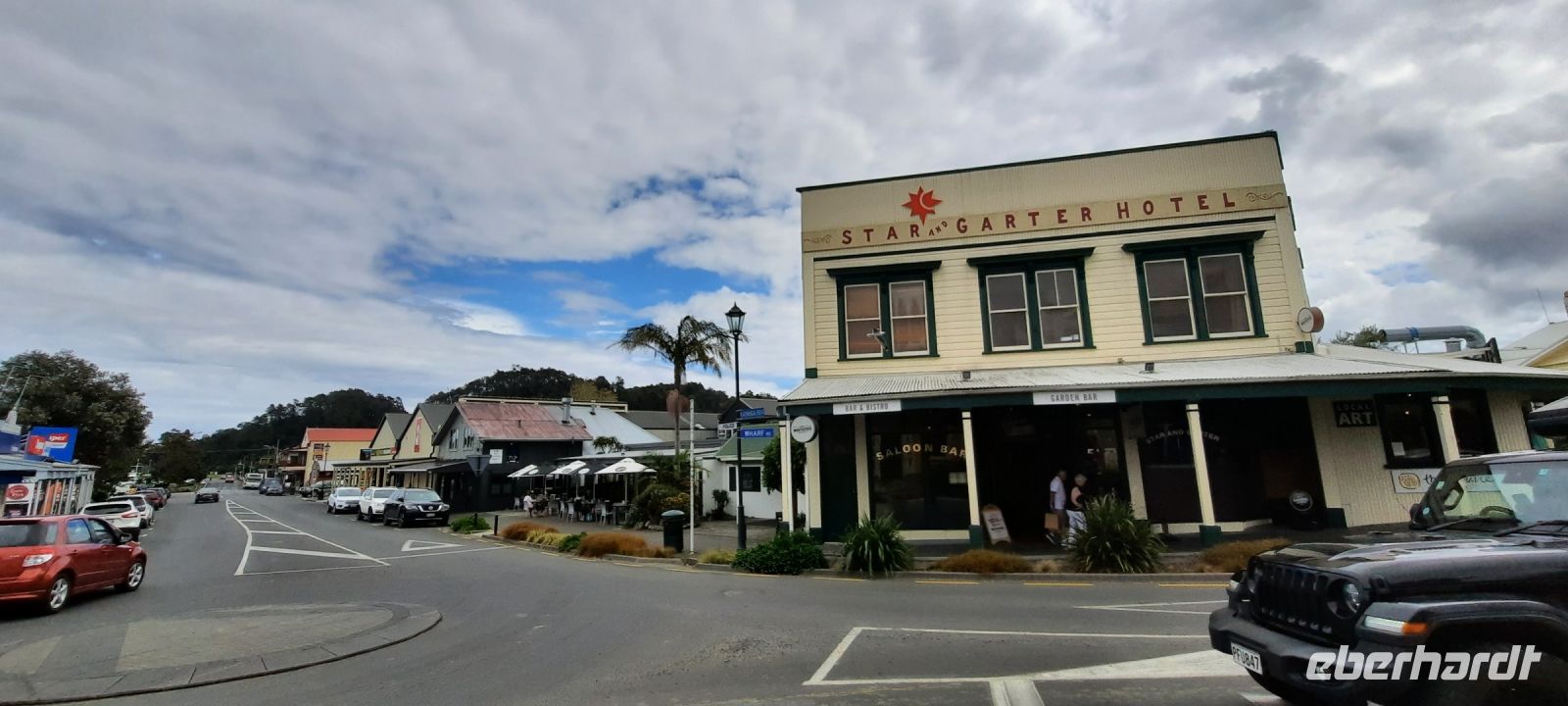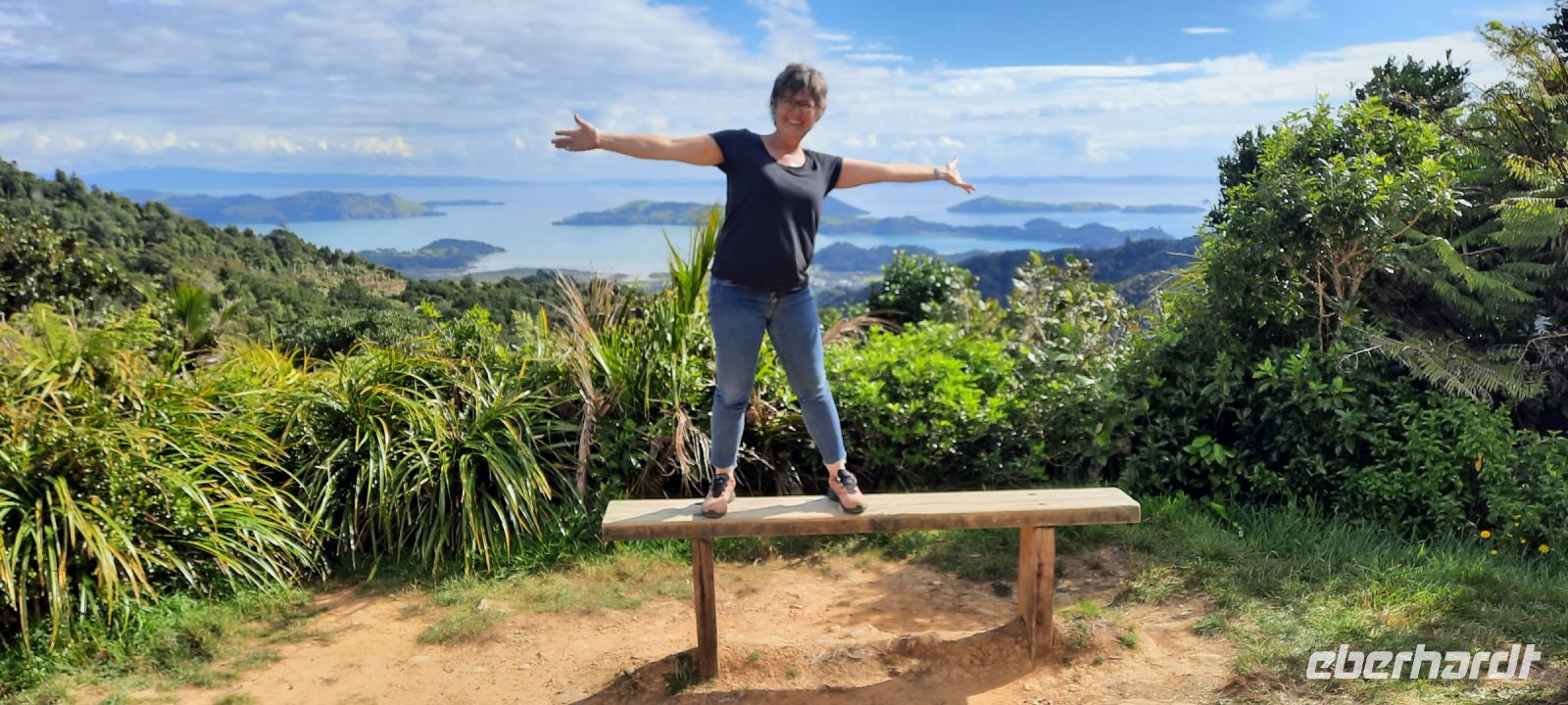 Heute verließen wir die touristischen Wege und gingen off the beaten track. Zuvor noch Gepäck laden (liebevoll Koffer-Tetris genannt) und sich kuschlig im Reisefahrzeug, unserem Whaka machen. Unser Mercedes Sprinter war zwar nicht groß, aber wendig, schnittig und bestens geeignet für unsere Familien-Tour. Unser heutiges Ziel: der Weg! Auf dem State Highway 2 fuhren wir nach Thames, der größten Stadt auf der Coromandel Halbinsel, westlich gelegen. Hier pausierten wir und Bernd mit Annett stürmten den hiesigen Supermarkt. Es gab alles, aber die Preise lagen wesentlich höher als in Deutschland, wo wir über Inflation „jammern“. Ursprünglich war geplant, direkt und auf kürzesten Weg nach Tairua an die Ostküste zu fahren. Diese Strecke war ebefalls durch den Tropensturm noch beeinträchtigt. Also off the beaten track auf der westlichen Küstenstraße zum kleinen Goldgräberstädtchen Coromandel = eine wunderschöne Strecke mit vielen Fotostopps. Den Arbeitsalltag der Bauarbeiter an den mobilen Baustellen versüßten wir mit Schokolade. Im anheimelnden Coromandel gönnten wir uns eine Pause, bevor wir in nördliche Richtung weiter fuhren. Upps, wir waren ja fast schon am nördlichsten Ende der Halbinsel und die Road wurde immer schmaler. Bei aller Faszination für die Landschaft hatten wir doch glatt den Abzweig zur Ostküste verpasst. Also nach Coromandel zurück und scharf nach links. Wir trackten auf die Coromandel Range hinauf, genossen umwerfende Ausblicke und dann über Serpentinen nach Tairua hinab, wo wir am frühen Abend ankamen. Unsere Eberhardt-Gäste bezogen ihre gut ausgestatteten Ferienwohnungen im Motel. Da das Motel ausgebucht war, richteten sich Bernd und Annett im kleinen Ferienhaus gleich um die Ecke häuslich ein = Hausbesitzer und WG für die nächsten beiden Tage. Während Bernd unseren Sprinter zur Nahrungsquelle brachte, spazierten wir zum nahe gelegenen Restaurant Pepe, das eigens für uns öffnete. Wir verbrachten dort einen geselligen Abend mit leckerem Essen und freuten uns auf den nächsten Tag.