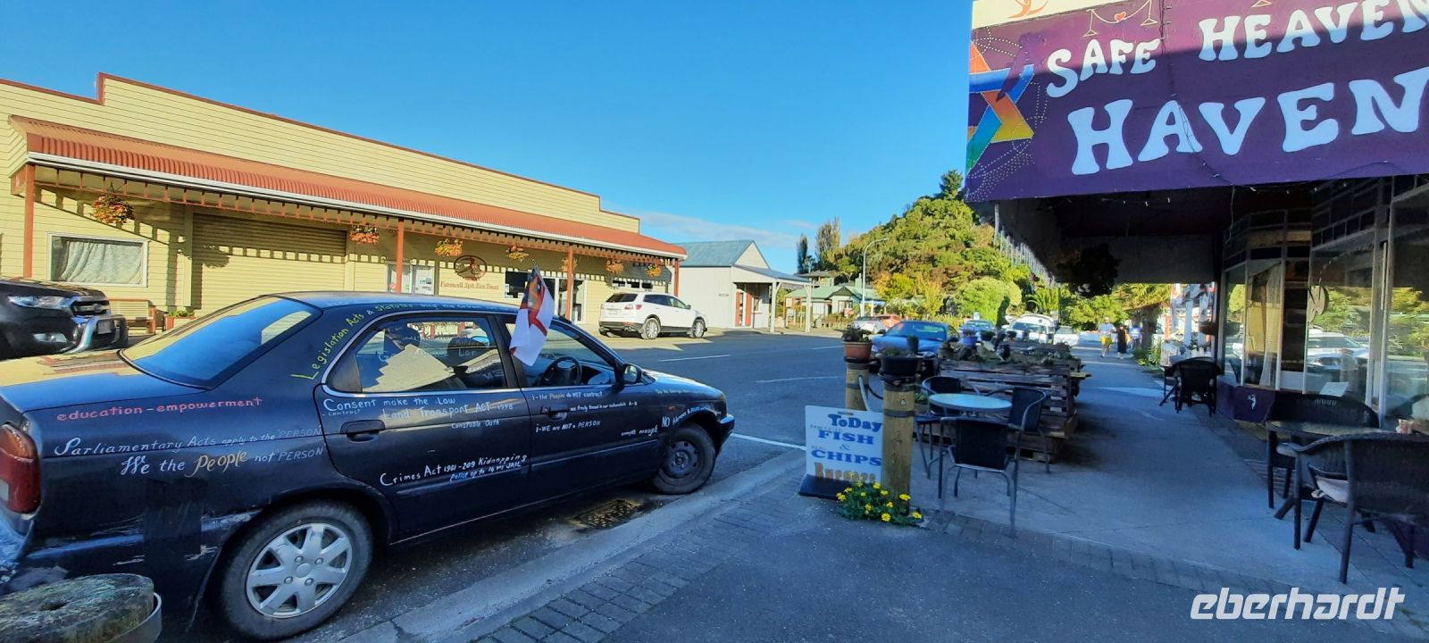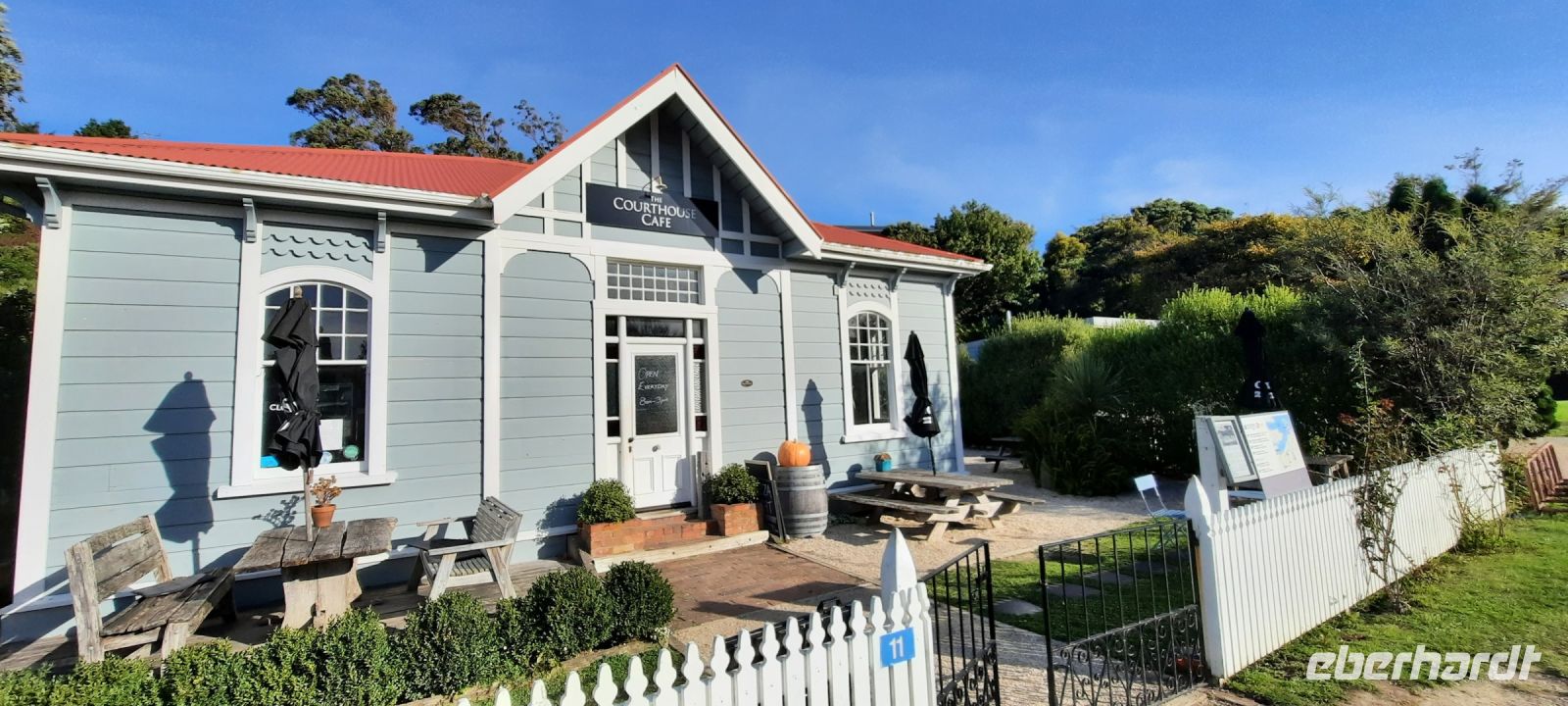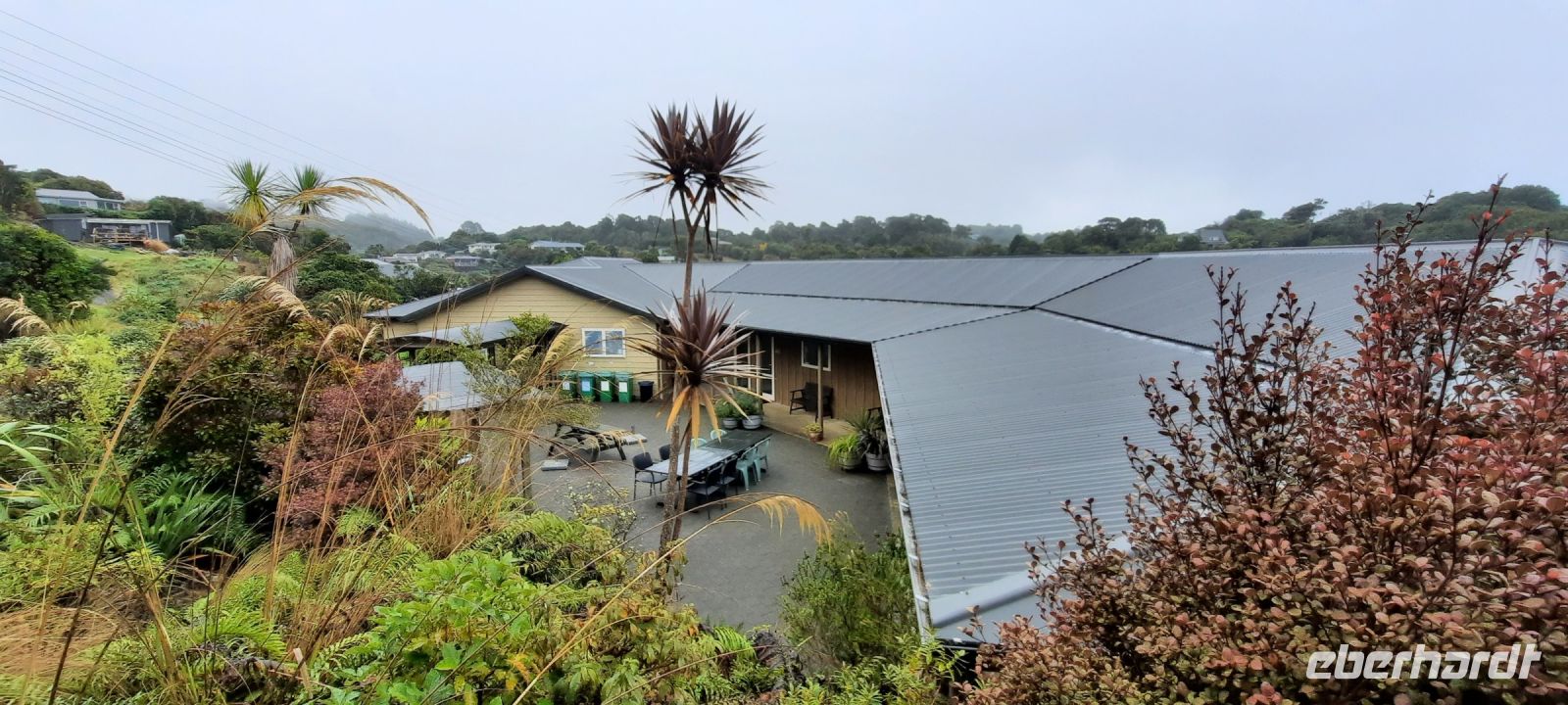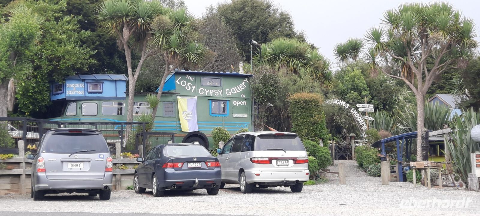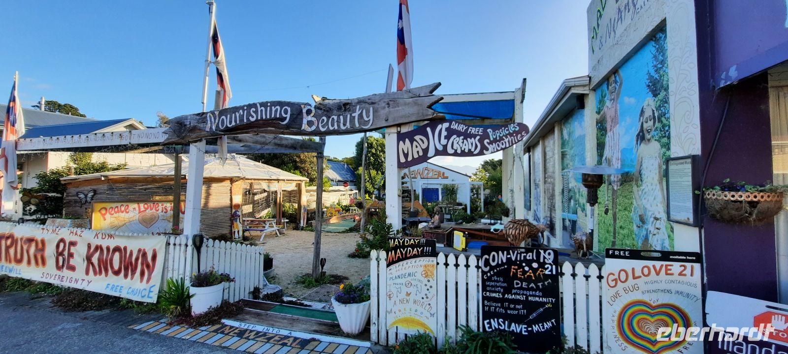 Heute verließen wir die touristischen Wege und gingen off the beaten track. Zuvor noch Gepäck laden (liebevoll Koffer-Tetris genannt) und sich kuschlig im Reisefahrzeug, unserem Whaka machen. Unser Mercedes Sprinter war zwar nicht groß, aber wendig, schnittig und bestens geeignet für unsere Familien-Tour. Unser heutiges Ziel: der Weg! Auf dem State Highway 2 fuhren wir nach Thames, der größten Stadt auf der Coromandel Halbinsel, westlich gelegen. Hier pausierten wir und Bernd mit Annett stürmten den hiesigen Supermarkt. Es gab alles, aber die Preise lagen wesentlich höher als in Deutschland, wo wir über Inflation „jammern“. Ursprünglich war geplant, direkt und auf kürzesten Weg nach Tairua an die Ostküste zu fahren. Diese Strecke war ebefalls durch den Tropensturm noch beeinträchtigt. Also off the beaten track auf der westlichen Küstenstraße zum kleinen Goldgräberstädtchen Coromandel = eine wunderschöne Strecke mit vielen Fotostopps. Den Arbeitsalltag der Bauarbeiter an den mobilen Baustellen versüßten wir mit Schokolade. Im anheimelnden Coromandel gönnten wir uns eine Pause, bevor wir in nördliche Richtung weiter fuhren. Upps, wir waren ja fast schon am nördlichsten Ende der Halbinsel und die Road wurde immer schmaler. Bei aller Faszination für die Landschaft hatten wir doch glatt den Abzweig zur Ostküste verpasst. Also nach Coromandel zurück und scharf nach links. Wir trackten auf die Coromandel Range hinauf, genossen umwerfende Ausblicke und dann über Serpentinen nach Tairua hinab, wo wir am frühen Abend ankamen. Unsere Eberhardt-Gäste bezogen ihre gut ausgestatteten Ferienwohnungen im Motel. Da das Motel ausgebucht war, richteten sich Bernd und Annett im kleinen Ferienhaus gleich um die Ecke häuslich ein = Hausbesitzer und WG für die nächsten beiden Tage. Während Bernd unseren Sprinter zur Nahrungsquelle brachte, spazierten wir zum nahe gelegenen Restaurant Pepe, das eigens für uns öffnete. Wir verbrachten dort einen geselligen Abend mit leckerem Essen und freuten uns auf den nächsten Tag.