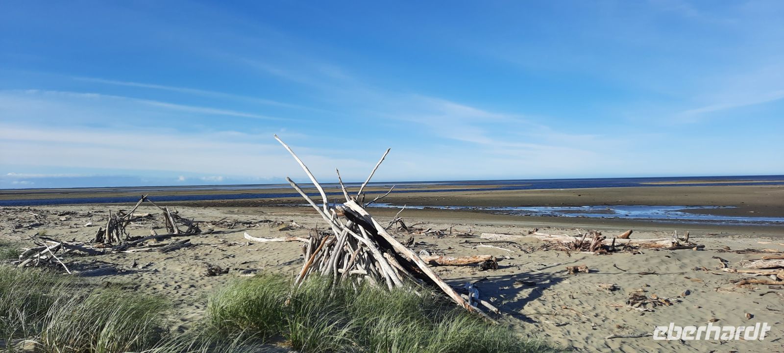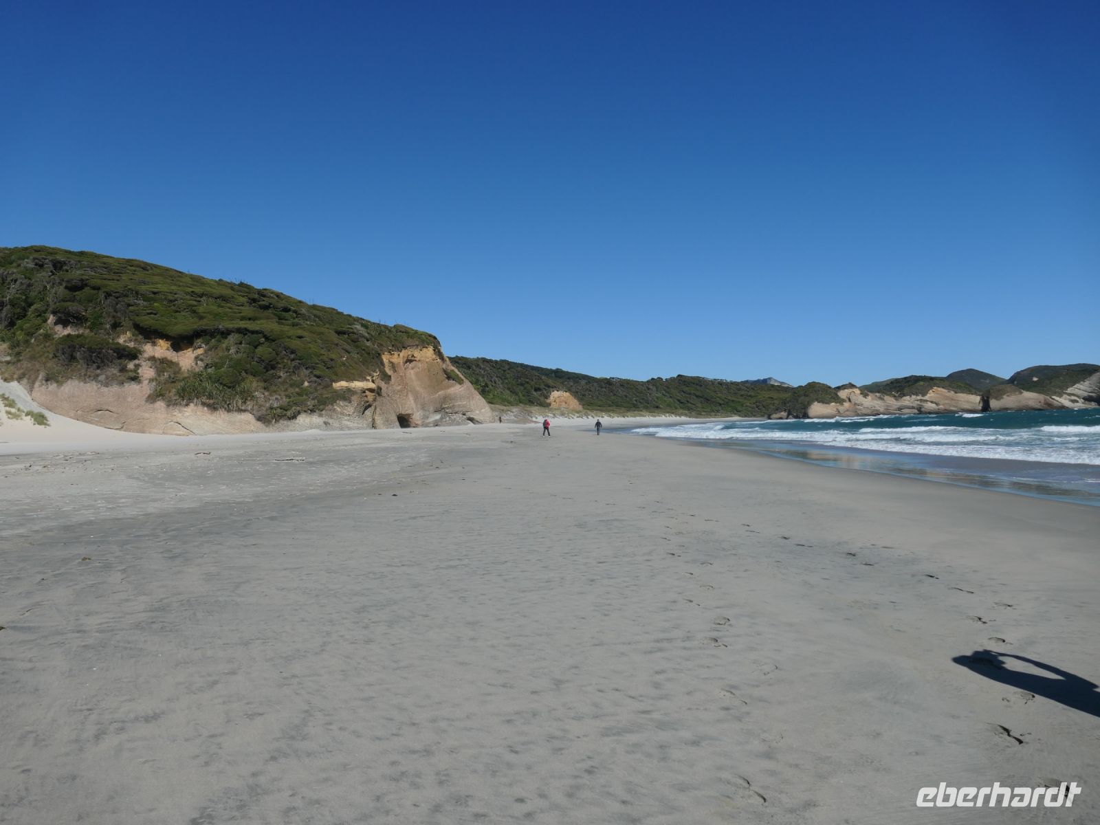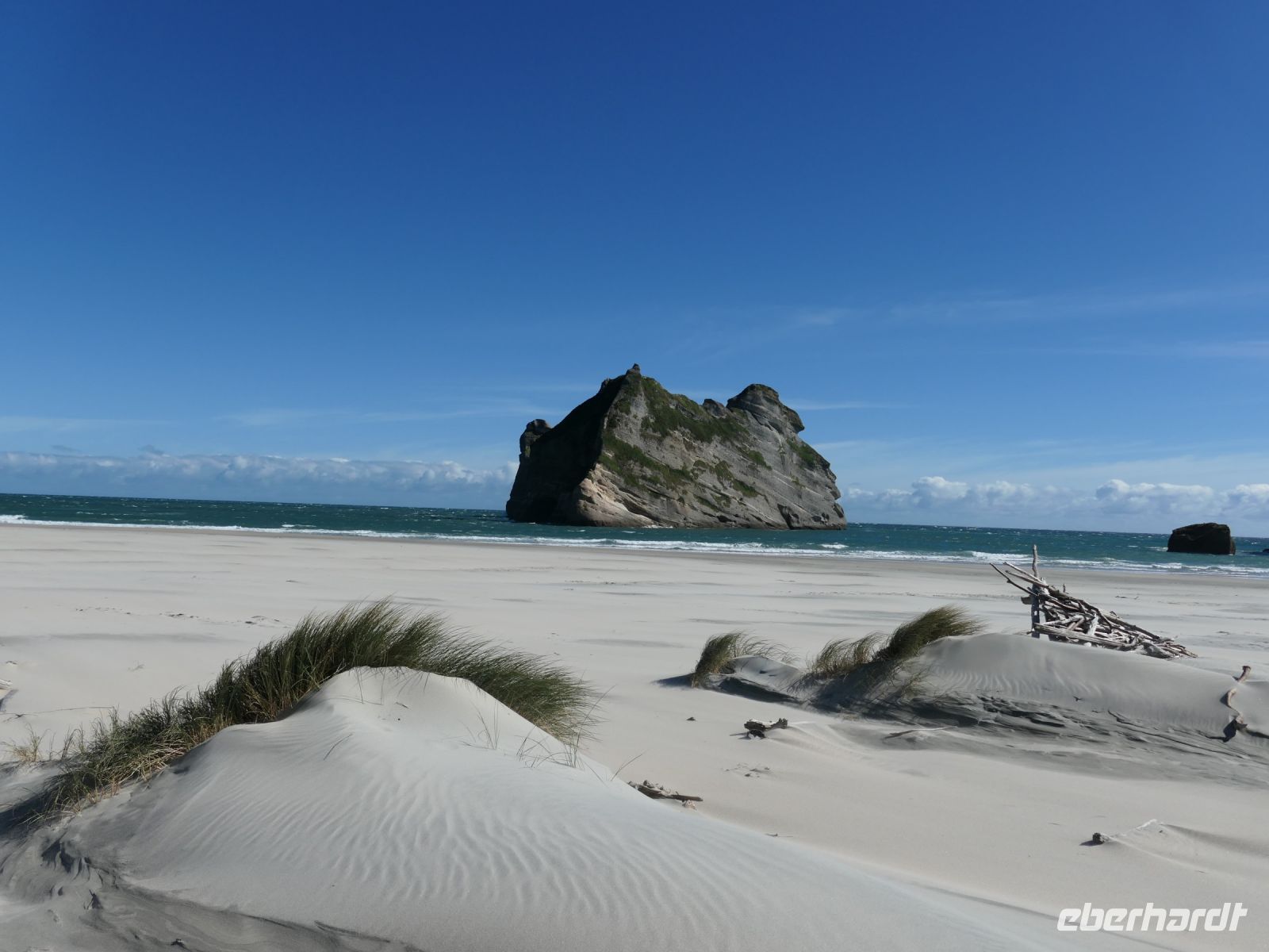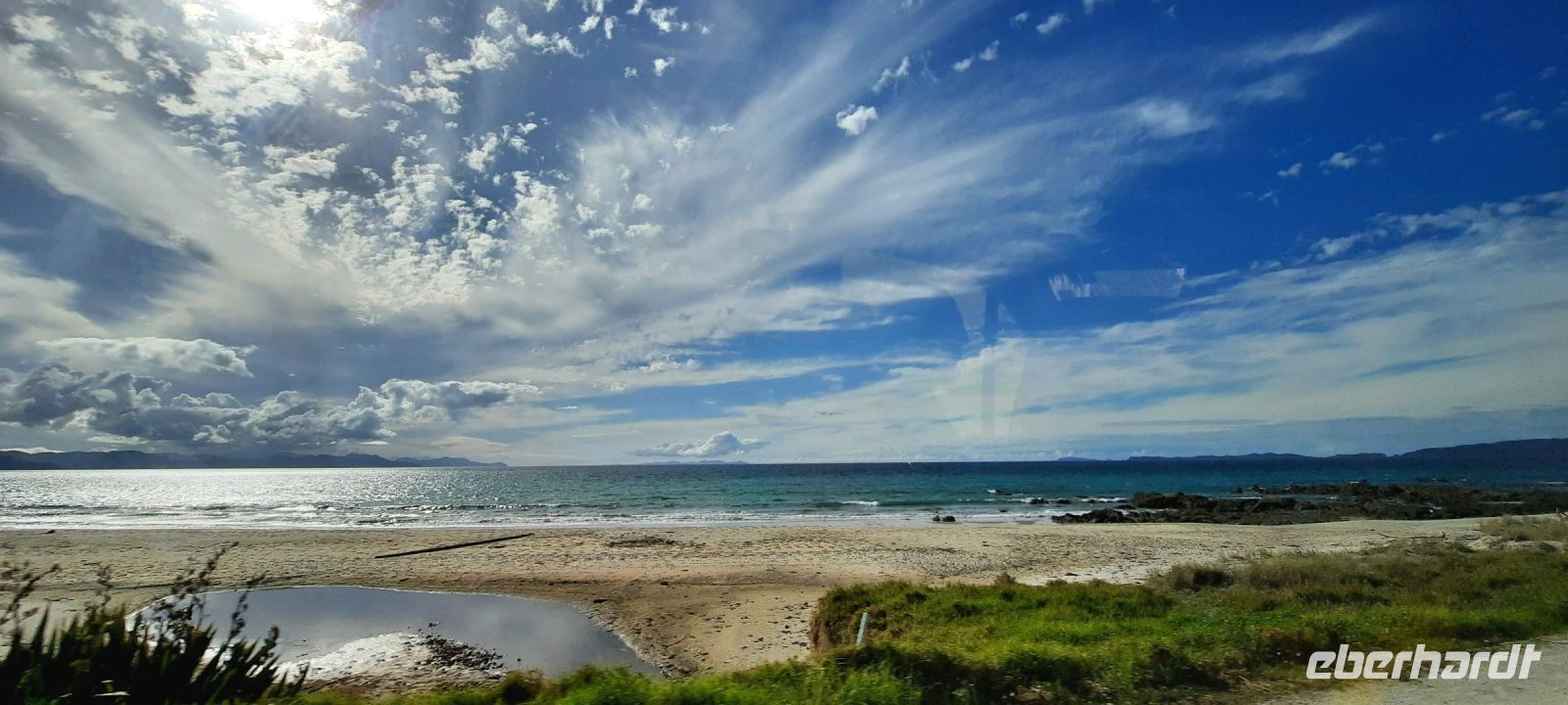 Nach entspannten Tagen im idyllischen Portage starteten wir zu neuen Abenteuern. Entlang des Kenepuru und Pelorus Sound fuhren wir nach Havelock zurück. Am Aussichtspunkt Cullen Point verabschiedeten wir uns von den Marlborough Sounds und setzten unsere Reise gen West fort. Am schönen Tahunanui Beach in Nelson genehmigten wir uns ein Pause, bevor wir durch das grüne Motueka Valley entlang des gleichnamigen Flusses weiterfuhren. Das Tal ist sonnenverwöhnt und der Boden sehr fruchtbar. Kein Wunder also, dass das Farmland für den Anbau von Obst, Hopfen und Wein genutzt wird. Von den vorzüglichen neuseeländischen Weinen, die vorwiegend aus diesem Gebiet kommen, überzeugten wir uns natürlich während unserer Reise mehrfach. Der Scenic Drive schlängelte sich über kurvige Straßen in die Takaka Bergregion hinauf, die uns mit umwerfenden Ausblicken überraschte. Auf der einen Seite der Abel Tasman Nationalpark mit der Küste der Tasman Bay und auf der einen Seite der Kahurangi mit seinen grünen Bergen. Während unserer Mittagspause bummelten wir durch das hübsche Örtchen Takaka, bevor wir die nahegelegenen Waikoropupu Springs ansteuerten. Aus diesen Quellen sprudeln enorm große Wassermengen (über 13.000 l/s) und das Wasser soll das klarste der Welt sein. Für die Maori sind die Quellen ein heiliger Platz und die glasklaren Quellen ein Taonga (Schatz). Bei unserem Spaziergang schauten wir begeistert und gebannt auf das magische Farbenspiel im Wasser – ein prächtiges Kunstwerk der Natur. Am späten Nachmittag erreichten wir unser Ziel an der Golden Bay und checkten in unserem Motel an einer kleinen Bucht ein. Collingwood ist der letzte Ort vor der schmalen Landzunge Farewell Spit im äußersten Norden der Südinsel. Der kleine Ferienort wirkt beschaulich. Alles konzentriert sich um die Main Road: ein kleiner Krämerladen mit dem Nötigsten, zwei schöne Cafés, noch ein kleineres Motel, Ferienhäuser und der lange Strand – aufgrund der Gezeiten mal schmal oder mal breit. Am Abend setzten wir uns noch einmal in unser Whaka und fuhren ins urige The Mussels Inn, etwas außerhalb. Der gemütliche Pub ist der einzige weit und breit. Da immer gut besucht, haben wir vorsorglich Plätze reserviert. Hier geht es locker zu, wie die Kiwis und auch wir es mögen. Die Biere werden selbst gebraut, es gibt Hausmannskost, frisch zubereitet. Nach diesem geselligen Abend fuhren wir zurück und bestaunten das Kreuz des Südens, was sich uns heute zeigte.