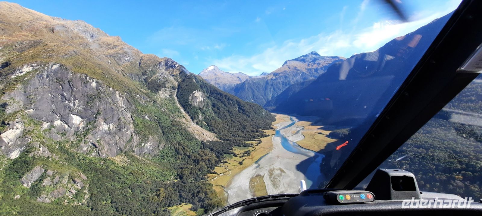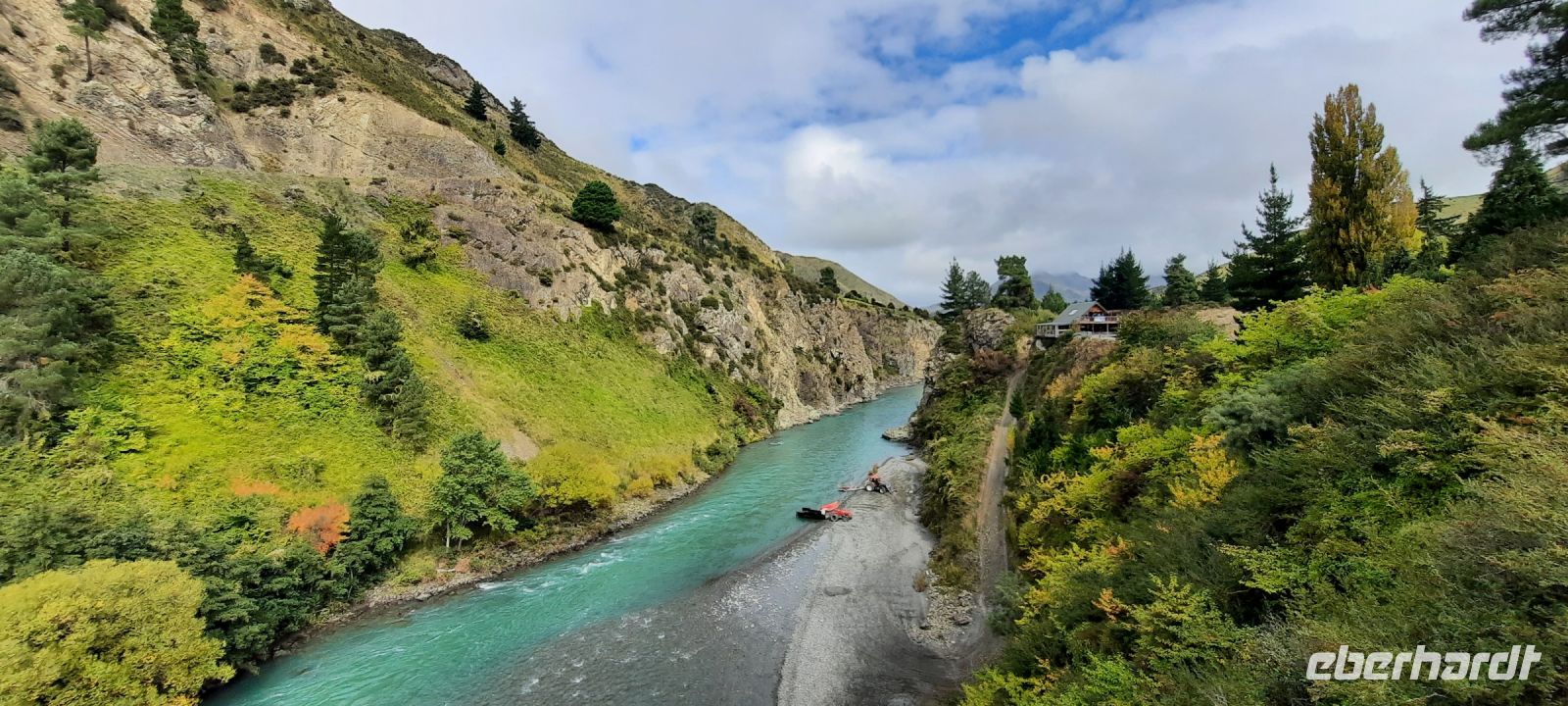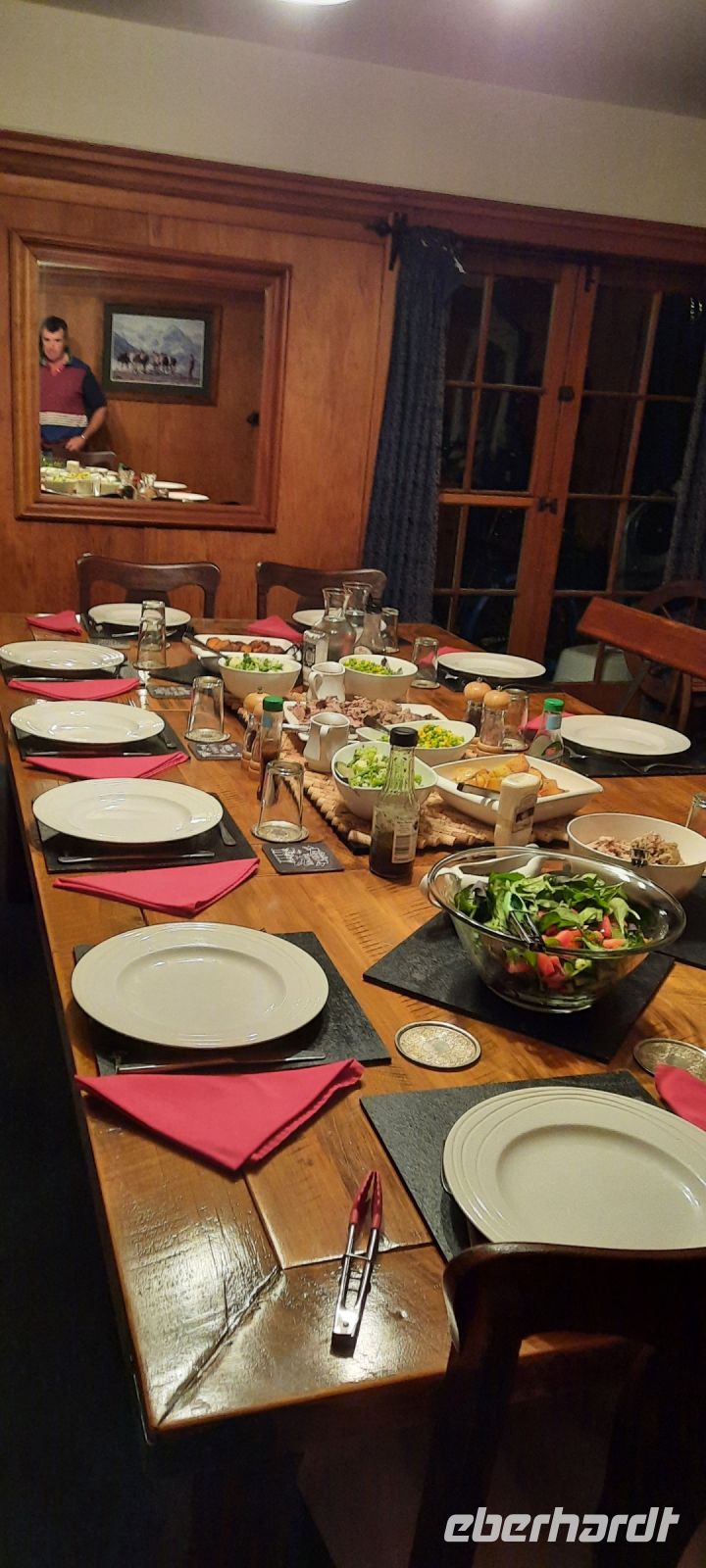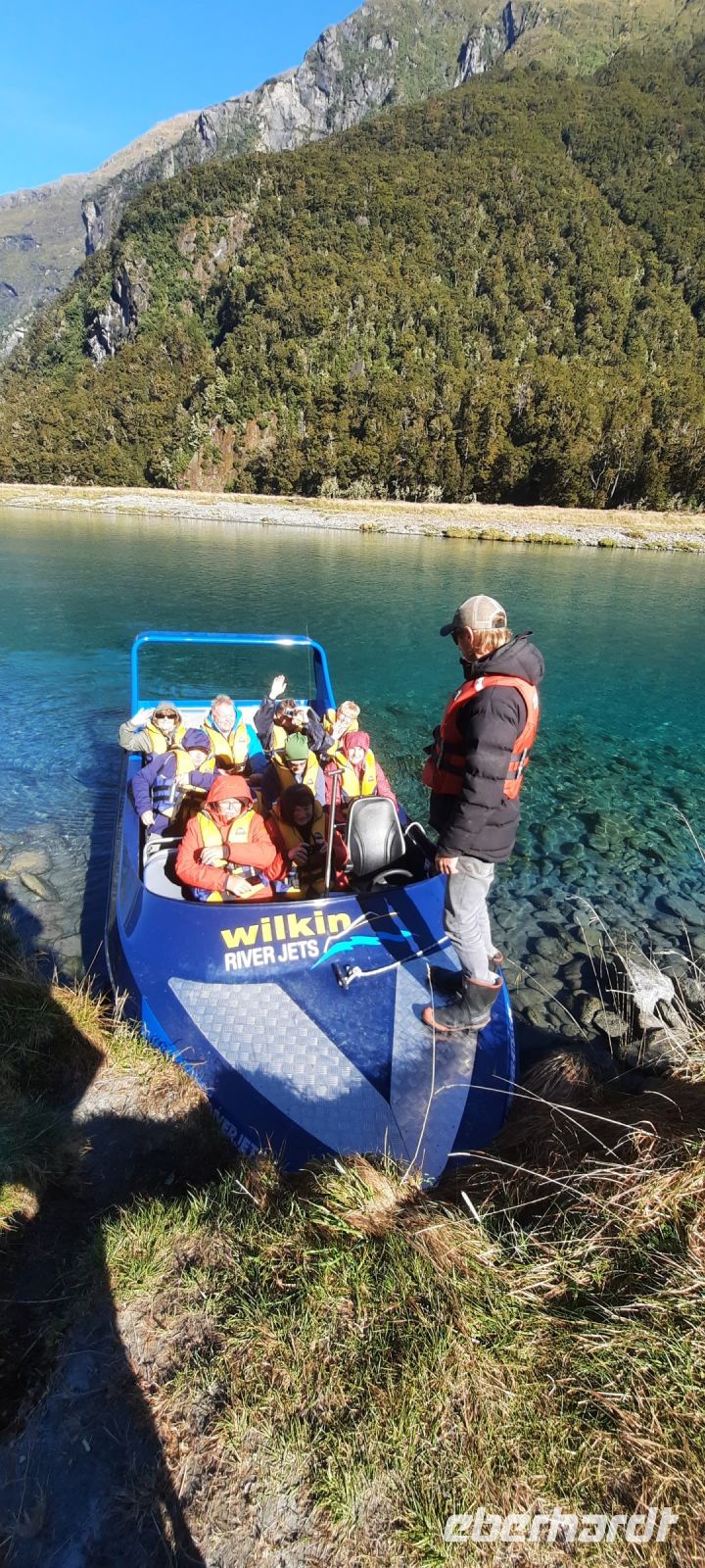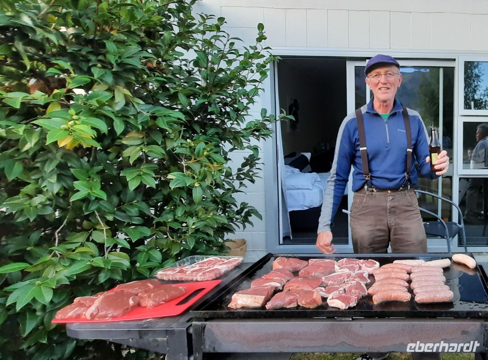 Die überwiegende Mehrheit der Kiwi-Truppe entschied sich heute für einen abenteuerlichen Ganztagesausflug in die Bergwelt des Aspiring Nationalpark. Vorbei am Lake Hawea und später wieder am Lake Wanaka erreichten wir das Makarora Valley und mussten zunächst auf die Waage. Zwei Heliocopter brachten uns ins entlegene Siberia Valley im Aspiring Nationalpark. Schon allein der 25 min Flug entlang des Makarora Flusses und südlichen Alpen, durch Schluchten und Täler war ein einzigartiges Erlebnis. Im Tal des Siberia Flusses landeten wir in einer einmaligen Einsamkeit. Vohrer hat wir eine detaillierte Einweisung für unsere ca. 7 km Wanderung bekommen. Von nun an waren wir auf uns allein gestellt und wanderten zunächst im Flusstal entlang. Was für eine Wahnsinns Location: türkisblaues Wasser, schneedeckte Berge als Panorama. Weiter ging es auf einem moderaten Wandertrail durch den Regenwald, später steil hinauf und dann im Zick-Zack wieder zum Wilkin Fluss hinab. Was hatten wir wieder für ein Glück mit dem Wetter, Sonne pur. Während unserer 3stündigen Wanderung pellten wir uns aus der überflüssigen Kleidung. Im Flusstal picknickten wir im Tshirt und verbrachten die Wartezeit auf unser Jetboot mit lustigen Wettkämpfen im Steinehüpfen = Butterbemme. AAh, unser Jetboot war im Anmarsch! Schnell sturmsicher angezogen, Sonnencreme auf Nase und alles windresistent verstaut – die rasante Jetboot retour konnte beginnen. Wussten Sie schon, dass das Jetboot in Neuseeland erfunden wurde? Das mussten wir probieren (eine Alternative für den Rückweg gab es nicht)! Seichte Gewässer und flache, manövrierfähige Boote, das Abenteuer konnte beginnen. Zahlreiche Loops und Mützen später erreichten den sicheren Hafen von Makarora. WOW, was für ein spannend, abenteuerlicher Ausflug. Angemerkt sei aber, ein moderates Fitnesslevel sowie ein wenig Abenteuerlust sollte vorhanden sein. Auf der entspannten Rückfahrt hatten wir endlich Zeit für einige Fotostopps am Lake Hawea und am Fotomotiv Wanaka Tree. Noch schnell ein paar Besorgungen im Supermarkt, dann widmeten sich Bernd und Annett dem anstehenden Vorbereitungen zum abendlichen Eberhardt BBQ. In geselliger Runde wurde gegrillt, geschlemmt und auch der Kiwi Almdudler fand Platz auf dem Tisch.