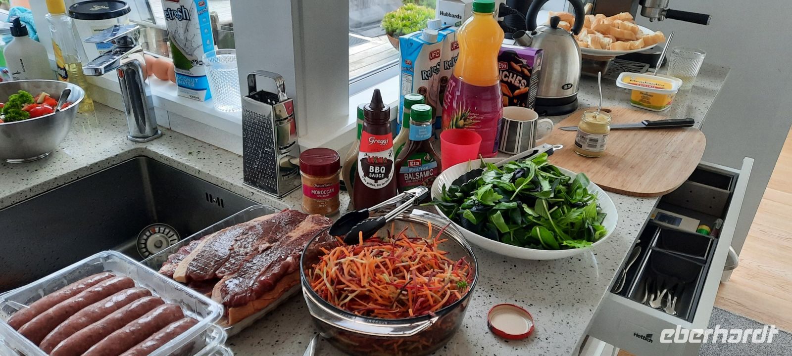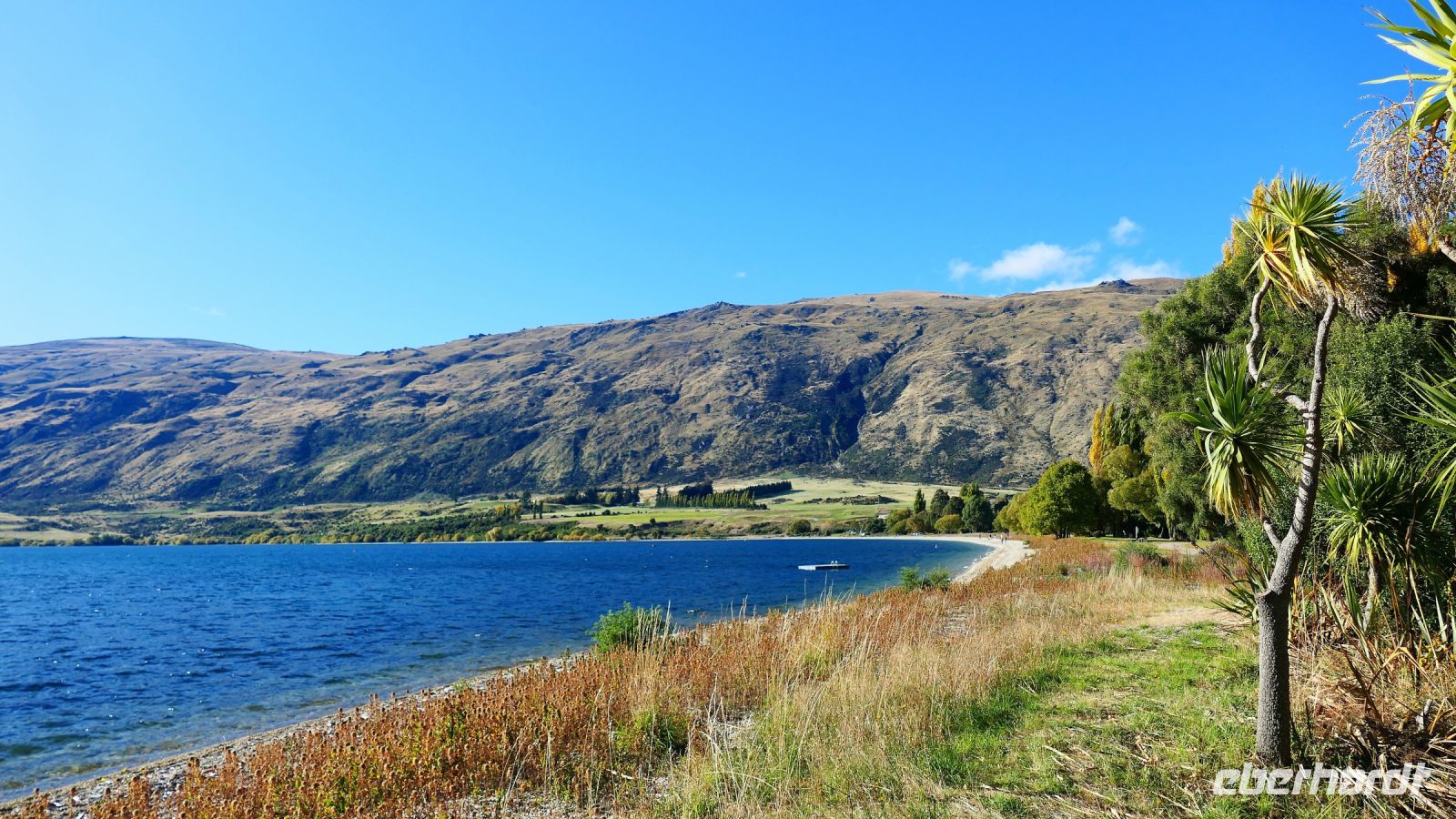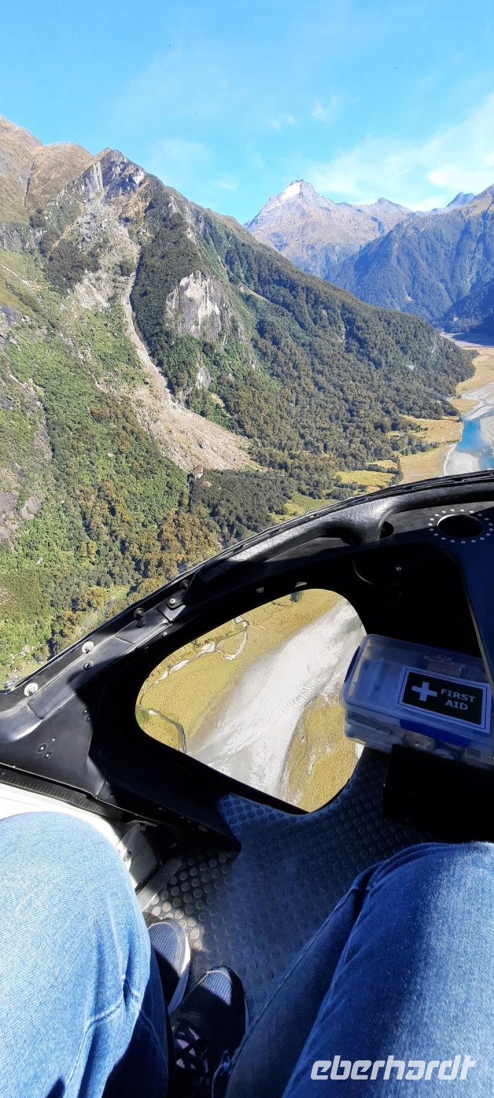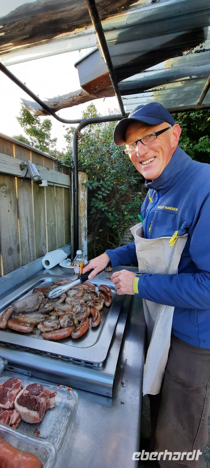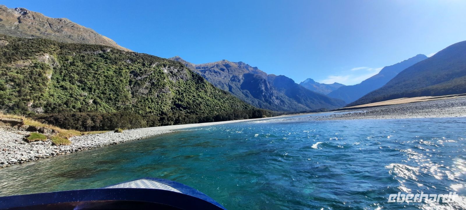 Die überwiegende Mehrheit der Kiwi-Truppe entschied sich heute für einen abenteuerlichen Ganztagesausflug in die Bergwelt des Aspiring Nationalpark. Vorbei am Lake Hawea und später wieder am Lake Wanaka erreichten wir das Makarora Valley und mussten zunächst auf die Waage. Zwei Heliocopter brachten uns ins entlegene Siberia Valley im Aspiring Nationalpark. Schon allein der 25 min Flug entlang des Makarora Flusses und südlichen Alpen, durch Schluchten und Täler war ein einzigartiges Erlebnis. Im Tal des Siberia Flusses landeten wir in einer einmaligen Einsamkeit. Vohrer hat wir eine detaillierte Einweisung für unsere ca. 7 km Wanderung bekommen. Von nun an waren wir auf uns allein gestellt und wanderten zunächst im Flusstal entlang. Was für eine Wahnsinns Location: türkisblaues Wasser, schneedeckte Berge als Panorama. Weiter ging es auf einem moderaten Wandertrail durch den Regenwald, später steil hinauf und dann im Zick-Zack wieder zum Wilkin Fluss hinab. Was hatten wir wieder für ein Glück mit dem Wetter, Sonne pur. Während unserer 3stündigen Wanderung pellten wir uns aus der überflüssigen Kleidung. Im Flusstal picknickten wir im Tshirt und verbrachten die Wartezeit auf unser Jetboot mit lustigen Wettkämpfen im Steinehüpfen = Butterbemme. AAh, unser Jetboot war im Anmarsch! Schnell sturmsicher angezogen, Sonnencreme auf Nase und alles windresistent verstaut – die rasante Jetboot retour konnte beginnen. Wussten Sie schon, dass das Jetboot in Neuseeland erfunden wurde? Das mussten wir probieren (eine Alternative für den Rückweg gab es nicht)! Seichte Gewässer und flache, manövrierfähige Boote, das Abenteuer konnte beginnen. Zahlreiche Loops und Mützen später erreichten den sicheren Hafen von Makarora. WOW, was für ein spannend, abenteuerlicher Ausflug. Angemerkt sei aber, ein moderates Fitnesslevel sowie ein wenig Abenteuerlust sollte vorhanden sein. Auf der entspannten Rückfahrt hatten wir endlich Zeit für einige Fotostopps am Lake Hawea und am Fotomotiv Wanaka Tree. Noch schnell ein paar Besorgungen im Supermarkt, dann widmeten sich Bernd und Annett dem anstehenden Vorbereitungen zum abendlichen Eberhardt BBQ. In geselliger Runde wurde gegrillt, geschlemmt und auch der Kiwi Almdudler fand Platz auf dem Tisch.