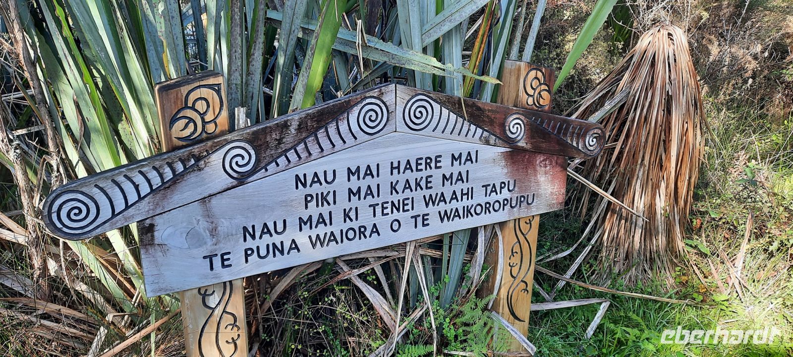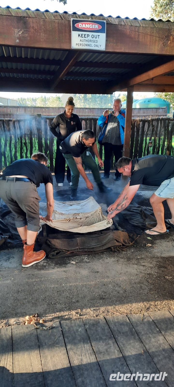 Entlang des Waihu River fuhren wir zunächst ins Städtchen Waihi, wo Ende des 19. Jhd. der Goldrausch begann. Nach fast 50 Jahren Goldfieber sanken die Goldpreise und der Abbau wurde eingestellt. Die große Martha Mine kann man noch heute besichtigen. In Matamata, ein Muss für alle Fans von „Herr der Ringe“ pausierten wir - Hobbiton überall. Der weitere Weg führte uns nach Tauranga, zum weißen Sandstrand der Bay of Plenty, später entlang des Rangitaiki Rivers wieder ins Landesinnere. Am Lake Aniwaniwa (Regenbogen) wurden wir von einer einheimischen Maori Familie bereits erwartet. Wir spazierten zum gleichnamigen Wasserfall, der für den hiesigen Stamm der Maori eine wichtige Bedeutung hat. Später gelangten wir zur Kohutapu Lodge, wo die moderne Maori Familie lebt. Herzlich und exklusiv wurden wir von der Chefin des Hauses begrüßt: Nau mai, haere mai! Von der Familie erfuhren Interessantes und ganz persönliche Geschichten. Sie gehören dem Stamm der Ngati Manawa an und ihr Whakapapa (Stammbaum) reicht über 400 Jahre zurück. Heute leben sie sehr modern, sind aber tief verwurzelt mit ihren Traditionen und Ritualen. Das Wort Familie hat eine große Bedeutung im weitesten Sinne, auch ihr soziales Engagement. Nach einem Blumen-Bastelkurs wurde uns die Zubereitung der Mahlzeiten im Hangi Ofen erklärt. Von Generation zu Generation werden die Rezepte weitergeben. Das Gemüse und Fleisch wird unter heißen Steinen und Sand im Erdofen eingegraben. Nach 3 h duftete es, das Essen war fertig gegart und wurde mit Manneskraft wieder ausgegraben. Bei traditionellem Gesang und Gitarrenklängen tanzten wir ums liebevoll angerichtete Maori Buffet und schlugen uns die Bäuche voll. Es war sehr lecker. Zum Abschluss erhielten wir noch einen Haka Haka Anfängerkurs. Nach diesem familiären Besuch verabschiedeten wir uns und fuhren die letzten 70 km bis Rotorua, wo wir am späten Abend in unser Hotel eincheckten.