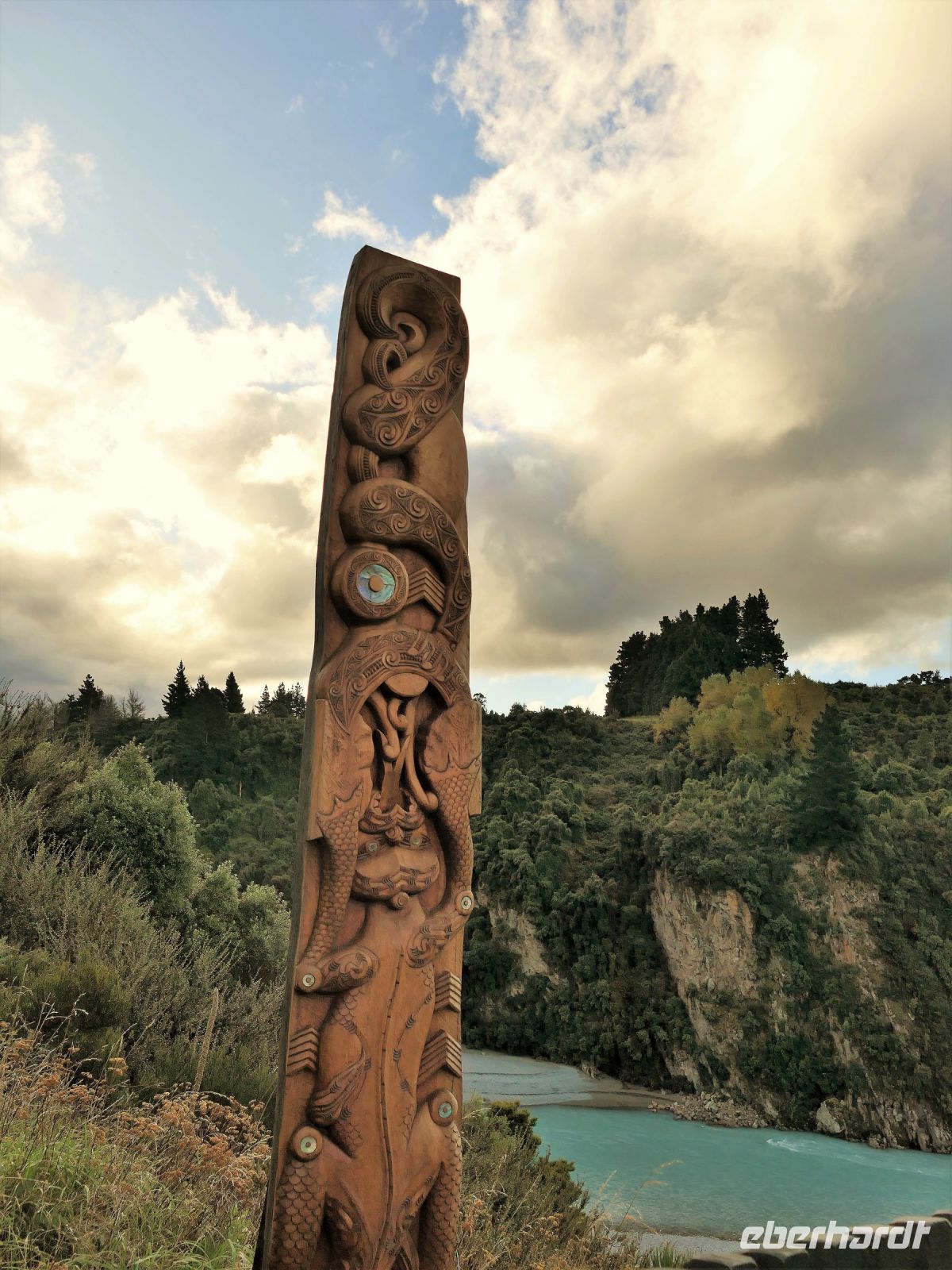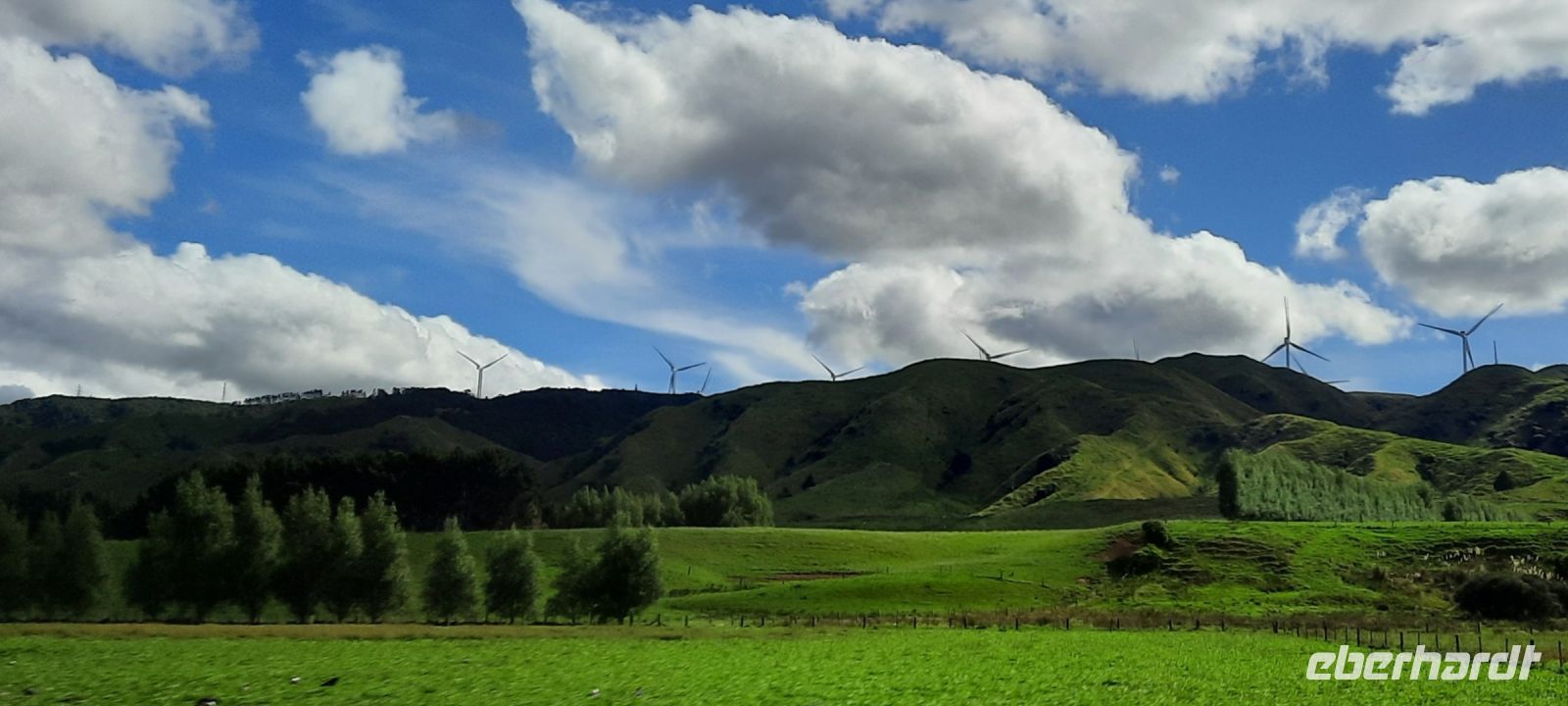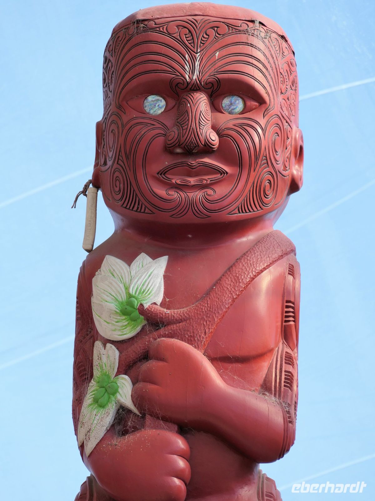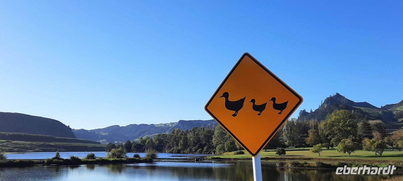 Der neue Tag begann mit Sonnenschein und einen freien Blick auf den Mount Taranaki. Der über 2.500 m hohe Vulkan ist auch als Mount Egmont bekannt. So wolkenfrei und im Sonnenschein präsentiert er sich meist nie, aber wenn Engel reisen! Spontan entschieden wir uns, den kleinen Umweg zum Eingang des Nationalparks (ein Wanderparadies) zu nehmen. Von den Aussichtsplattformen genossen wir einen umwerfenden Blick auf den gewaltigen Berg, der uns noch einige Zeit auf unserer Weiterfahrt verfolgte. In der wunderschönen Parkanlage am See Virginia in Whanganui verbrachten wir eine entspannte Pause. Über die grünen Wiesen stolzierten die lustigen Pukekos (Sumpfhuhn). Die Farben Grün (Landschaft), Blau (Himmel) und Weiß (Wolken) dominierten auf unserer Weiterfahrt, eine faszinierende Landschaft zog vorüber. Am Nachmittag besuchten wir das Pukaha National Wildlife Centre, einem ca. 950 ha geschützten Waldgebiet mit Aufzuchtstation einiger der am stärksten bedrohten Vögel in Neuseeland. Hier begaben wir uns auf einen Spaziergang mit einer Maori, die uns zunächst einen Einblick in die Maori-Holzschnitzkunst gab. Tanemahuta (Gott des Waldes) und Tangaroa (Meeresgott) wachen über diese Region, beide sind Söhne von Rangi (Vater des Himmels) und Papa (Mutter Erde). In der Maori Mythologie tragen auch Vulkane Namen von den Göttern. Spannende Legenden ranken sich um Liebe, Macht und Intrigen. So auch um Taranaki, dessen Liebe zu Pihanga unerfüllt blieb. Im Streit mit Tongario zog er in die Nähe vom heutigen New Plymouth fort. Diese Geschichten gefallen uns doch wesentlich besser als die wissenschaftlich nüchterne, geologische Fassung zur Entstehung dieser Vulkanlandschaften. Später fühlte sich Mr. Kaka (Waldpapagei) durch unsere Audienz etwas gestört, seine Geschäftszeit war schon vorbei. Dafür waren die riesigen Süßwasseraale (NZ Langflossenaal), die bis 100 Jahre alt werden können, umso geselliger. Auch sahen wir einen Tui. Nicht der Ferienflieger ist gemeint, sondern der neuseeländische blau-grüne Vogel mit seinen 2 weißen Bommeln am Hals. Auch der blaugraue Kokako mit dem markanten blauen Lappen unterm Schnabel und der Tieke ließen sich kurz blicken bzw. hören Tie_ke_ke_ke…. Doch nun Vorsicht Kiwi! 2 Exemplare sahen wir im Kiwi Haus, in der Hoffnung später auf Stewart Island Kiwis in freier Natur zu sehen. Ein Tuatara wurde uns ebenfalls vorgestellt, eine endemische Brückenechse, die als lebendes Fossil gilt. Tuatara heißt auch ein Bier einer Brauerei bei Wellington. Das Glas der Bierflaschen fasst sich an wie die Schuppen der Echse. Der Geschmack ist interessant, für mich eher fossil. Am frühen Abend erreichten wir unser typisches Motel in Masterton.