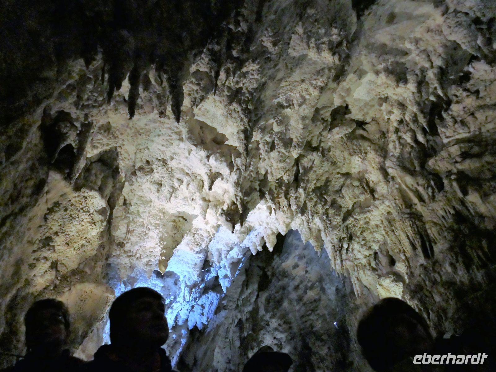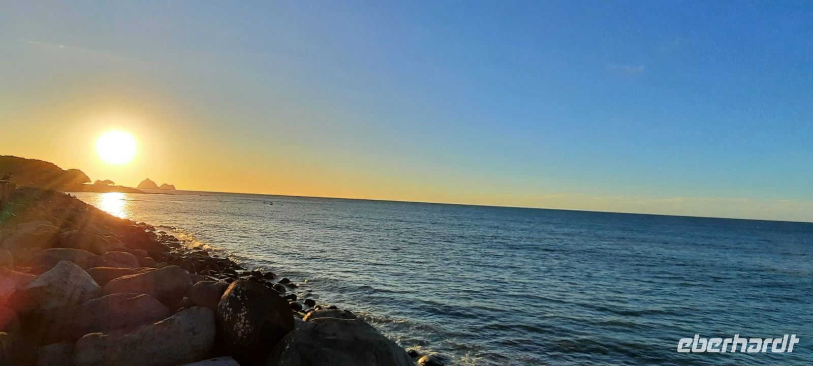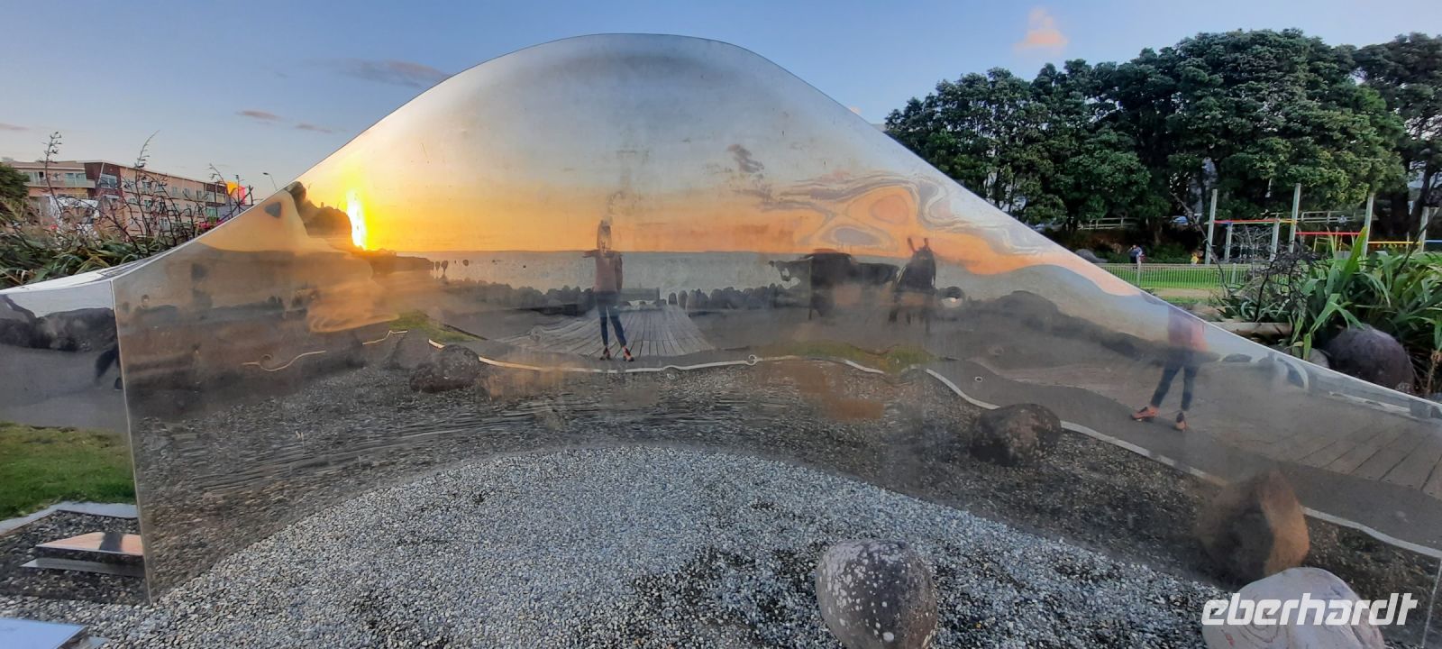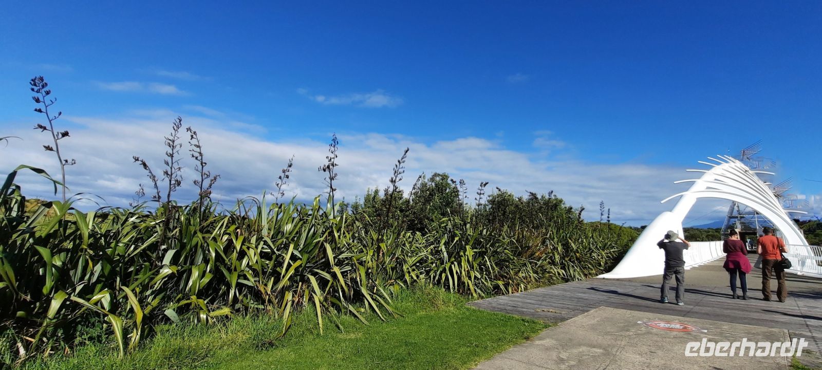 Am Morgen bestiegen wir unser nagelneues Whaka, das wir in der Nacht getauscht haben. Von Rotorua zuckelten wir gen Westen. Unterwegs freuten sich die Straßenbauarbeiter über unsere süßen Bestechungsversuche. Am späten Vormittag standen wir vor dem etwas grimmig aussehenden Wächter der Waitomo Caves. Der Name setzt sich aus den Maori Worten Wai = Wasser und Tomo = Loch zusammen, die Anfang des 20. Jhd. die Höhlen entdeckten. Über Jahrtausende hinweg formte sich das Höhlensystem aus weichem Sandstein, das von den unterirdischen Flüssen ausgewaschen wurde. Bei einer geführten Tour (Fotografieren, auch ohne Blitz sowie Filmen ist generell verboten) bestaunten wir Stalaktiten und Stalagmiten, die durch Millionen von Tropfen entstanden. Ca. 10 Jahre braucht es für 1 mm= ein langwieriger Prozess. Die faszinierende Akustik erlebten wir live, als der Eberhardt Chor ein altes deutsches Volkslied anstimmte – es gab sogar Applaus! Nach der Tour zu Fuß bestiegen wir kleine Kähne und glitten lautlos durch die unterirdischen Wasserkanäle, immer mit dem Blick nach oben. In einer größeren Grotte wurde es plötzlich heller. Millionen kleine Lichter strahlten von der Decke hinab – WOW, wir unterm Sternenzelt - ein Gänsehautmoment. Die Glowworms sind ja keine Glühwürmchen, sondern Mückenlarven (endemisch in NZ), die biolumineszent sind (auf Deutsch: sie können Licht erzeugen). Nach diesem tollen Erlebnis ging es wieder on Road. Unterwegs gab es im Tante Emma Laden eine süße Erfrischung: Hokey Pokey Eis. Am Nachmittag erreichten wir New Plymouth an der Westküste und somit unser heutiges Endziel. Während einer Rundfahrt stoppten wir an der bekannten Rewa Rewa Bridge. Das Dawson Motel befindet sich nur einen Steinwurf von der wunderschönen und gut ausgebauten Küstenpromenade entfernt. Deshalb nutzten viele den weiteren Tag für einen ausgiebigen Spaziergang. Ein perfekter Sonnenuntergang beendete den Tag, auch der Mt. Taranaki zeigte sich uns.