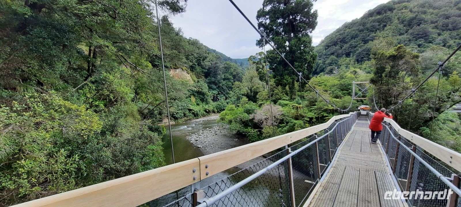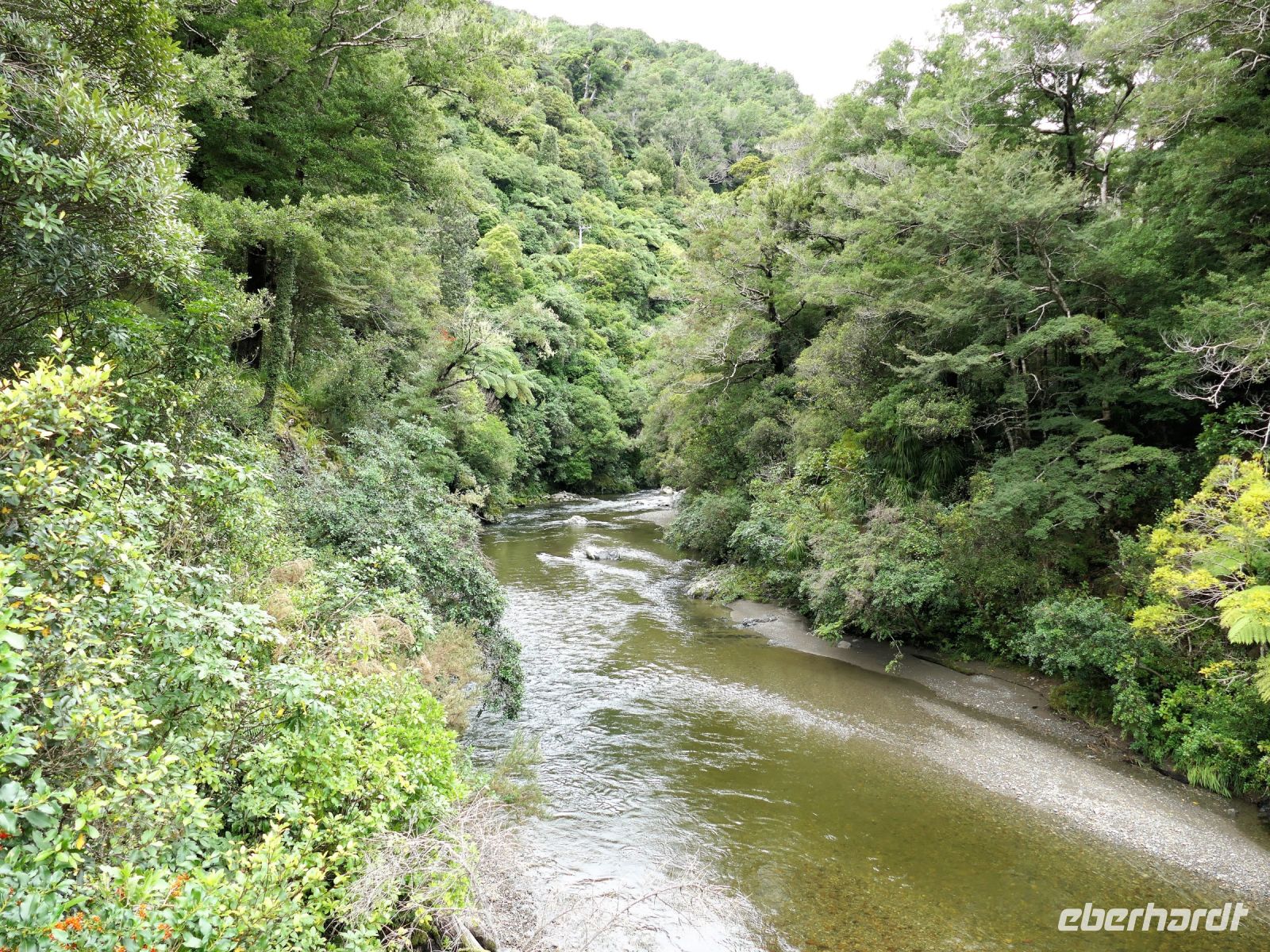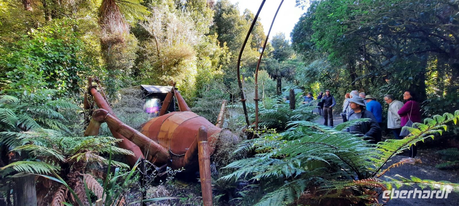 Am Morgen sagten wir der Golden Bay Auf Wiedersehen! Bei Motueka verließen wir die Küstenregion. Auf dem Weg lag Bernds verstecktes, idyllisches Zuhause, welches er uns gern zeigte. Mit frischen Äpfeln und Birnen aus dem eigenen Garten im Gepäck zogen wir weiter. Unterwegs noch ein kurzer Stopp an der kleinen Manuka Honig Factory, wo guter Umsatz gemacht wurde. Entlang des Buller Rivers, einer der längsten in Neuseeland, gelangten wir nach Murchison. Dort trafen wir Elizabeth und Steve, die uns am Nachmittag in ein abgelegenes Tal entführten, um mit uns auf Pfadfindertour zu gehen. Wir erfuhren, dass es hier kleine Ölvorkommen gibt. Alte Ölpumpen beweisen es. Gefördert wird das Öl heute nicht mehr, aber das Wasser des kleinen Flusses fühlt sich ölig und schmierig an. Unsere Wanderung führte zunächst über privates Farmland, auf dem nicht nur Schafe, sondern auch Hirsche gezüchtet werden. Um Murchison erstreckten sich viele beliebte Jagdgebiete. Quer Feld ein wanderten wir über wildwüchsige Lichtungen, kleine Bäche und durch den mit uralten Moosen und urzeitlicher Farne bewachsenen Märchen(Buchen)wald. Mitten im dichten Unterholz lodernde Flammen, nicht das, was wir im Regenwald erwarteten! 1922 waren Jäger in diesem Gebiet unterwegs. Sie wollten ein Feuer für sich entzünden und Schwupps, entzündeten sie die ewige Flamme, die heute noch rauchlos brennt. Wissenschaftlich erklärt, an diesen Stellen tritt permanent natürliches Methangas aus. Wie die Pfadfinder hockten wir um die wärmenden Feuer, während Steve und Bernd auf den natürlichen Flammen Pancakes für uns backten. Elizabeth versüßte diese mit selbstgemachter Marmelade, Honig und Schlagsahne – Ein himmlischer, sündig-süßer Genuss, auch das Dessert zum Schluss: Schoko Cookies auf denen kleine Marshmallows schmolzen. Am frühen Abend waren wir in Murchison zurück und bezogen unsere geräumigen und bestens ausgestatteten Suiten im neuen Motel. Auch der Kühlschrank war schon mit einer super gefüllten Frühstücksplatte gefüllt.