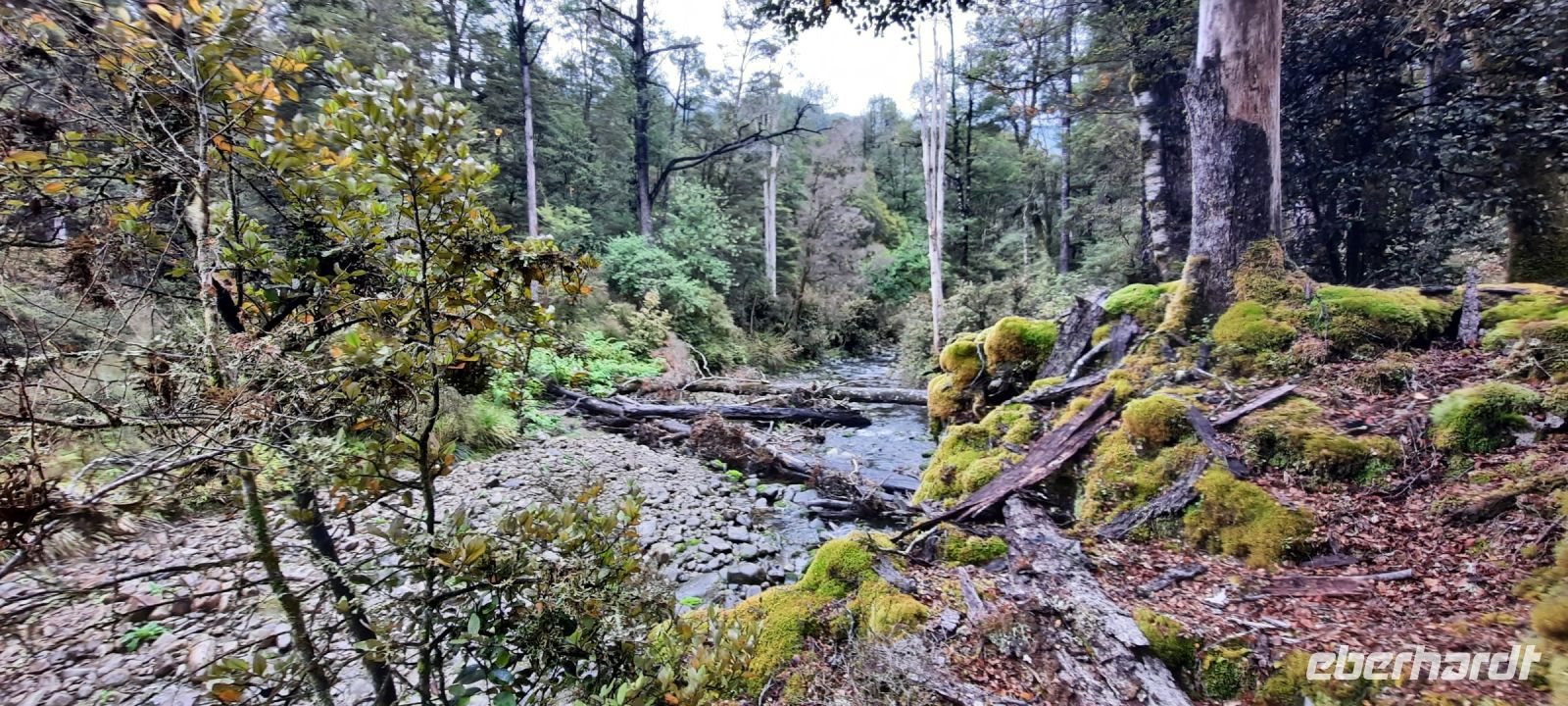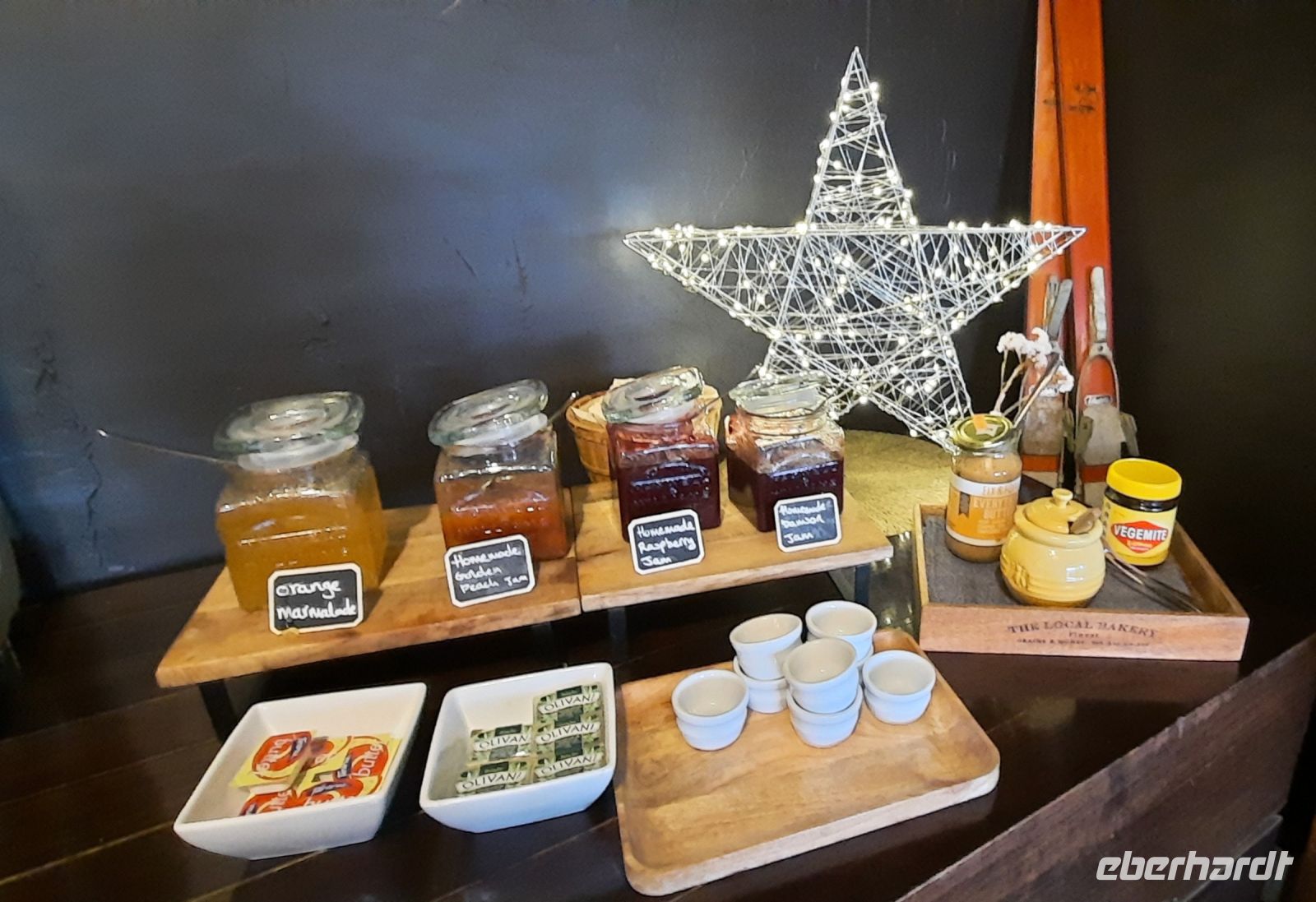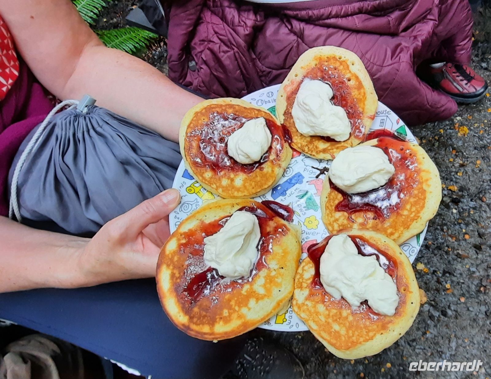 Am Morgen sagten wir der Golden Bay Auf Wiedersehen! Bei Motueka verließen wir die Küstenregion. Auf dem Weg lag Bernds verstecktes, idyllisches Zuhause, welches er uns gern zeigte. Mit frischen Äpfeln und Birnen aus dem eigenen Garten im Gepäck zogen wir weiter. Unterwegs noch ein kurzer Stopp an der kleinen Manuka Honig Factory, wo guter Umsatz gemacht wurde. Entlang des Buller Rivers, einer der längsten in Neuseeland, gelangten wir nach Murchison. Dort trafen wir Elizabeth und Steve, die uns am Nachmittag in ein abgelegenes Tal entführten, um mit uns auf Pfadfindertour zu gehen. Wir erfuhren, dass es hier kleine Ölvorkommen gibt. Alte Ölpumpen beweisen es. Gefördert wird das Öl heute nicht mehr, aber das Wasser des kleinen Flusses fühlt sich ölig und schmierig an. Unsere Wanderung führte zunächst über privates Farmland, auf dem nicht nur Schafe, sondern auch Hirsche gezüchtet werden. Um Murchison erstreckten sich viele beliebte Jagdgebiete. Quer Feld ein wanderten wir über wildwüchsige Lichtungen, kleine Bäche und durch den mit uralten Moosen und urzeitlicher Farne bewachsenen Märchen(Buchen)wald. Mitten im dichten Unterholz lodernde Flammen, nicht das, was wir im Regenwald erwarteten! 1922 waren Jäger in diesem Gebiet unterwegs. Sie wollten ein Feuer für sich entzünden und Schwupps, entzündeten sie die ewige Flamme, die heute noch rauchlos brennt. Wissenschaftlich erklärt, an diesen Stellen tritt permanent natürliches Methangas aus. Wie die Pfadfinder hockten wir um die wärmenden Feuer, während Steve und Bernd auf den natürlichen Flammen Pancakes für uns backten. Elizabeth versüßte diese mit selbstgemachter Marmelade, Honig und Schlagsahne – Ein himmlischer, sündig-süßer Genuss, auch das Dessert zum Schluss: Schoko Cookies auf denen kleine Marshmallows schmolzen. Am frühen Abend waren wir in Murchison zurück und bezogen unsere geräumigen und bestens ausgestatteten Suiten im neuen Motel. Auch der Kühlschrank war schon mit einer super gefüllten Frühstücksplatte gefüllt.
