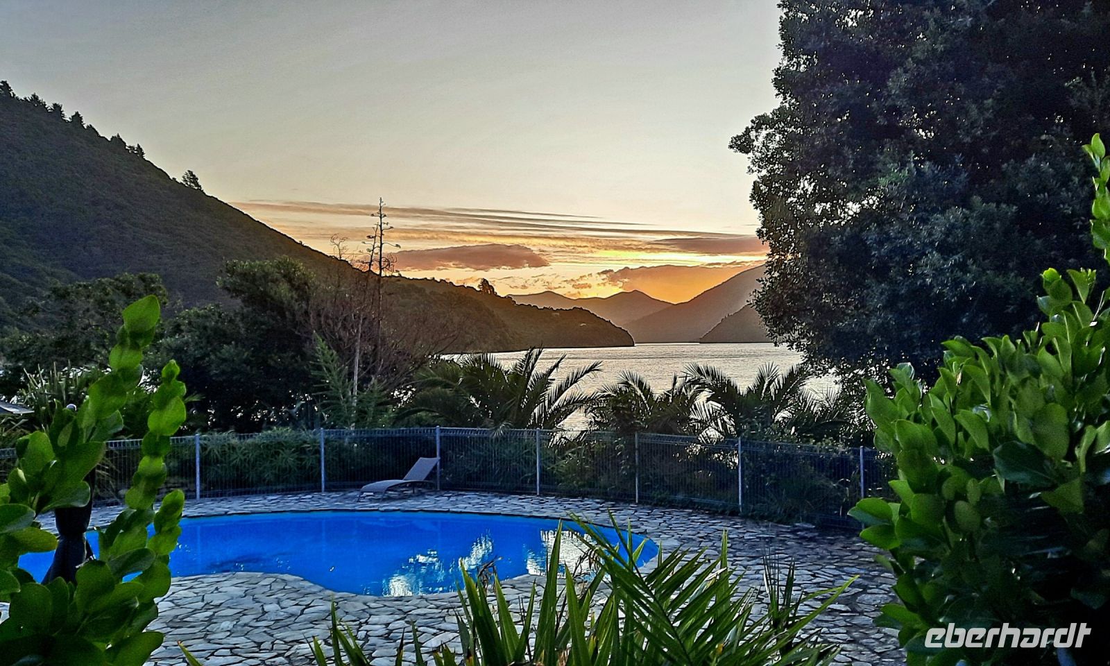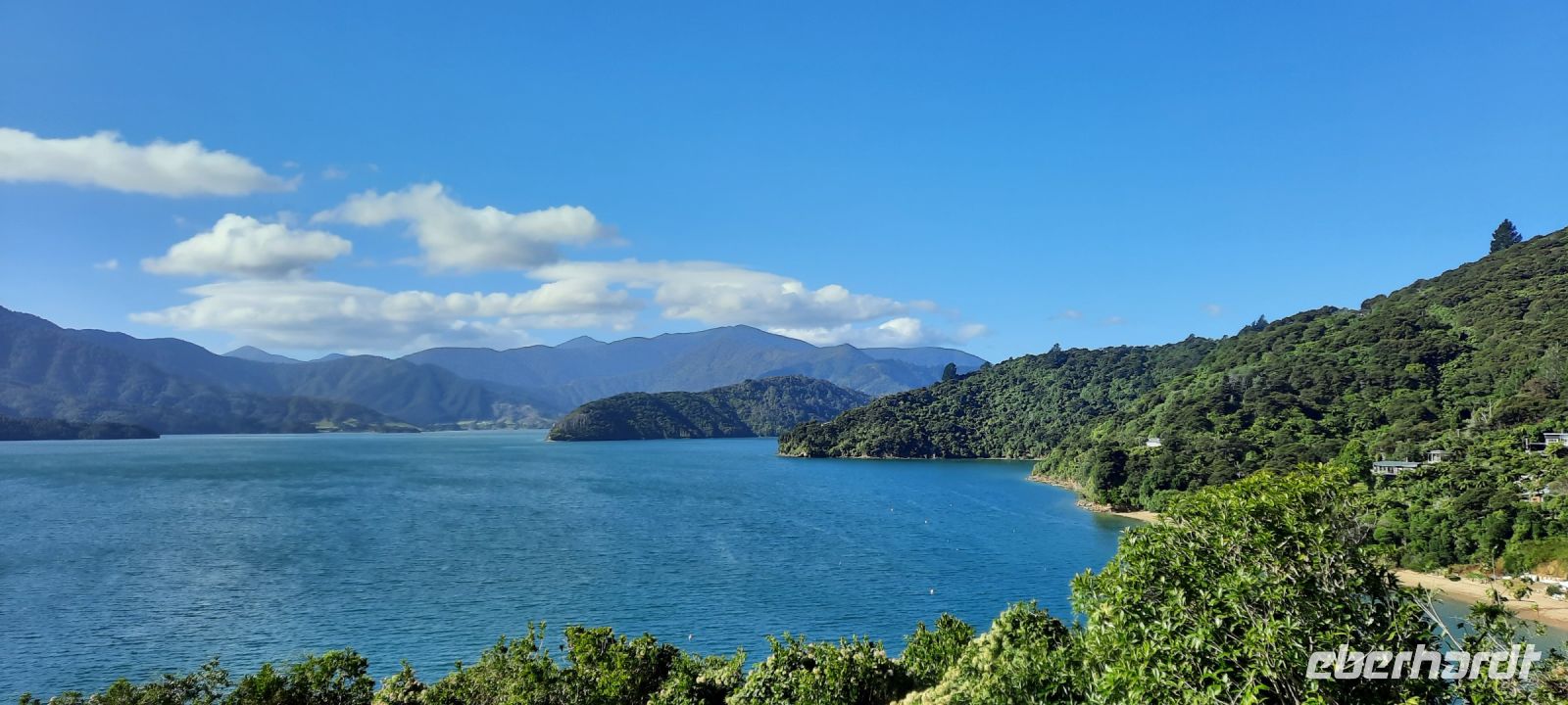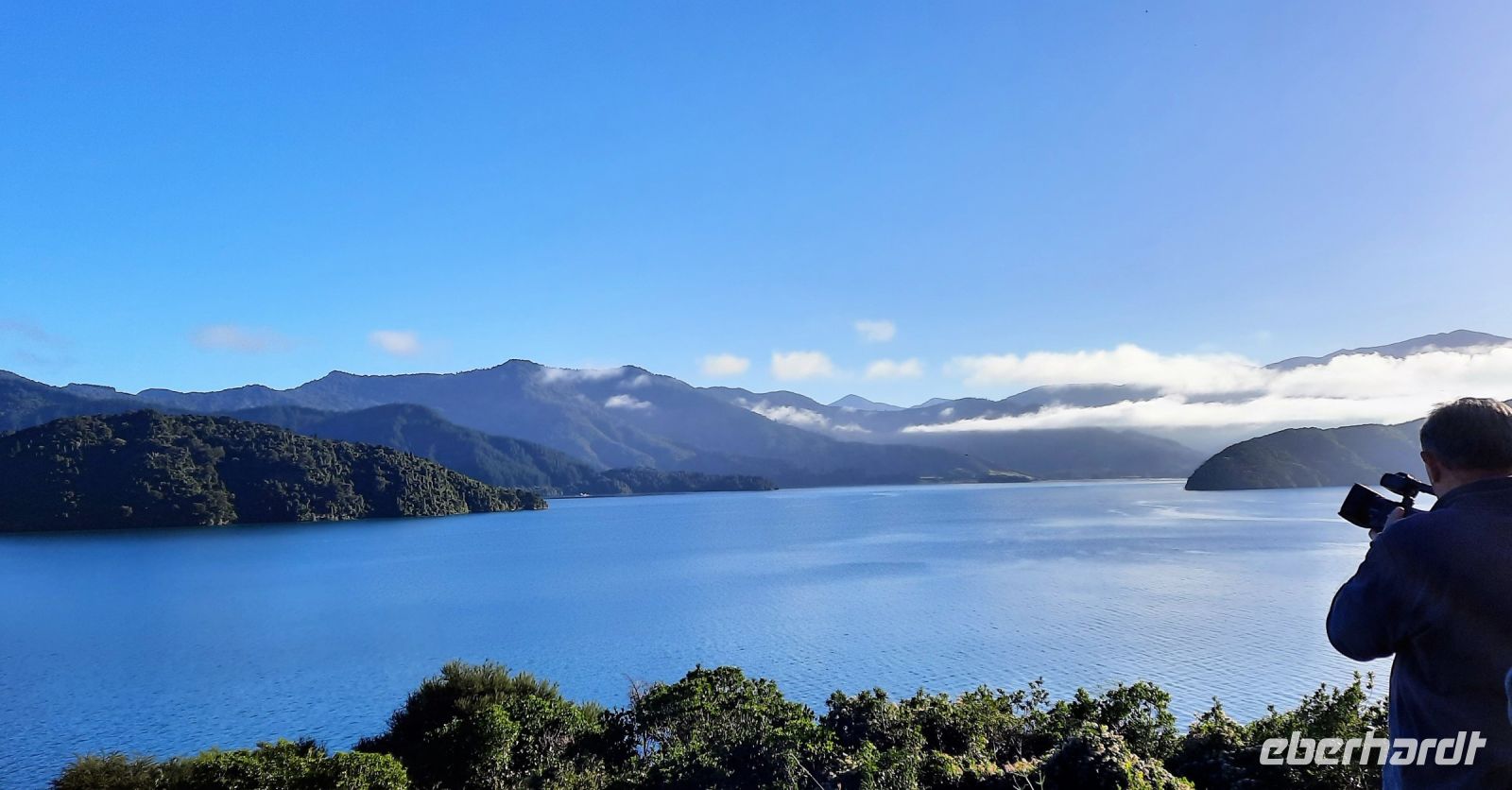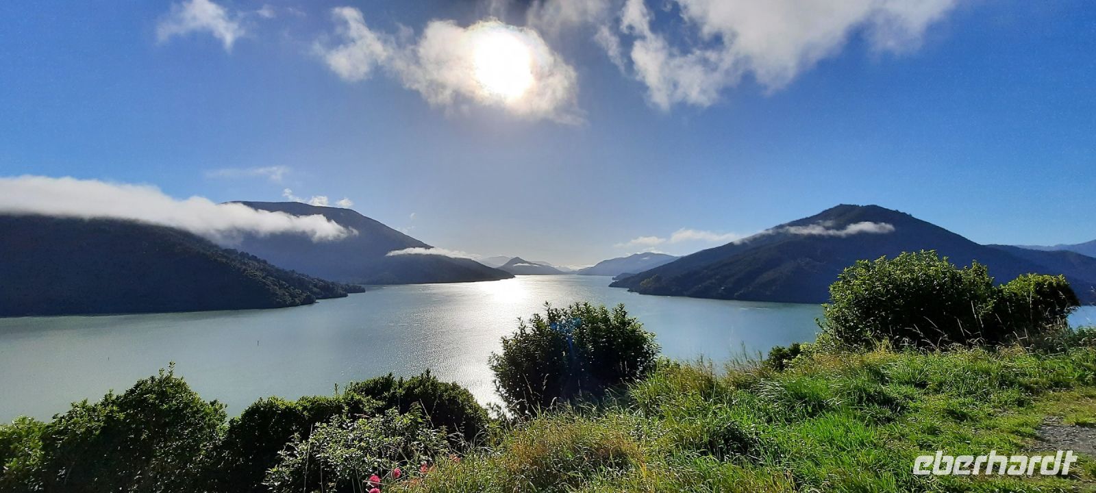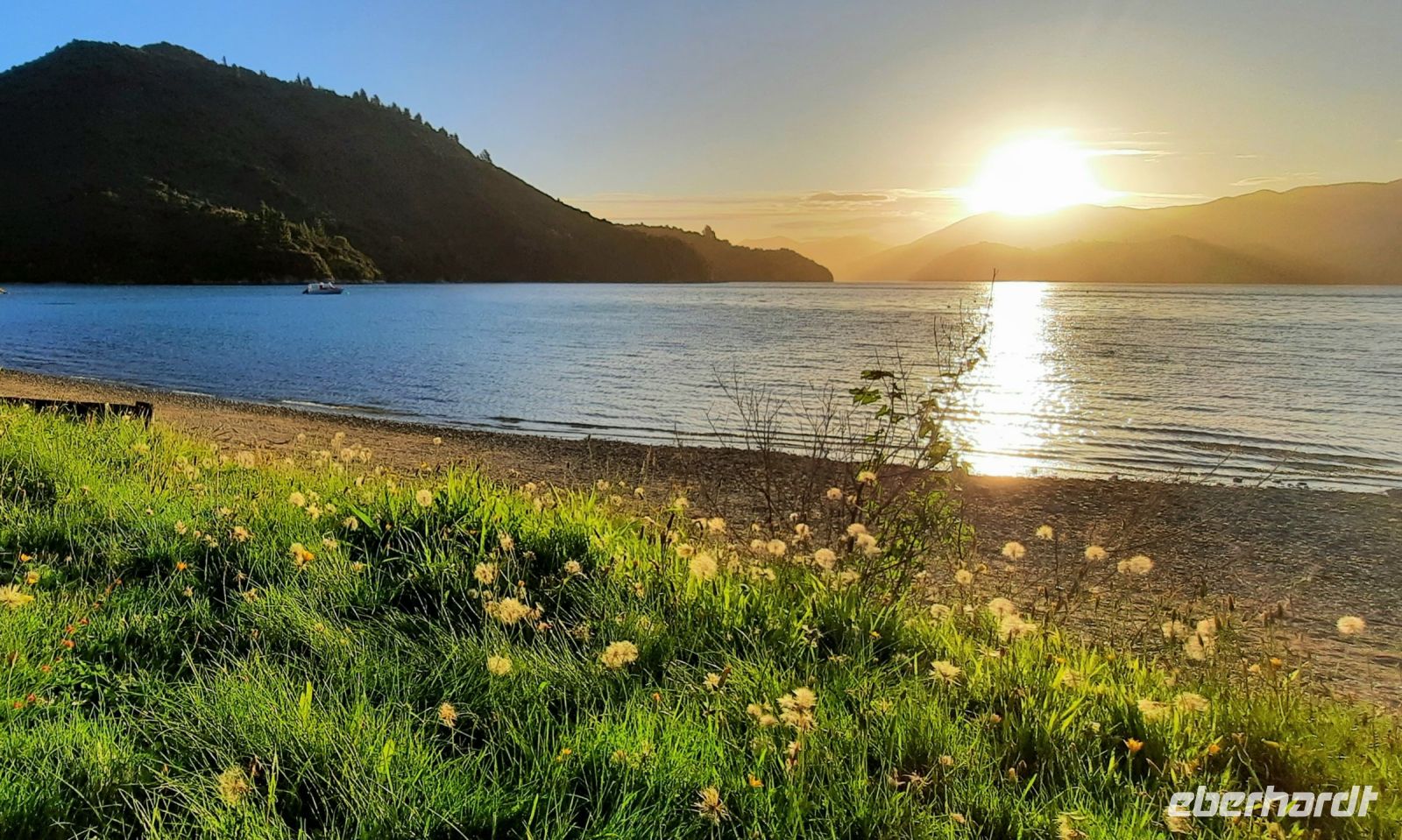 Am kühlen, aber wieder sonnigen Morgen fuhren wir zum Hafen und mussten noch einige Zeit warten, bis wir auf die Fähre rollten. Was hatten wir wieder für ein Glück mit dem Wetter! Sonnenschein und ruhige See – das perfekte Wetter für unsere Überfahrt zur Südinsel. Nach dem individuellen Frühstück auf der Fähre zog es viele auf die Außendecks, um die mehrstündige Überfahrt via Cook Street und dann durch die einmalige Landschaft der Marlborough Sounds mit Tory Channel und Queen Charlotte Sound bis nach Picton. Unsere Augen konnten sich nicht satt sehen = traumhaftes Wetter und einzigartige Kulisse. Zur Mittagszeit legte die Fähre im sonnigen Picton auf der Südinsel an. Während die Reiseroute anderer Eberhardt-Reisen gen Süden nach Kaikoura führt, schlugen wir neue Wege ein - off the beaten track. Nach einem kurzem Boxenstopp am Supermarkt fuhren wir in unserem Whaka auf dem Queen Charlotte Drive in westliche Richtung weiter. Diese Küstenstraße schlängelt sich oberhalb der Sounds entlang. Immer wieder hielten wir an und inne, um das traumhafte Panorama auf die kleinen Buchten zu genießen oder auf Fotos zu bannen. Einige Possums später erreichten wir dann unsere Oase am Kenepuru Sound – das Portage Resort, welches einsam in einer romantischen Bucht liegt. Den weiteren Nachmittag gaben wir uns den Müßiggang hin, entspannten am und im Wasser oder genossen ein Bierchen auf der Terrasse. Auch eine Wekaralle fand diesen Platz besonders schön. Ein faszinierender Sonnenuntergang läutete den gemeinsamen Abend ein.