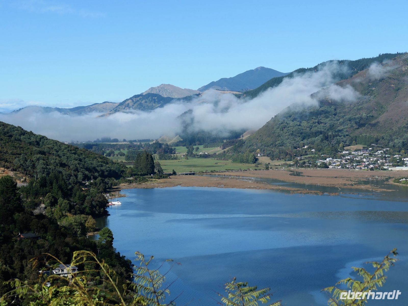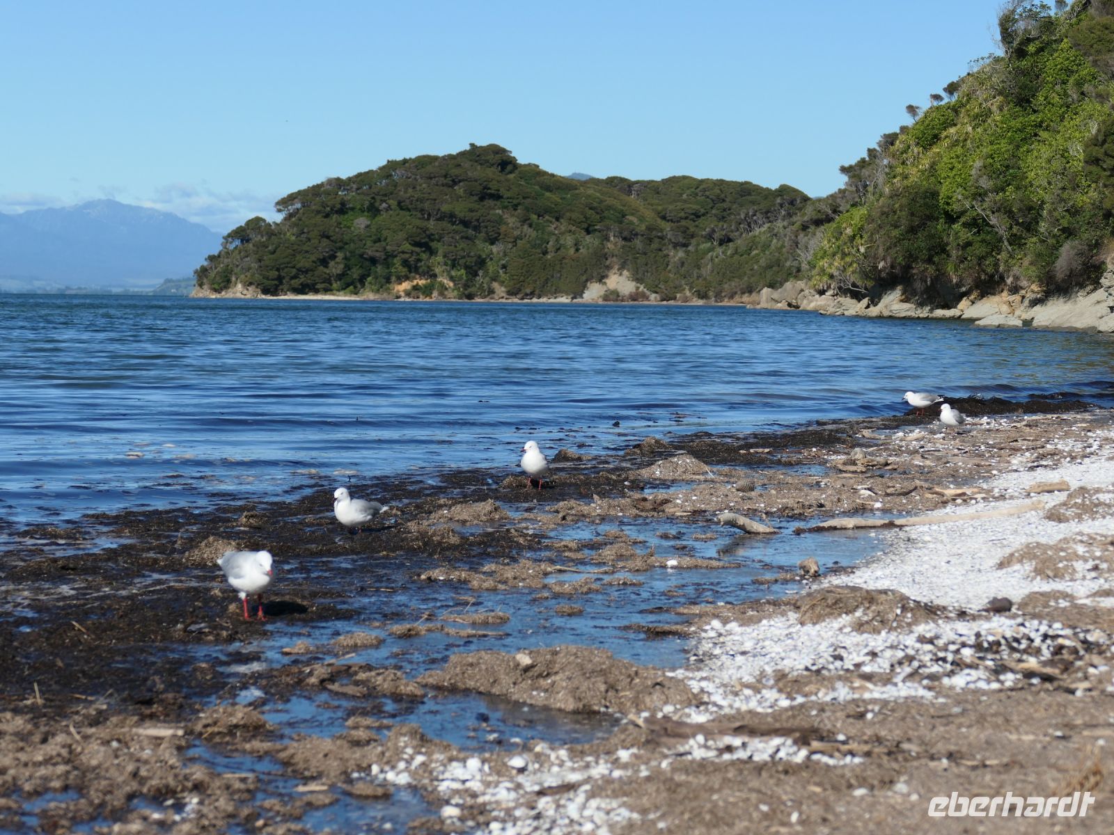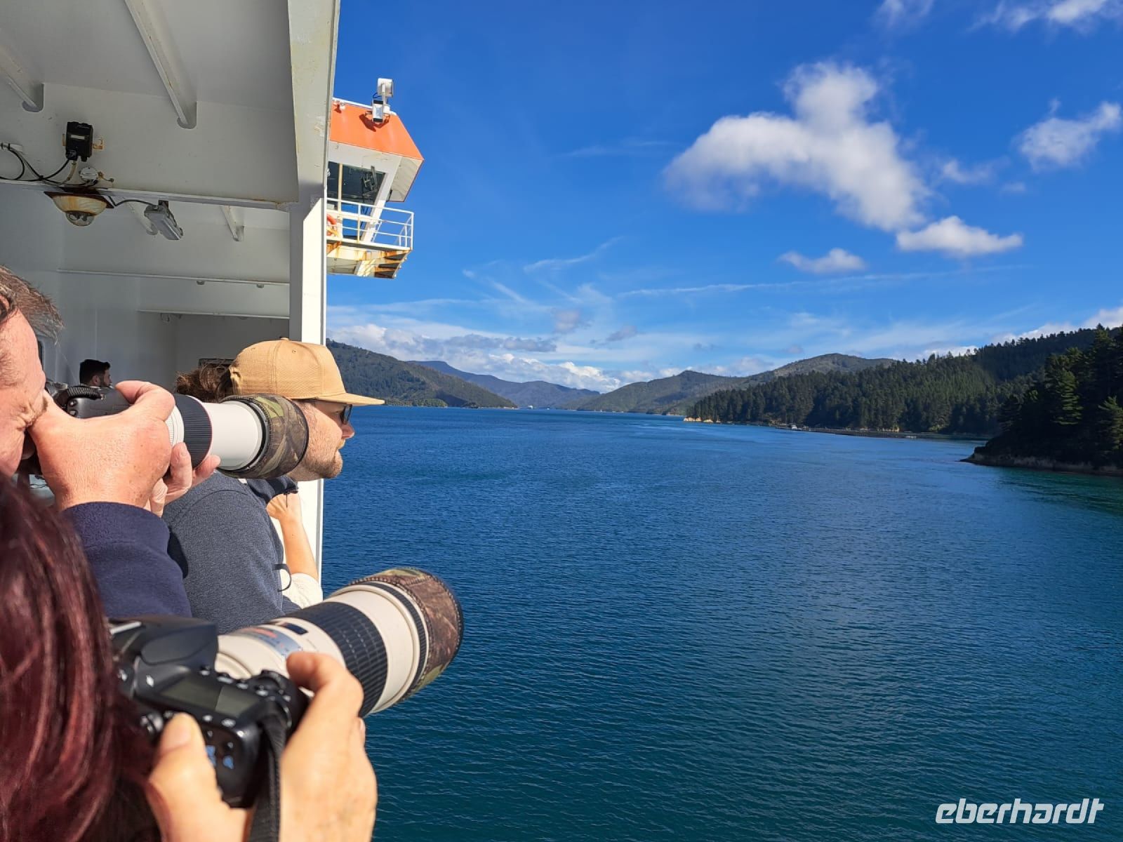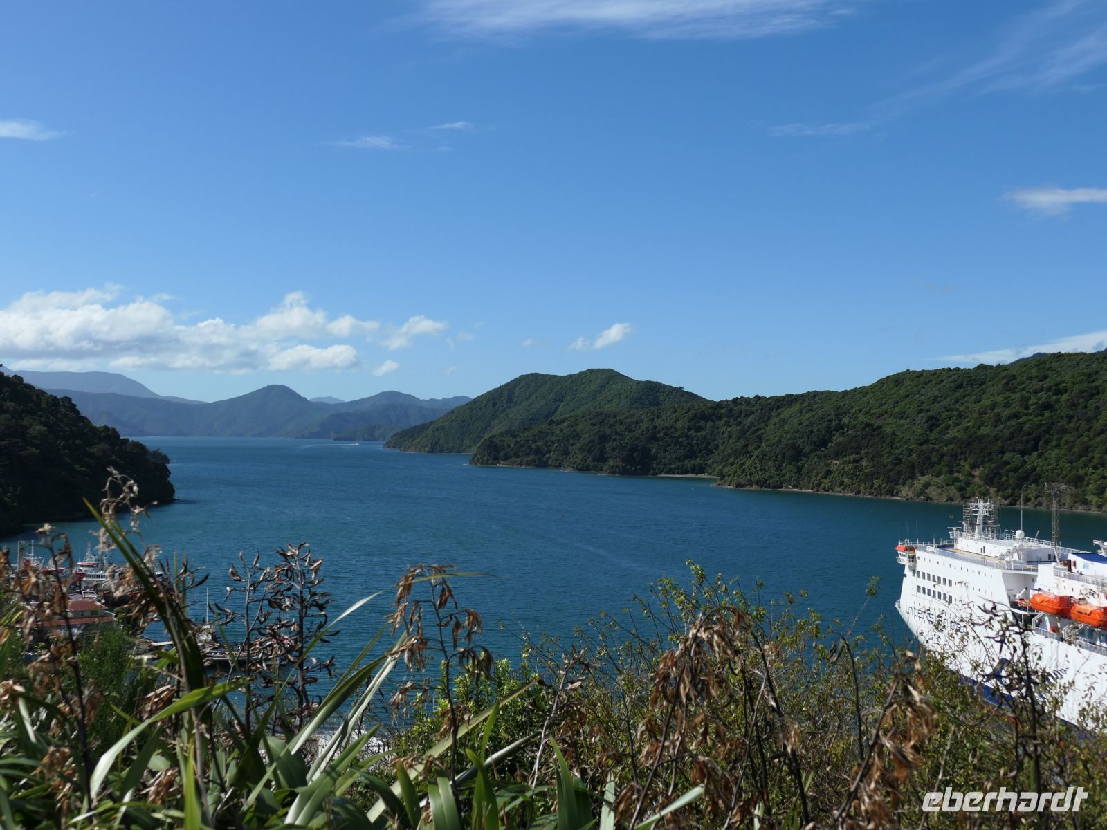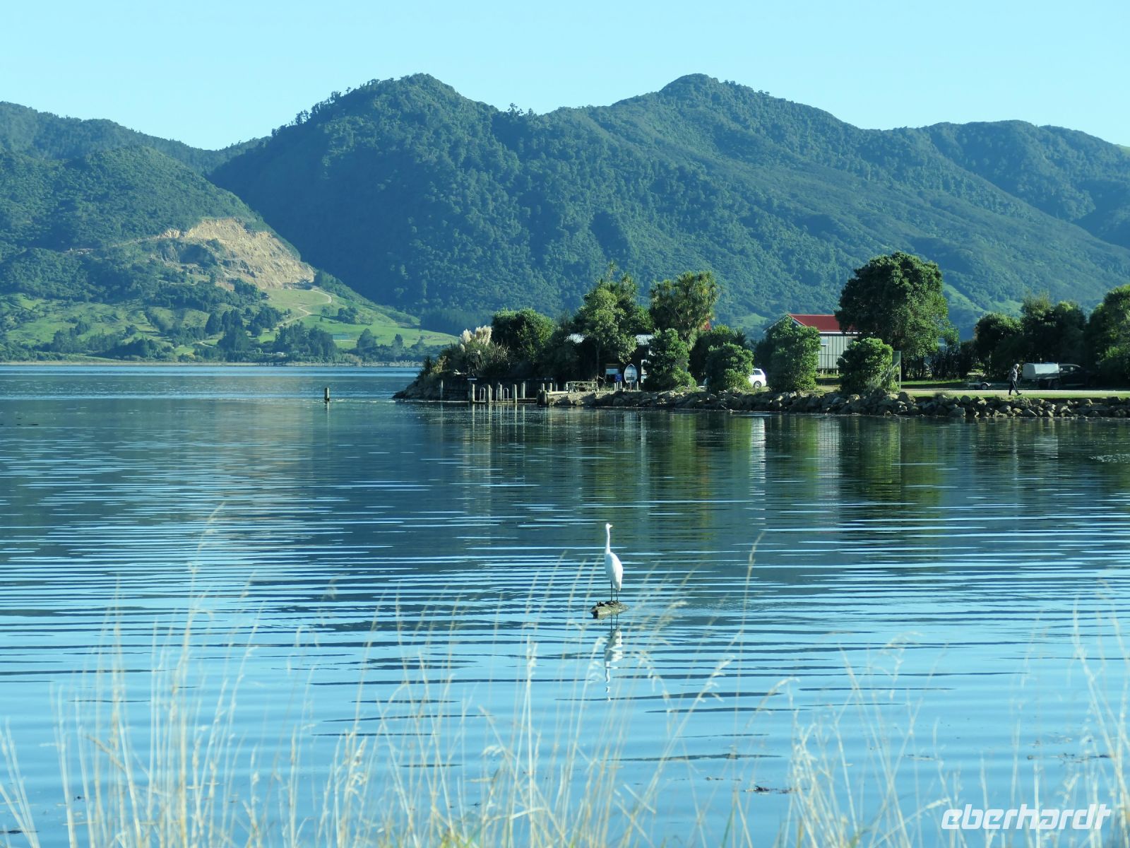 Am kühlen, aber wieder sonnigen Morgen fuhren wir zum Hafen und mussten noch einige Zeit warten, bis wir auf die Fähre rollten. Was hatten wir wieder für ein Glück mit dem Wetter! Sonnenschein und ruhige See – das perfekte Wetter für unsere Überfahrt zur Südinsel. Nach dem individuellen Frühstück auf der Fähre zog es viele auf die Außendecks, um die mehrstündige Überfahrt via Cook Street und dann durch die einmalige Landschaft der Marlborough Sounds mit Tory Channel und Queen Charlotte Sound bis nach Picton. Unsere Augen konnten sich nicht satt sehen = traumhaftes Wetter und einzigartige Kulisse. Zur Mittagszeit legte die Fähre im sonnigen Picton auf der Südinsel an. Während die Reiseroute anderer Eberhardt-Reisen gen Süden nach Kaikoura führt, schlugen wir neue Wege ein - off the beaten track. Nach einem kurzem Boxenstopp am Supermarkt fuhren wir in unserem Whaka auf dem Queen Charlotte Drive in westliche Richtung weiter. Diese Küstenstraße schlängelt sich oberhalb der Sounds entlang. Immer wieder hielten wir an und inne, um das traumhafte Panorama auf die kleinen Buchten zu genießen oder auf Fotos zu bannen. Einige Possums später erreichten wir dann unsere Oase am Kenepuru Sound – das Portage Resort, welches einsam in einer romantischen Bucht liegt. Den weiteren Nachmittag gaben wir uns den Müßiggang hin, entspannten am und im Wasser oder genossen ein Bierchen auf der Terrasse. Auch eine Wekaralle fand diesen Platz besonders schön. Ein faszinierender Sonnenuntergang läutete den gemeinsamen Abend ein.