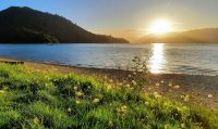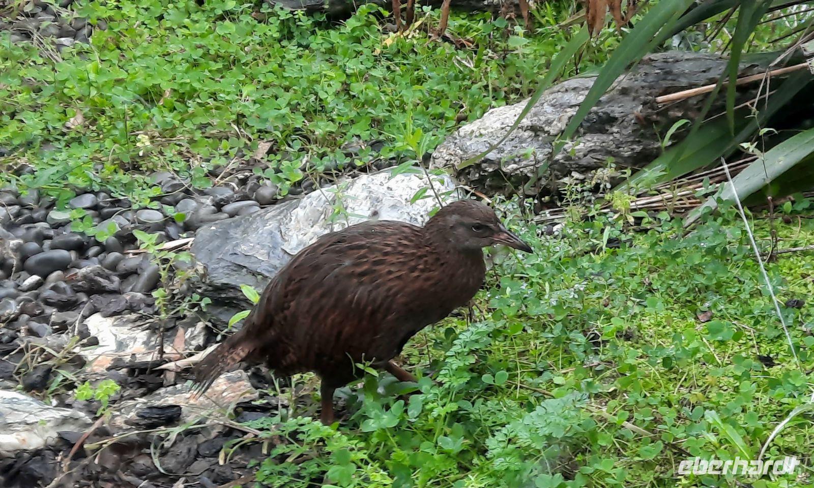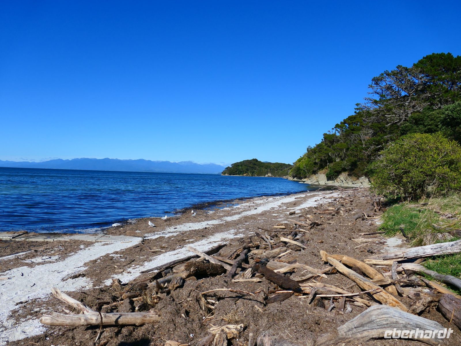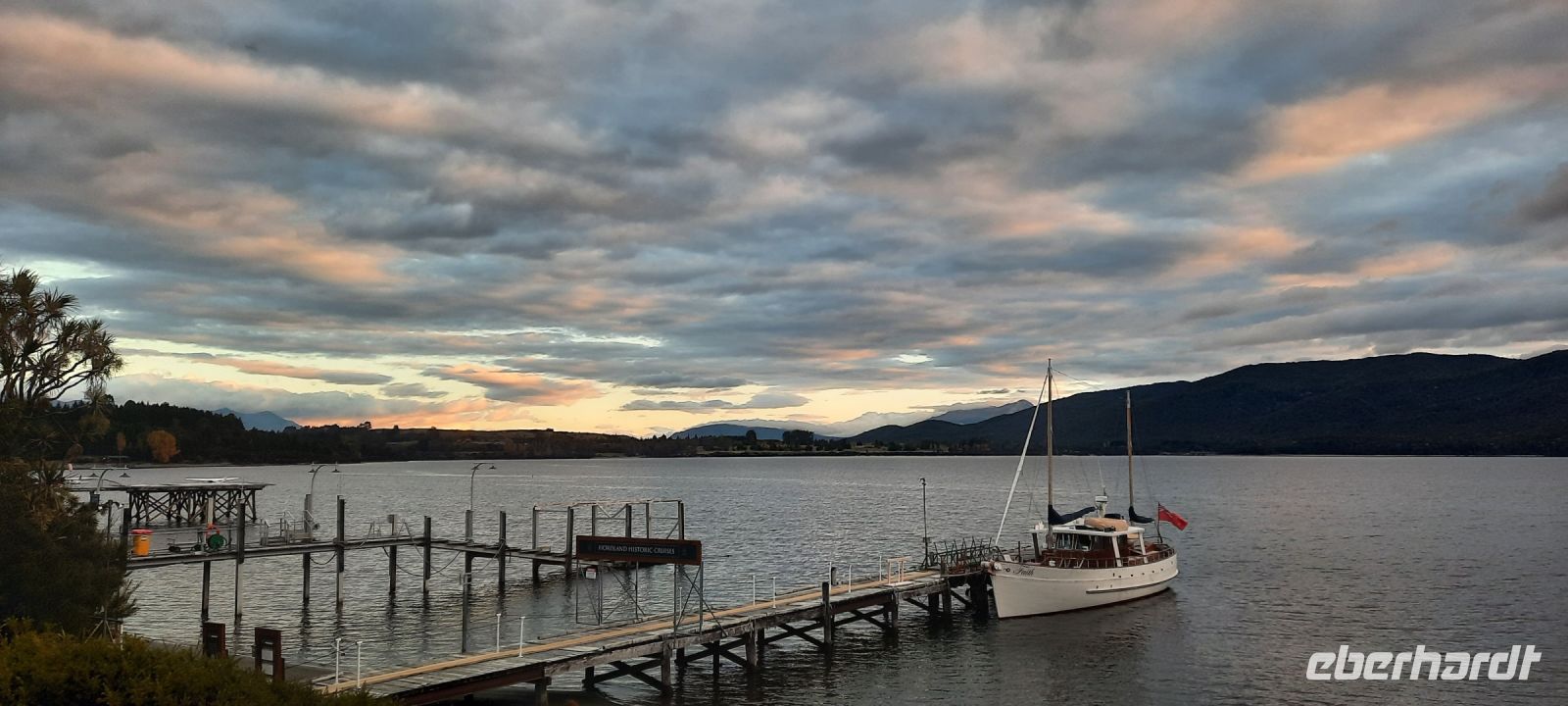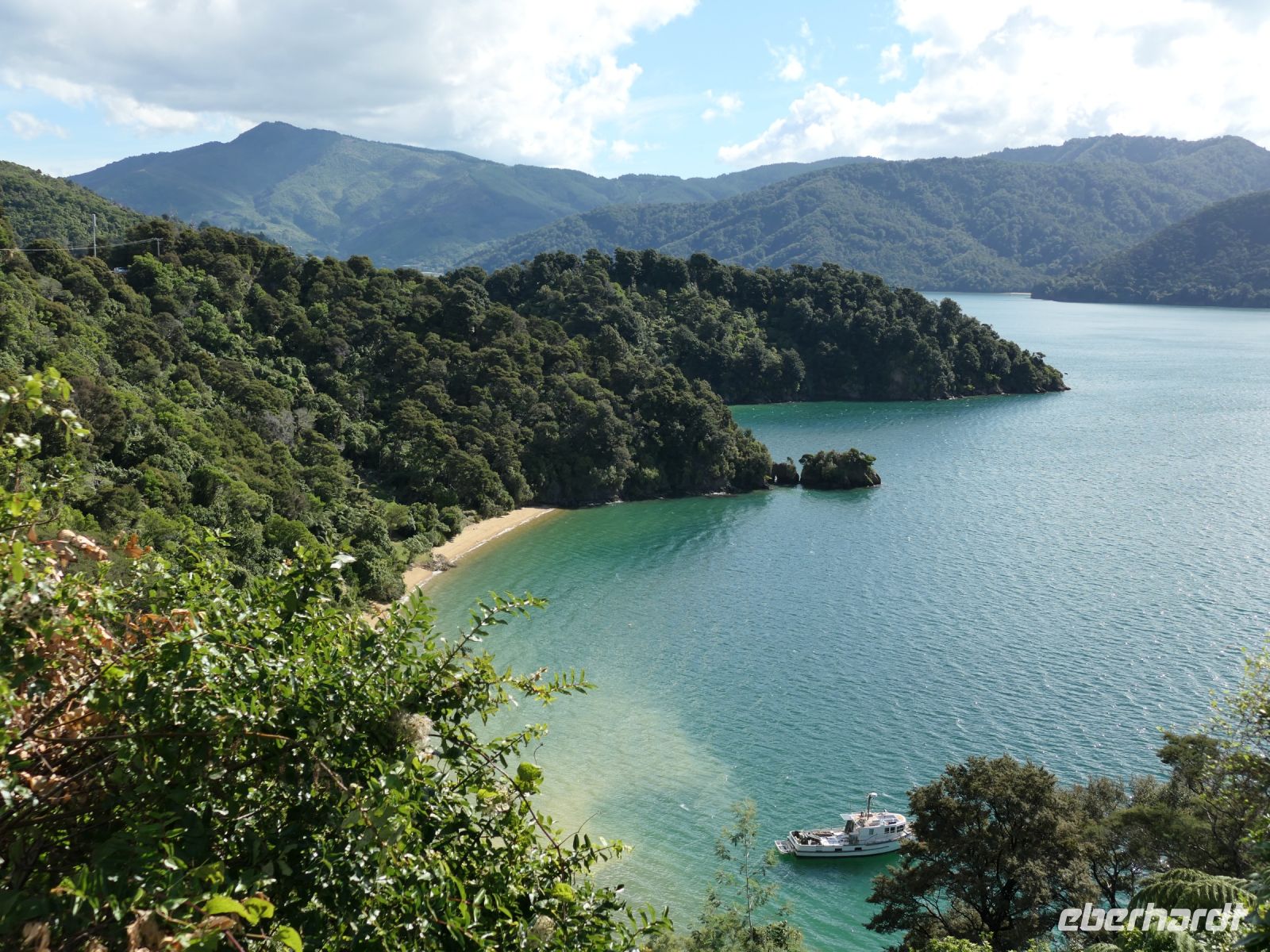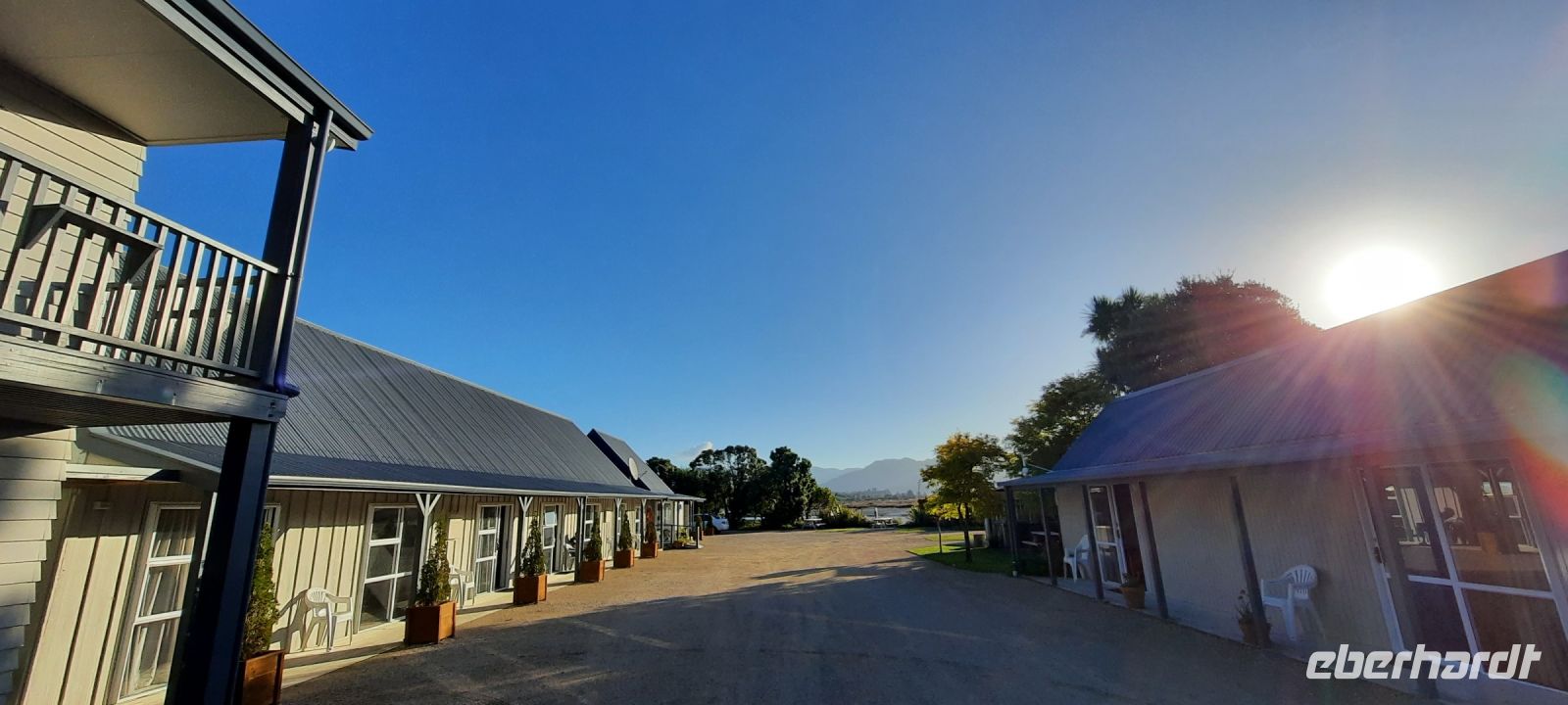 Am kühlen, aber wieder sonnigen Morgen fuhren wir zum Hafen und mussten noch einige Zeit warten, bis wir auf die Fähre rollten. Was hatten wir wieder für ein Glück mit dem Wetter! Sonnenschein und ruhige See – das perfekte Wetter für unsere Überfahrt zur Südinsel. Nach dem individuellen Frühstück auf der Fähre zog es viele auf die Außendecks, um die mehrstündige Überfahrt via Cook Street und dann durch die einmalige Landschaft der Marlborough Sounds mit Tory Channel und Queen Charlotte Sound bis nach Picton. Unsere Augen konnten sich nicht satt sehen = traumhaftes Wetter und einzigartige Kulisse. Zur Mittagszeit legte die Fähre im sonnigen Picton auf der Südinsel an. Während die Reiseroute anderer Eberhardt-Reisen gen Süden nach Kaikoura führt, schlugen wir neue Wege ein - off the beaten track. Nach einem kurzem Boxenstopp am Supermarkt fuhren wir in unserem Whaka auf dem Queen Charlotte Drive in westliche Richtung weiter. Diese Küstenstraße schlängelt sich oberhalb der Sounds entlang. Immer wieder hielten wir an und inne, um das traumhafte Panorama auf die kleinen Buchten zu genießen oder auf Fotos zu bannen. Einige Possums später erreichten wir dann unsere Oase am Kenepuru Sound – das Portage Resort, welches einsam in einer romantischen Bucht liegt. Den weiteren Nachmittag gaben wir uns den Müßiggang hin, entspannten am und im Wasser oder genossen ein Bierchen auf der Terrasse. Auch eine Wekaralle fand diesen Platz besonders schön. Ein faszinierender Sonnenuntergang läutete den gemeinsamen Abend ein.