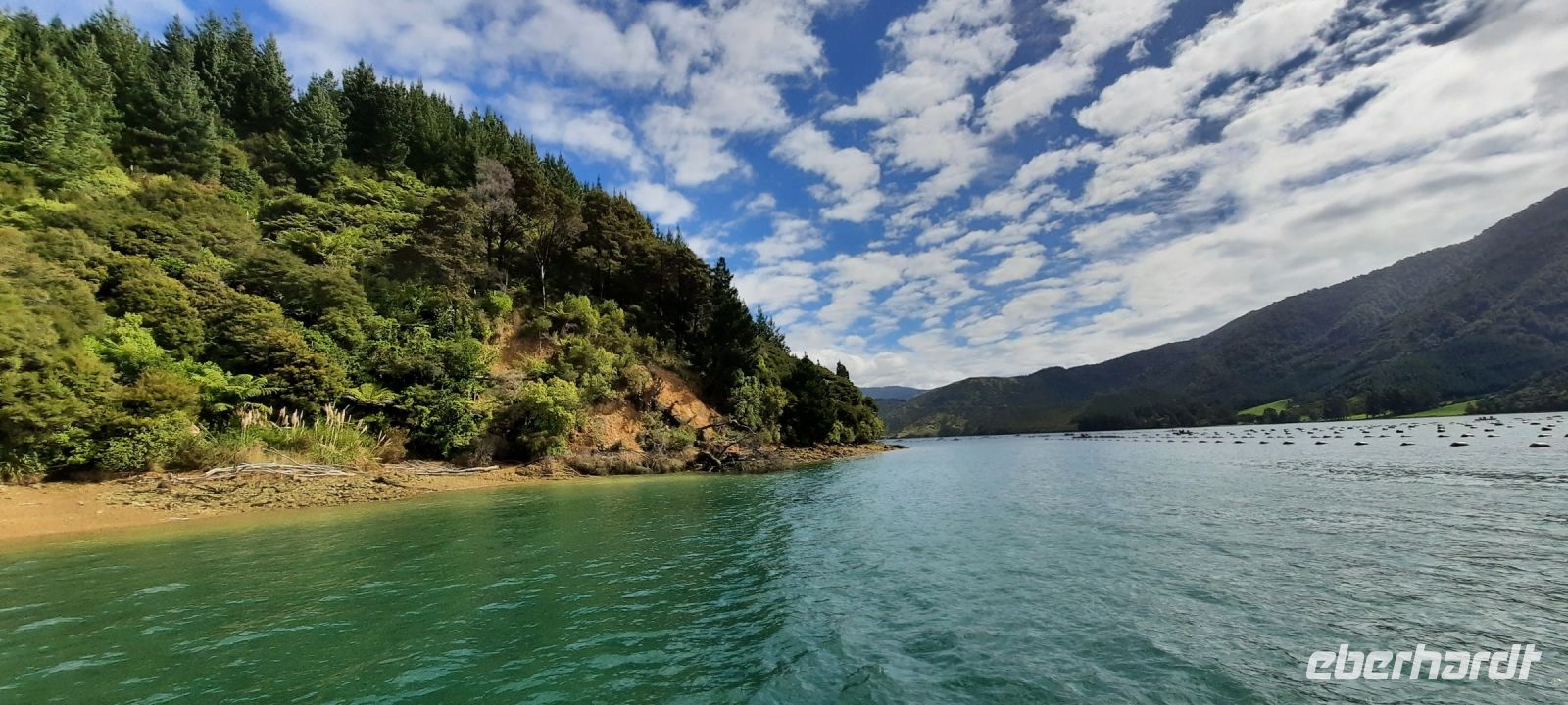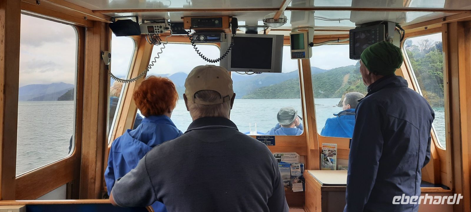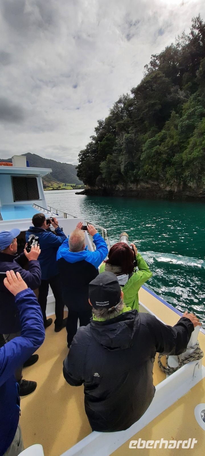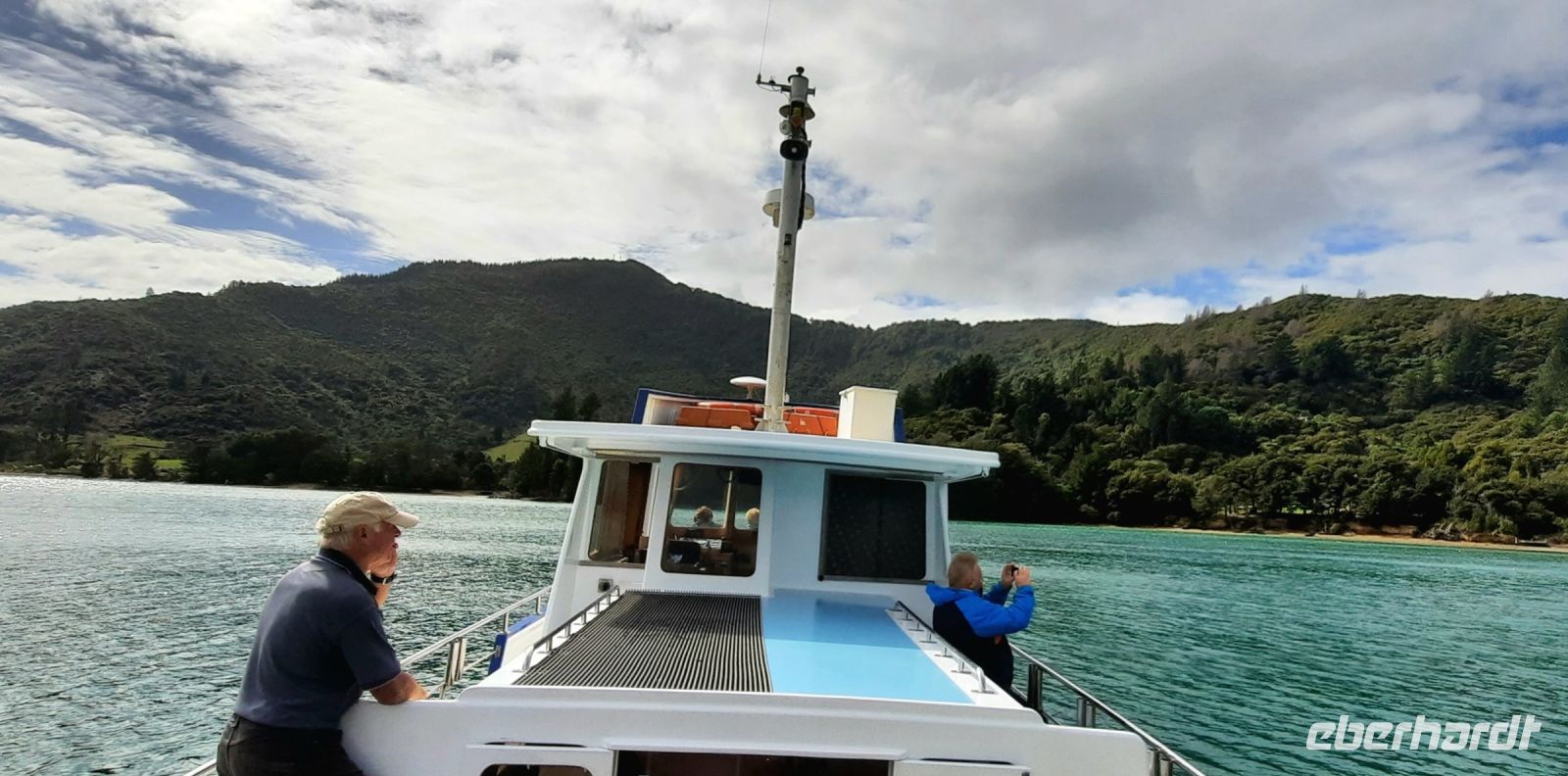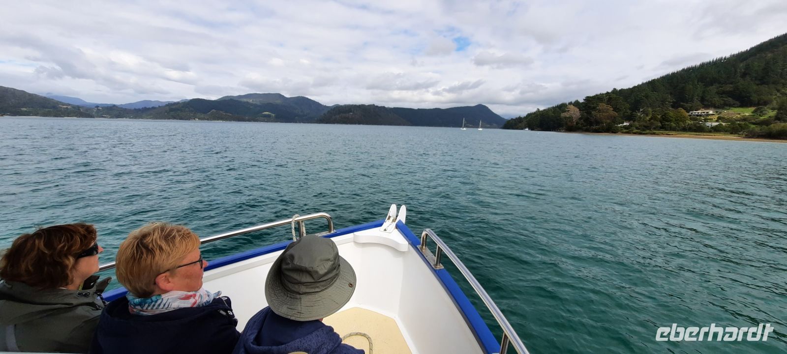 Nach einer entspannten Nachtruhe ging es an diesem Tag auch entspannt weiter. Unser Whaka hatte heute einen freien Tag, da wir maritim unterwegs sein wollten. Am hauseigenen Bootssteg des Resorts erwartete uns Kapitän Gary, der schon in der 3. Generation hier lebt. Er besitzt eine Muschelfarm, hat Wald und Land und auch mit seinem Bootscharter ist er unabdingbar für die abgelegene Region. Sein Boot Toroa (Albatross) hatten wir exklusiv für Eberhardt gechartert und es war bestens geeignet für unsere kleine Gruppe. Nach einer sehr herzlichen Begrüßung starteten wir unsere Cruise in Familie. Nach kurzer Einweisung durften einige Gäste auch mal das Steuerrad in die Hand nehmen. So schipperten wir gemütlich durch das glasklare Wasser des Kenepuru Sounds. Gary erzählte uns mit Witz und Humor viel über seine Heimat, seine Arbeit sowie die ein oder andere Anekdote, alles ganz persönlich, familiär und authentisch. Am Vormittag war es noch etwas trübe, aber später zeigte sich die Sonne wieder. Wir erspähten Robben und ganz verschiedene Arten von Kormoranen. Unterwegs zeigte uns Gary seine Muschelfarm, wo er Grünschalenmuscheln „anbaut“. Ganz klar, dass wir diese auch verkosten konnten. Während einige Gäste einen Sprung in den Sound wagten, werkelte Gary mit Bernd und Annett in der Kombüse. Das maritime Picknick mit Muscheln, Wein und anderen Snacks war genau unser Geschmack wie auch die exklusive Kreuzfahrt, die wir bis zuletzt in vollen Zügen genossen. Am Nachmittag legte die Toroa wieder am Bootssteg in Portage an und wir sagten Gary herzlich Auf Wiedersehen! Bis zum Abendessen hatten wir noch etwas Freizeit. So unternahmen wir noch eine kleine Erkundungswanderung in die Umgebung. Ein schöner Tag neigte sich dem Ende.