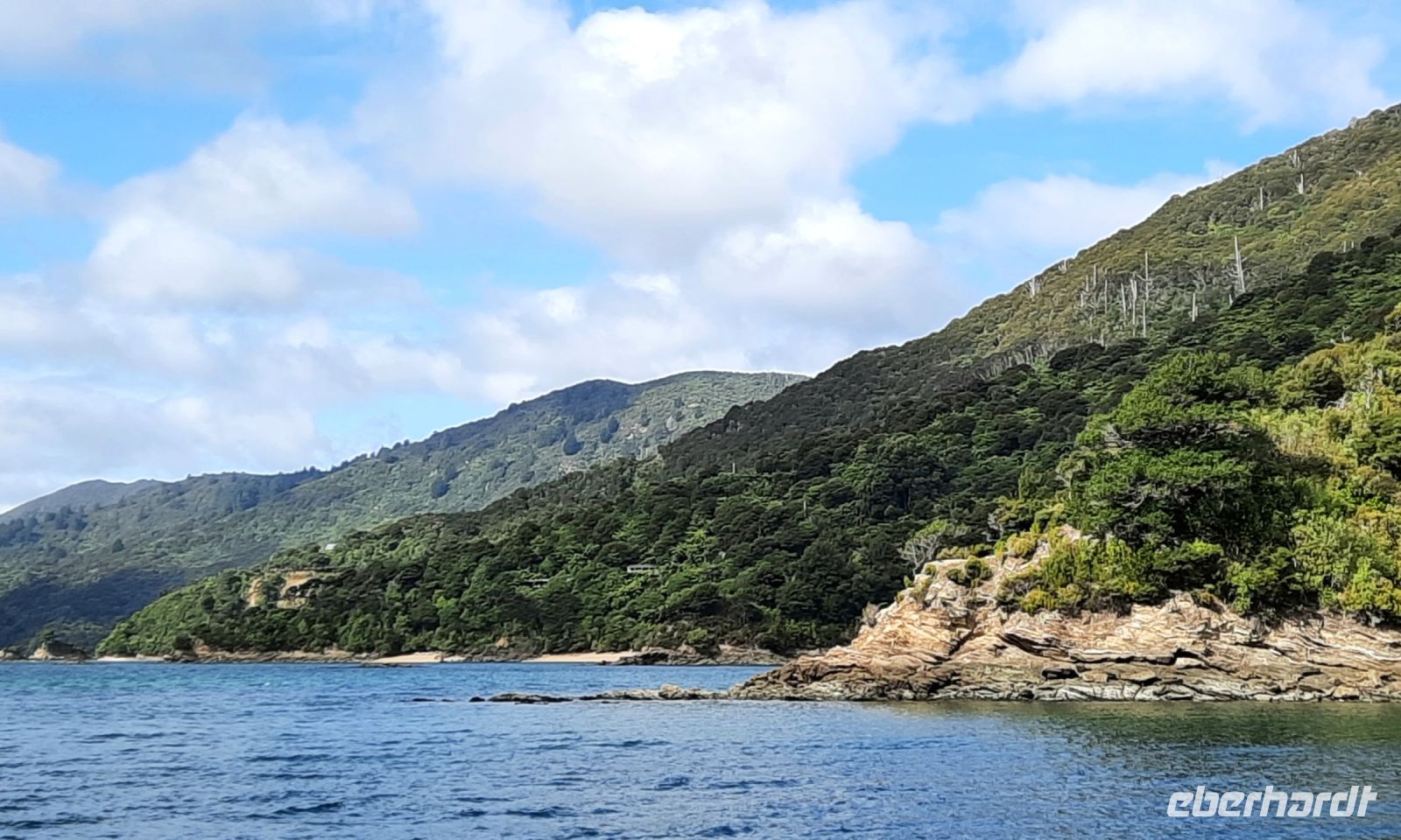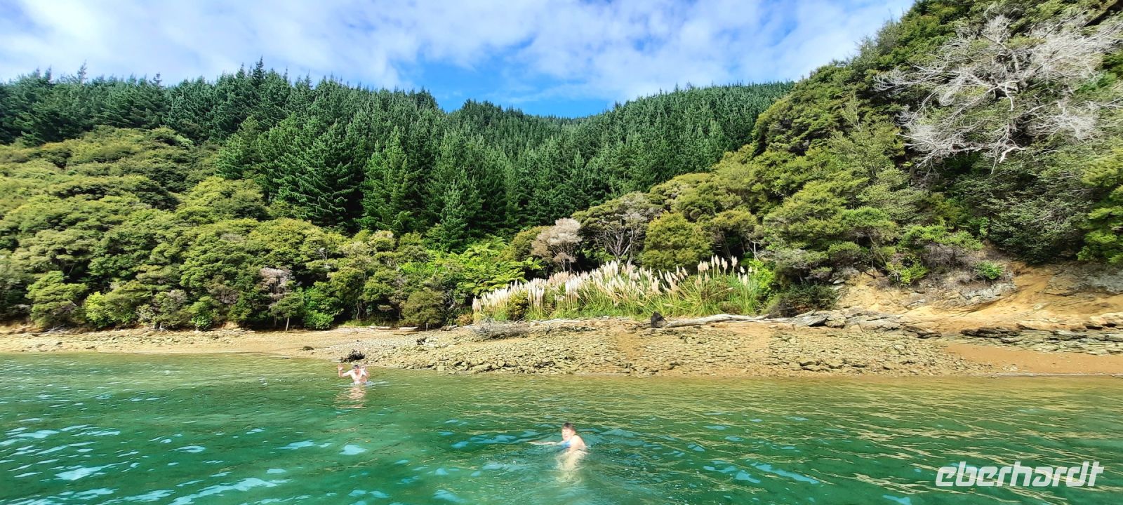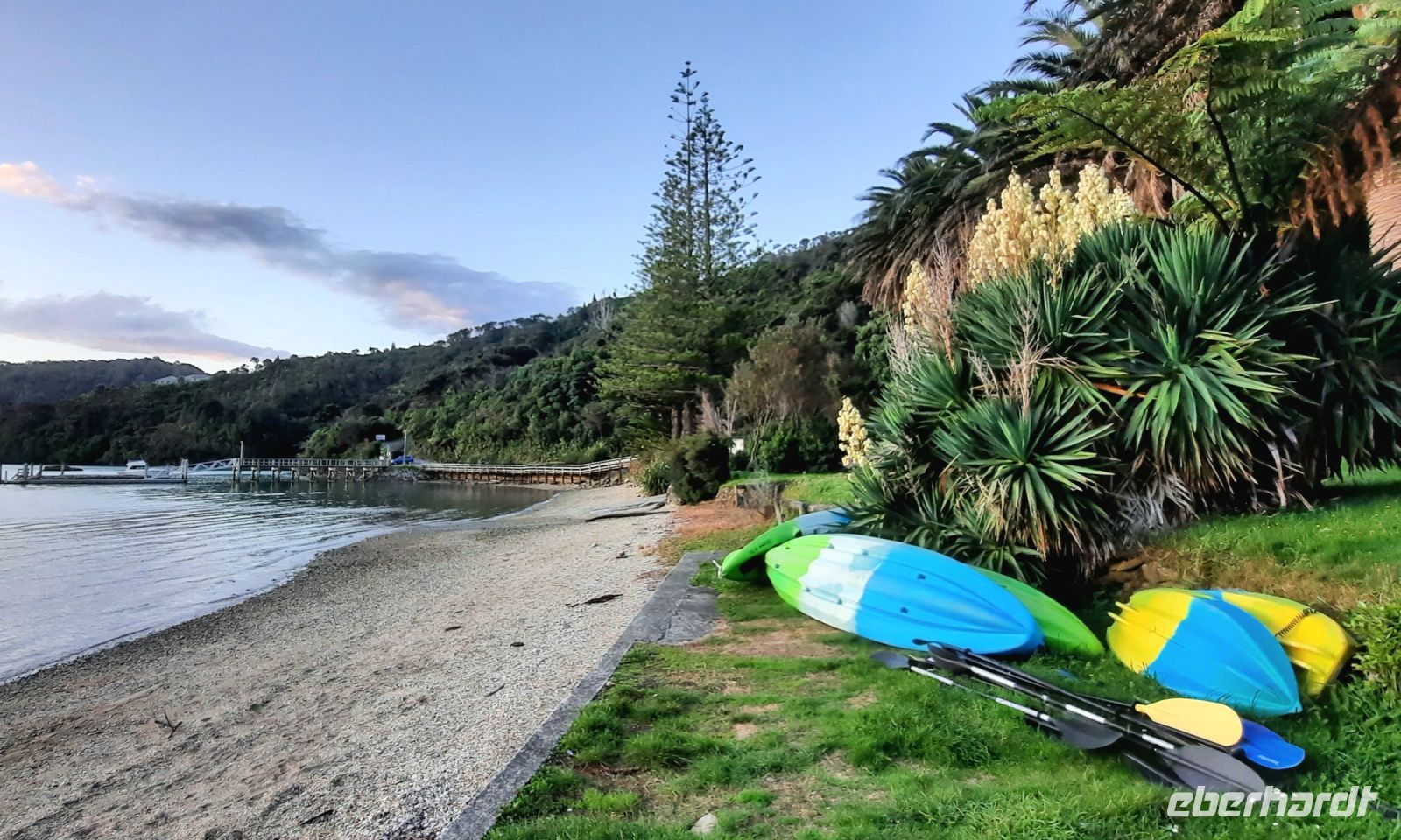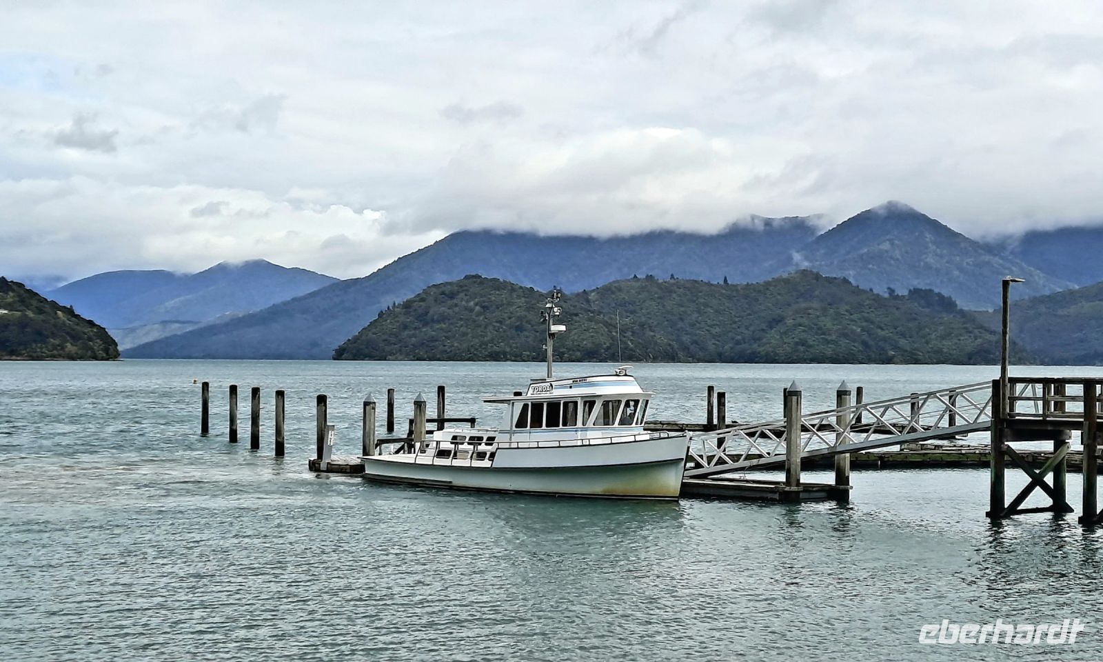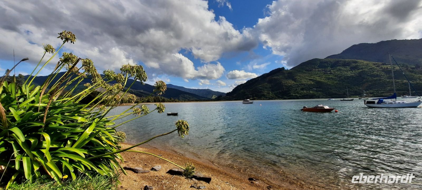 Nach einer entspannten Nachtruhe ging es an diesem Tag auch entspannt weiter. Unser Whaka hatte heute einen freien Tag, da wir maritim unterwegs sein wollten. Am hauseigenen Bootssteg des Resorts erwartete uns Kapitän Gary, der schon in der 3. Generation hier lebt. Er besitzt eine Muschelfarm, hat Wald und Land und auch mit seinem Bootscharter ist er unabdingbar für die abgelegene Region. Sein Boot Toroa (Albatross) hatten wir exklusiv für Eberhardt gechartert und es war bestens geeignet für unsere kleine Gruppe. Nach einer sehr herzlichen Begrüßung starteten wir unsere Cruise in Familie. Nach kurzer Einweisung durften einige Gäste auch mal das Steuerrad in die Hand nehmen. So schipperten wir gemütlich durch das glasklare Wasser des Kenepuru Sounds. Gary erzählte uns mit Witz und Humor viel über seine Heimat, seine Arbeit sowie die ein oder andere Anekdote, alles ganz persönlich, familiär und authentisch. Am Vormittag war es noch etwas trübe, aber später zeigte sich die Sonne wieder. Wir erspähten Robben und ganz verschiedene Arten von Kormoranen. Unterwegs zeigte uns Gary seine Muschelfarm, wo er Grünschalenmuscheln „anbaut“. Ganz klar, dass wir diese auch verkosten konnten. Während einige Gäste einen Sprung in den Sound wagten, werkelte Gary mit Bernd und Annett in der Kombüse. Das maritime Picknick mit Muscheln, Wein und anderen Snacks war genau unser Geschmack wie auch die exklusive Kreuzfahrt, die wir bis zuletzt in vollen Zügen genossen. Am Nachmittag legte die Toroa wieder am Bootssteg in Portage an und wir sagten Gary herzlich Auf Wiedersehen! Bis zum Abendessen hatten wir noch etwas Freizeit. So unternahmen wir noch eine kleine Erkundungswanderung in die Umgebung. Ein schöner Tag neigte sich dem Ende.