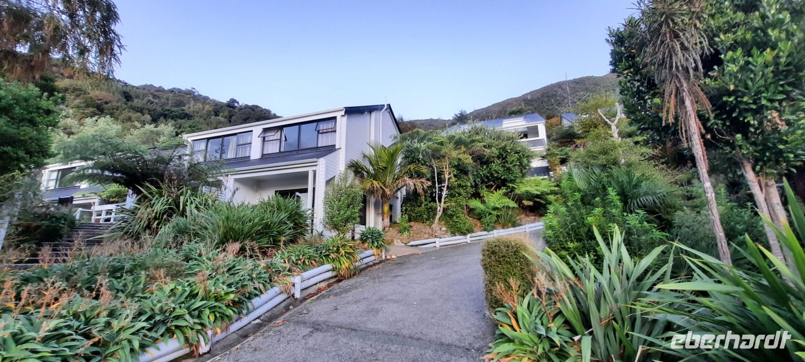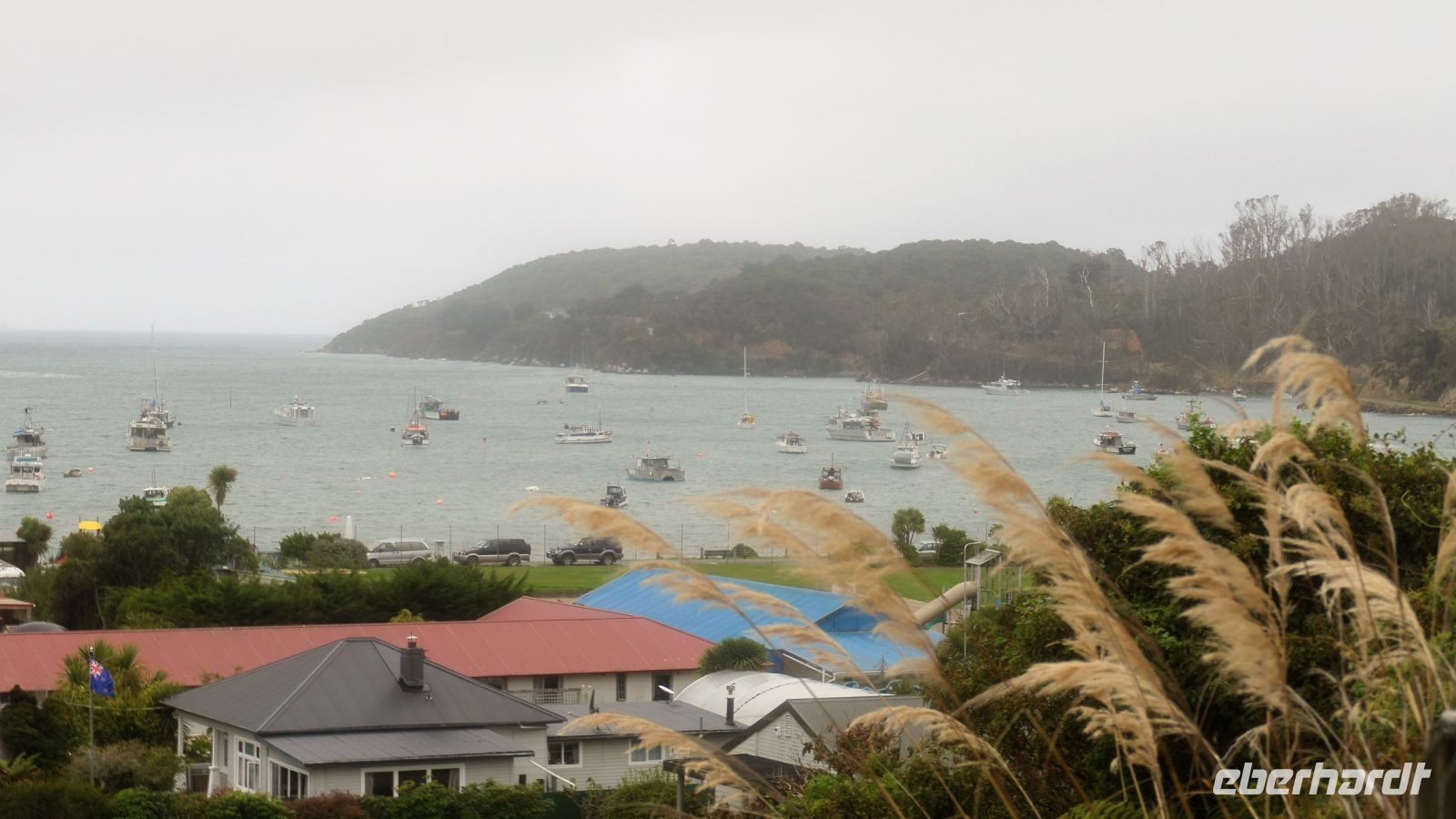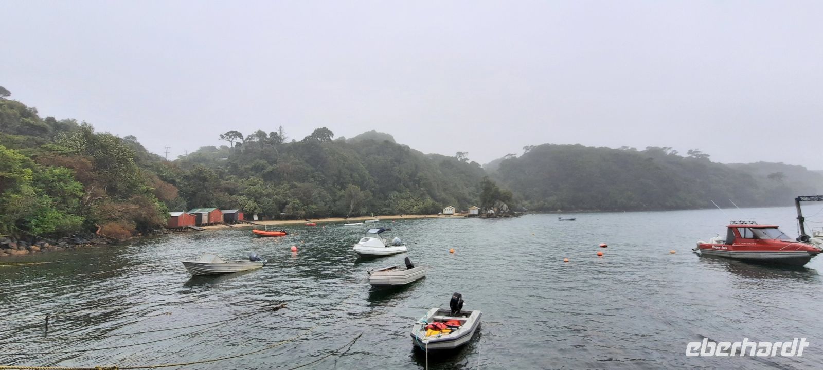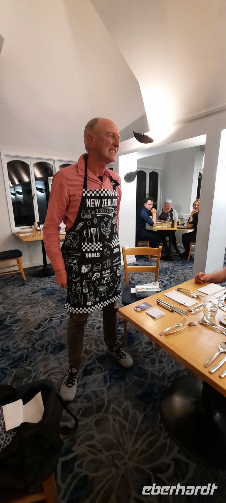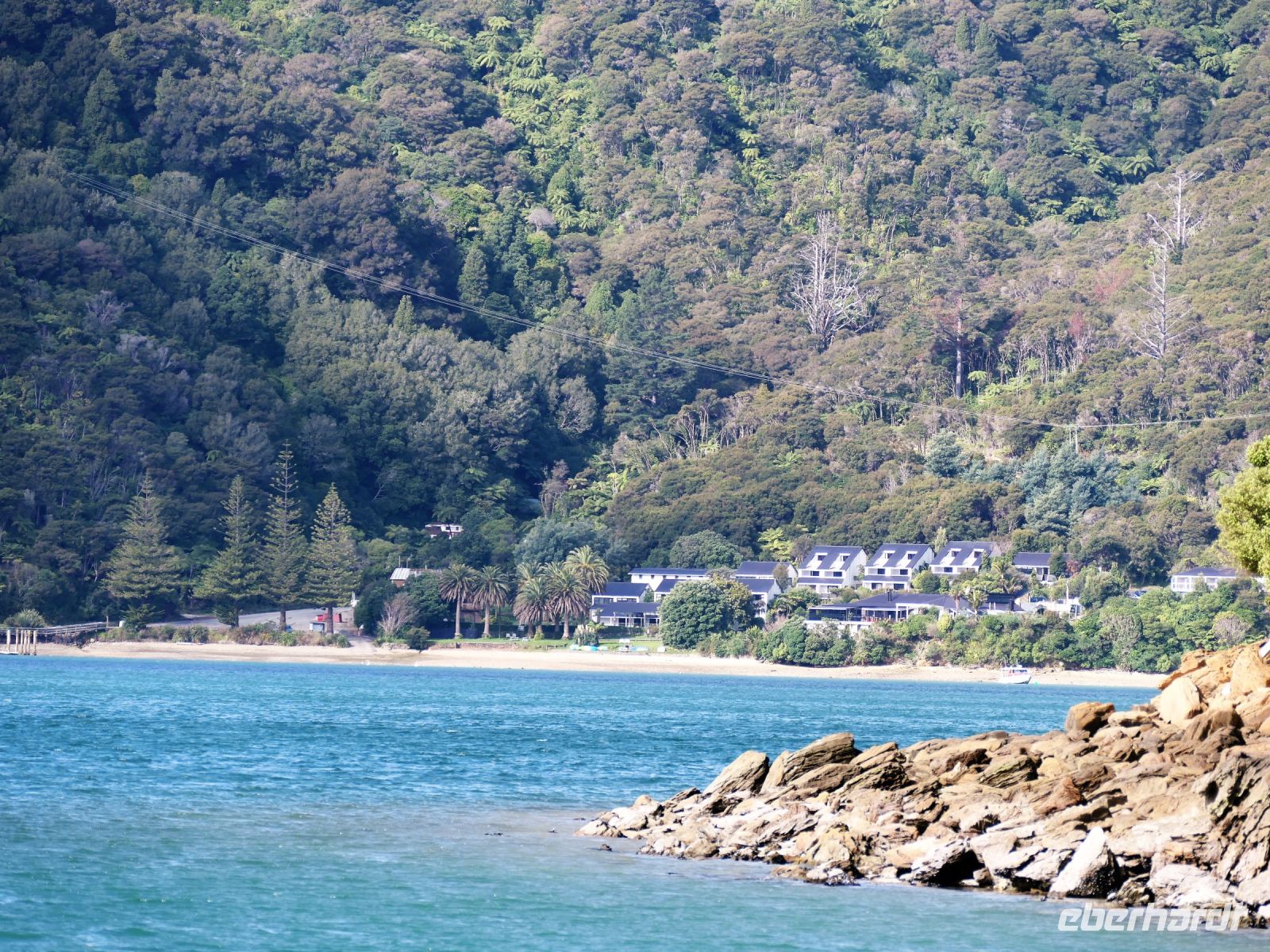 Nach einer entspannten Nachtruhe ging es an diesem Tag auch entspannt weiter. Unser Whaka hatte heute einen freien Tag, da wir maritim unterwegs sein wollten. Am hauseigenen Bootssteg des Resorts erwartete uns Kapitän Gary, der schon in der 3. Generation hier lebt. Er besitzt eine Muschelfarm, hat Wald und Land und auch mit seinem Bootscharter ist er unabdingbar für die abgelegene Region. Sein Boot Toroa (Albatross) hatten wir exklusiv für Eberhardt gechartert und es war bestens geeignet für unsere kleine Gruppe. Nach einer sehr herzlichen Begrüßung starteten wir unsere Cruise in Familie. Nach kurzer Einweisung durften einige Gäste auch mal das Steuerrad in die Hand nehmen. So schipperten wir gemütlich durch das glasklare Wasser des Kenepuru Sounds. Gary erzählte uns mit Witz und Humor viel über seine Heimat, seine Arbeit sowie die ein oder andere Anekdote, alles ganz persönlich, familiär und authentisch. Am Vormittag war es noch etwas trübe, aber später zeigte sich die Sonne wieder. Wir erspähten Robben und ganz verschiedene Arten von Kormoranen. Unterwegs zeigte uns Gary seine Muschelfarm, wo er Grünschalenmuscheln „anbaut“. Ganz klar, dass wir diese auch verkosten konnten. Während einige Gäste einen Sprung in den Sound wagten, werkelte Gary mit Bernd und Annett in der Kombüse. Das maritime Picknick mit Muscheln, Wein und anderen Snacks war genau unser Geschmack wie auch die exklusive Kreuzfahrt, die wir bis zuletzt in vollen Zügen genossen. Am Nachmittag legte die Toroa wieder am Bootssteg in Portage an und wir sagten Gary herzlich Auf Wiedersehen! Bis zum Abendessen hatten wir noch etwas Freizeit. So unternahmen wir noch eine kleine Erkundungswanderung in die Umgebung. Ein schöner Tag neigte sich dem Ende.