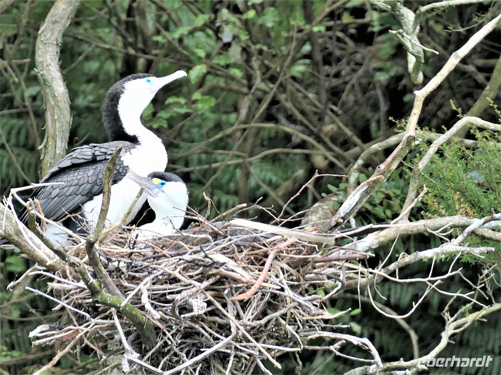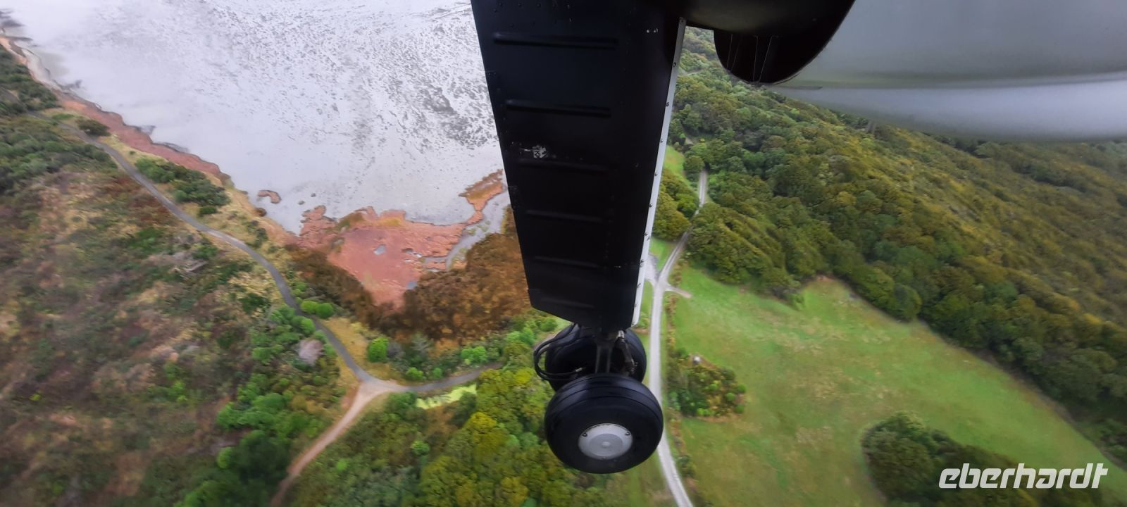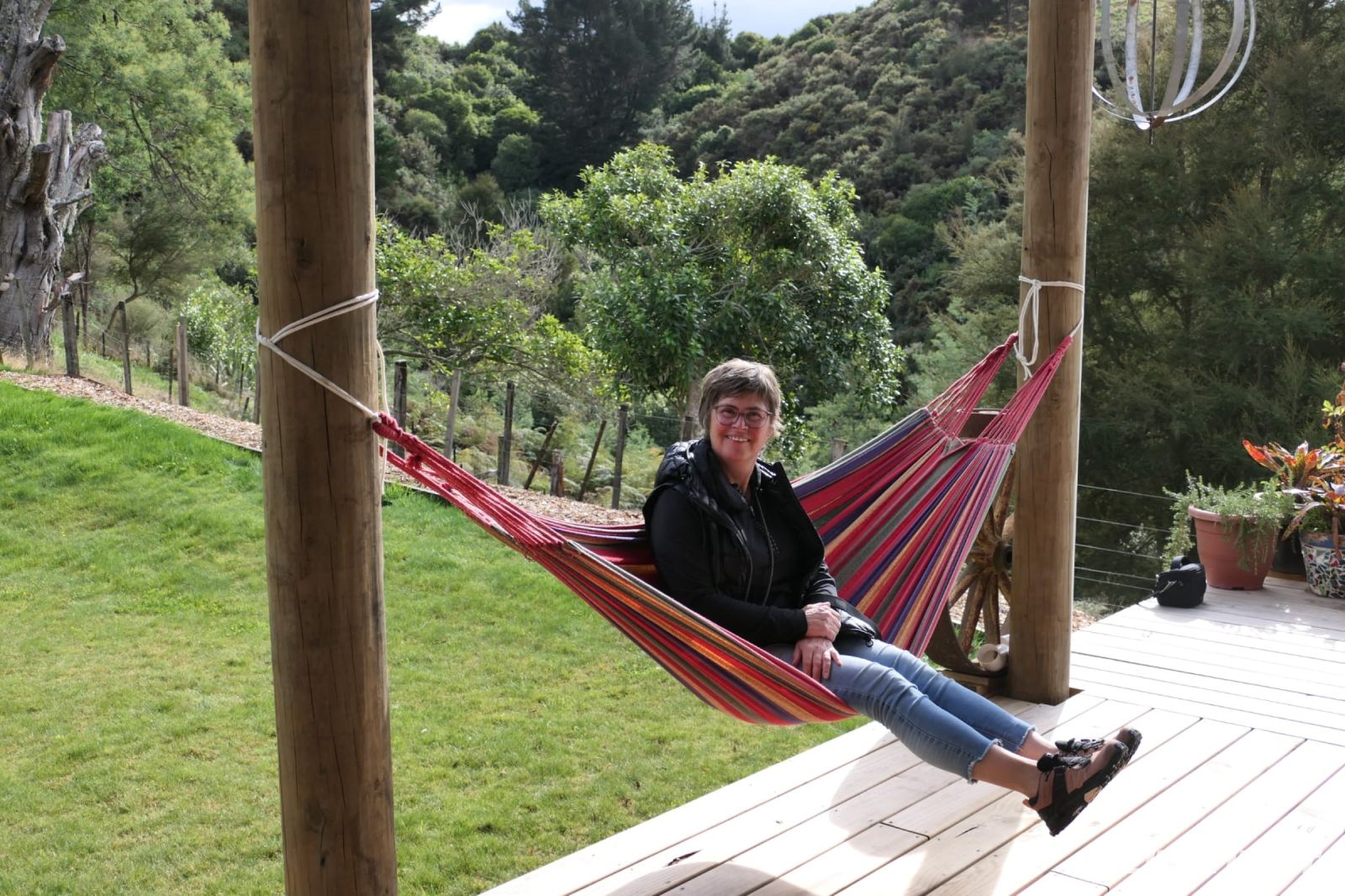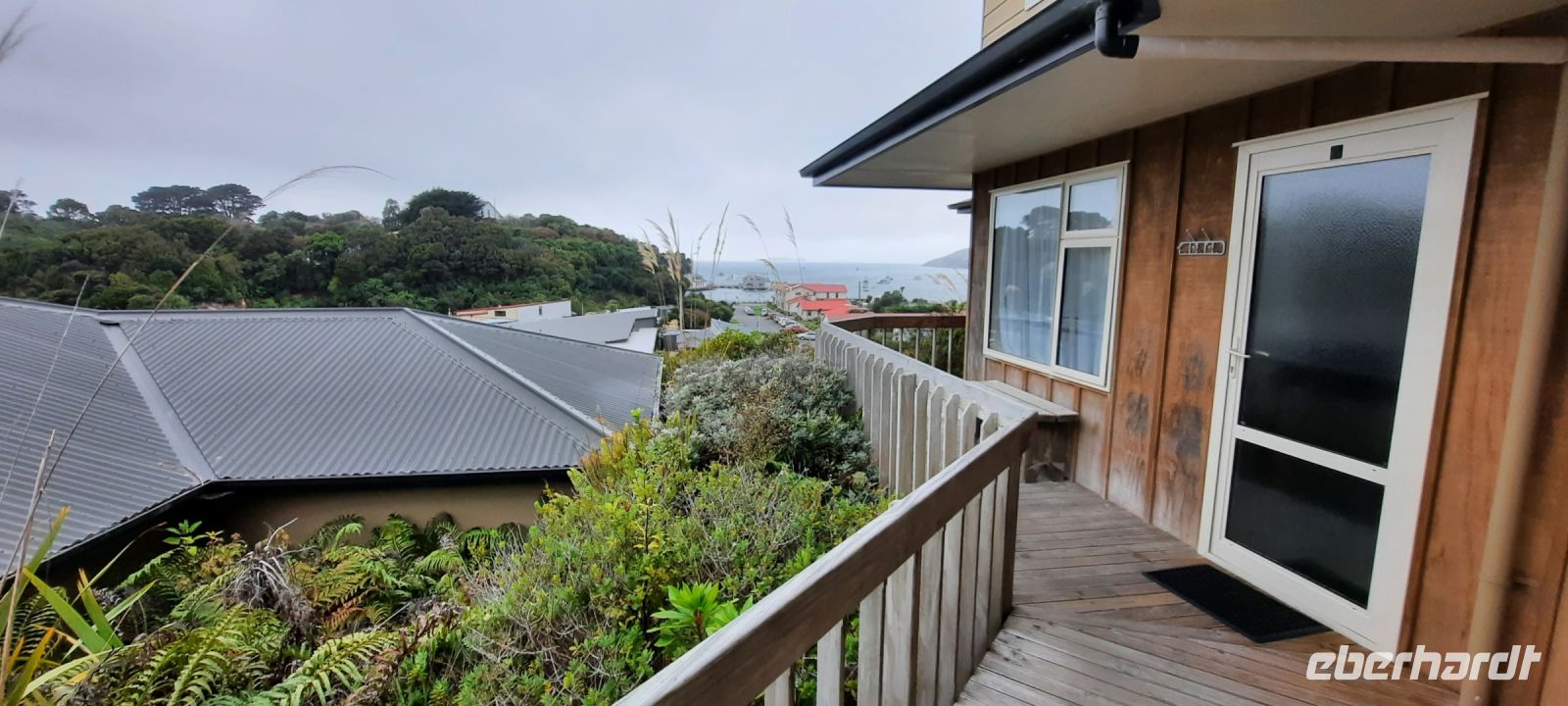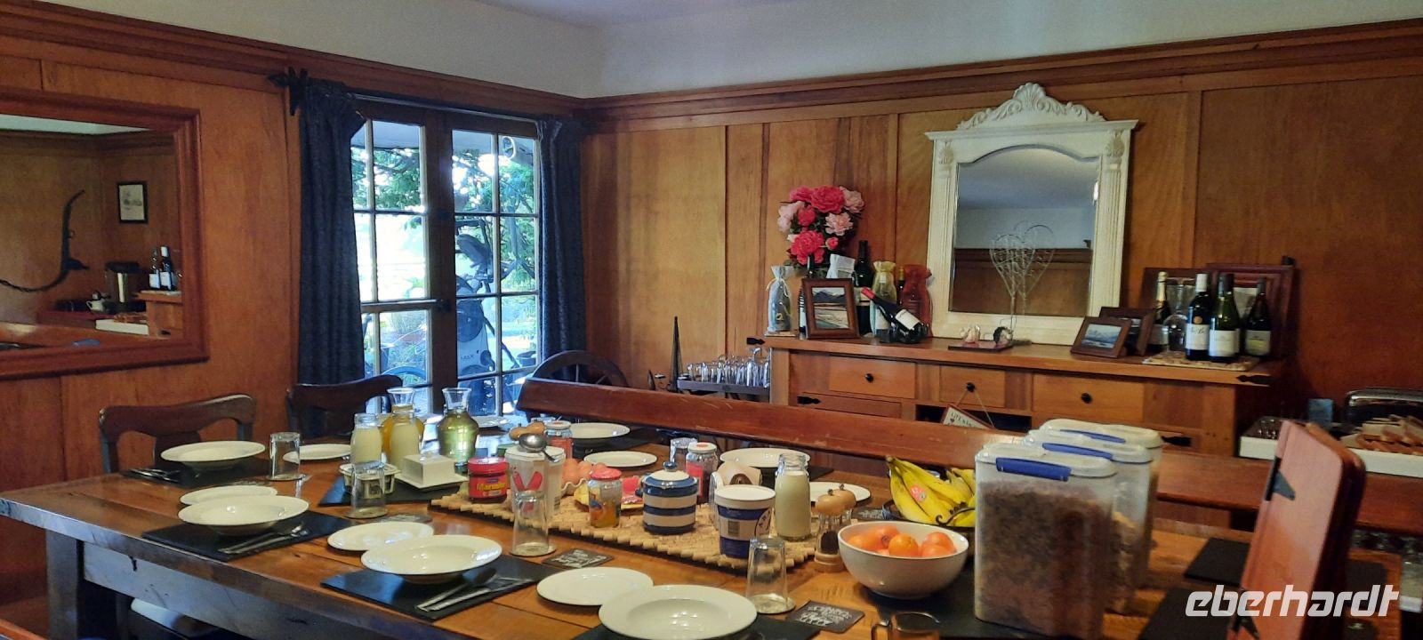 Nach einer entspannten Nachtruhe ging es an diesem Tag auch entspannt weiter. Unser Whaka hatte heute einen freien Tag, da wir maritim unterwegs sein wollten. Am hauseigenen Bootssteg des Resorts erwartete uns Kapitän Gary, der schon in der 3. Generation hier lebt. Er besitzt eine Muschelfarm, hat Wald und Land und auch mit seinem Bootscharter ist er unabdingbar für die abgelegene Region. Sein Boot Toroa (Albatross) hatten wir exklusiv für Eberhardt gechartert und es war bestens geeignet für unsere kleine Gruppe. Nach einer sehr herzlichen Begrüßung starteten wir unsere Cruise in Familie. Nach kurzer Einweisung durften einige Gäste auch mal das Steuerrad in die Hand nehmen. So schipperten wir gemütlich durch das glasklare Wasser des Kenepuru Sounds. Gary erzählte uns mit Witz und Humor viel über seine Heimat, seine Arbeit sowie die ein oder andere Anekdote, alles ganz persönlich, familiär und authentisch. Am Vormittag war es noch etwas trübe, aber später zeigte sich die Sonne wieder. Wir erspähten Robben und ganz verschiedene Arten von Kormoranen. Unterwegs zeigte uns Gary seine Muschelfarm, wo er Grünschalenmuscheln „anbaut“. Ganz klar, dass wir diese auch verkosten konnten. Während einige Gäste einen Sprung in den Sound wagten, werkelte Gary mit Bernd und Annett in der Kombüse. Das maritime Picknick mit Muscheln, Wein und anderen Snacks war genau unser Geschmack wie auch die exklusive Kreuzfahrt, die wir bis zuletzt in vollen Zügen genossen. Am Nachmittag legte die Toroa wieder am Bootssteg in Portage an und wir sagten Gary herzlich Auf Wiedersehen! Bis zum Abendessen hatten wir noch etwas Freizeit. So unternahmen wir noch eine kleine Erkundungswanderung in die Umgebung. Ein schöner Tag neigte sich dem Ende.