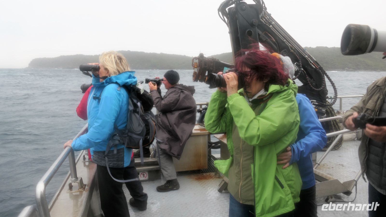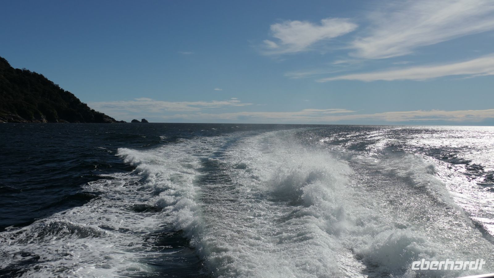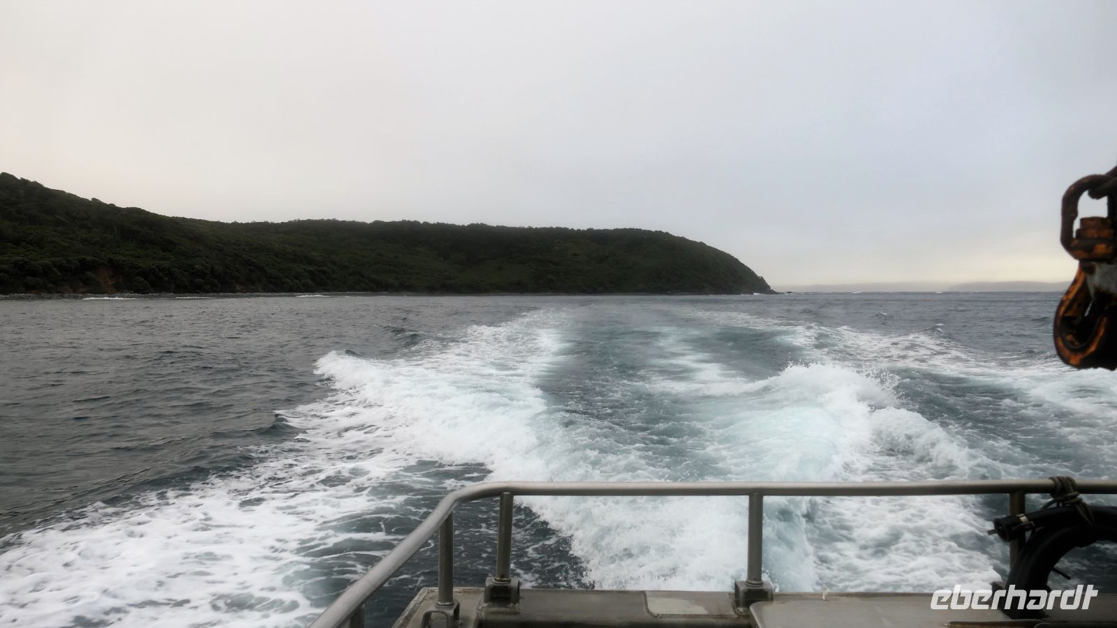 Am späten Nachmittag schipperten wir dann gemeinsam durch das Paterson Inlet. Der Wind hatte zugenommen und die stürmische Fahrt über die Wellen gleichte zunächst einer Achterbahnfahrt – eine Seefahrt, die ist lustig. Begleitet wurden wir durch das Expertenteam Brithney und Jens. Vorbei an Ulva Island nahmen wir Kurs auf kleine Inselchen und einsame Buchten der Insel. Wir sichteten Robben, Seelöwen, eine Kormoran Kolonie und sogar einen Gelbaugenpinguine in der Ferne. Auf dem vom Sturm aufgewühlten Wasser tummelten sich zwei Albatrosse. Bevor wir in der Bucht Little Glorey an Land gingen, brillierte Brithney mit ihrem Fachwissen über den hier lebenden Kiwi = Southern Brown Kiwi (Rakiura Tokoeka). Diesen wollten wir in freier Natur sehen! Kiwis sind nachtaktive Vögel. Sie sehen äußerst schlecht, hören und riechen dafür umso besser und….. können nicht wegfliegen, da sie flugunfähig sind. Die Weibchen haben den längeren Schnabel, hihi. Und weil wir gerade bei Größen sind: Sie legen die größten Eier, die bis zu 1/3 des eigenen Körpergewichtes ausmachen. Nach Sicherheitseinweisung und bewaffnet mit kleinen Taschenlampen gingen wir von Bord und stapften ganz leise auf einem schmalen Pfad, schön hintereinander durch das feuchte Dickicht des Waldes. Ganz so feucht mögen es die Kiwis nicht, also schlugen wir den Weg zum Strand ein. Dieser wurde zunächst von Brithney und Jens auf Sicherheit überprüft, denn eine überraschende Begegnung mit Seelöwen war zu riskant. Aber grünes Licht, also Strandspaziergang in der mystischen Dunkelheit. Ein paar spontane Wellen und nasse Schuhe weiter, der erste Kiwi. Genüsslich pickte dieser im Sand nach Würmchen und lies sich durch uns nicht stören. Wir gingen weiter auf Spurensuche, Kiwikrallen/Füße sind fast so groß wie eine Menschenhand. Und dann der nächste und noch einer. Wow, was hatten wir für ein Glück in dieser Nacht = Mission erfüllt! Auf dem Schiff wärmten wir uns bei einem heißen Kakao und schipperten durch die dunkle Nacht nach Orban zurück.