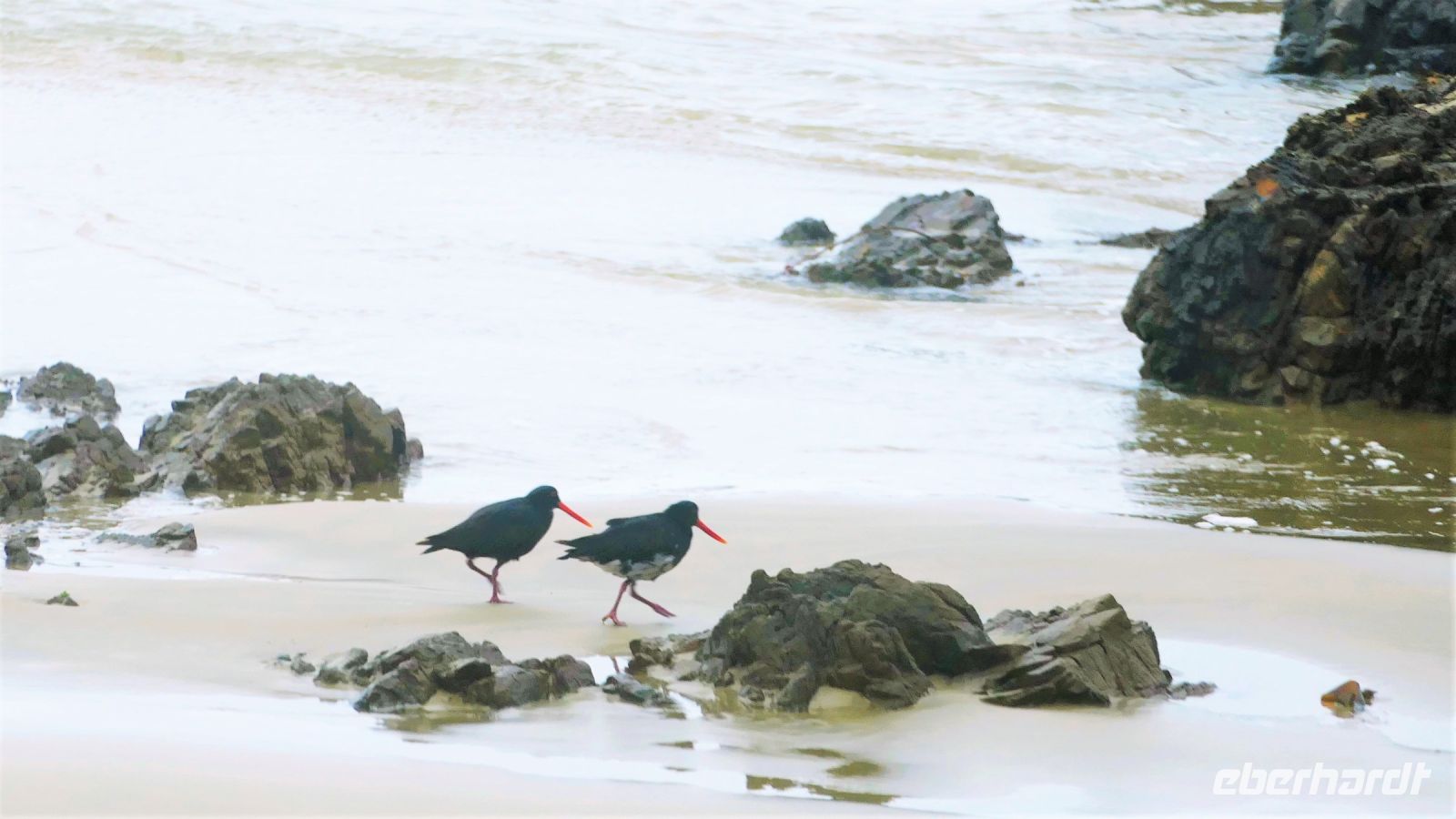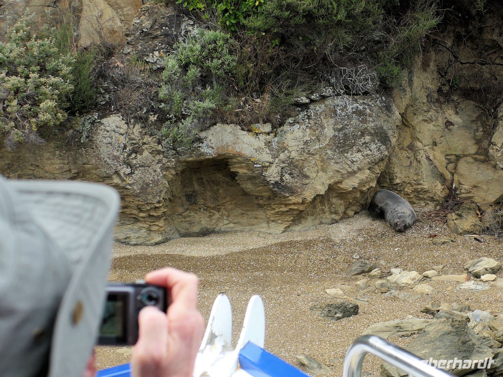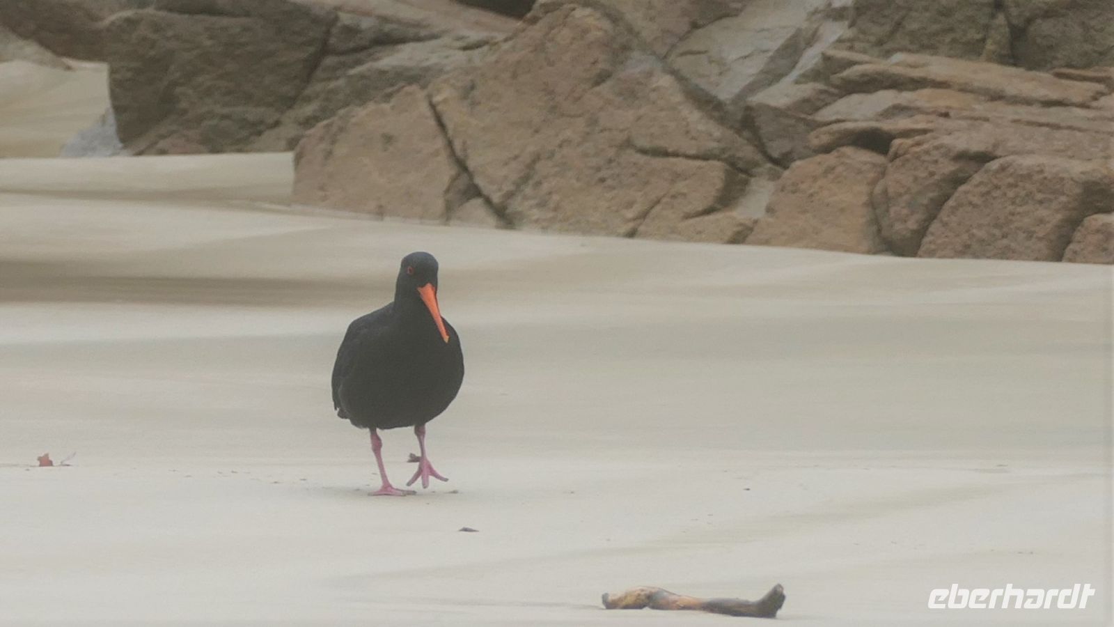 Am späten Nachmittag schipperten wir dann gemeinsam durch das Paterson Inlet. Der Wind hatte zugenommen und die stürmische Fahrt über die Wellen gleichte zunächst einer Achterbahnfahrt – eine Seefahrt, die ist lustig. Begleitet wurden wir durch das Expertenteam Brithney und Jens. Vorbei an Ulva Island nahmen wir Kurs auf kleine Inselchen und einsame Buchten der Insel. Wir sichteten Robben, Seelöwen, eine Kormoran Kolonie und sogar einen Gelbaugenpinguine in der Ferne. Auf dem vom Sturm aufgewühlten Wasser tummelten sich zwei Albatrosse. Bevor wir in der Bucht Little Glorey an Land gingen, brillierte Brithney mit ihrem Fachwissen über den hier lebenden Kiwi = Southern Brown Kiwi (Rakiura Tokoeka). Diesen wollten wir in freier Natur sehen! Kiwis sind nachtaktive Vögel. Sie sehen äußerst schlecht, hören und riechen dafür umso besser und….. können nicht wegfliegen, da sie flugunfähig sind. Die Weibchen haben den längeren Schnabel, hihi. Und weil wir gerade bei Größen sind: Sie legen die größten Eier, die bis zu 1/3 des eigenen Körpergewichtes ausmachen. Nach Sicherheitseinweisung und bewaffnet mit kleinen Taschenlampen gingen wir von Bord und stapften ganz leise auf einem schmalen Pfad, schön hintereinander durch das feuchte Dickicht des Waldes. Ganz so feucht mögen es die Kiwis nicht, also schlugen wir den Weg zum Strand ein. Dieser wurde zunächst von Brithney und Jens auf Sicherheit überprüft, denn eine überraschende Begegnung mit Seelöwen war zu riskant. Aber grünes Licht, also Strandspaziergang in der mystischen Dunkelheit. Ein paar spontane Wellen und nasse Schuhe weiter, der erste Kiwi. Genüsslich pickte dieser im Sand nach Würmchen und lies sich durch uns nicht stören. Wir gingen weiter auf Spurensuche, Kiwikrallen/Füße sind fast so groß wie eine Menschenhand. Und dann der nächste und noch einer. Wow, was hatten wir für ein Glück in dieser Nacht = Mission erfüllt! Auf dem Schiff wärmten wir uns bei einem heißen Kakao und schipperten durch die dunkle Nacht nach Orban zurück.