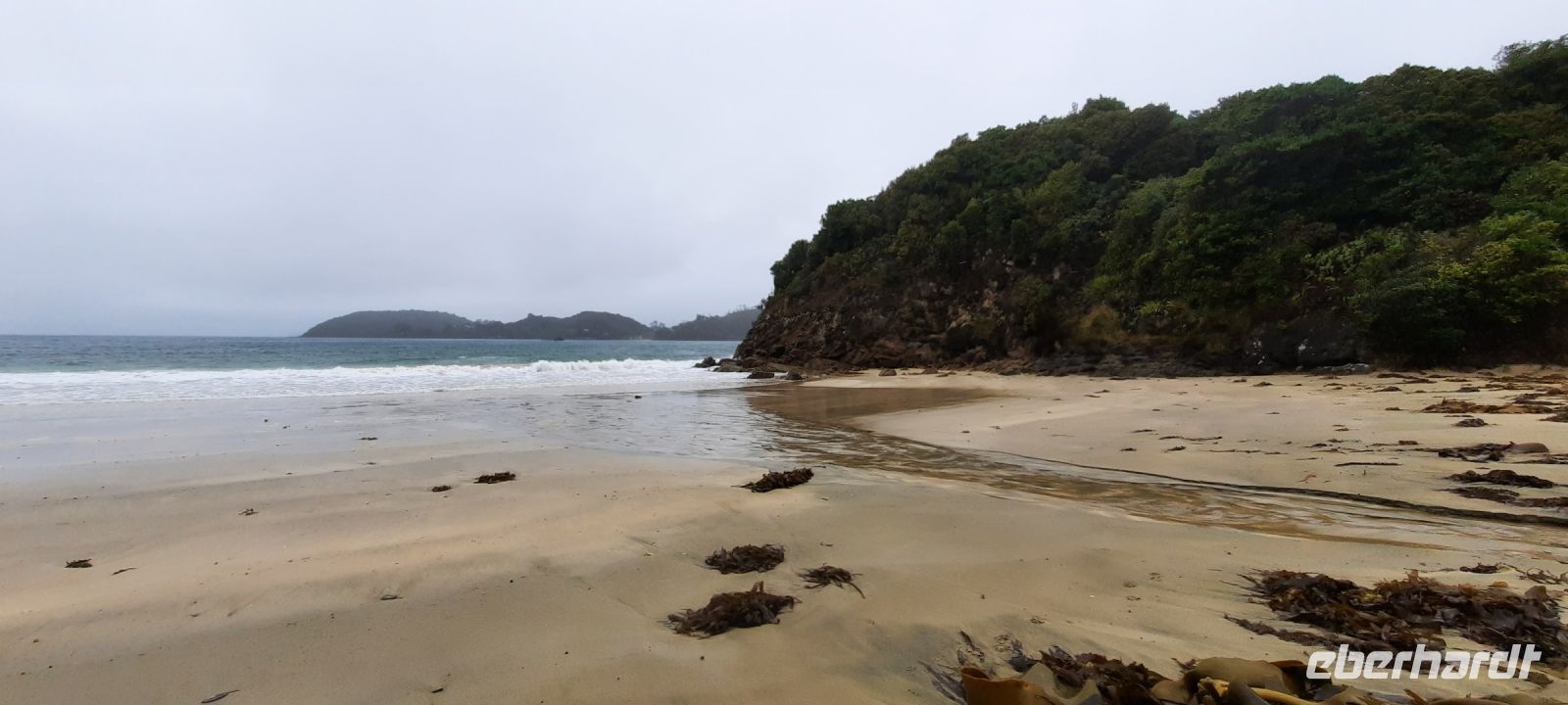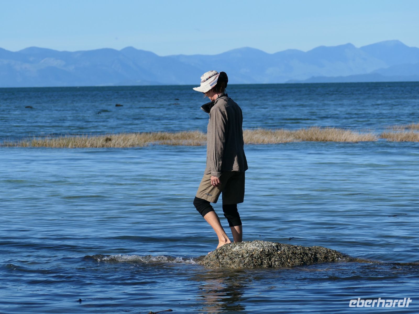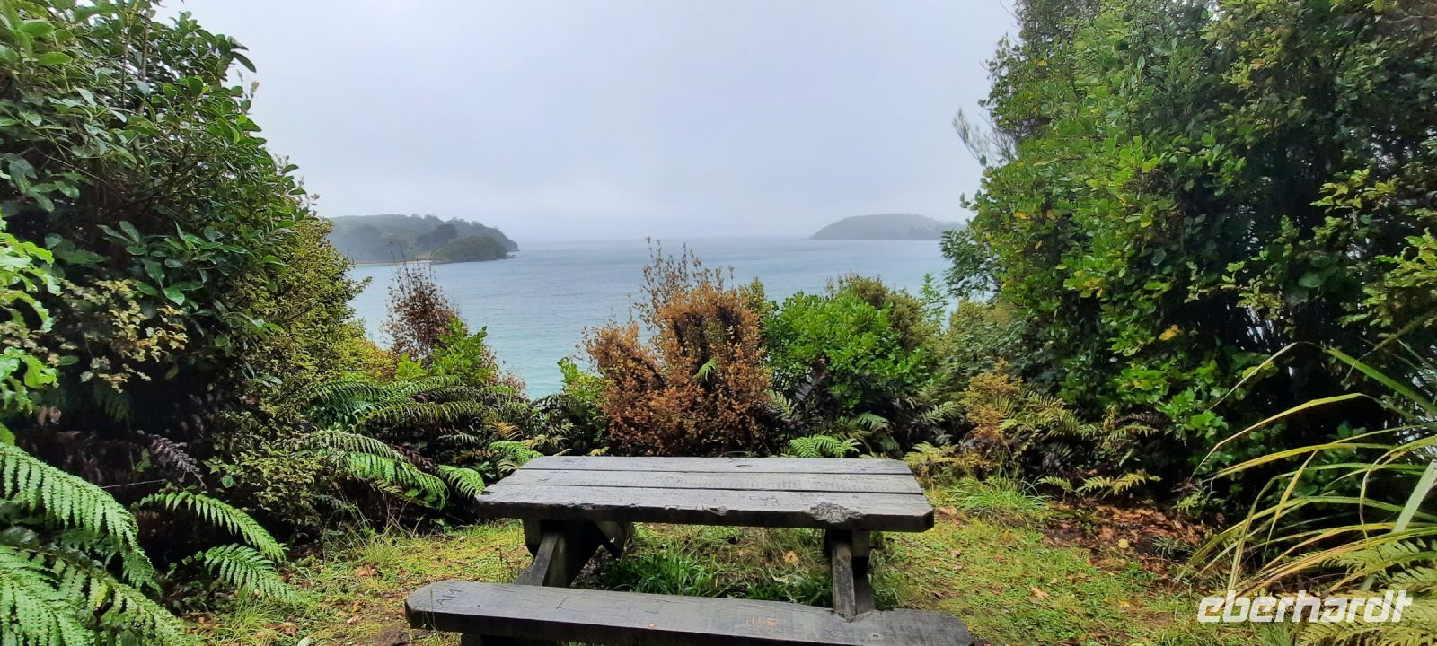 Die Sonne hatte heute Ruhetag. Die Wolken hingen tief, aber es regnete nicht. Da wir am Vormittag frei hatten, entschieden sich einige für eine kleine Wanderung zur Schmetterlings-Bucht. Unberührte Natur pur - an den Inlets (Buchten mit Meerarmen, die ins Landesinnere drängen) beobachteten wir Seidenreiher, Austernfischer und bunte Eisvögel. In den Bäumen hörten wir den Gesang der Bellbirds, die in Neuseeland endemisch sind. Es schellte überall wie Türglocken. Über den Kirchenhügel mit seiner hübschen Holzkirche liefen wir zurück. Am Mittag stand eine Exkursion nach Ulva Island auf dem Programm. Die kleine Insel im großen Paterson Inlet ist ein besonders geschütztes Gebiet für die Flora und Fauna innerhalb des Nationalparks und rattenfrei. Viele ausgestorbene Vogelarten wurden hier wieder angesiedelt, die es auf der naturkundlichen Wanderung mit Jens aufzuspüren galt. Auf dieser Exkursion wie auch bei der abendlichen Kiwi Tour ist die Anzahl der Besucher stark begrenzt und lange vorher ausgebucht. Reisebegleiterin Annett verbrachte derweil den Nachmittag mit Erkundungen der anderen Seite von Orban. Sie erwanderte den Aussichtpunkt und entdeckte die beschauliche Golden Bay.