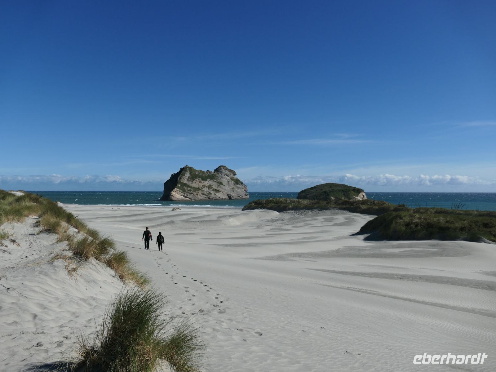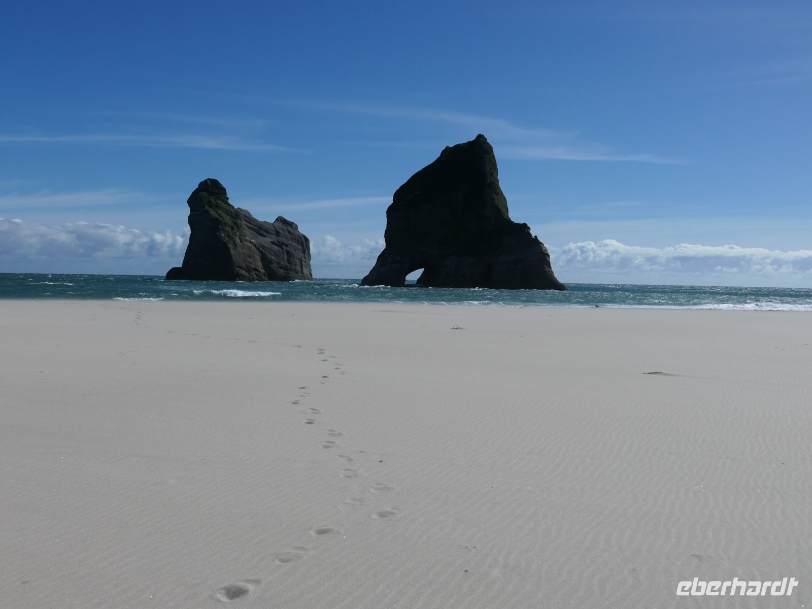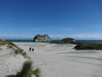 Guten Morgen - die Sonne kitzelte unsere Nasen! Wir freuten uns auf einen entspannten Tag, der etwas später als sonst begann. Entlang der Golden Bay zuckelten wir im Whaka nach Norden. Die Küsten waren breiter, es war Ebbe. Der einsame Strand am Triangl Flat lud förmlich zu einem Spaziergang ein. Von hier hatten wir eine gute Sicht auf die 25 km lange Landzunge, die sich sichelförmig nach Osten ins Meer streckt. Bernd gab uns viele naturkundliche Infos zu dieser Region, die zum Teil als professionelles Farmland (natürlich Schafe) genutzt wird. Vom Puponga Farmpark erschließt sich ein großes Wanderwegenetz. Wir entschieden uns für die entspannte Wanderung durch den Park zum Wharariki Beach. Der kleine Wanderweg schlängelte sich durch die grüne Hügellandschaft, durch den Küstenwald bis hin zum langen, einsamen Strand. WOW, was für ein traumhafter Strand. Dieser spektakuläre Küstenabschnitt mit seinen grünen Dünen, den schroffen Felswänden und der Blick auf die Archway Islands, einer skurrilen Felsformation im Wasser, zog magisch an. Zwar peitschte uns der Wind mächtig um die Ohren, aber die Sonne strahlte mit uns um die Wette. An diesem Genießertag durfte natürlich ein kleines Picknick auf dem Rückweg nicht fehlen. Am frühen Abend stand ein weiteres BBQ auf dem Programm. Mit Hilfe anderer Gäste zauberten Bernd und Annett wieder ein leckeres Buffet und Bernd schmiss den Grill an. Neben Wein aus der Region gab es dazu auch kulturelle Showeinlagen von jungen Talenten. Ein schöner Abend in gemeinsamer Runde, und wieder unterm Kreuz des Südens.