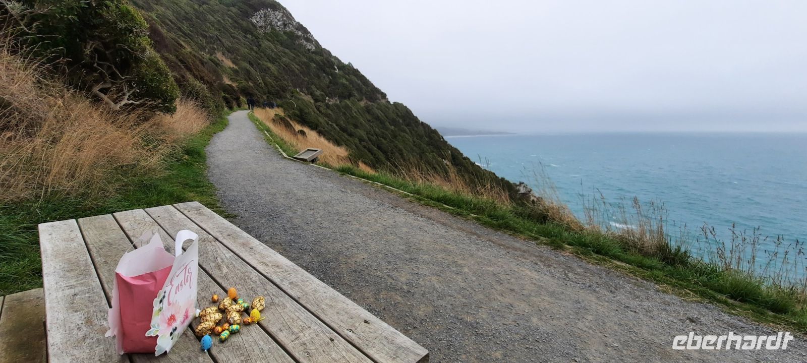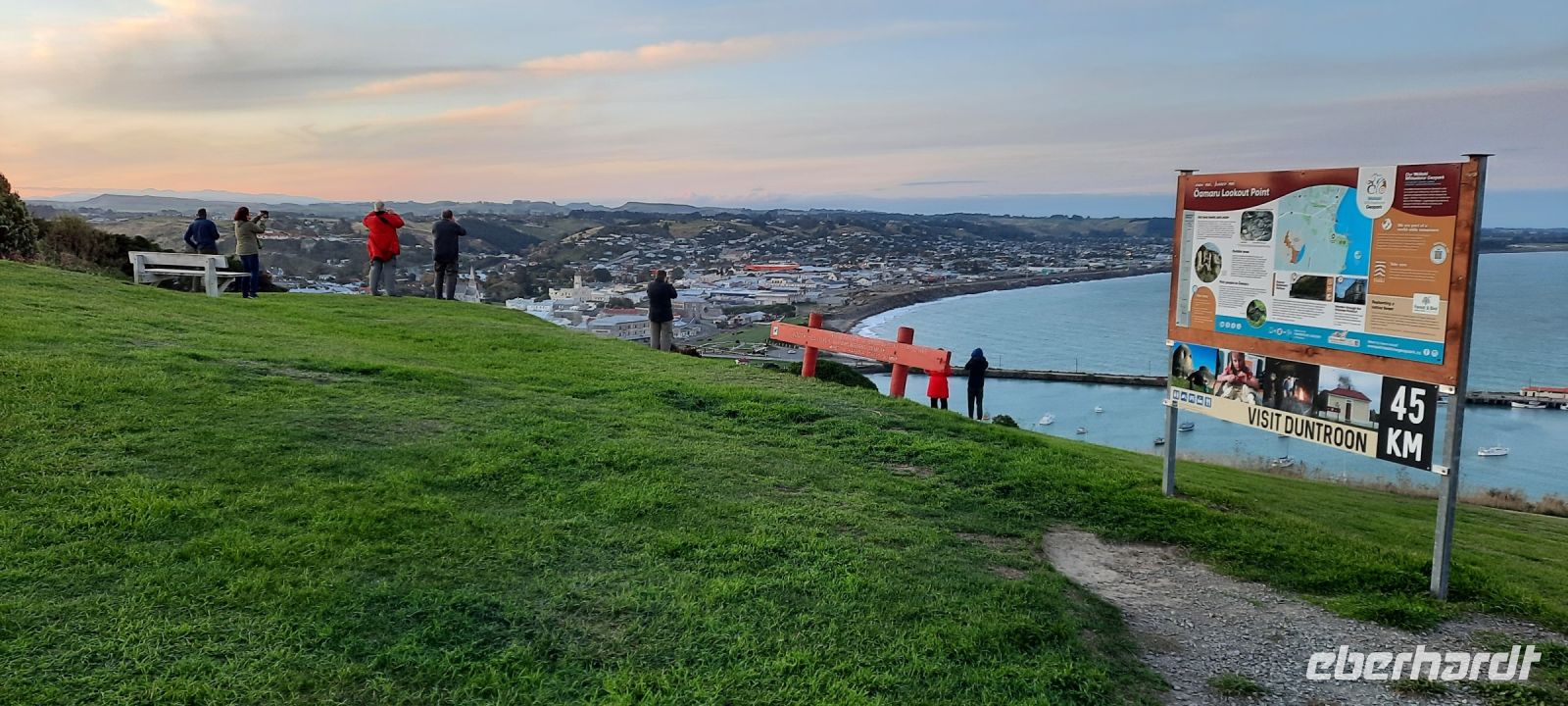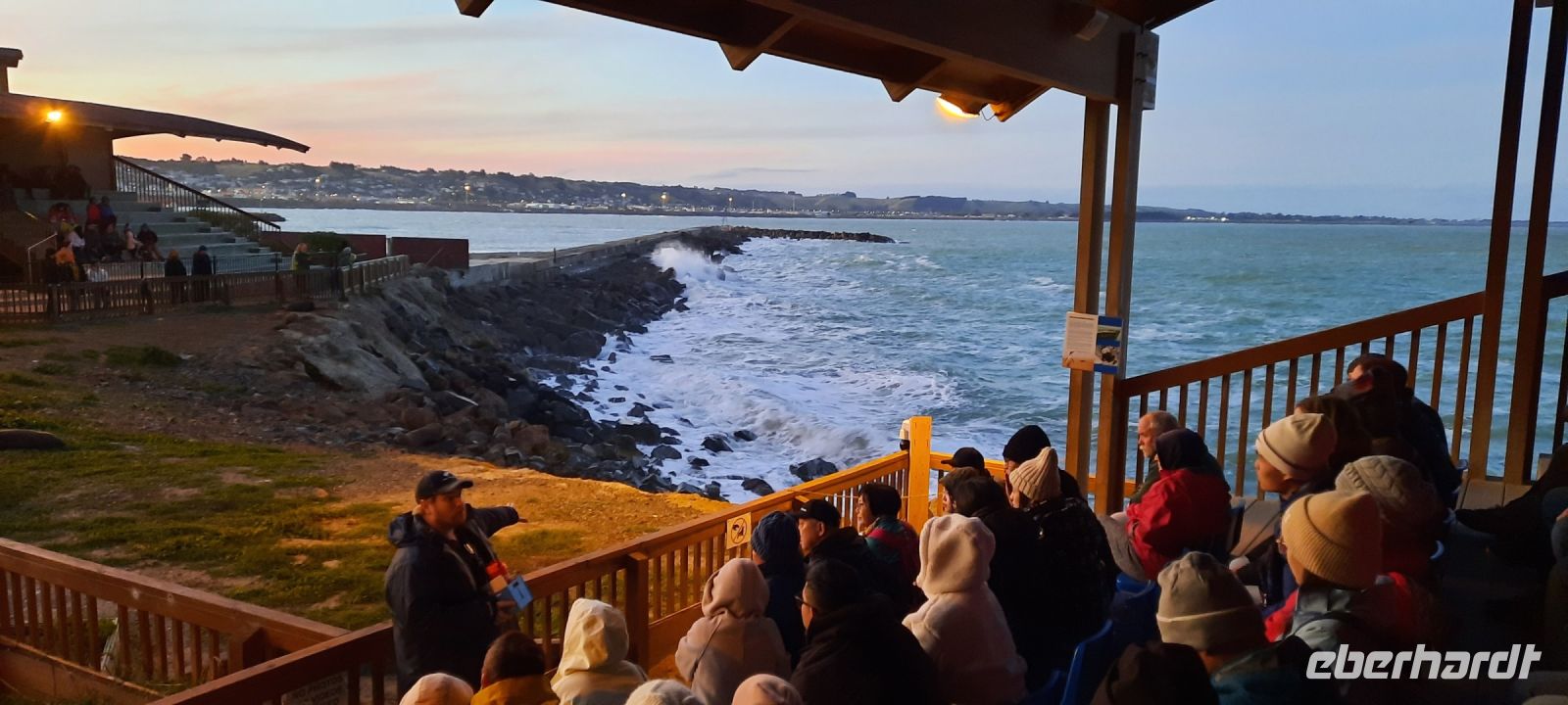 An diesem Morgen wollten wir die Gegend näher erkunden. Wir fuhren zum nahegelegenen Awa Awa Reserve, ein geschütztes Waldgebiet mit uralten, einheimischen Bäumen, unterhalb des Pudding Berges. Die Beschilderung der vielen Wanderwege war sehr verwirrend, so dass unsere morgendliche Wanderung etwas länger ausfiel. Bevor wir in unseren Sprinter einstiegen, säuberten wir unsere 7-Meilen-Stiefel. Diese kamen dann kurze Zeit später wieder zum Einsatz. Auf dem Big Tree Trail unternahmen wir einen entspannten Waldspaziergang durch den Peel Forest Park. Wir sahen riesige Eibenbäume, die Namen wie Kahikatea und Totara tragen. Entlang des Rangitata Fluss, der in den Pazifik mündet (dort wollten wir hin), rollten wir durch die Canterbury Ebene nach Oamaru am Pazifik. Unterwegs stoppten wir in Geraldine und schleckten das geliebte Hokey Pokey Eis. Am Nachmittag war unser heutiges Ziel erreicht: Oamaru am Pazifik. Nach einer Orientierungsrunde steuerten wir den nächsten Supermarkt an, um uns noch mit Kleinigkeiten vor den Osterfeierlichkeiten einzudecken. Dazu sollten frische Eier gehören, die bemalt unsere Osternester füllen sollten. Doch leider weit und breit leere Regale. Nach dem neuen Gesetz, nur Eier von glücklichen Hühner verkaufen zu dürfen, immer wieder ein Engpass! Im Motel angekommen, hatten wir etwas freie Zeit, bevor wir am späten Nachmittag den Aussichtspunkt ansteuerten und die Sonne verabschiedeten. Später hatten wir ein Date mit den kleinsten Bewohnern der Stadt, den Blue Penguins (Zwergpinguin), deren Zuhause sich in einer geschützten Bucht befindet. Tagsüber sind ihre Häuschen und Nistplätze meist verwaist, denn sie gehen auf Futtersuche in den Ozean. Aus den stürmischen Fluten und über die schroffe Felsküste kommen sie erst am Abend wieder an Land zurück. In einem abgesperrten Küstenabschnitt konnten wir das abendliche Schauspiel ganz, ganz nah bestaunen. Immer in kleinen Grüppchen watschelten die Pinguine, gesamt ca. 150, zu ihren Häuschen im Gebüsch, direkt an uns vorbei. Es war ein besonderes Erlebnis.