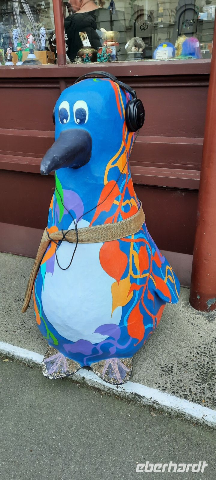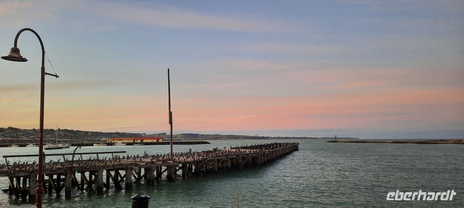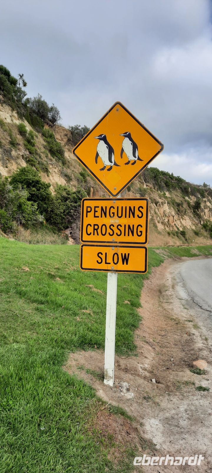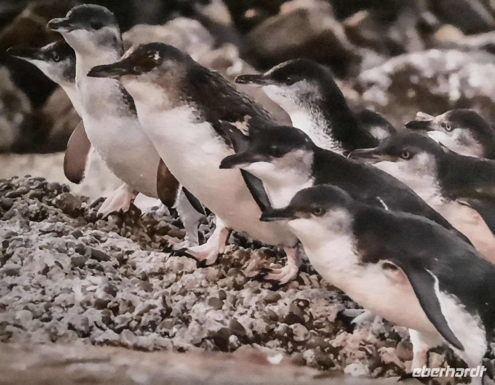An diesem Morgen wollten wir die Gegend näher erkunden. Wir fuhren zum nahegelegenen Awa Awa Reserve, ein geschütztes Waldgebiet mit uralten, einheimischen Bäumen, unterhalb des Pudding Berges. Die Beschilderung der vielen Wanderwege war sehr verwirrend, so dass unsere morgendliche Wanderung etwas länger ausfiel. Bevor wir in unseren Sprinter einstiegen, säuberten wir unsere 7-Meilen-Stiefel. Diese kamen dann kurze Zeit später wieder zum Einsatz. Auf dem Big Tree Trail unternahmen wir einen entspannten Waldspaziergang durch den Peel Forest Park. Wir sahen riesige Eibenbäume, die Namen wie Kahikatea und Totara tragen. Entlang des Rangitata Fluss, der in den Pazifik mündet (dort wollten wir hin), rollten wir durch die Canterbury Ebene nach Oamaru am Pazifik. Unterwegs stoppten wir in Geraldine und schleckten das geliebte Hokey Pokey Eis. Am Nachmittag war unser heutiges Ziel erreicht: Oamaru am Pazifik. Nach einer Orientierungsrunde steuerten wir den nächsten Supermarkt an, um uns noch mit Kleinigkeiten vor den Osterfeierlichkeiten einzudecken. Dazu sollten frische Eier gehören, die bemalt unsere Osternester füllen sollten. Doch leider weit und breit leere Regale. Nach dem neuen Gesetz, nur Eier von glücklichen Hühner verkaufen zu dürfen, immer wieder ein Engpass! Im Motel angekommen, hatten wir etwas freie Zeit, bevor wir am späten Nachmittag den Aussichtspunkt ansteuerten und die Sonne verabschiedeten. Später hatten wir ein Date mit den kleinsten Bewohnern der Stadt, den Blue Penguins (Zwergpinguin), deren Zuhause sich in einer geschützten Bucht befindet. Tagsüber sind ihre Häuschen und Nistplätze meist verwaist, denn sie gehen auf Futtersuche in den Ozean. Aus den stürmischen Fluten und über die schroffe Felsküste kommen sie erst am Abend wieder an Land zurück. In einem abgesperrten Küstenabschnitt konnten wir das abendliche Schauspiel ganz, ganz nah bestaunen. Immer in kleinen Grüppchen watschelten die Pinguine, gesamt ca. 150, zu ihren Häuschen im Gebüsch, direkt an uns vorbei. Es war ein besonderes Erlebnis.