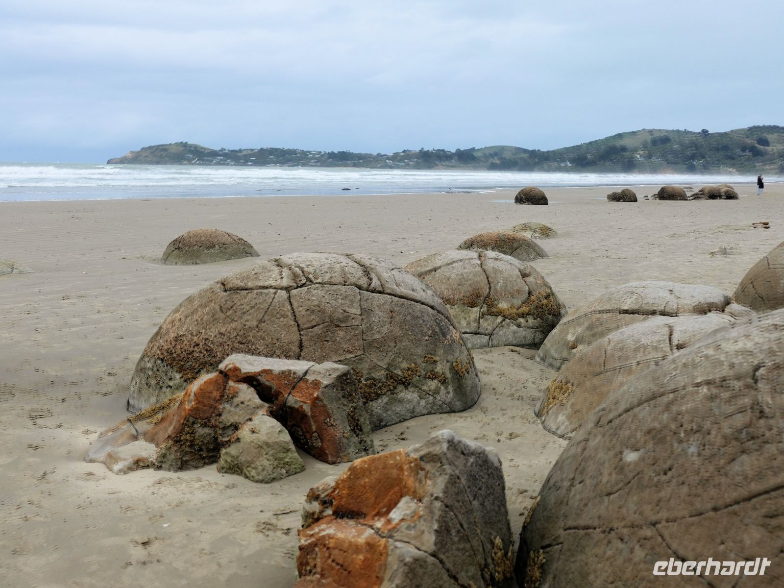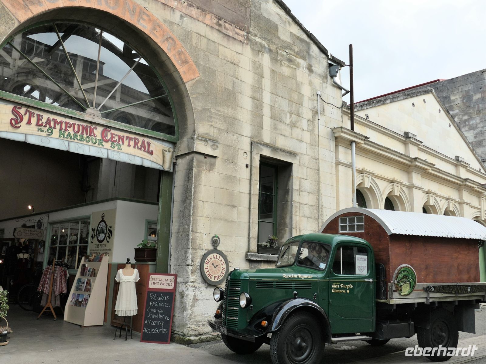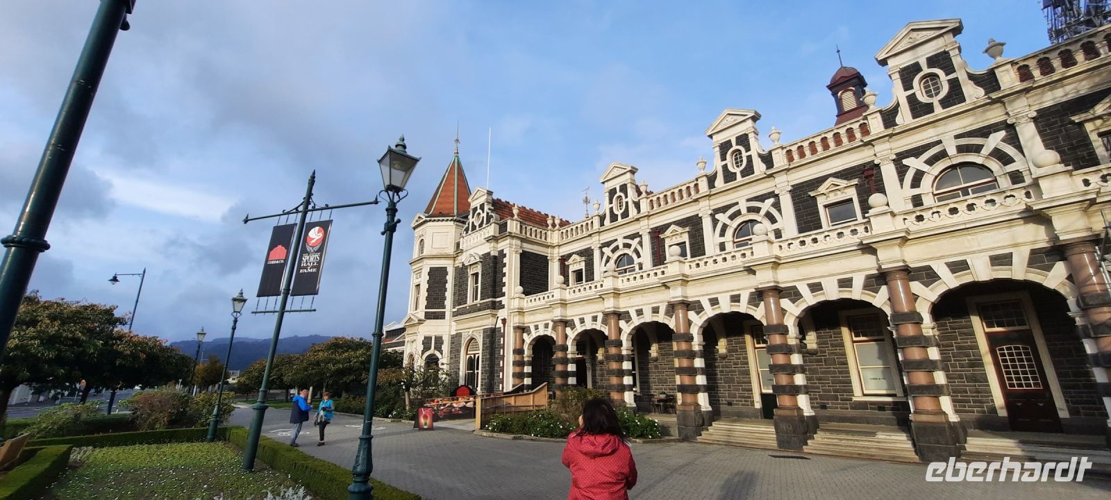 Am Ostersonntag gratulierten wir zunächst unseren zwei Geburtstagskindern. Danach entschieden wir uns, Oamaru noch etwas intensiver zu erkunden. Zunächst fuhren wir noch einmal zur Pinguin Kolonie. Auf der verwitterten, alten Seebrücke sahen wir viele Kormorane, die sich gerade ihrer Morgentoilette widmeten. Die Pinguin Kolonie (am Tag freier Eintritt) war verwaist, nur noch ein kleines Wuschel versteckte sich in seinem Häuschen. Dafür fühlte sich die Seelöwen auf den Klippen sichtlich wohl. Tut, Tut…. Schnaufend kam uns die alte Dampfeisenbahn entgegen, zwischen Stadtzentrum und Pinguin Kolonie pendelt. Nostalgie verspürten wir später auch im historischen Zentrum der Stadt. Ende des 19. Jhd. sorgten Goldminen und Holzindustrie für Reichtum. Das Geld wurde in elegante Häuser aus einheimischen, weißen Sandstein investiert. Deshalb wird Oamaru als weiße Stadt bezeichnet. Besonders das restaurierte, viktorianische Viertel mit der Harbour Street war für uns sehr verlockend. Kunst und Kitsch überall! Unweit entfernt befindet sich ein Strand, an dem mysteriöse Kugeln verteilt sind - die berühmten Moeraki Boulders. Die riesigen Felskugeln wiegen mehrere Tonnen, manche sogar bis 2 m Durchmesser. Am Strand herrschte Hochbetrieb. Viele hatten die gleiche Idee wie wir: Osterspaziergang am Strand mit den mächtigen Ostereiern. Entlang der Küstenstraße ging es nach Dunedin weiter. Die Schottenstadt ließen wir zunächst links liegen und fuhren auf die Halbinsel Otago, dem Mekka der Albatrosse. Das Wetter war etwas trüb und stürmisch, beste Bedingungen für die Albatrosse, deren Flügelspannweiten von über 3 m von keiner anderen Vogelart übertroffen werden. Mit fast 12 kg gehören sie zu den schwersten flugfähigen Vögeln und brauchen kräftigen Wind, um abzuheben. Einmal in den Lüften schweben sie wie Segelflugzeuge am Himmel, manchmal mehrere 100 km ohne einen einzigen Flügelschlag. Gegenwind treibt sie nach oben, bei Rückenwind geht es in den Sinkflug. Sie sind zudem auch sehr gute Schwimmer. Während einer Führung im Royal Albatross Centre erhielten wir einen interessanten Einblick in die Lebensweise dieser majestätischen Vögel. Vom verglasten Observatorium blickten wir auf die riesige Brutkolonie, die schon etwas verwaist war. 4 Nester waren noch mit flauschigen Nachwuchs besetzt, die schon einige Wochen alt waren. Groß und dick genug, um schon mal mehrere Tage ohne elterliche Aufsicht zu verbringen. Wir erfuhren, dass nur ca. 30 % das erste Jahr überleben. Nach dieser Exkursion fuhren wir nach Dunedin zurück. Der Name typisch schottisch-gällisch, Edinburgh – einstmals die reichste Stadt Neuseelands. Der im Stil flämischer Renaissance erbaute Bahnhof zeigt diesen Glanz vergangener Zeiten noch heute. Am Abend schlemmten wir beim Italiener. Unsere Festtafel platze aus allen Nähten. Antipasti, Salate, Pizza, Pasta & Süßes in verschiedenen Variationen wurden aufgetafelt. Nach dieser leckeren Brasserei war ein Verdauungsspaziergang fällig.