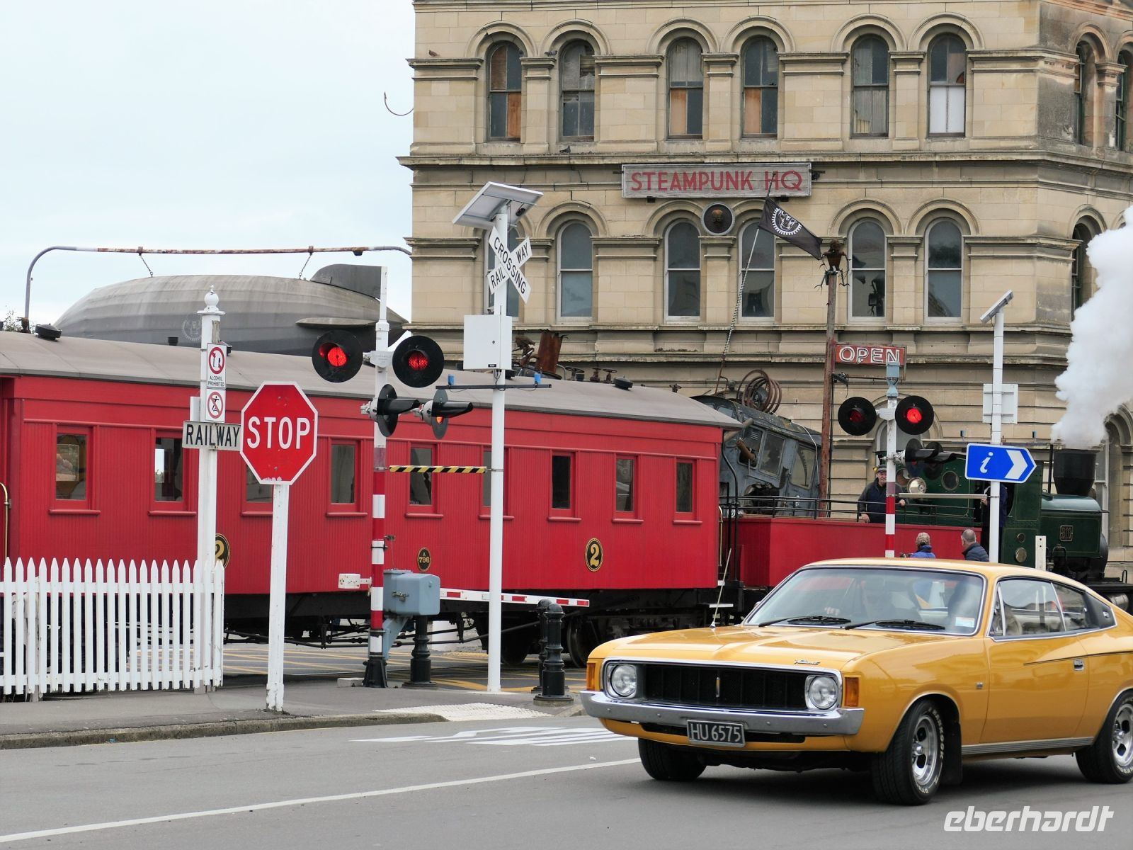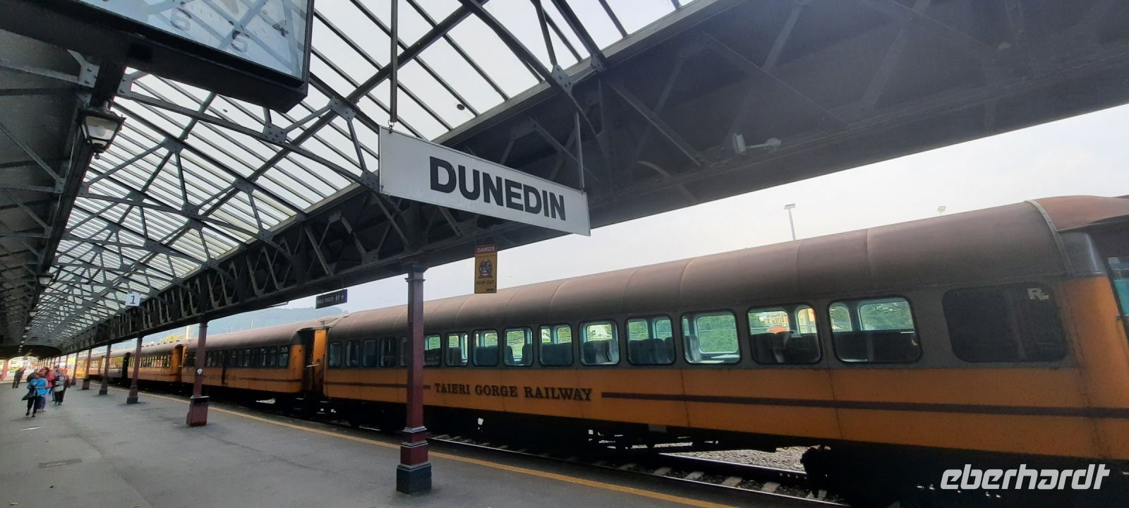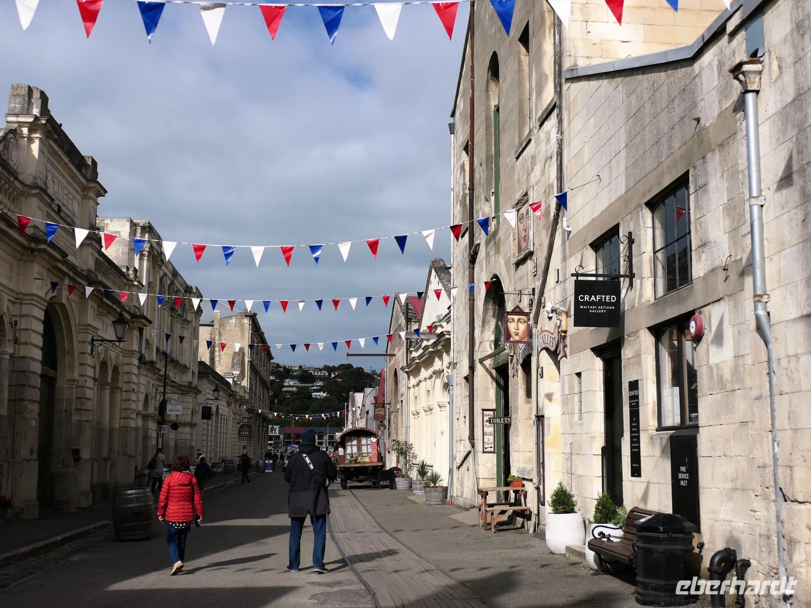 Am Ostersonntag gratulierten wir zunächst unseren zwei Geburtstagskindern. Danach entschieden wir uns, Oamaru noch etwas intensiver zu erkunden. Zunächst fuhren wir noch einmal zur Pinguin Kolonie. Auf der verwitterten, alten Seebrücke sahen wir viele Kormorane, die sich gerade ihrer Morgentoilette widmeten. Die Pinguin Kolonie (am Tag freier Eintritt) war verwaist, nur noch ein kleines Wuschel versteckte sich in seinem Häuschen. Dafür fühlte sich die Seelöwen auf den Klippen sichtlich wohl. Tut, Tut…. Schnaufend kam uns die alte Dampfeisenbahn entgegen, zwischen Stadtzentrum und Pinguin Kolonie pendelt. Nostalgie verspürten wir später auch im historischen Zentrum der Stadt. Ende des 19. Jhd. sorgten Goldminen und Holzindustrie für Reichtum. Das Geld wurde in elegante Häuser aus einheimischen, weißen Sandstein investiert. Deshalb wird Oamaru als weiße Stadt bezeichnet. Besonders das restaurierte, viktorianische Viertel mit der Harbour Street war für uns sehr verlockend. Kunst und Kitsch überall! Unweit entfernt befindet sich ein Strand, an dem mysteriöse Kugeln verteilt sind - die berühmten Moeraki Boulders. Die riesigen Felskugeln wiegen mehrere Tonnen, manche sogar bis 2 m Durchmesser. Am Strand herrschte Hochbetrieb. Viele hatten die gleiche Idee wie wir: Osterspaziergang am Strand mit den mächtigen Ostereiern. Entlang der Küstenstraße ging es nach Dunedin weiter. Die Schottenstadt ließen wir zunächst links liegen und fuhren auf die Halbinsel Otago, dem Mekka der Albatrosse. Das Wetter war etwas trüb und stürmisch, beste Bedingungen für die Albatrosse, deren Flügelspannweiten von über 3 m von keiner anderen Vogelart übertroffen werden. Mit fast 12 kg gehören sie zu den schwersten flugfähigen Vögeln und brauchen kräftigen Wind, um abzuheben. Einmal in den Lüften schweben sie wie Segelflugzeuge am Himmel, manchmal mehrere 100 km ohne einen einzigen Flügelschlag. Gegenwind treibt sie nach oben, bei Rückenwind geht es in den Sinkflug. Sie sind zudem auch sehr gute Schwimmer. Während einer Führung im Royal Albatross Centre erhielten wir einen interessanten Einblick in die Lebensweise dieser majestätischen Vögel. Vom verglasten Observatorium blickten wir auf die riesige Brutkolonie, die schon etwas verwaist war. 4 Nester waren noch mit flauschigen Nachwuchs besetzt, die schon einige Wochen alt waren. Groß und dick genug, um schon mal mehrere Tage ohne elterliche Aufsicht zu verbringen. Wir erfuhren, dass nur ca. 30 % das erste Jahr überleben. Nach dieser Exkursion fuhren wir nach Dunedin zurück. Der Name typisch schottisch-gällisch, Edinburgh – einstmals die reichste Stadt Neuseelands. Der im Stil flämischer Renaissance erbaute Bahnhof zeigt diesen Glanz vergangener Zeiten noch heute. Am Abend schlemmten wir beim Italiener. Unsere Festtafel platze aus allen Nähten. Antipasti, Salate, Pizza, Pasta & Süßes in verschiedenen Variationen wurden aufgetafelt. Nach dieser leckeren Brasserei war ein Verdauungsspaziergang fällig.