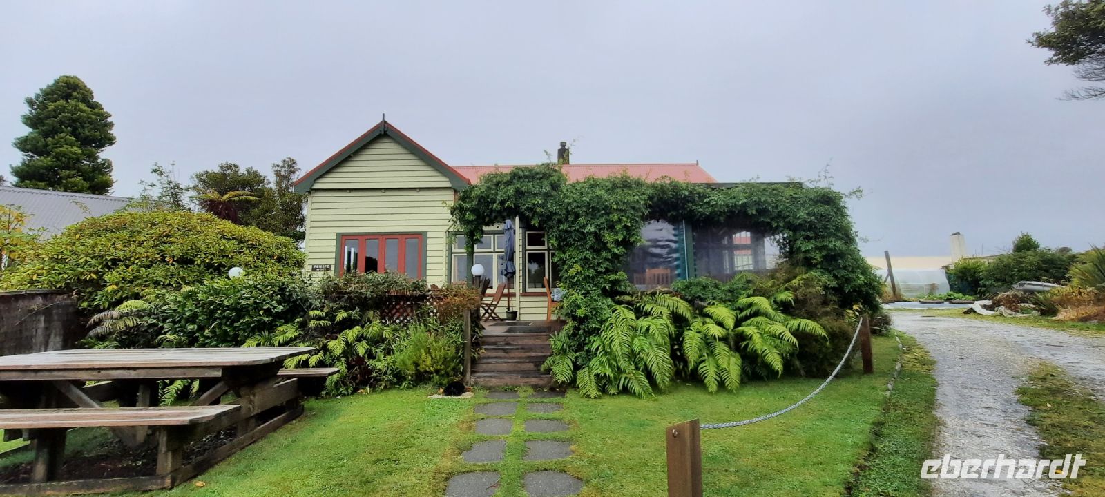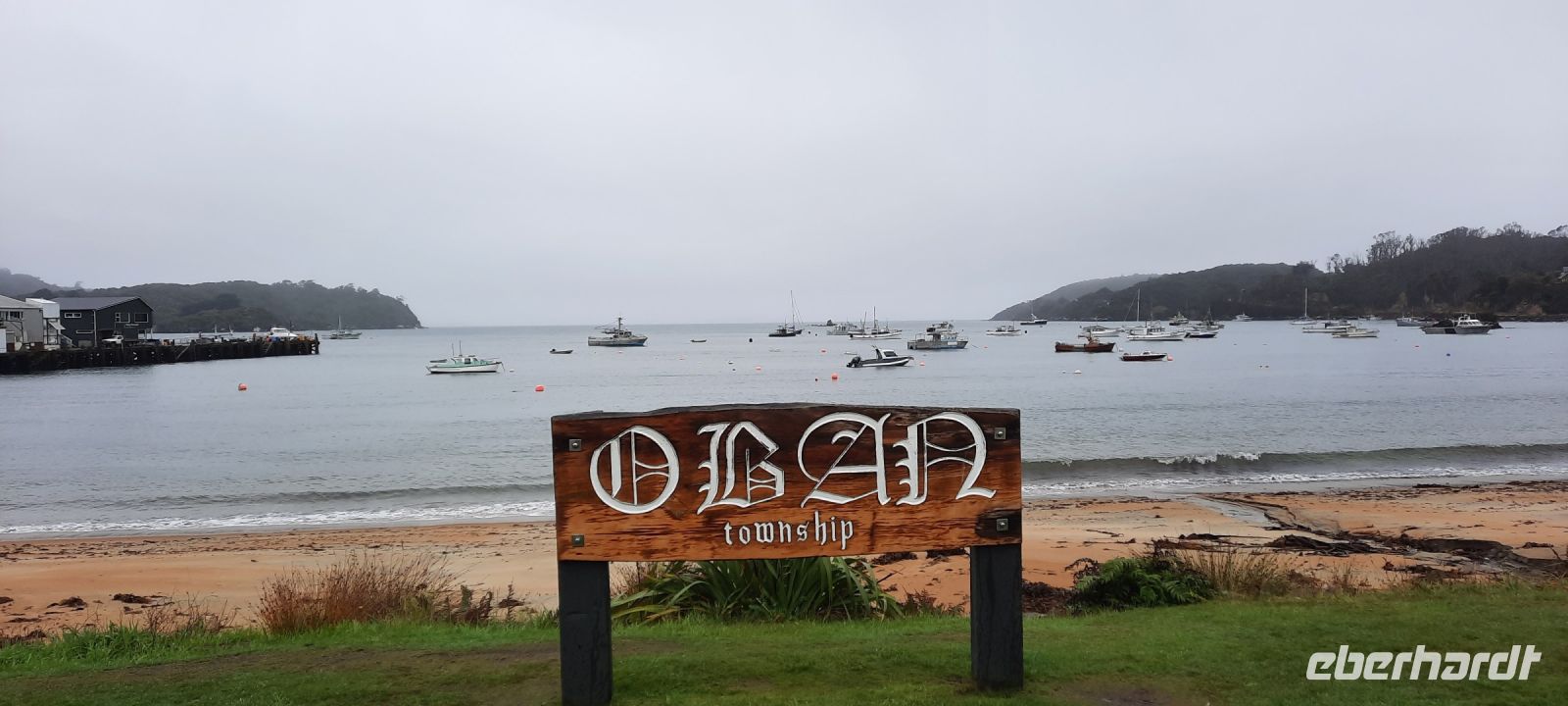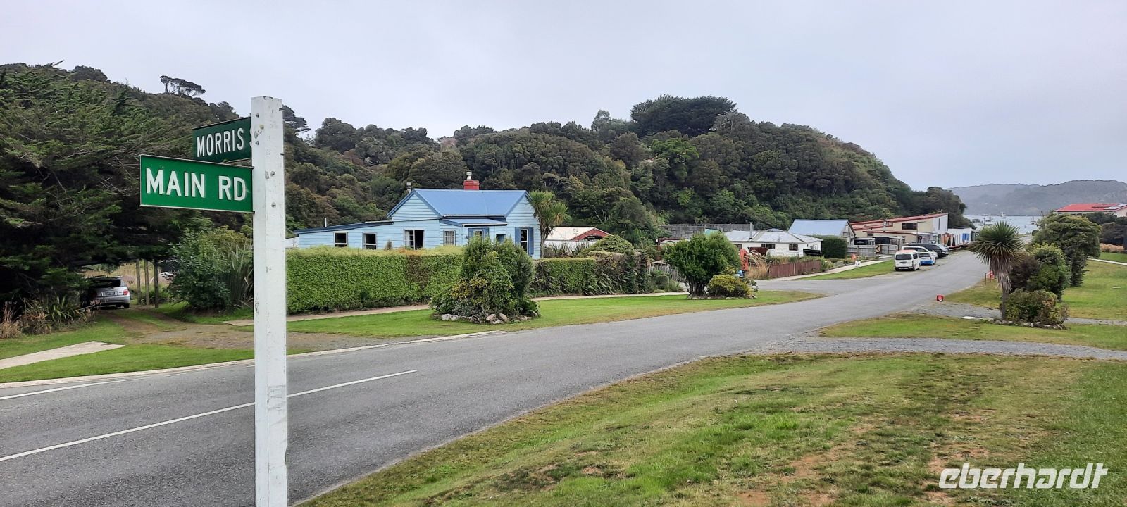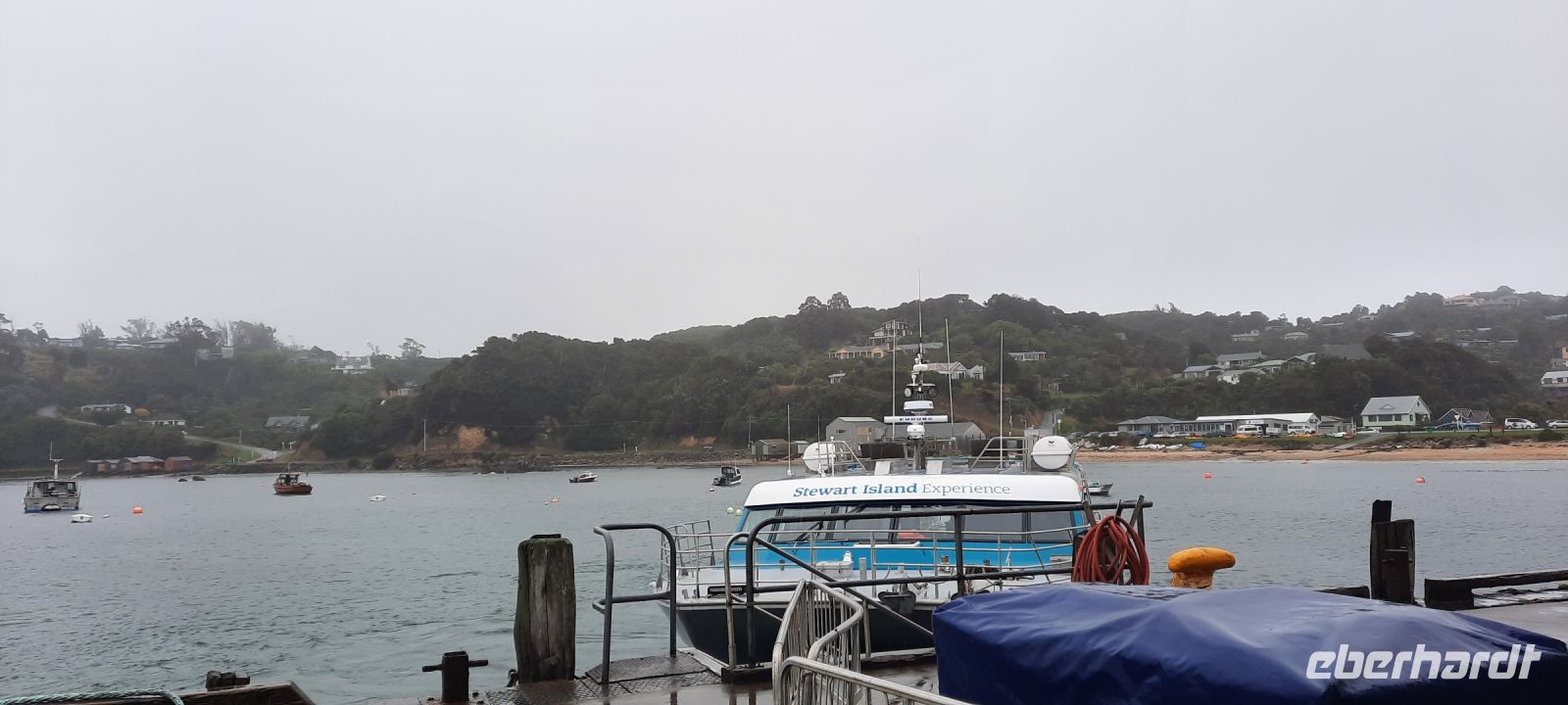 Wir durchquerten Balclutha, mit Beinamen The Big River Town. Kein Wunder, denn der wasserreichste Fluss Neuseelands, der Clutha fließt durch die Stadt. Später truckten wir an der stürmisch-nebligen Pazifikküste entlang. Auf einer steilen Langzunge unternahmen wir unseren Osterspaziergang zum Nugget Point. Vom Leuchtturm blickte wir auf die schroffe, wildromantische Küste. Im beschaulichen Owaka war die Welt noch in bester Ordnung: Zutritt zum kleinen Supermarkt nur mit sauberen Schuhen! Was uns in Neuseeland, selbst den winzigsten Ortschaften immer wieder auffiel: die Sauberkeit der öffentlichen Anlagen wie kostenfreie Toiletten, coole Spielplätze und Parks sowie Elektrotankstellen. In Invercargill, dem fast südlichsten Ende der Südinsel parkten wir unser Whaka (mit den Koffern) am Flughafen und reisten mit leichtem Gepäck weiter. In 2 Kleinflugzeugen flogen wir ca. 20 min (ca. 35 km) nach Stewart Island und landeten sicher auf dem kleinen Airstrip in Oban. Stewart Island ist die drittgrößte Insel Neuseelands und ein wahres Naturparadies. Ca. 85 % der Insel stehen unter besonderen Schutz des Rakiura Nationalparks. Oban ist der einzige, richtig bewohnte Ort auf den ca. 1.680 km². Das Bay Motel mit Blick auf den kleinen Hafen der Halbmond Bucht war unser Zuhause für die nächsten beiden Nächte. Am frühen Abend bummelten wir über die „Mainroad“ zum Hafen und verschafften uns einen Überblick über das verschlafene Oban: ein paar kleine Cafès und Shops, ein gut bestückter Supermarkt, ein Hotel mit Pub, ein Museum und wir.