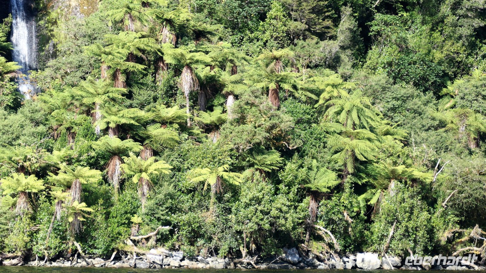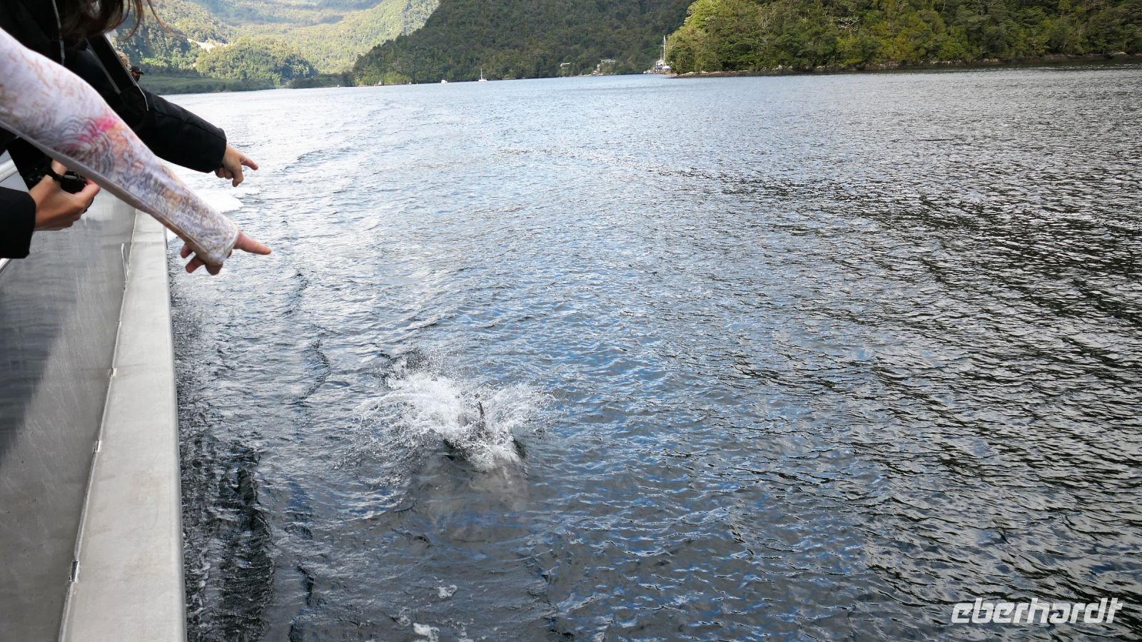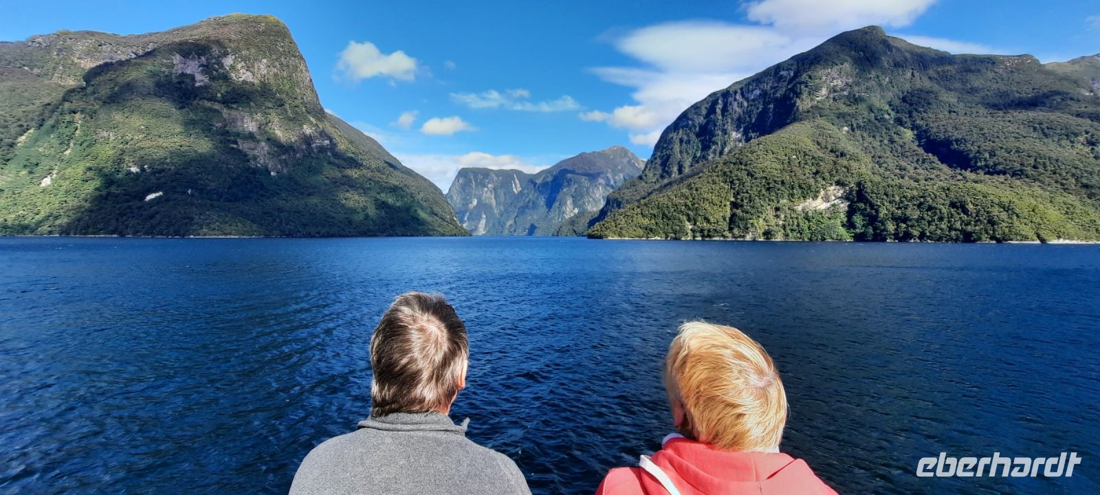 Früh war es noch etwas frisch, aber schon bald zeigte sich Frau Sonne. Ein wundervoller Tag stand bevor. Mit unserem Whaka fuhren zum Bootsableger ins nahe Manapouri und verstauten unsere Lunchpakete in den Rucksäcken. Wir freuten uns auf den maritimen Ausflug. Nicht ohne Grund gehört das Fiordland zum Weltnaturerbe der UNESCO und so kommt kaum ein Besucher an den Fjorden Neuseelands vorbei. Insgesamt ist der Südwesten Neuseelands von 15 schmalen Fjorden durchfurcht, an deren steilen Ufern sich gewaltige Berge erheben. Über Jahrmillionen haben Gletscher diese einzigartige Landschaft geformt. In dieser schwer zugänglichen Gegend findet sich wirklich noch unberührte Natur mit üppig grünem Regenwald. Dank der vielen Niederschläge an der Westküste rauschen unzählige Wasserfälle über Klippen und Kaskaden in die tiefen schwarzen Fjorde. Viele Touristen bevorzugen immer den bekannten Milford Sound, aber wir wollten den unberührten Doubtful Sound erkunden. Pünktlich startete unser Schiff und schipperte uns quer über den Lake Manapouri, den zweittiefsten See in Neuseeland (444 m). Eine wundervolle Landschaft zog an uns vorbei, stahlblauer Himmel, weiße Wolken und tiefblaues Wasser. Wir waren jetzt schon begeistert. Am westlichen Ende des Sees befindet sich ein spektakuläres Wasserkraftwerk, tief unten im See, kaum sichtbar. Durch 10 km langes, unterirdisches Rohrsystem, betrieben mit 7 Tubinen fließen die Wassermassen vertikal in den tiefer gelegenen Doubtful Sound ab. Hier stiegen wir in Busse um. Unsere Chauffeure manövrierten die Busse über eine abgelegene, kurvige Trasse durch uralten Regenwald. Am Wilmot Pass hatten einen ersten beeindruckenden Blick auf den, von Bergen umringten Doubtful Sound. Am kleinen Deep Crove Terminal stand unser Expeditions-Katamaran für die anschließende mehrstündige Kreuzfahrt durch den Doubtful Sound bereit. An Bord genossen wir die einzigartige Landschaft im Sound der Stille, so wird der Doubtful Sound auch genannt. Er erstreckt sich ca. 40 km bis zur Tasmanischen See. Rechts und links umringt von gigantischen Bergen (bis 2.700 m), die von grüner Vegetation (Regenwald) bedeckt ist. Viele Wasserfälle bahnten sich ihren Weg nach unten. Kein Wunder, diese Region gehört zu den regenreichsten Gebieten der Welt. Anfangs wurden wir von 2 Tümmlern begleitet, die sich um unsere Aufmerksamkeit bemühten. Später genossen wir die atemberaubende Landschaft in vollen Zügen. Wir strahlten mit der Sonne um die Wette. Ein Nature Guide moderierte live und man spürte seine innige Verbundenheit zu dieser Region. Vorbei am Blanket Bay Hotel, ehemals Zwischenlager der Krebs- und Grayfish-Fischer, gelangten wir zur Tasmanischen See. Auf den felsigen Shelter Islands tummelten sich Pelzrobben. Später erkundeten wir die Nebenarme des Sounds. In der Hall Crove zollten wir dieser einzigartigen Landschaft Respekt. Stillschweigend standen wir an Deck, genossen ehrfürchtig das umwerfende Panorama und lauschten den Klängen der Natur. Ein WOW Moment, der bei vielen Gänsehaut erzeugte – denn nicht jeder hat das Privileg an solchen versteckten, wundervollen Orten auf unserem Blauen Planten zu verweilen. Am späten Nachmittag waren wir in Te Anau zurück und ließen den Geniessertag besinnlich ausklingen.