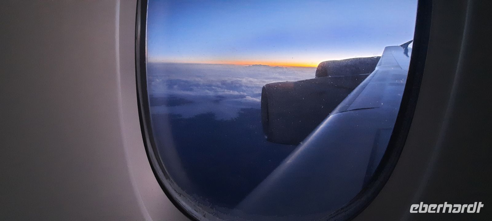 Nur wenige Wochen zuvor fegte ein massiver Tropensturm über die Nordinsel Neuseelands und anschließender Starkregen überschwemmte viele Regionen, besonders die Ostküste war betroffen. Konnte unsere langersehnte Reise stattfinden? Zwar musste der Reiseablauf noch kurzfristig etwas verändert werden, da einige Straßen noch nicht passierbar waren, aber die Reise konnte beginnen! Morgens vor 10 Uhr in Deutschland oder besser Frankfurt Airport. Am Boarding Gate trafen sich 13 gutgelaunte Gäste und Reisebegleitung Annett. Der Anreise-Marathon nach Neuseeland startete endlich. Über 18.000 km per Flugzeug lagen vor uns. Am Mittag erhob sich unsere Maschine in den Himmel.