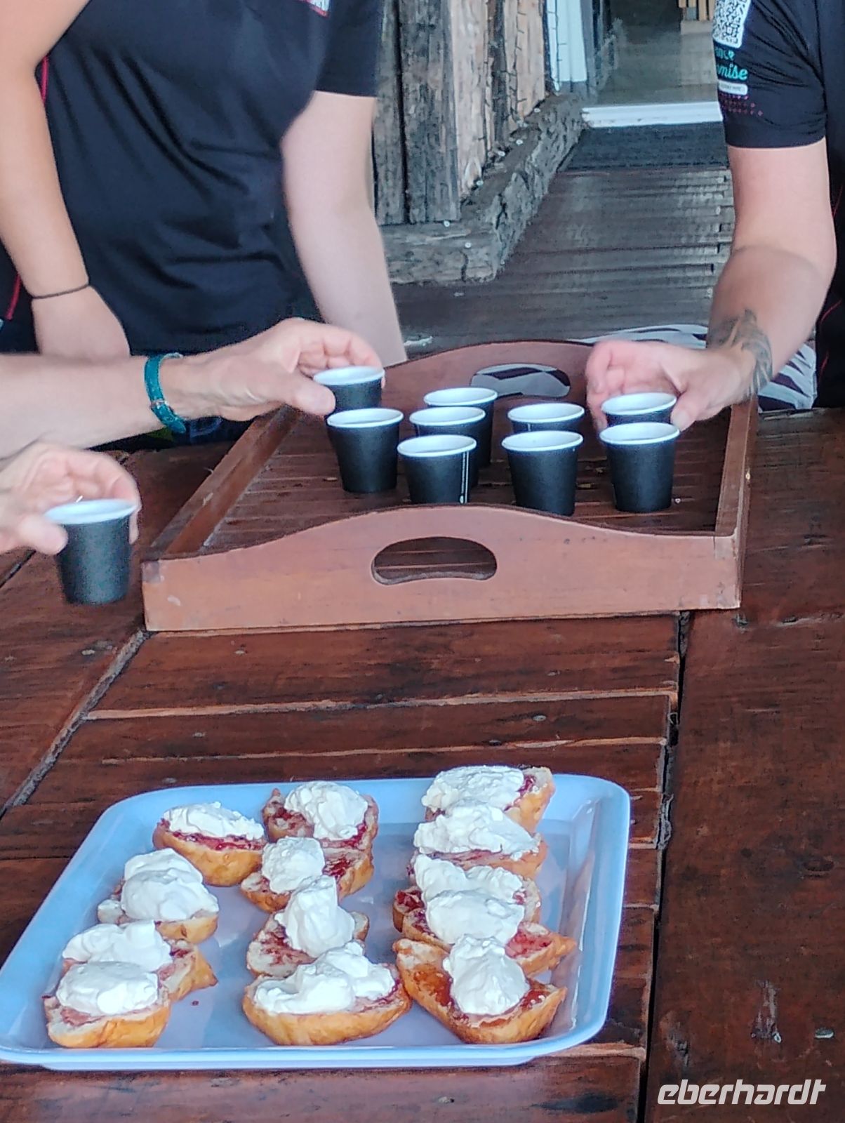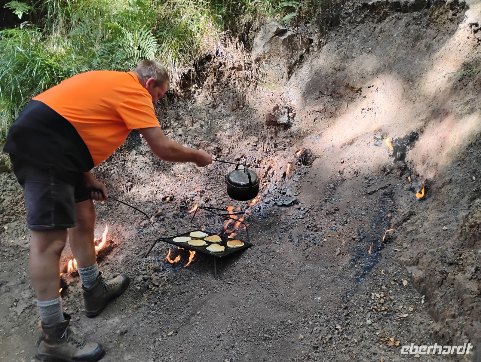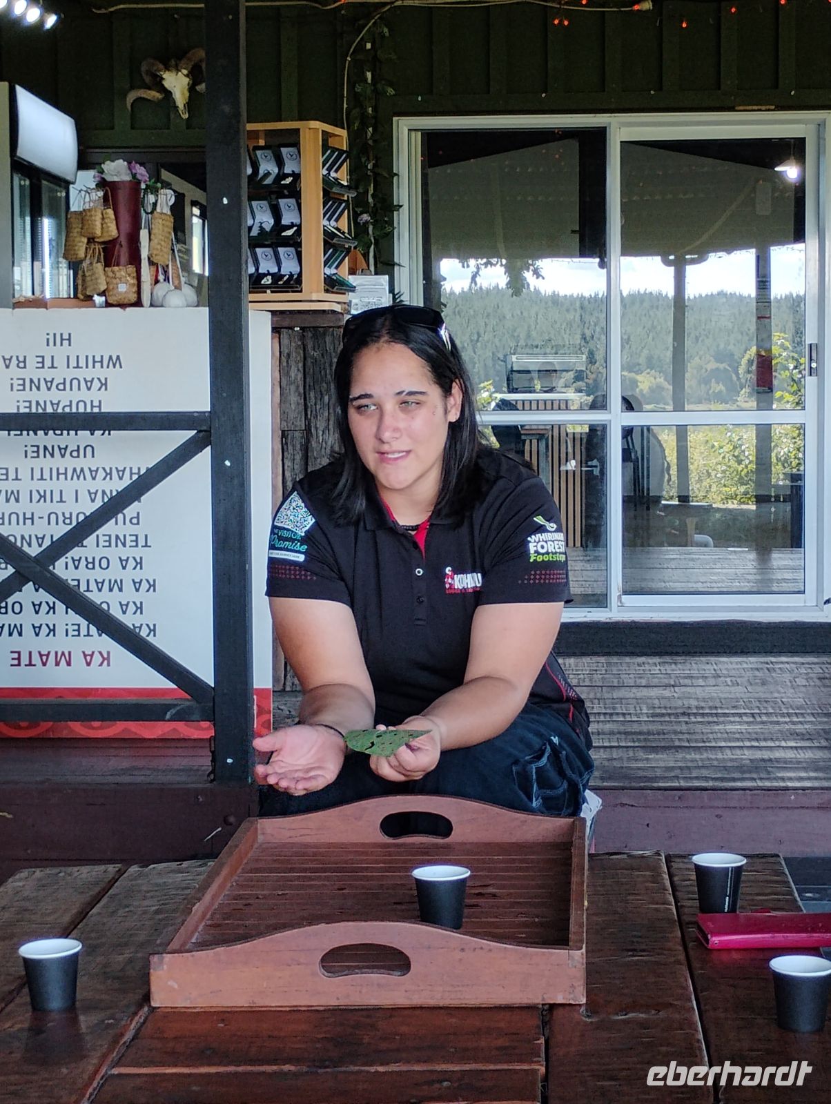Auch die Kawakawa-Pflanze lernen wir kennen. Aus ihren Blättern wird ein Tee zubereitet, dem eine wohltuende und heilende Wirkung nachgesagt wird. Natürlich probieren wir ihn auch, zu frittiertem Brot mit Marmelade und Schlagsahne.