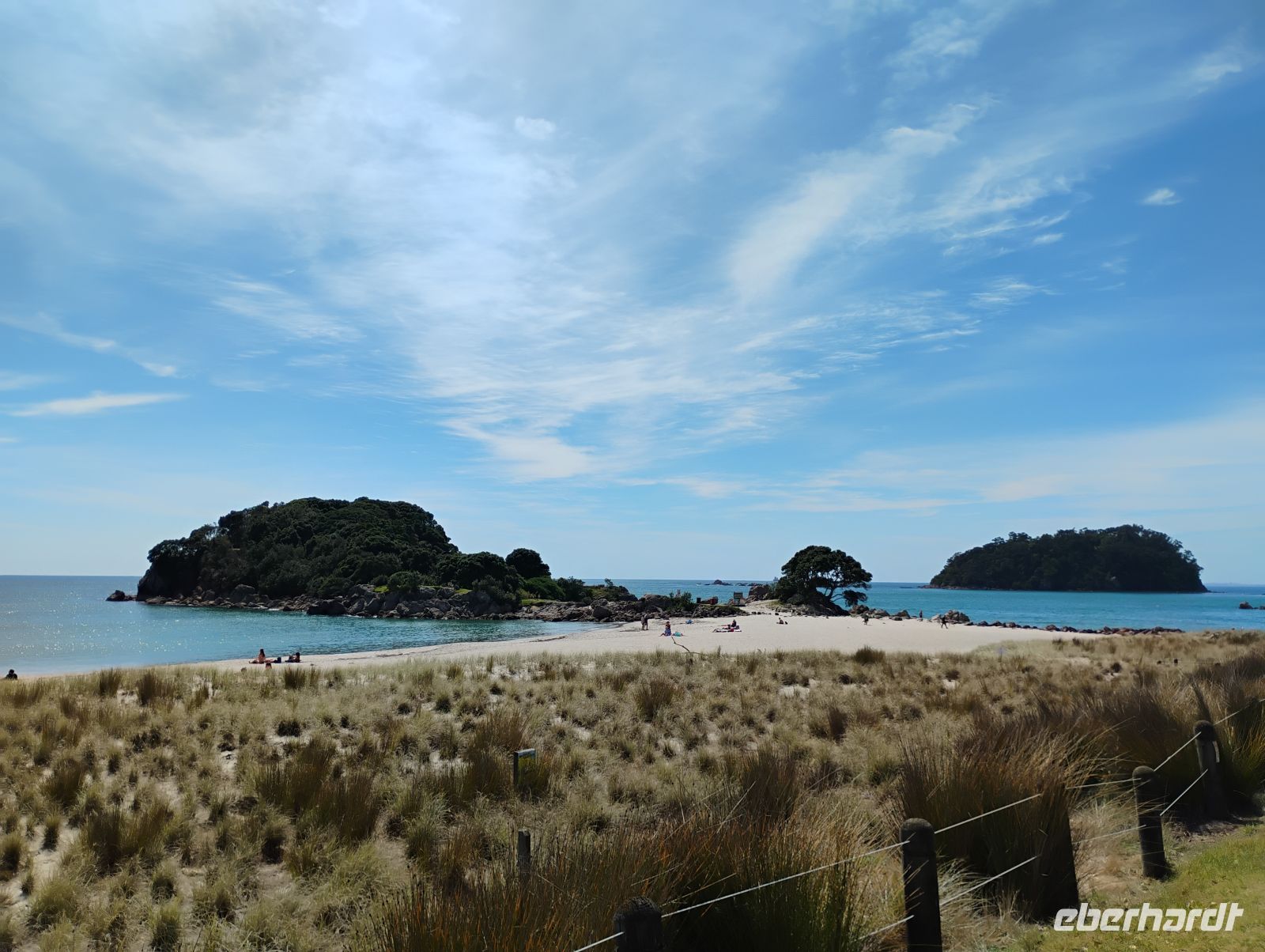 Danach geht es weiter zur Pazifikküste. Die Strecke ist kurvig und führt uns durch hügelige Landschaft, bevor wir Tairua, unser Tagesziel, erreichen. Dort wartet noch ein kleiner Aufstieg auf uns: der Weg hinauf zum Paku Hill, dem Hausberg von Tairua, einem kleinen Ort, in dem wir die kommenden zwei Nächte verbringen. Der Pfad ist naturbelassen, die letzten Meter führen über hohe Steinstufen, jedoch oben angekommen werden wir mit einem beeindruckenden Rundumblick belohnt.