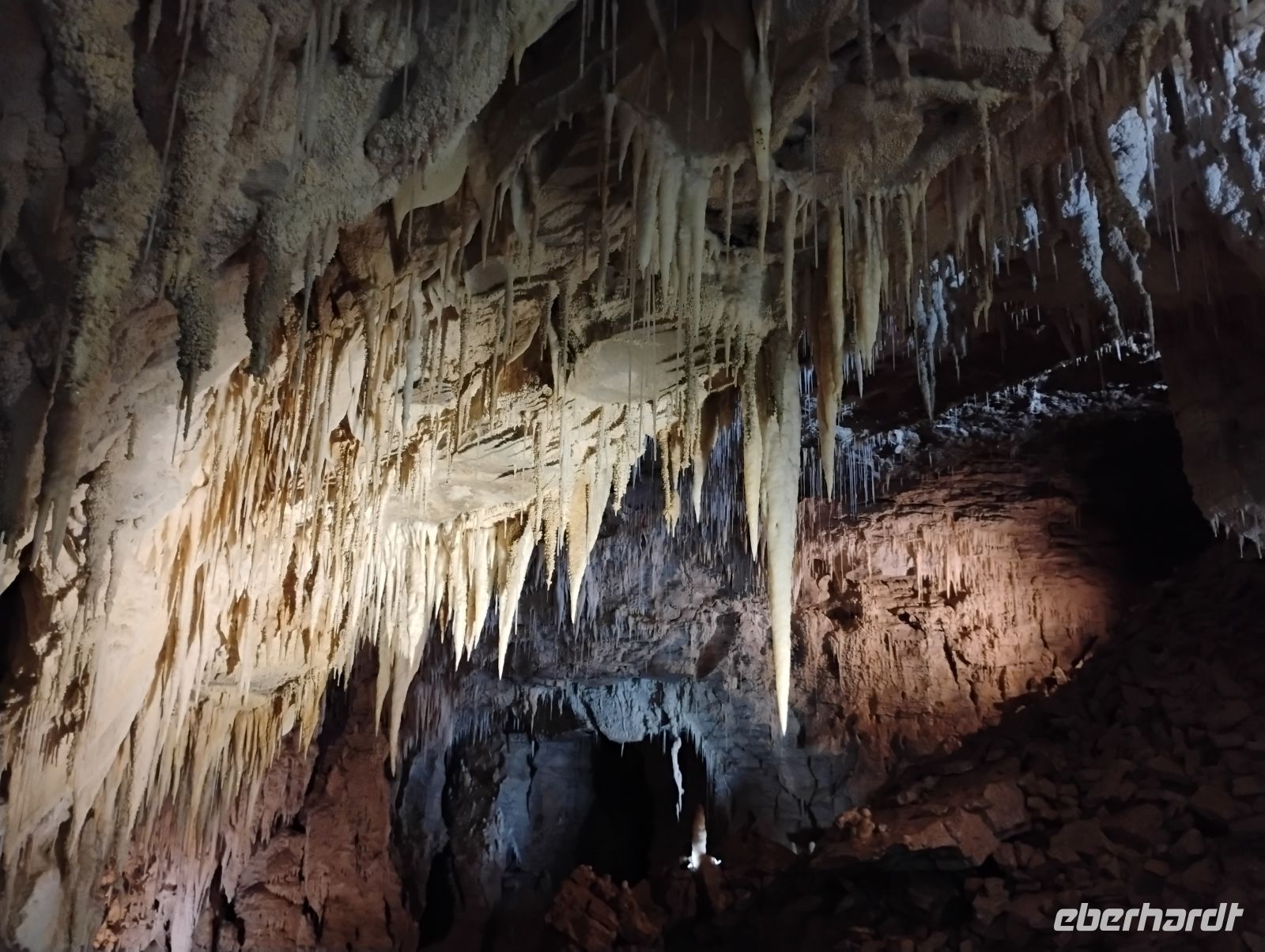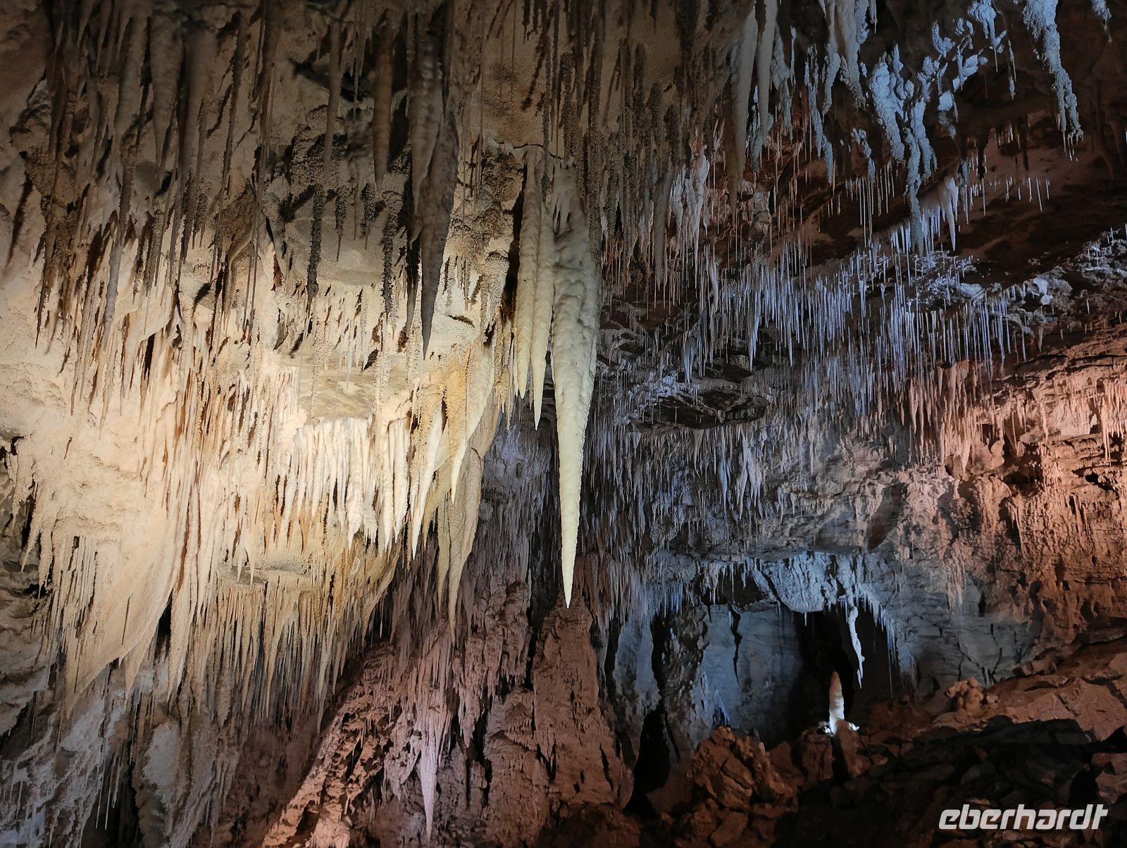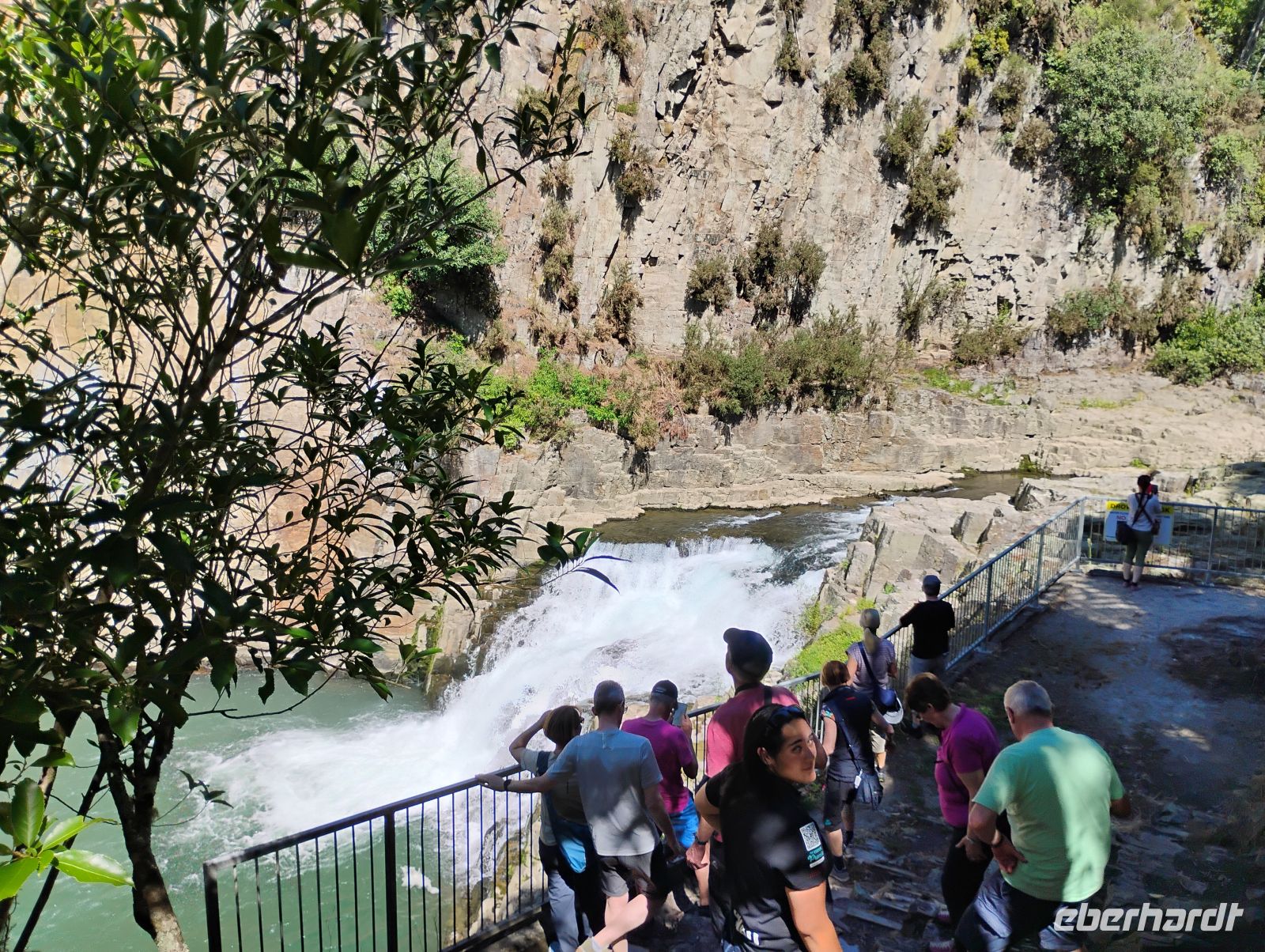 Nach 2,5 Stunden Fahrt erreichten wir unseren nächsten Programmpunkt: die Ruakuri Cave. Während der rund zweistündigen Führung erkundeten wir die eindrucksvollen Karstformationen tief unter der Erde; ich übersetzte für die Gruppe unter anderem, wie die Höhle entdeckt wurde, welche spirituelle Bedeutung sie für die Māori hat und was es mit den Glühwürmchen auf sich hat. Dabei handelt es sich um die in Neuseeland heimische Art Arachnocampa luminosa. Genau genommen sind es keine Würmchen, sondern die Larven einer Mückenart. Sie erzeugen ihr Licht durch eine chemische Reaktion im Körper, um Beute anzulocken, die in ihren feinen, klebrigen Fäden hängen bleibt. In dieser Höhle waren sie zwar gut zu sehen, jedoch nicht ganz in der Menge, die wir erwartet hatten.