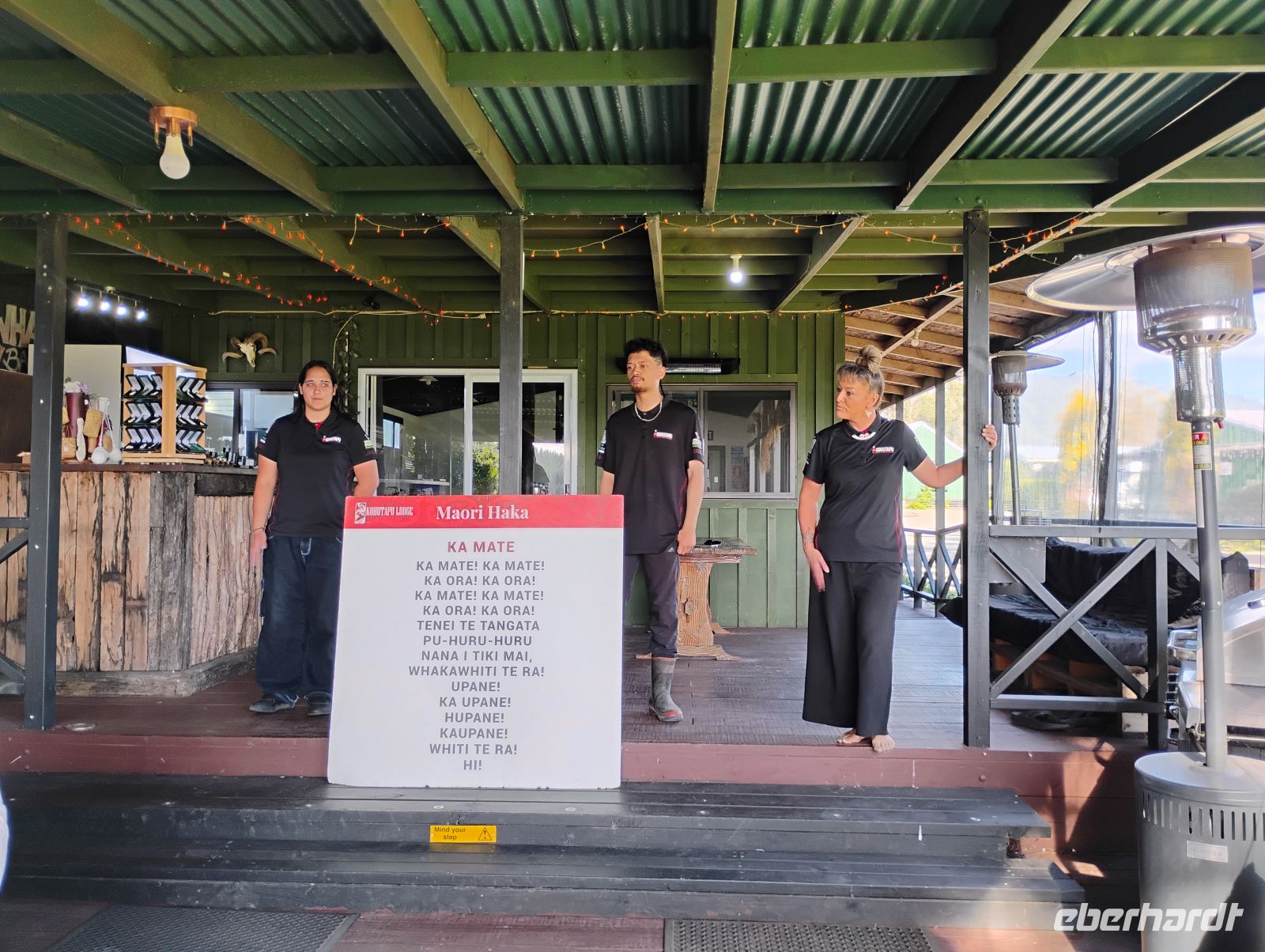 Am Lake Aniwhenua statten wir schließlich einen Besuch bei einer Māori Familie ab. Wir werden wir von Shandy empfangen, die uns Einblicke in das traditionelle Leben gibt und uns ein Hilfsmittel zum Aale fangen erklärt. Gemeinsam unternehmen wir danach einen kurzen Spaziergang durch den Wald zu einem Wasserfall, bevor wir zur Lodge fahren. Dort erleben wir, wie das Hangi – das traditionelle Essen aus dem Erdofen – in die Erde gesetzt wird. Außerdem werden wir Zeugen der traditionellen Begrüßungszeremonie. Dabei führen die Gastgeber einen "Haka" auf: mit kräftigen Bewegungen, stampfenden Füßen, ausgestreckten Zungen und intensiven Blicken zeigen sie Stärke und prüfen zugleich, ob den Gästen freundliche Absichten zugrunde liegen. Shandy erzählt uns außerdem, das die Māori aus Flachs alle möglichen Gebrauchsgegenstände wie Matten, Teller und Taschen flechten. Wir durften das gleich ausprobieren und haben kleine Fischchen geflochten. (Sicherheitshalber haben wir ein Auge darauf gemalt, damit man den Fisch erkennen kann!)
