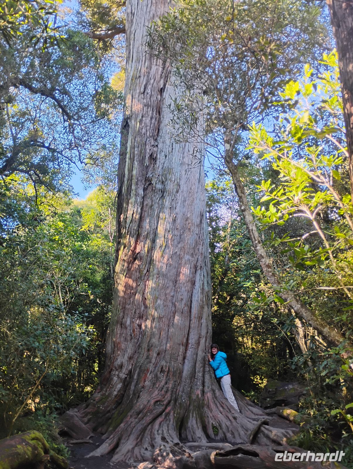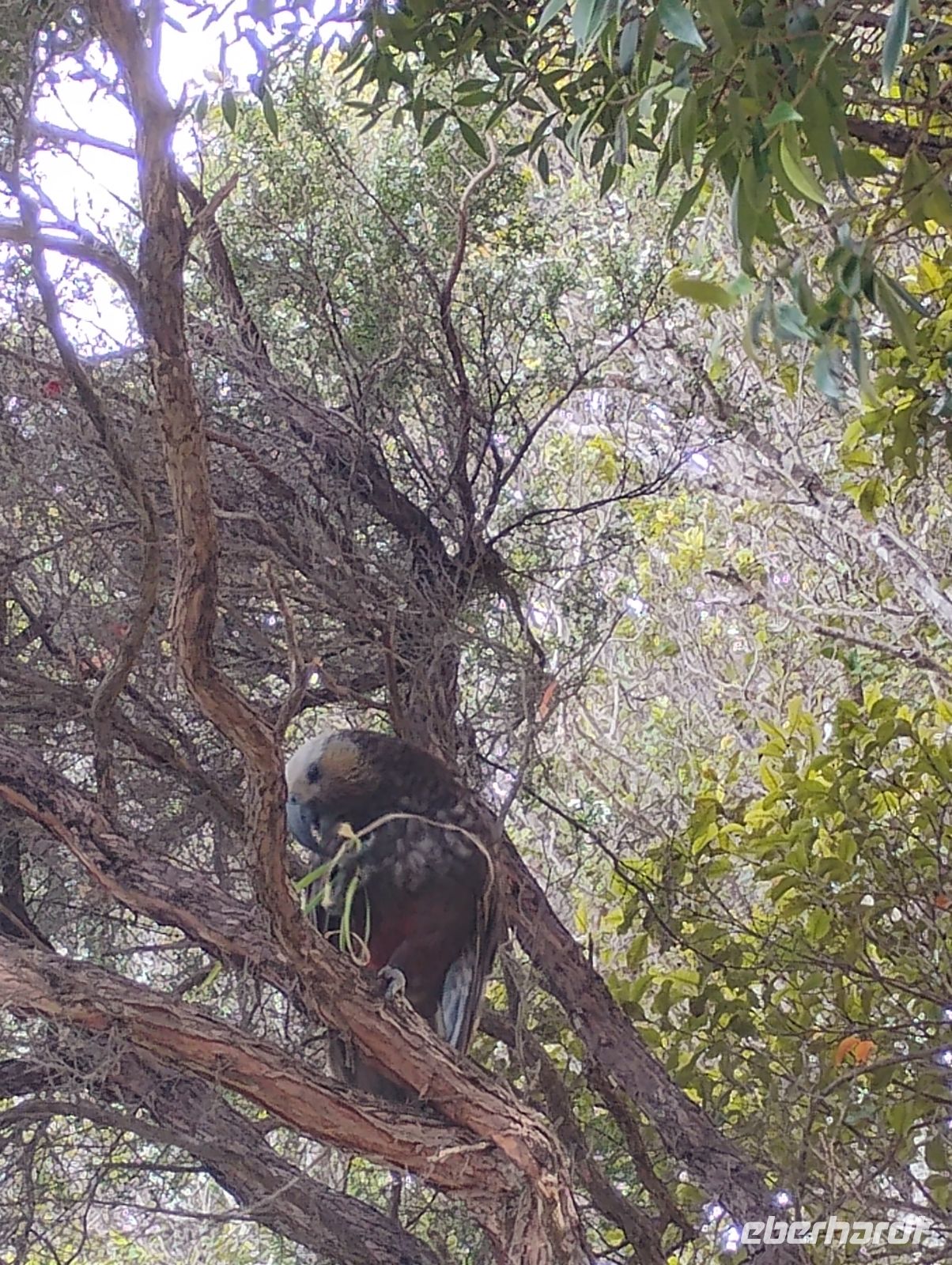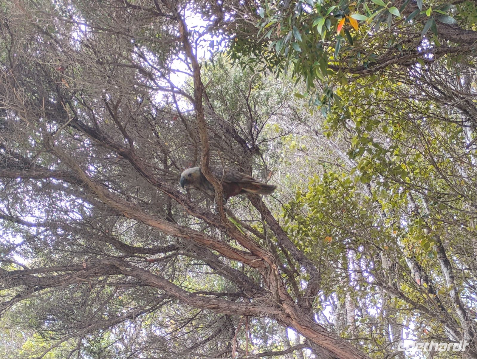 Schon kurz nach unserer Ankunft hören wir den Gesang des Tui, eines außergewöhnlichen Vogels mit zwei Kehlköpfen, der dadurch sehr unterschiedliche Töne erzeugen und sogar andere Vogelstimmen nachahmen kann. Während unseres Spaziergangs entdecken wir weitere typische Waldbewohner wie den Kākā, einen neuseeländischen Waldpapagei, der mit seinem kräftigen Schnabel Baumrinde abschält, um darunter nach Insekten zu suchen. Besonders gerne nutzt er dafür den Tōtara-Baum mit seiner vergleichsweise dünnen Rinde. Die Spuren dieser Futtersuche sind an manchen Stämmen gut zu erkennen.