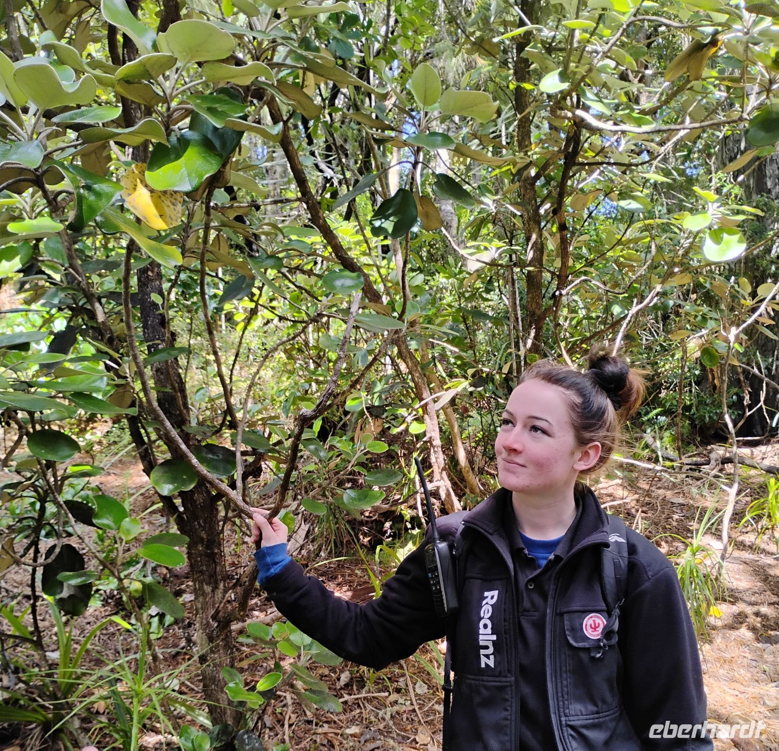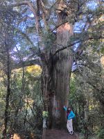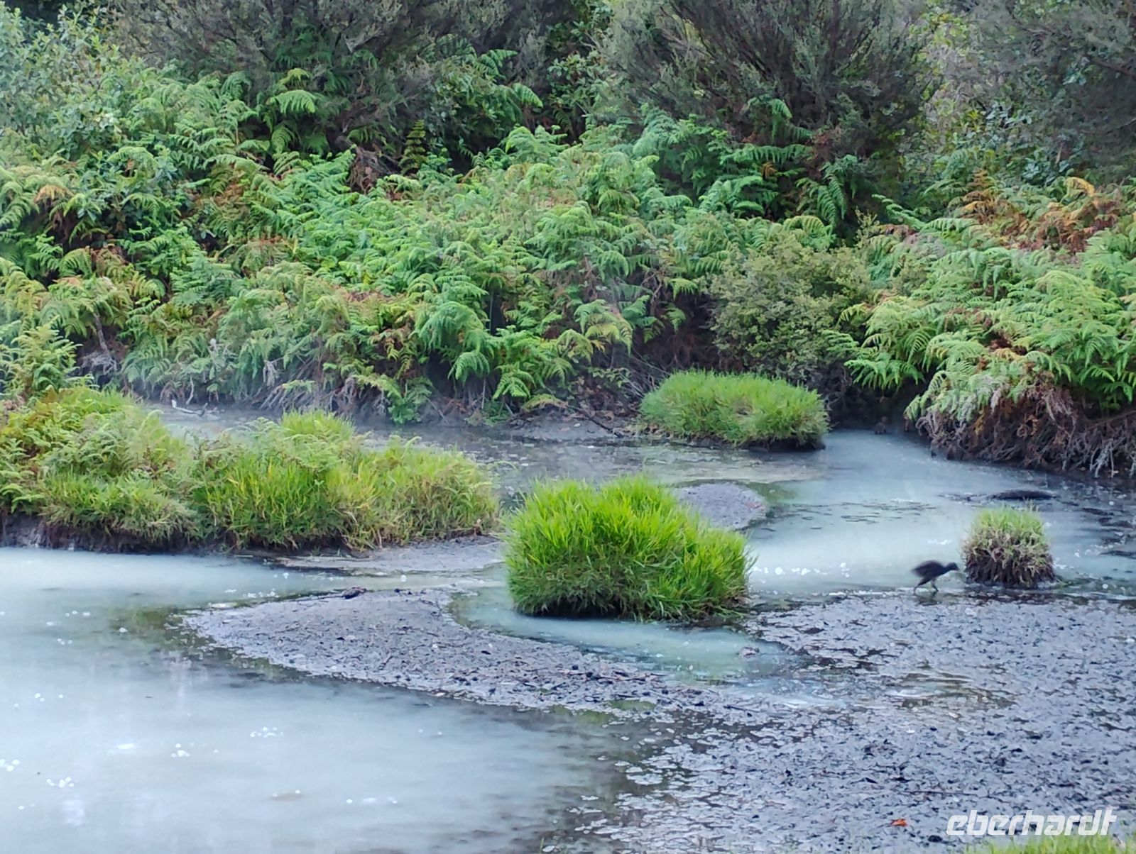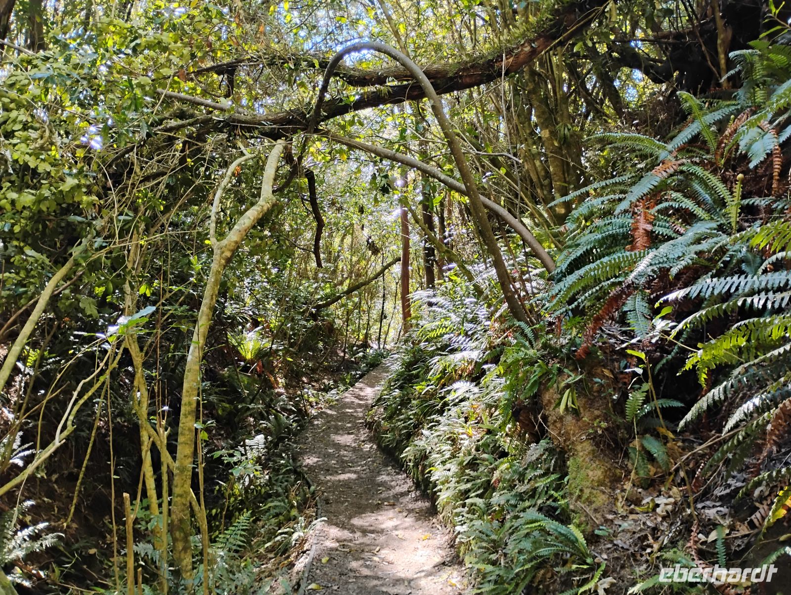 Schon kurz nach unserer Ankunft hören wir den Gesang des Tui, eines außergewöhnlichen Vogels mit zwei Kehlköpfen, der dadurch sehr unterschiedliche Töne erzeugen und sogar andere Vogelstimmen nachahmen kann. Während unseres Spaziergangs entdecken wir weitere typische Waldbewohner wie den Kākā, einen neuseeländischen Waldpapagei, der mit seinem kräftigen Schnabel Baumrinde abschält, um darunter nach Insekten zu suchen. Besonders gerne nutzt er dafür den Tōtara-Baum mit seiner vergleichsweise dünnen Rinde. Die Spuren dieser Futtersuche sind an manchen Stämmen gut zu erkennen.
