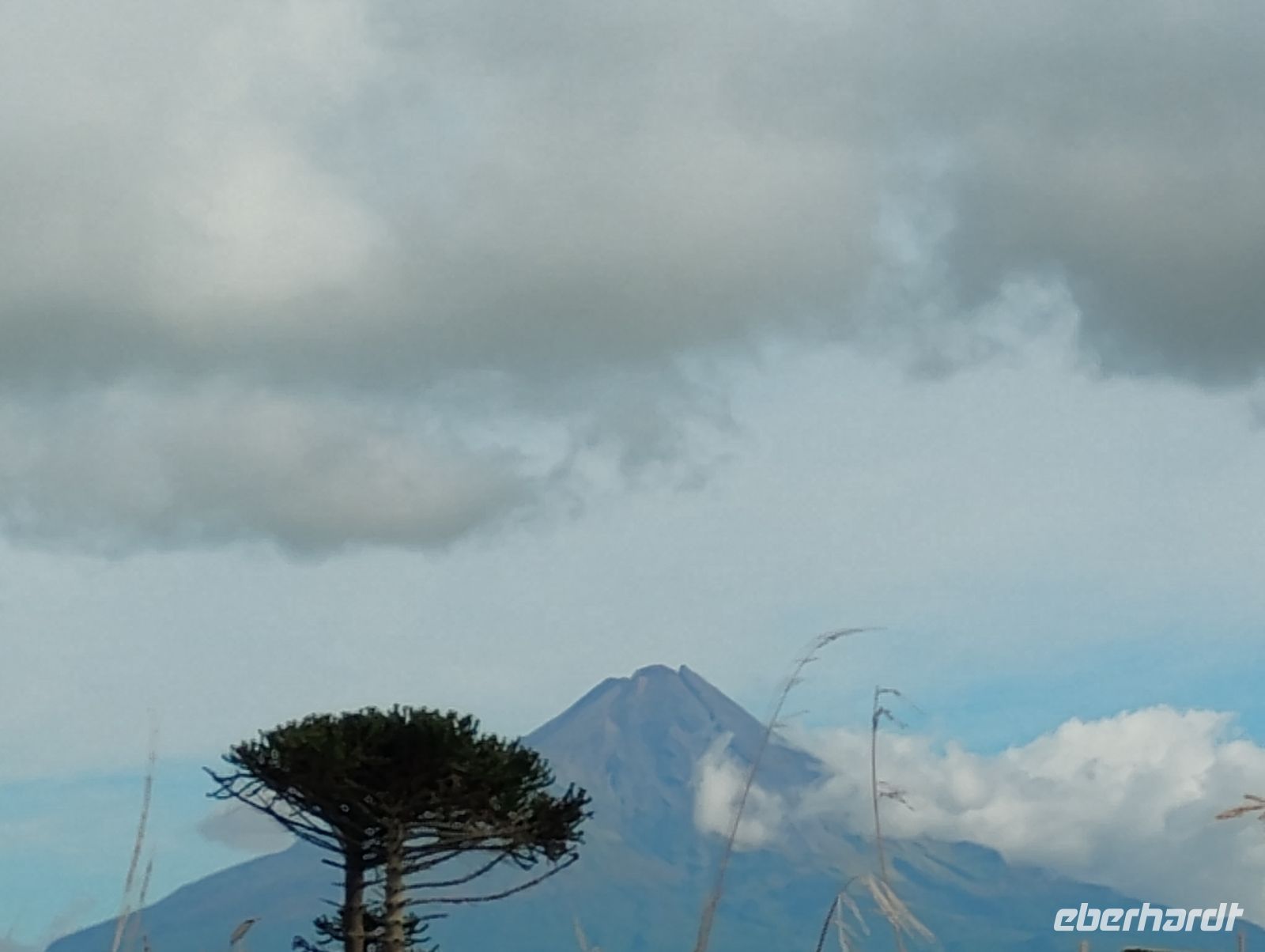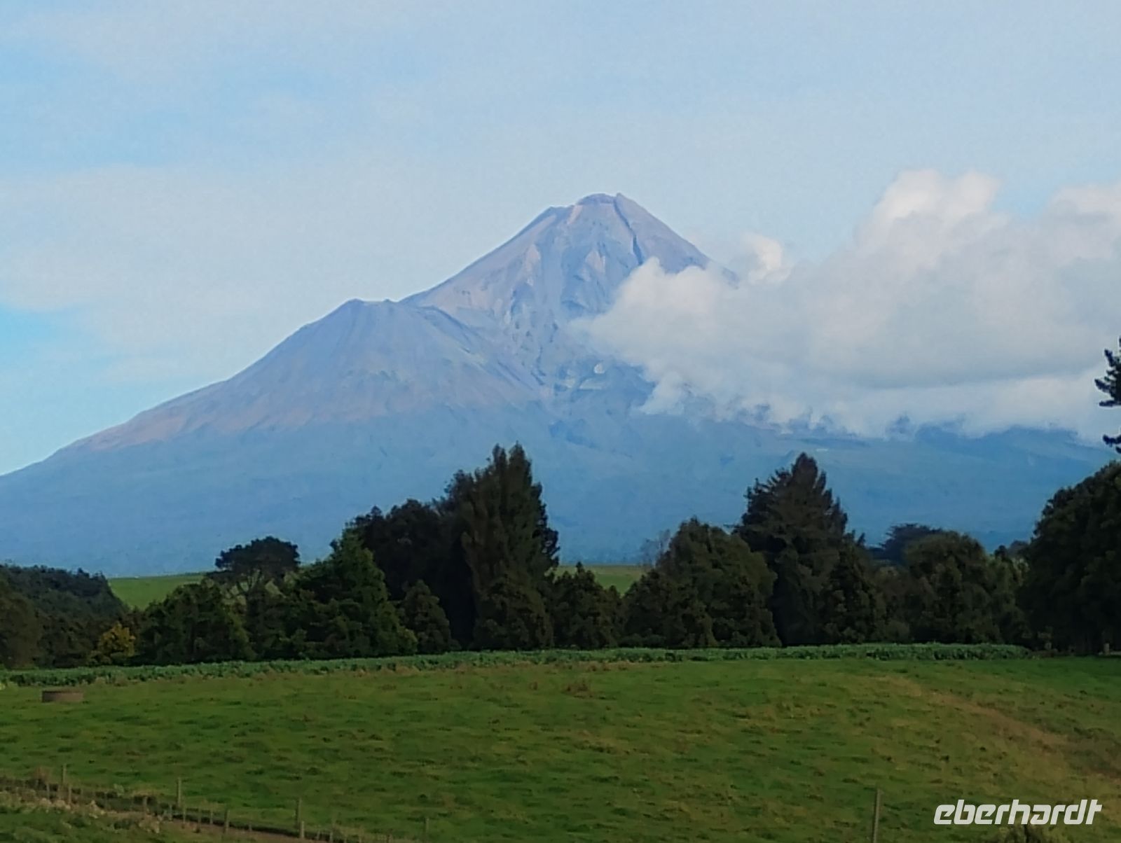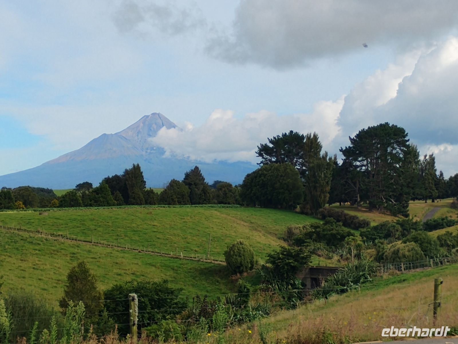 Am Morgen ist der Himmel in New Plymouth zunächst grau. Doch kurz vor unserer Abfahrt klart es überraschend auf. In der Hoffnung, den majestätischen Mount Taranaki (auch Mount Egmont) in voller Pracht am See sehen und fotografieren zu können, legen wir einen Zahn zu.