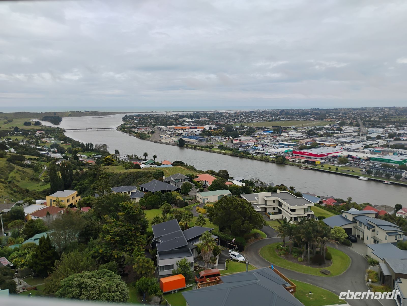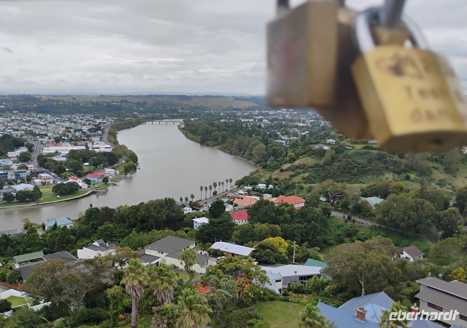 In Whanganui machen wir Halt am Aussichtsturm auf dem Durie Hill. Oben angekommen lassen wir uns die typischen Hot Cross Buns schmecken, die ich in der Runde austeile. Bei klarem Wetter hätte man von hier aus die Vulkane Mount Ruapehu, Mount Ngauruhoe und Mount Tongariro sehen können – diesmal bleiben sie leider verborgen.