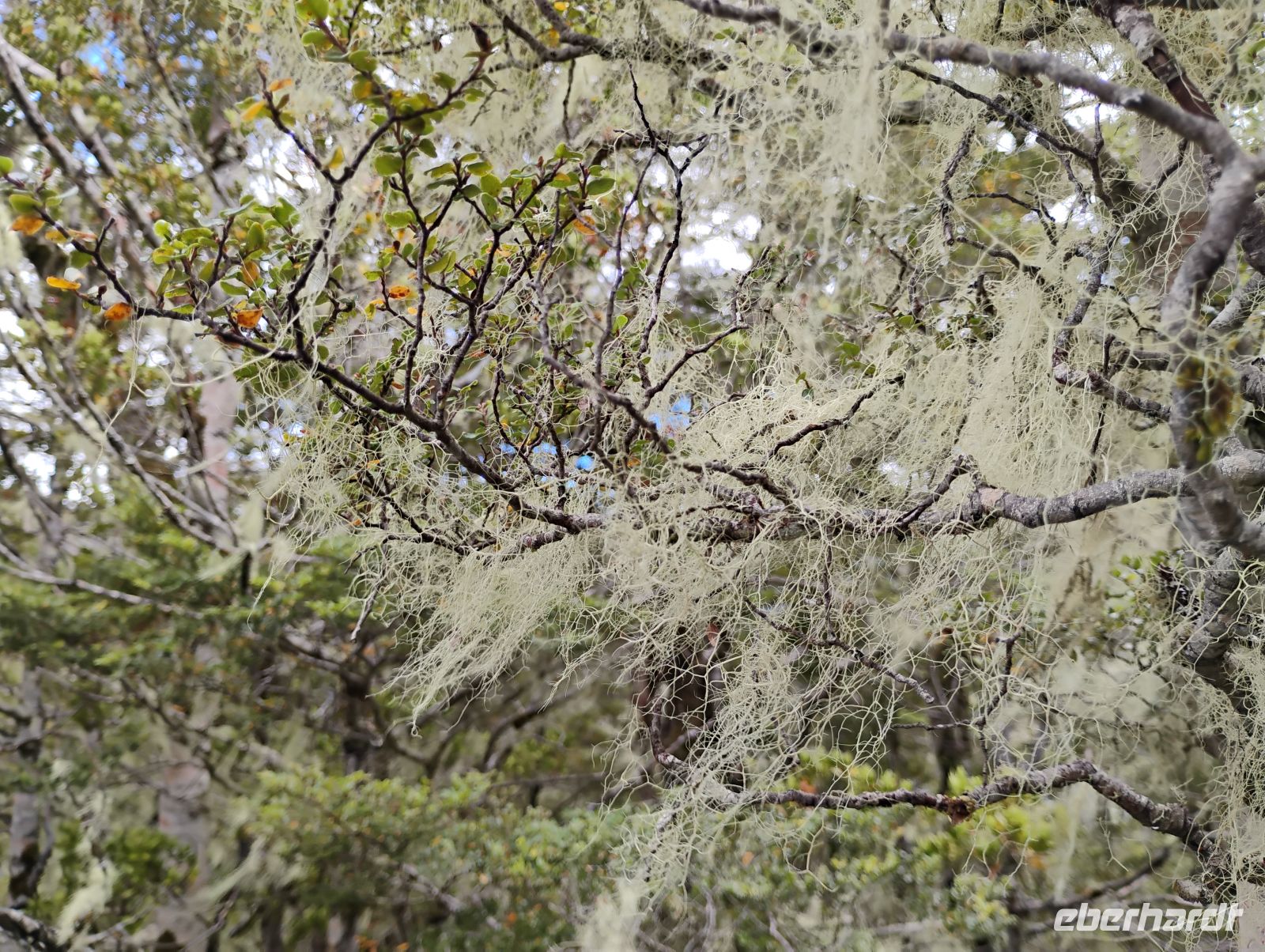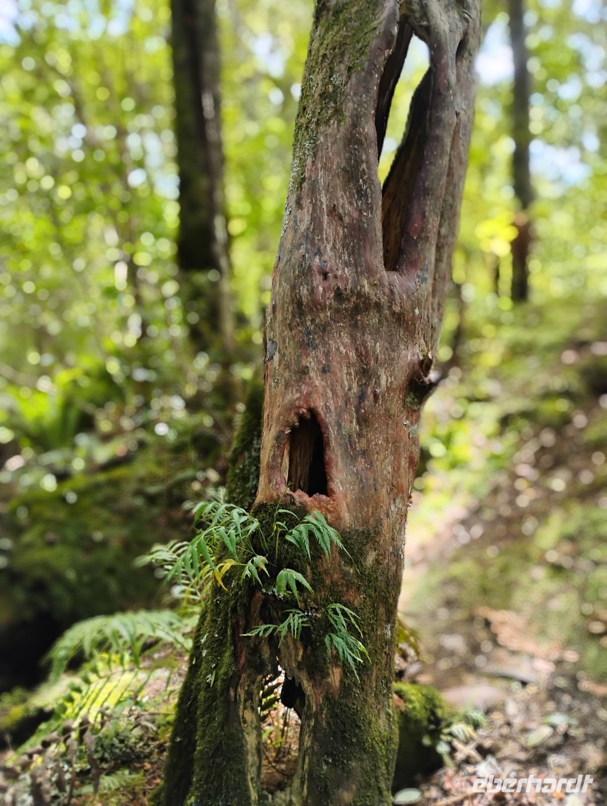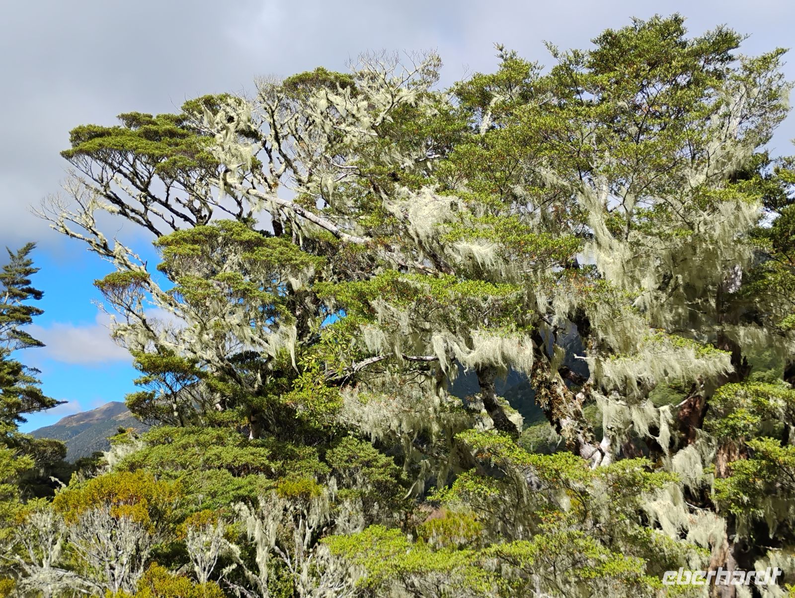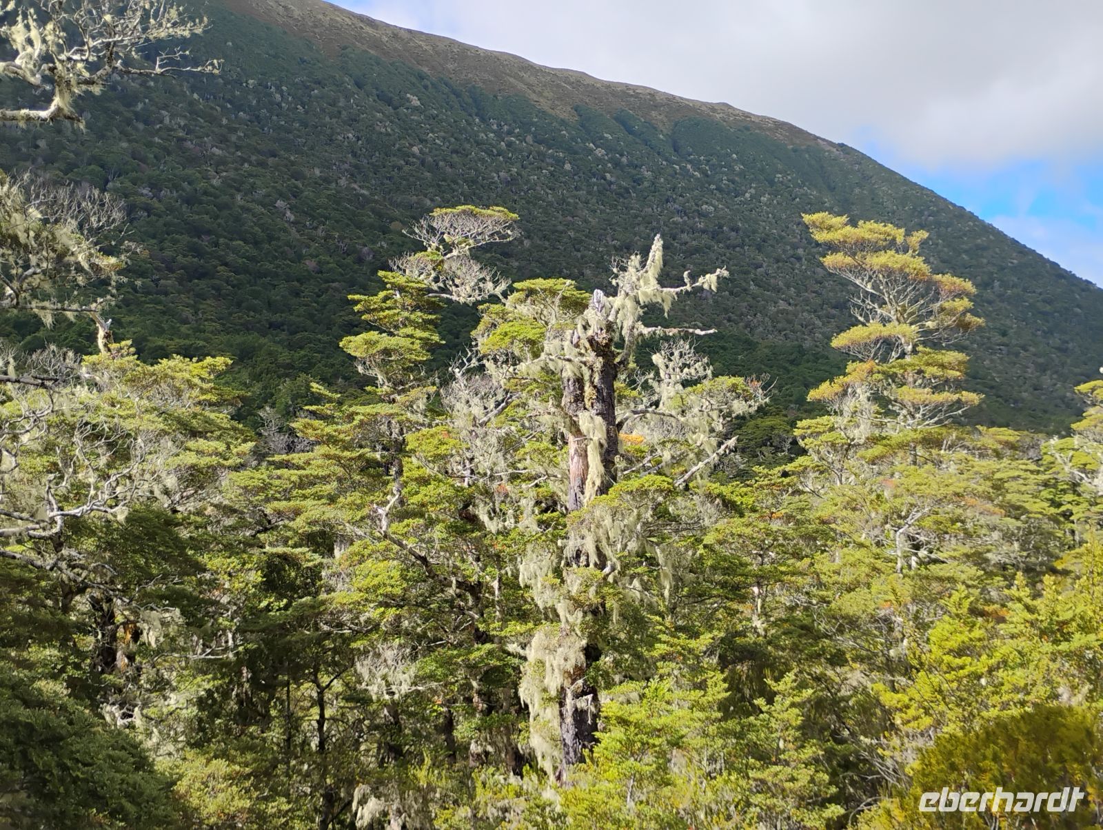 Begleitet wurden wir dabei von Sonja, Michaels Freundin, die uns einige Tage auf der Reise begleitet. Sie erklärte uns Spannendes zur heimischen Vegetation. An den neuseeländischen Buchen entdeckten wir die feinen Wachsfäden der Schildläuse, an deren Enden sich Honigtau bildet – eine wichtige Nahrungsquelle für einheimische Insekten, leider aber auch für eingeschleppte europäische Wespen. Manche Stämme wirkten schwarz gefärbt: Dort wächst Rußtaupilz auf dem zuckerreichen Honigtau. Auch eine Rātā konnten wir sehen, die oft hoch oben in einem anderen Baum keimt und mit der Zeit kräftige Wurzeln nach unten bildet, bis sie selbst zum dominierenden Baum wird. Daneben ragte eine Neuseeländische Keulenlilie (Cabbage Tree) in den Himmel – zwei ganz unterschiedliche, aber typische Vertreter dieser Landschaft.